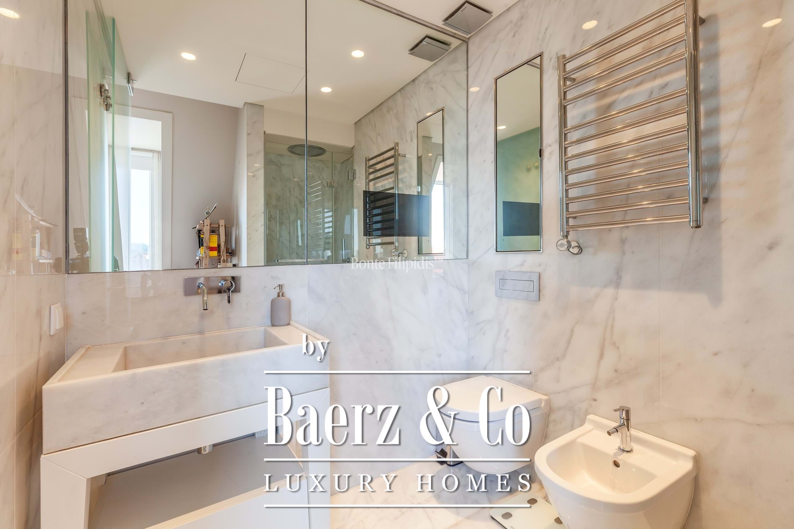 Originally a four-bedroom penthouse, one of the bedrooms has been transformed into a spacious walk-in closet adjoining the master suite. Spanning 197 sqm of interior space, the lower level houses the bedrooms, four bathrooms, and a balcony, all bathed in natural light from large windows that frame breathtaking views of Lisbons castle.