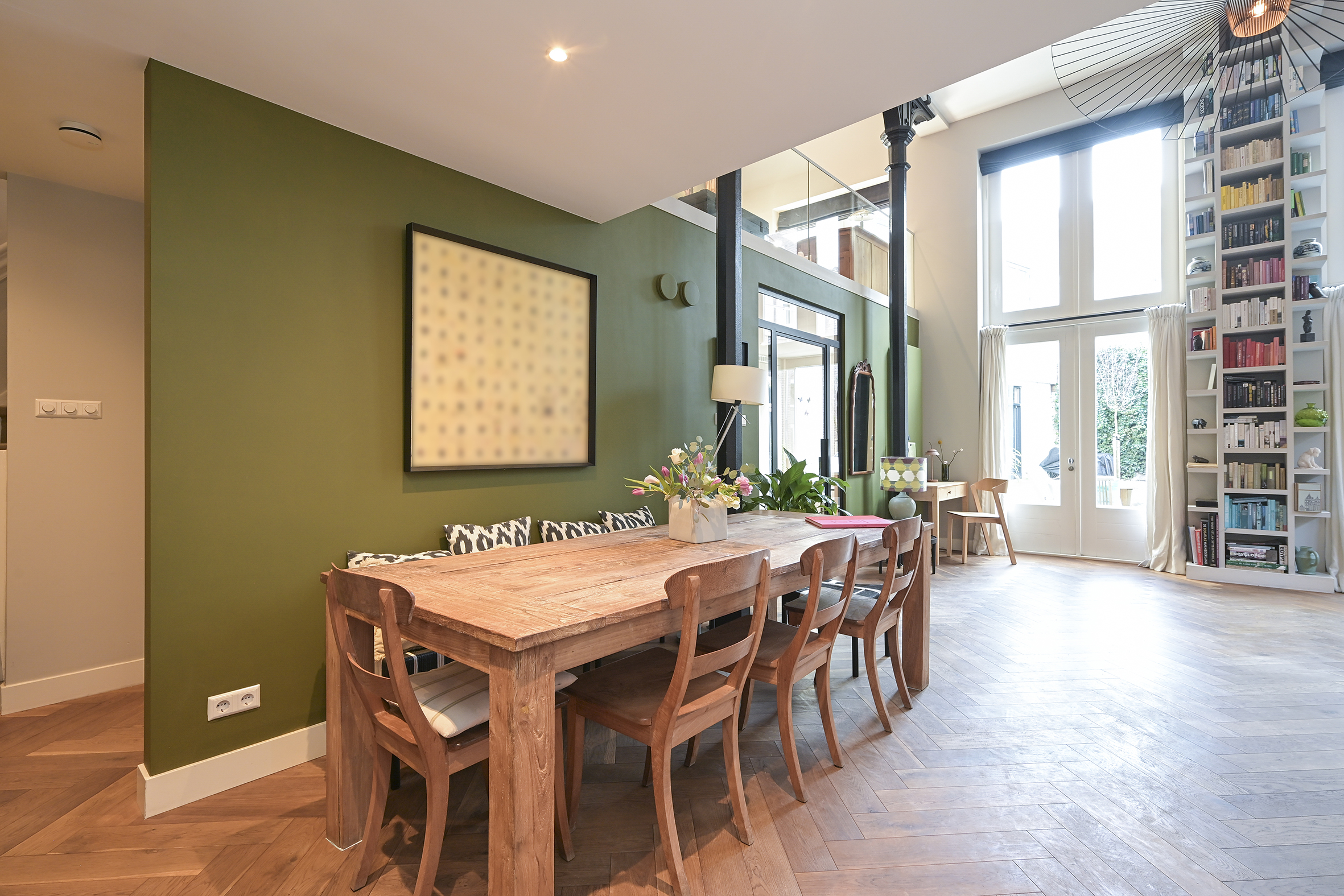 Behind the historic facade lies this spacious and bright home, which features three large bedrooms, two modern bathrooms, and an impressive living room of approximately 70 m². The high ceilings and open loft enhance the feeling of space. French doors leading to the courtyard with its own south-facing terrace offer a sense of freedom and privacy. This privacy is particularly high, partly because the entrance gate is closed in the evenings and on weekends.