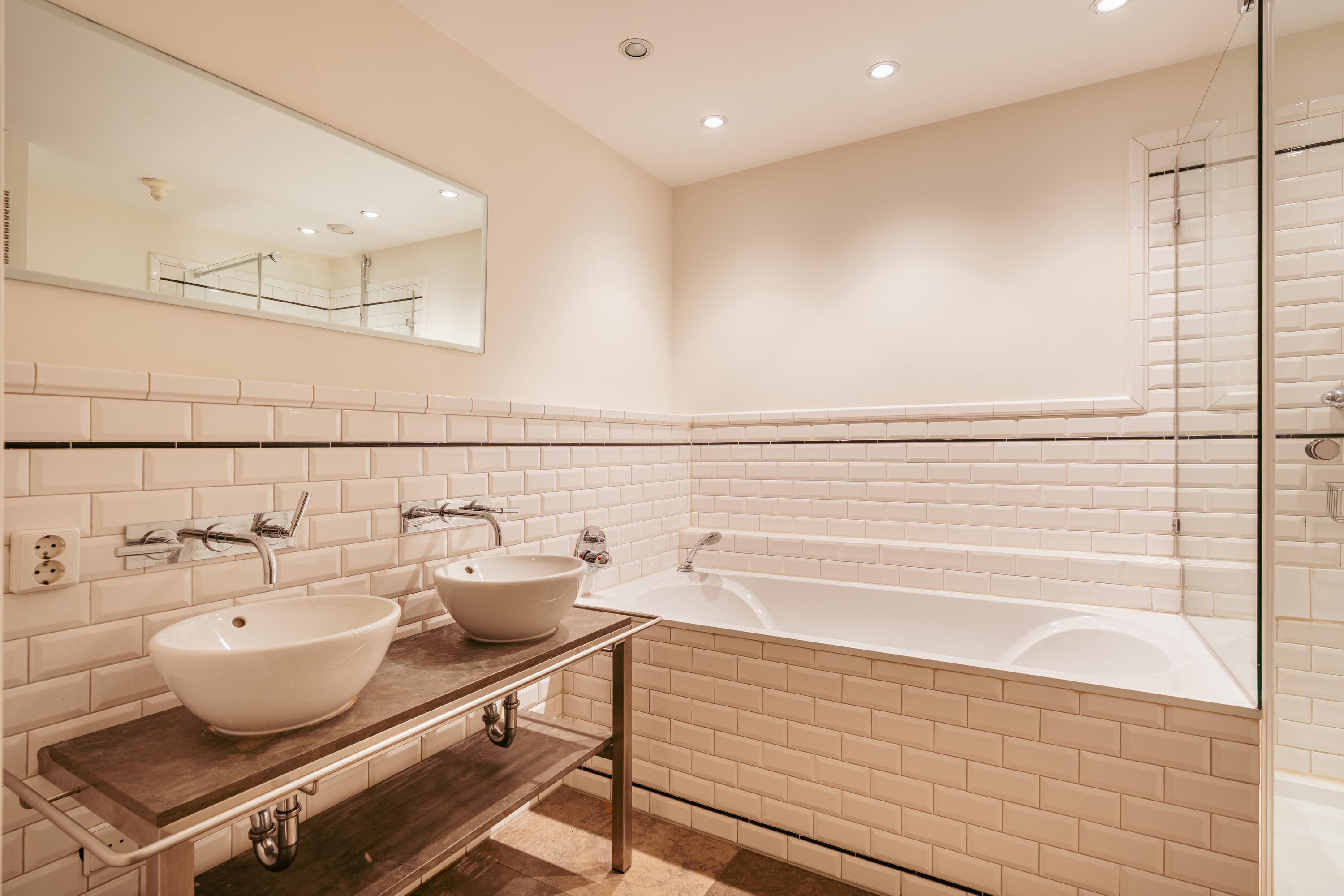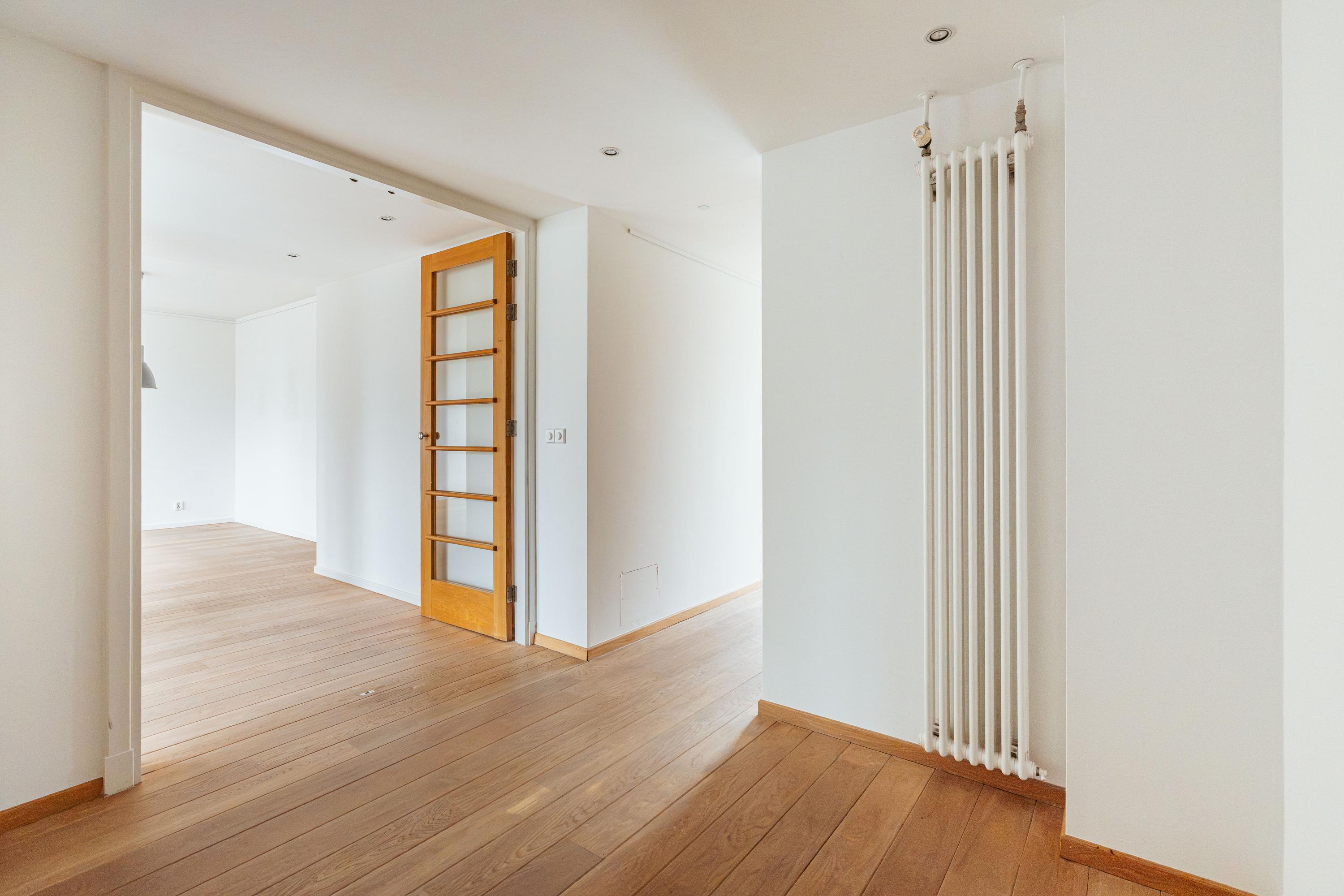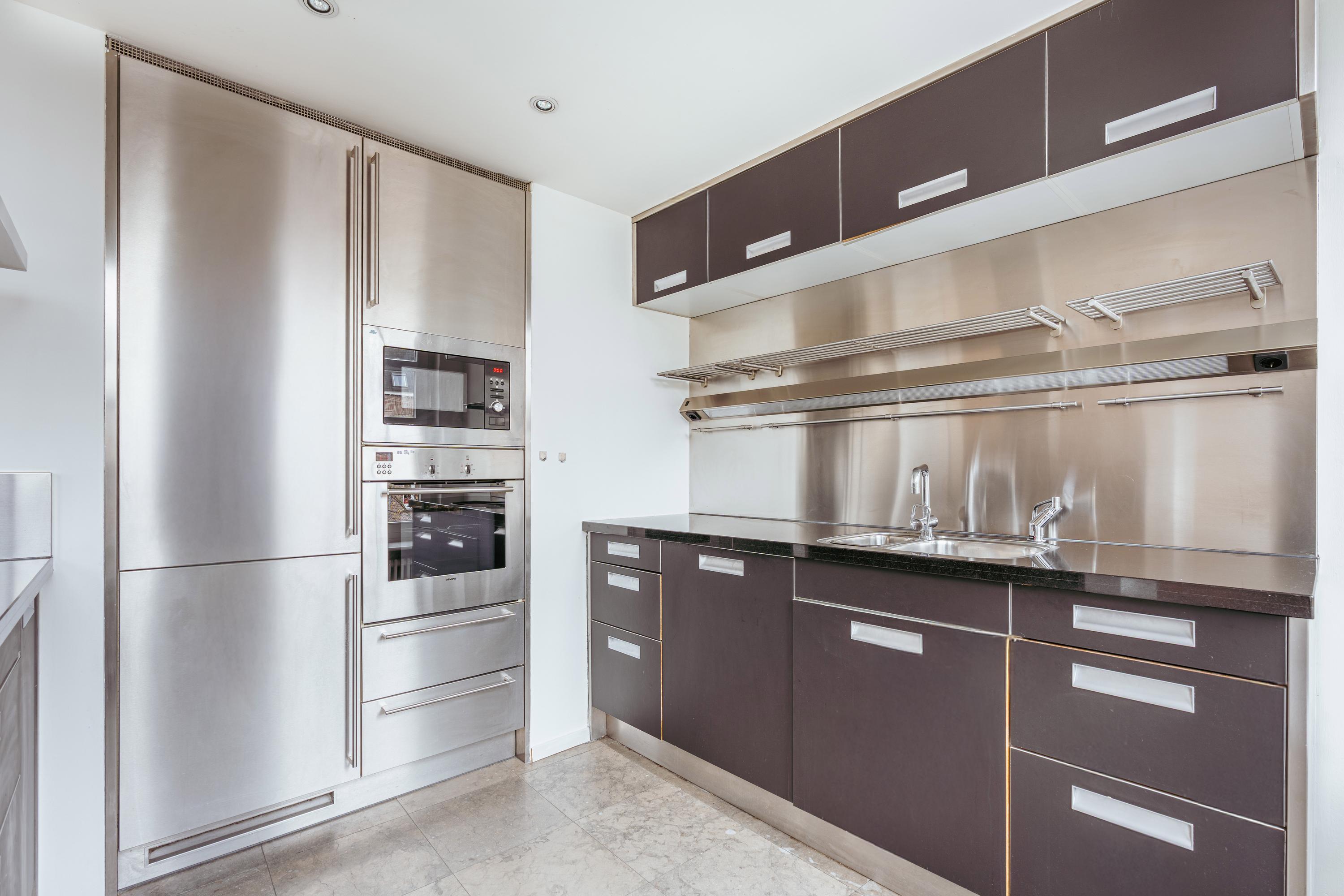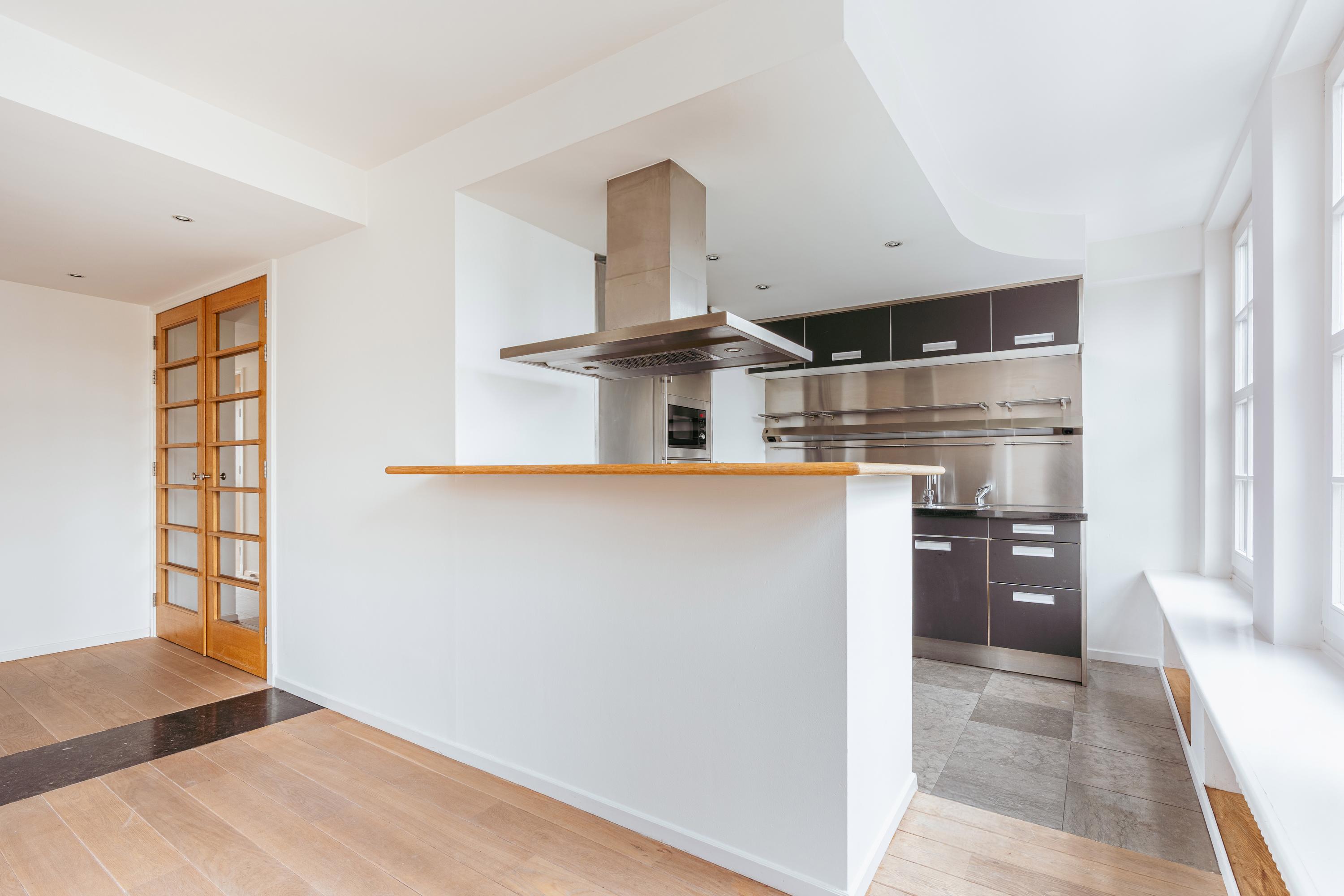 يحتوي المطبخ المجاور، المصمم بعناية ليلبي الوظائف العملية والجانب الاجتماعي، على غسالة صحون وصنبور Quooker ومساحات تخزين مدمجة، بينما تدعو طاولة البار الفسيحة إلى الاجتماعات غير الرسمية. في الجهة الخلفية، تستقبل غرفتا نوم متساويتان في الحجم ضوء النهار الهادئ، وتتميز الأكبر منهما بثلاثة خزائن مدمجة. كما توجد غرفة تخزين عملية تستوعب الغسالة والنشافة. توزيع الشقة متعمد ومنظم جيدًا، مع وجود إمكانيات للتحديث بما يتناسب مع الأذواق الشخصية.