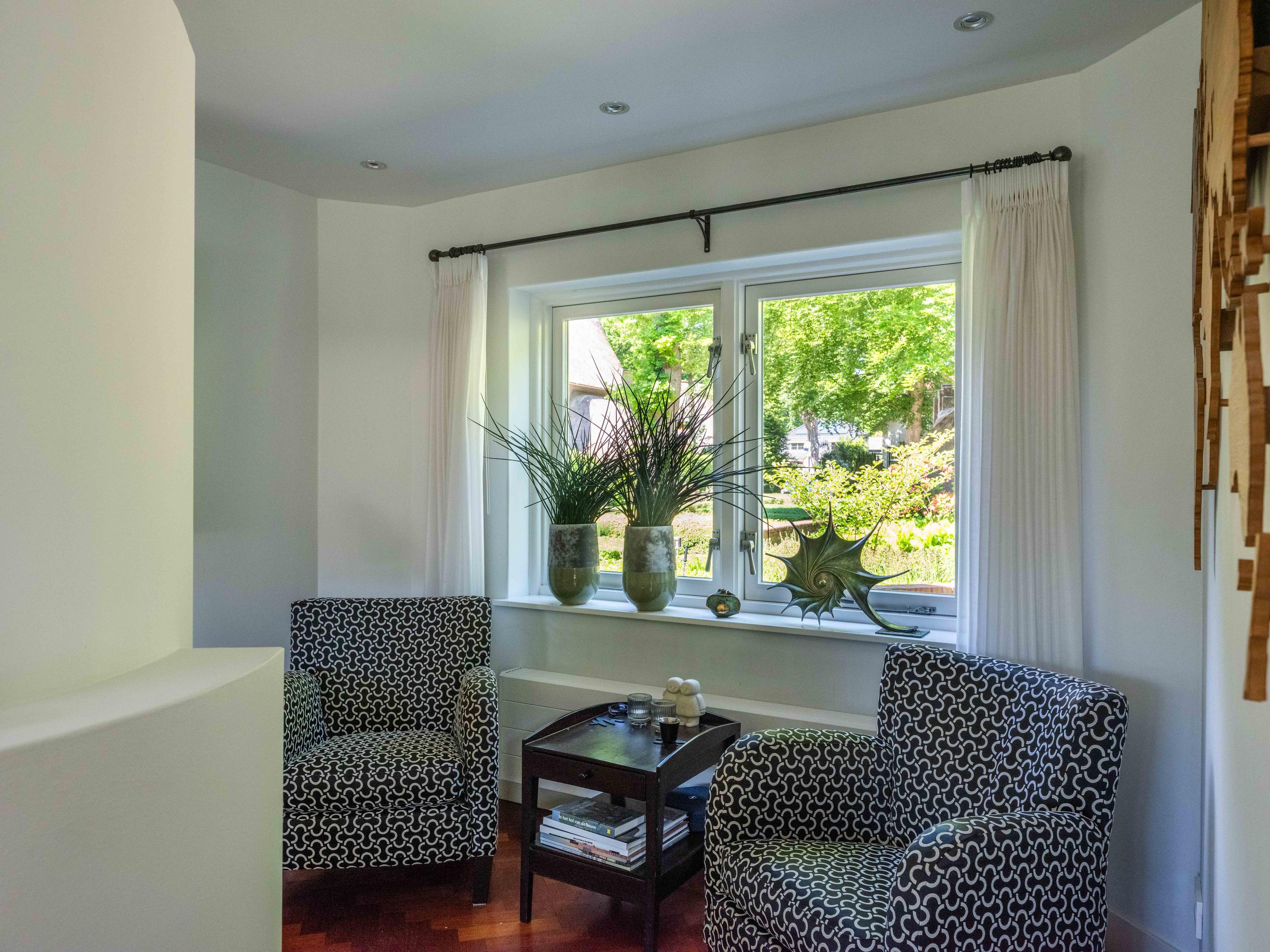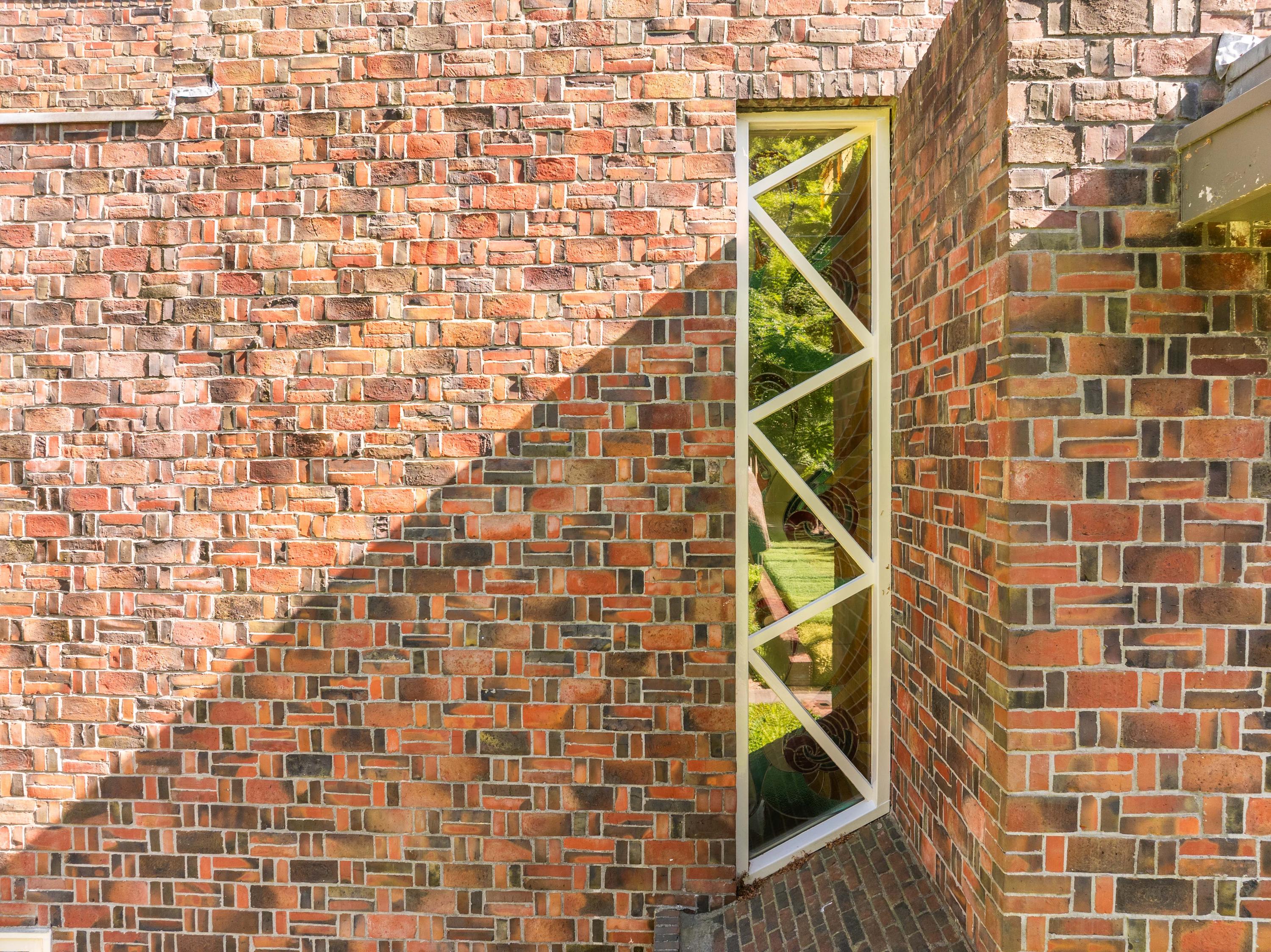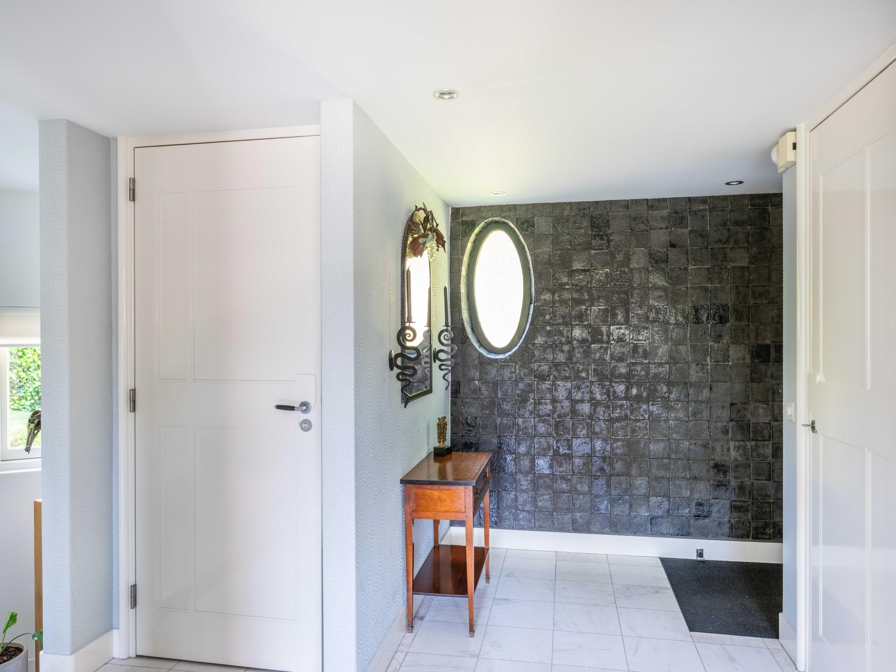 تنفتح الفيلا من خلال ممر متعرج محفور في سياج الخصوصية من الزعرور، مما يمنح الخصوصية وإحساساً مميزاً بالوصول. عند الدخول من الباب المخفي، ينتقل الضيف عبر ردهة بها غرفة للمعاطف وسُلّم صاعد، ثم إلى مساحة معيشة يحددها باب فرنسي ومدفأة وميزة النُصُب المعمارية 'غرفة القيادة' المرتفعة.