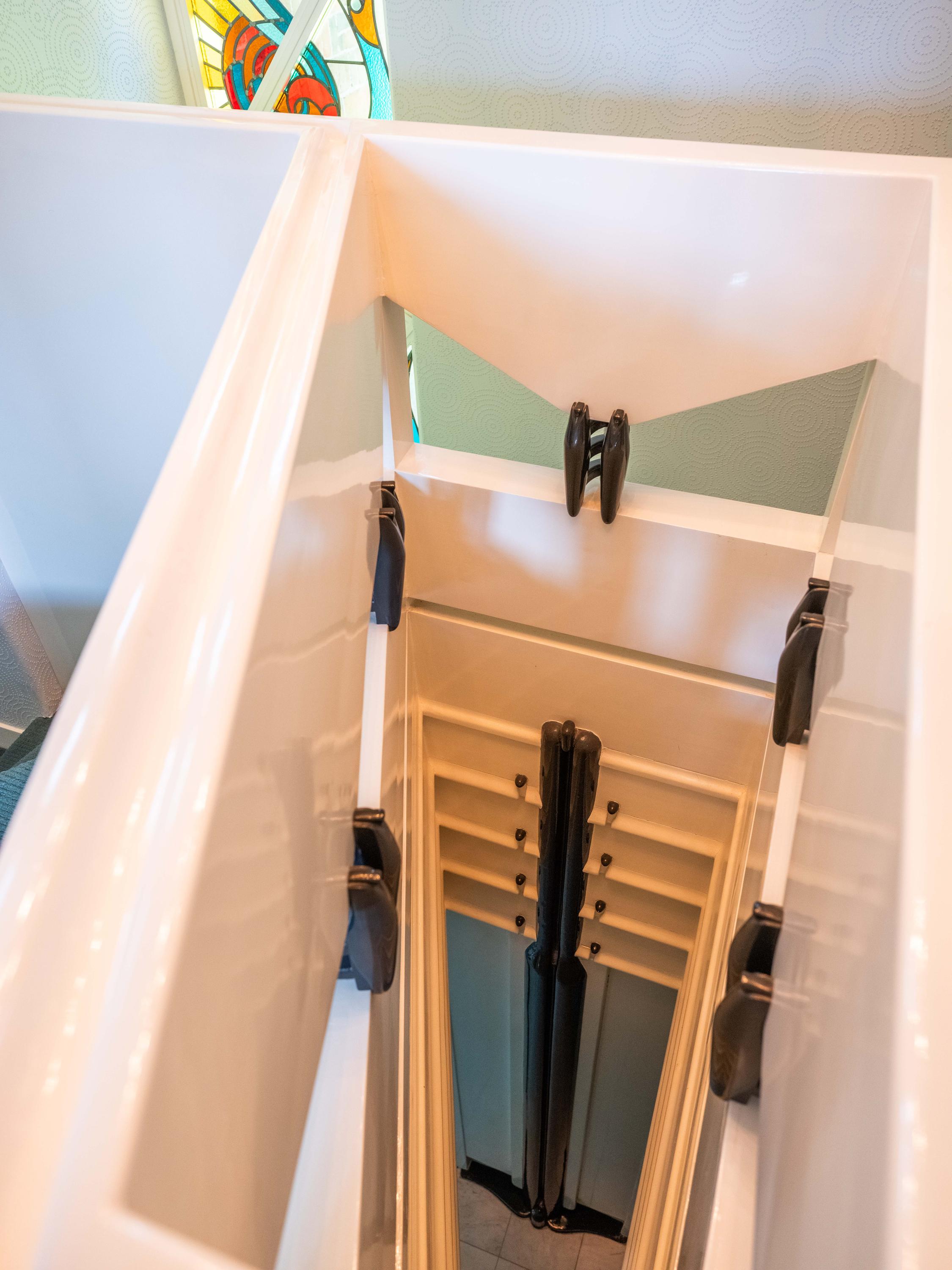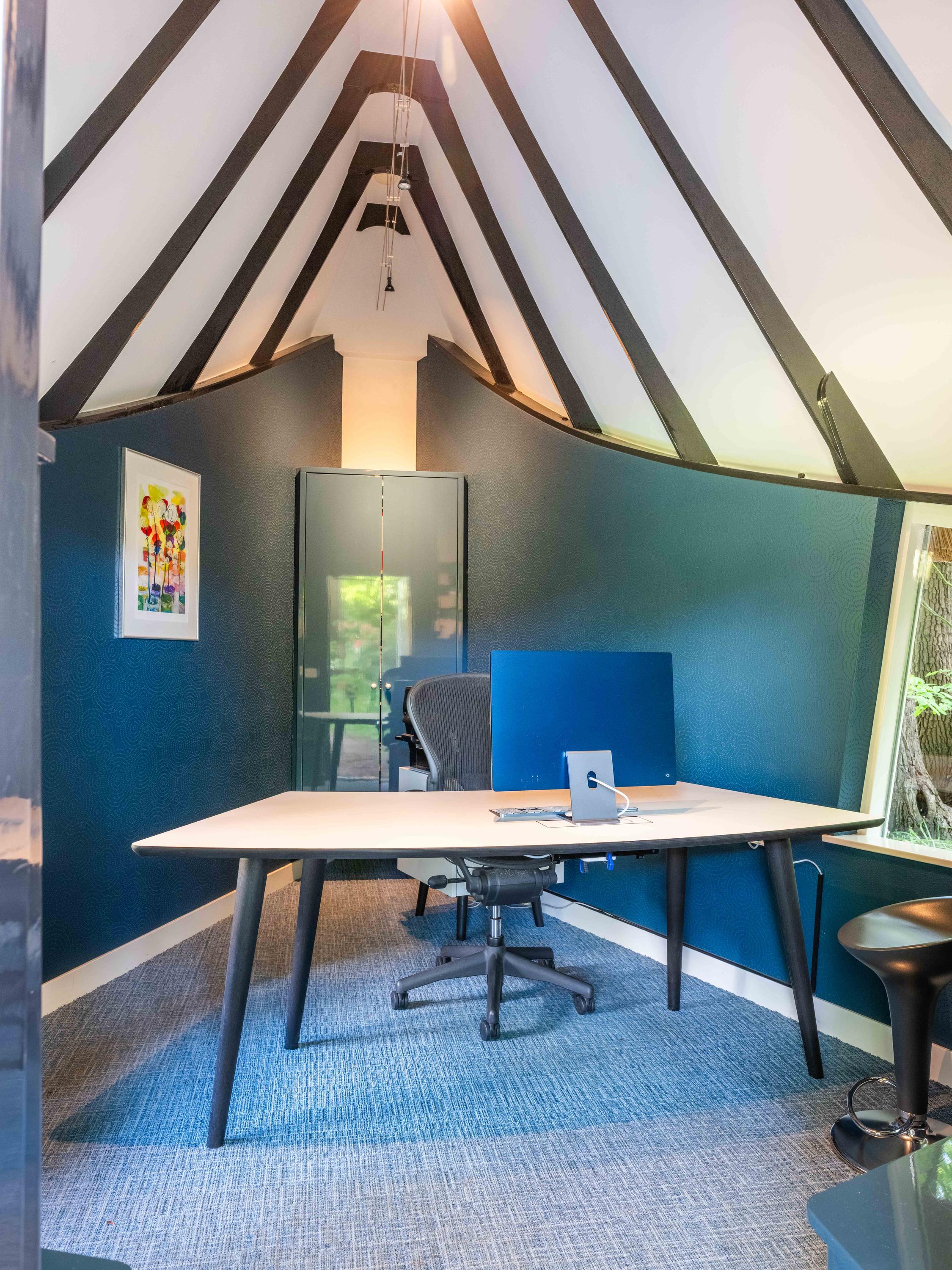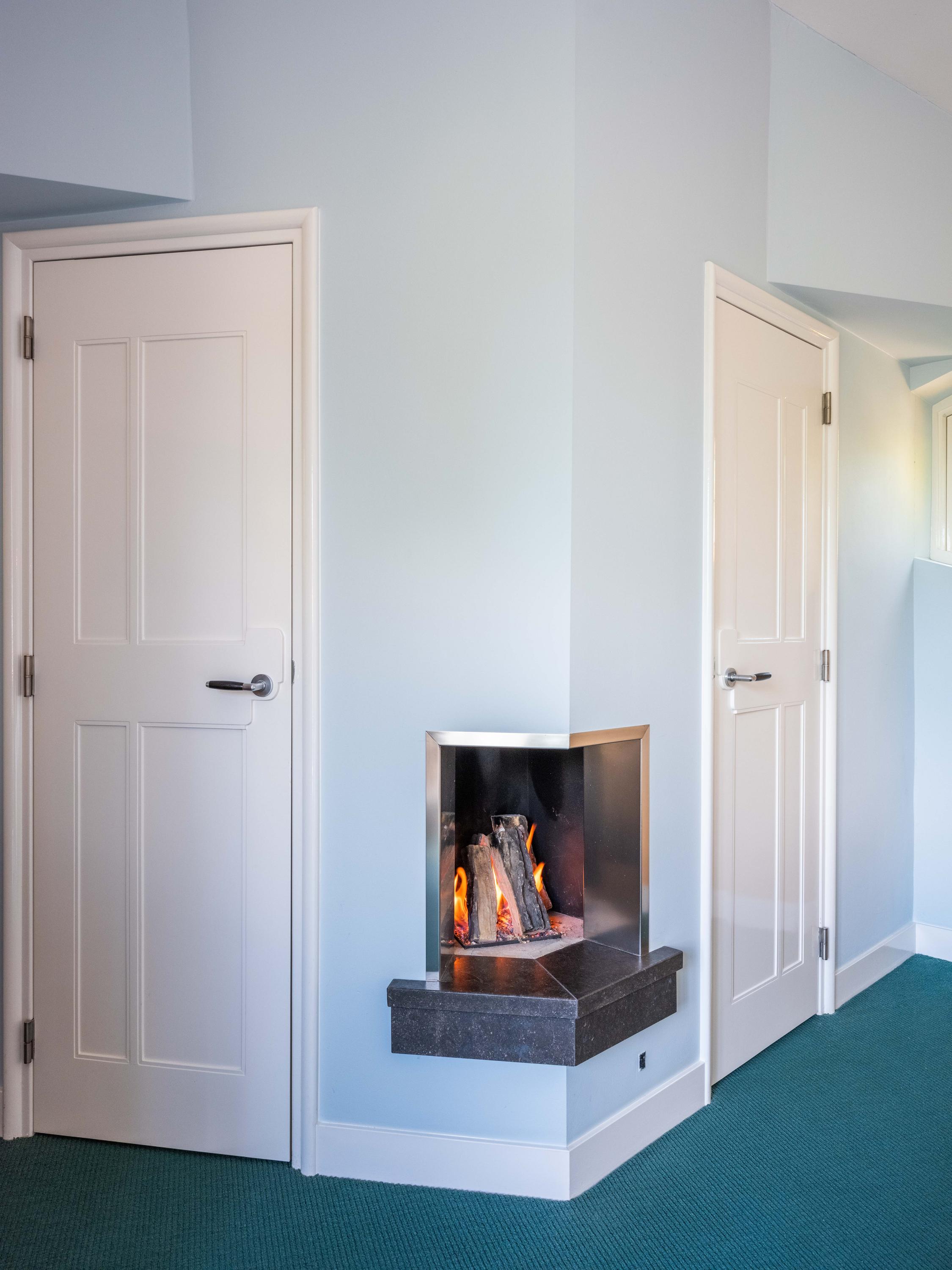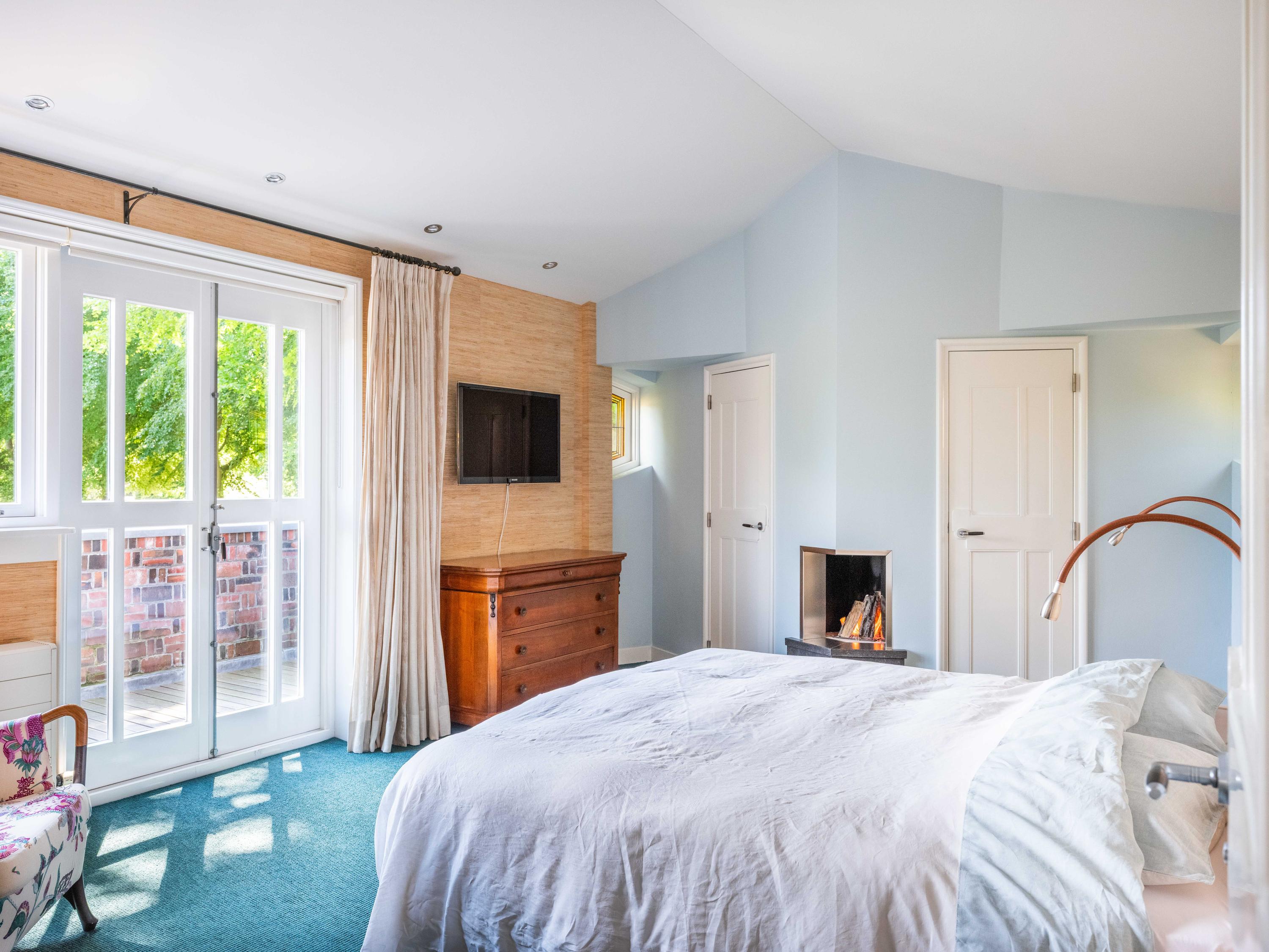 تنفتح الفيلا من خلال ممر متعرج محفور في سياج الخصوصية من الزعرور، مما يمنح الخصوصية وإحساساً مميزاً بالوصول. عند الدخول من الباب المخفي، ينتقل الضيف عبر ردهة بها غرفة للمعاطف وسُلّم صاعد، ثم إلى مساحة معيشة يحددها باب فرنسي ومدفأة وميزة النُصُب المعمارية 'غرفة القيادة' المرتفعة.