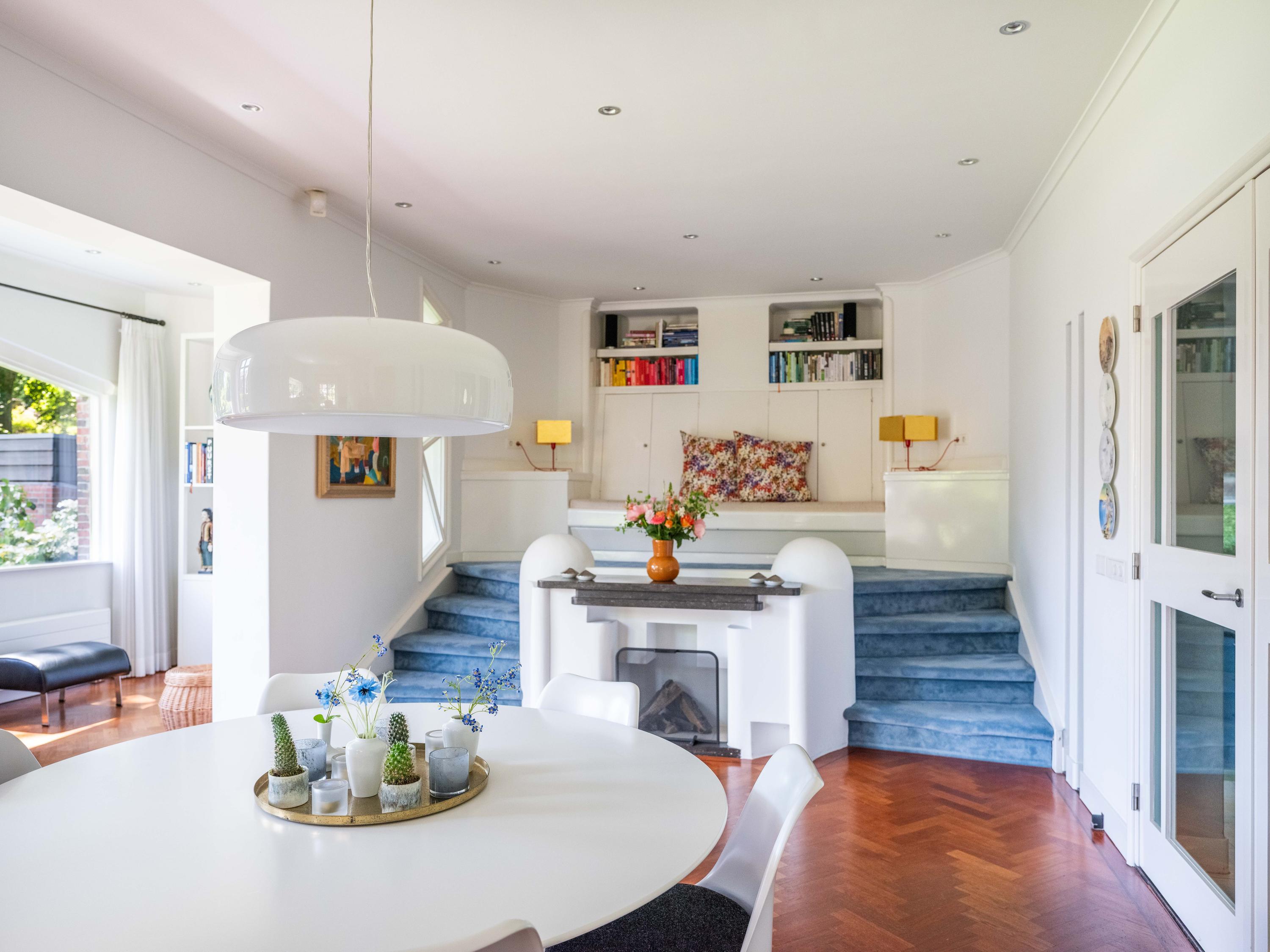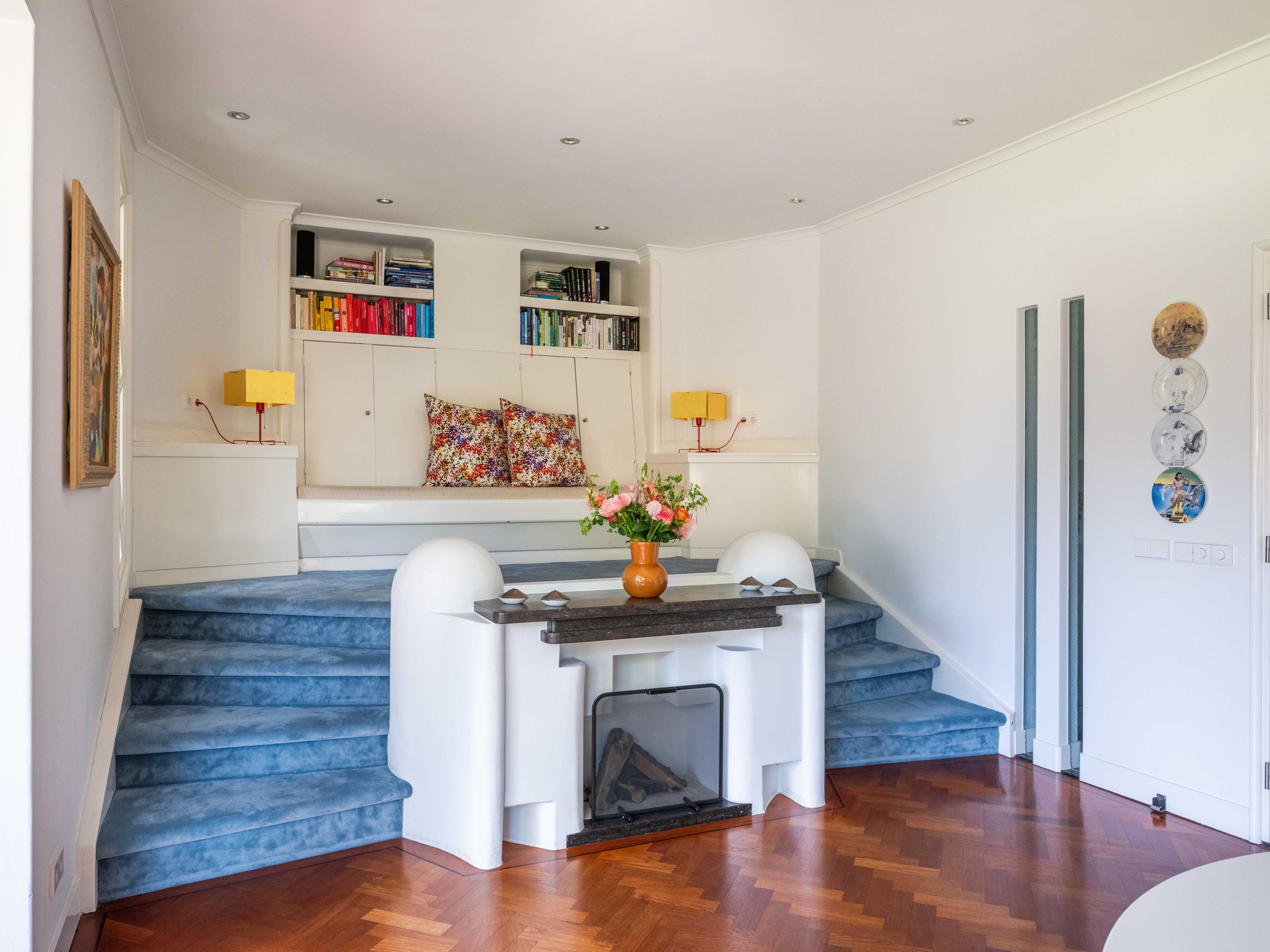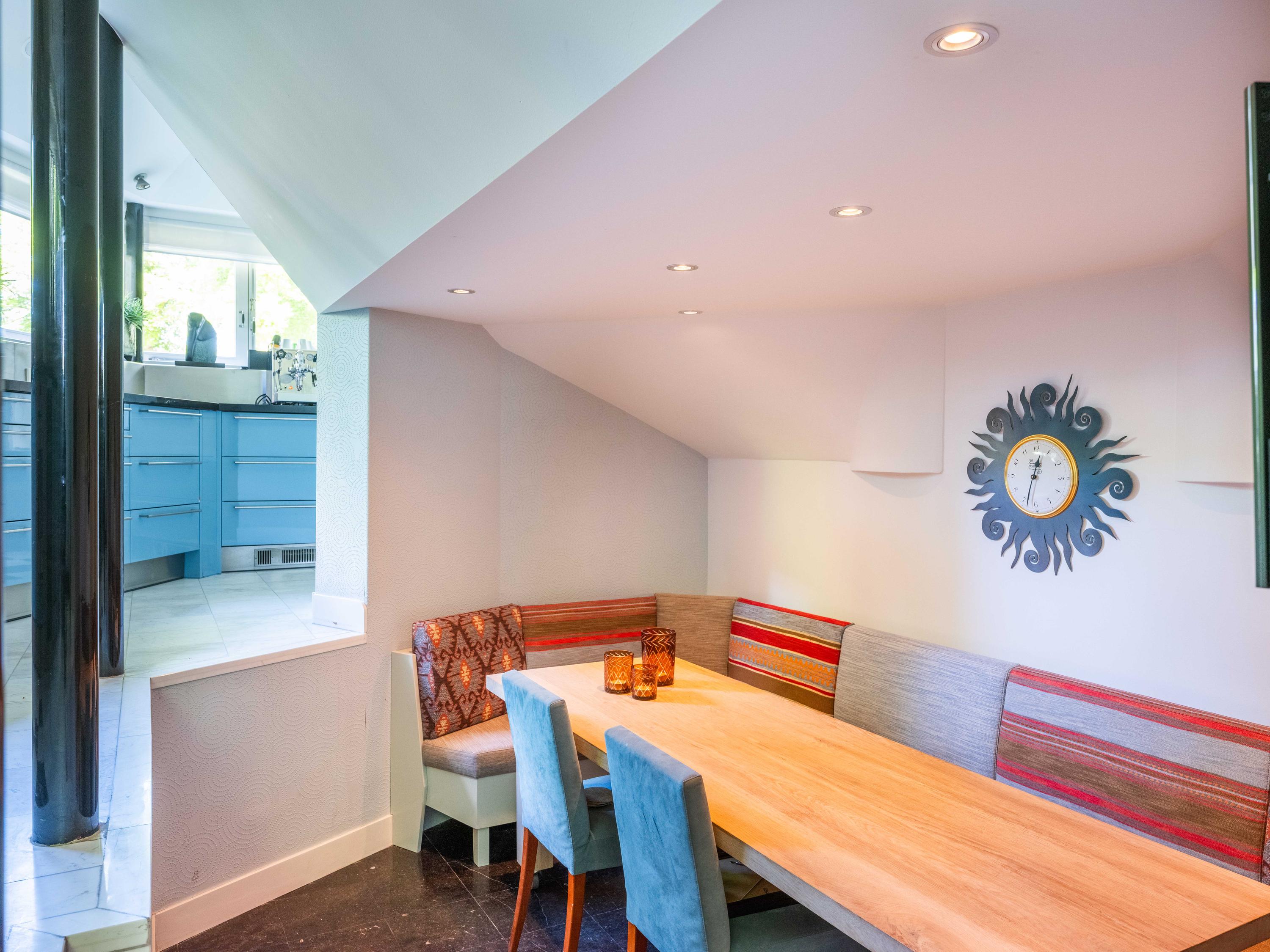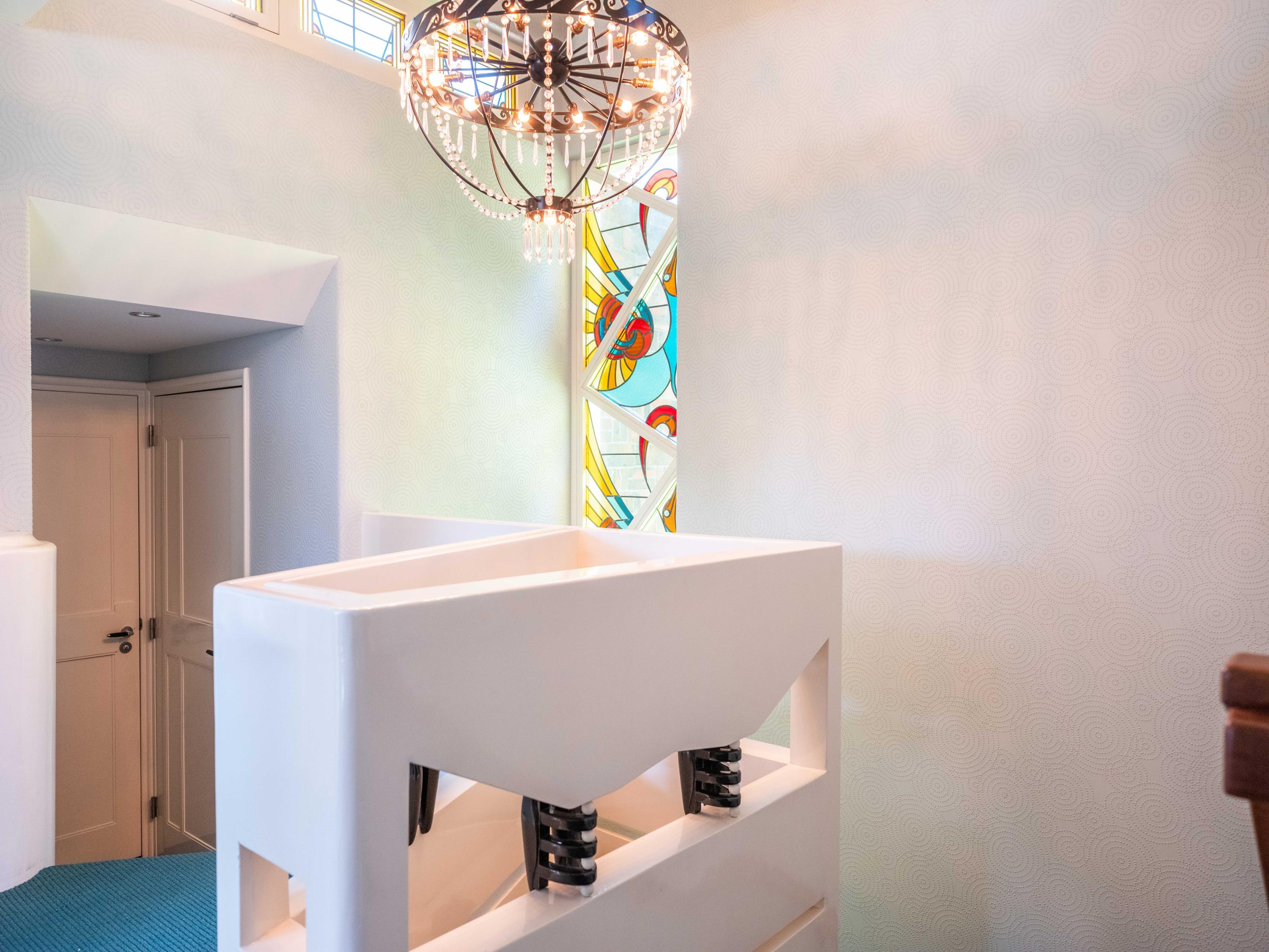 تضفي الأرضيات الخشبية المصقولة والطوب المنحني والزجاج الملون وحجر البلجيكي الأزرق تفاعلاً محسوساً بين المواد والضوء. أسفل بضع درجات، تقع المطبخ نصف سداسي اللعب المجهز بأجهزة مدمجة حديثة، ويمتد إلى منطقة طعام غائرة تتسع لاستضافة المناسبات الكبيرة.
