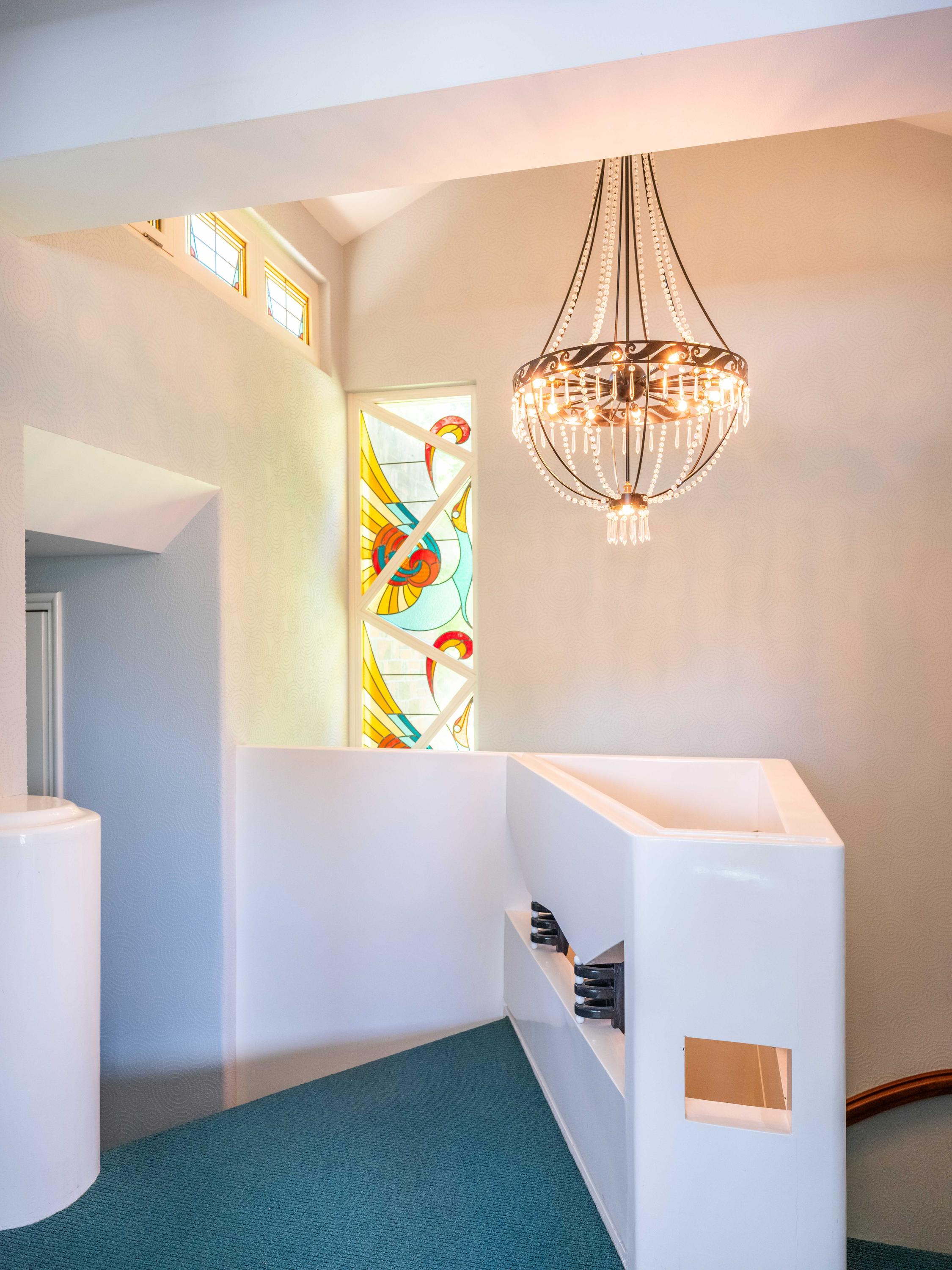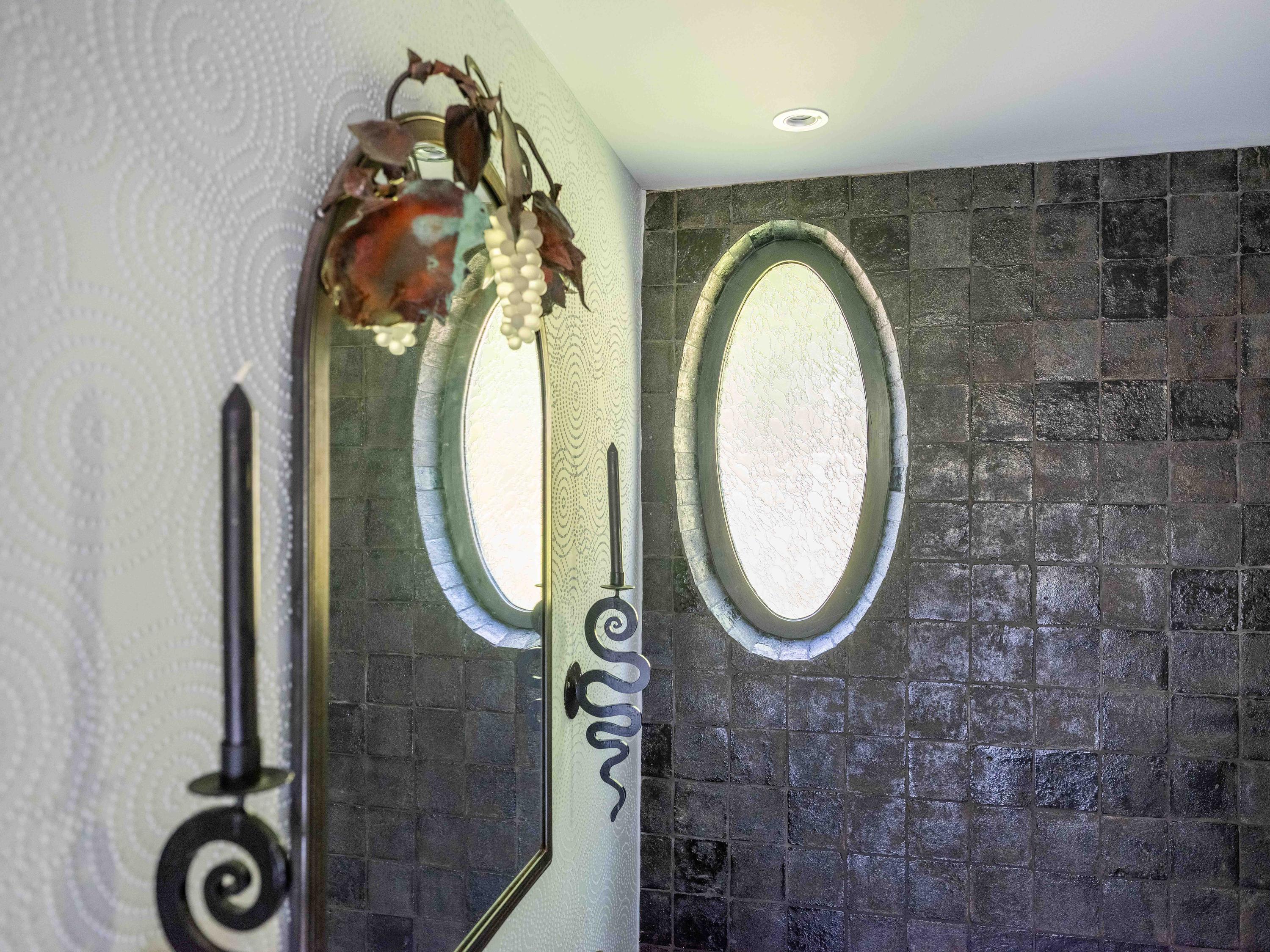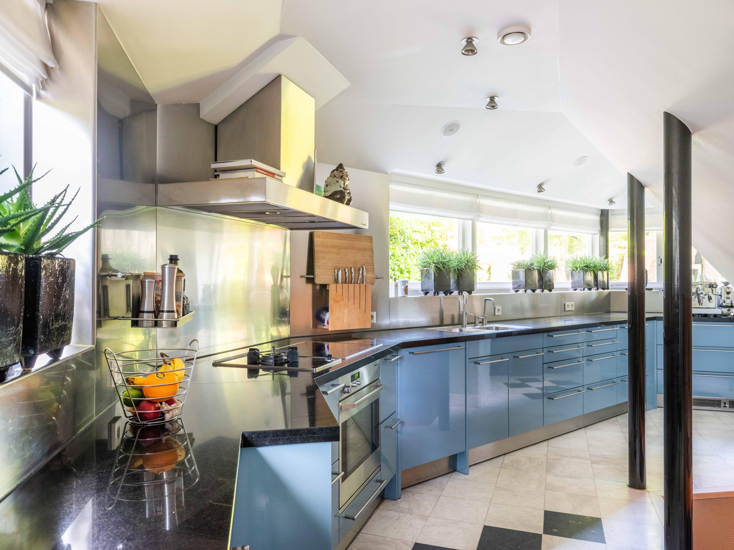 تضفي الأرضيات الخشبية المصقولة والطوب المنحني والزجاج الملون وحجر البلجيكي الأزرق تفاعلاً محسوساً بين المواد والضوء. أسفل بضع درجات، تقع المطبخ نصف سداسي اللعب المجهز بأجهزة مدمجة حديثة، ويمتد إلى منطقة طعام غائرة تتسع لاستضافة المناسبات الكبيرة.