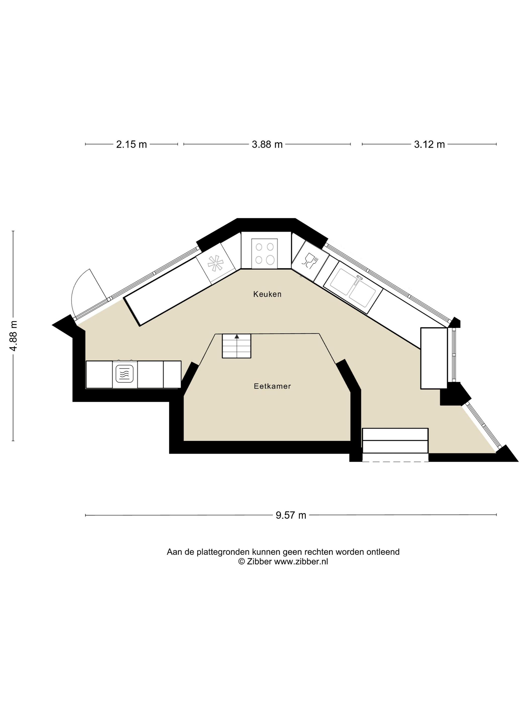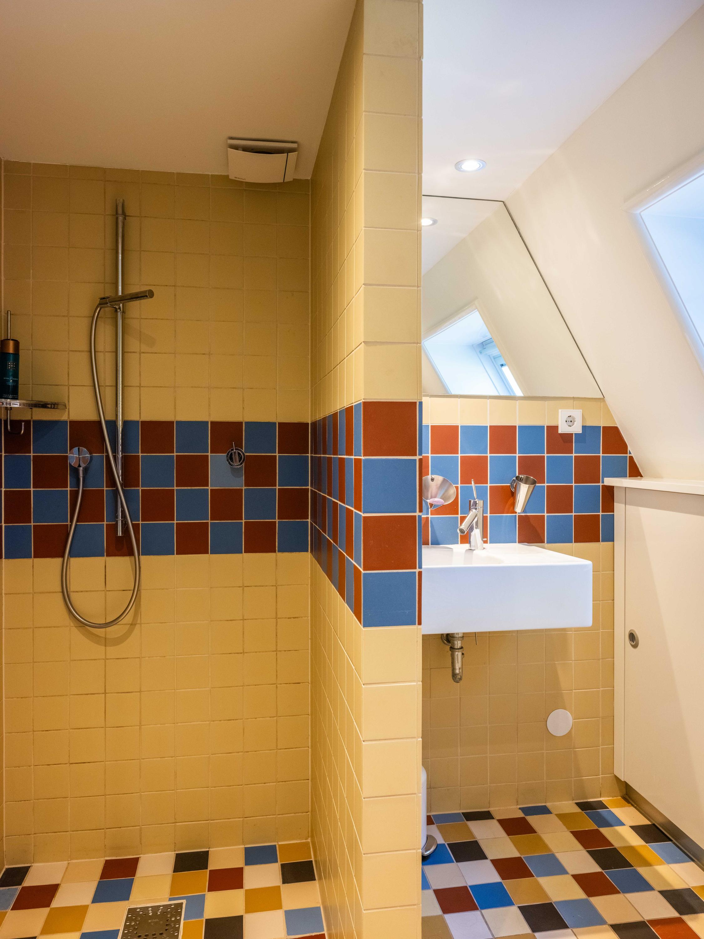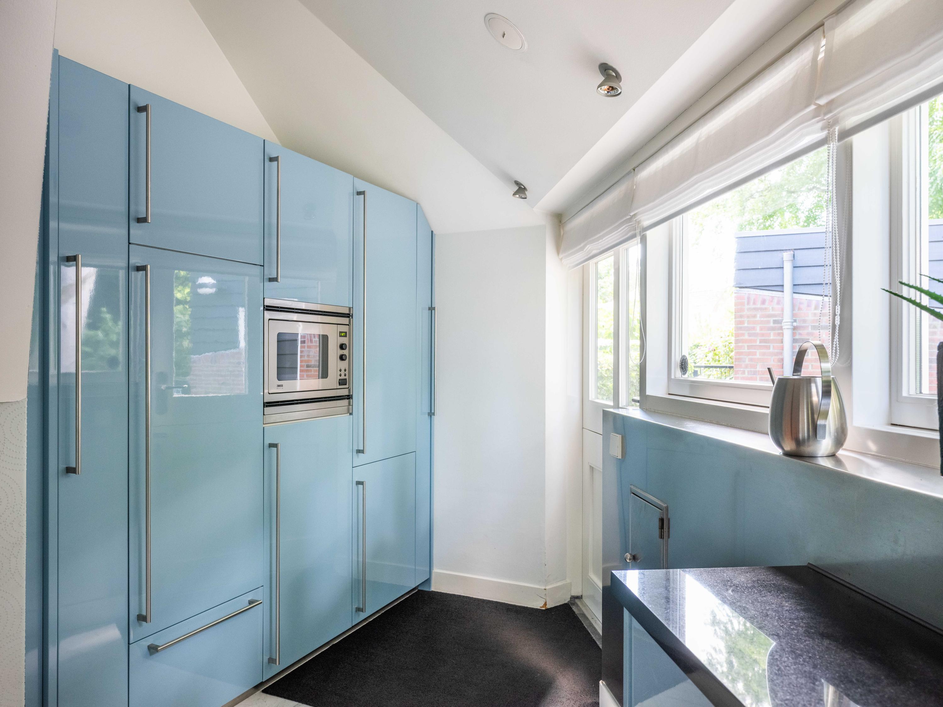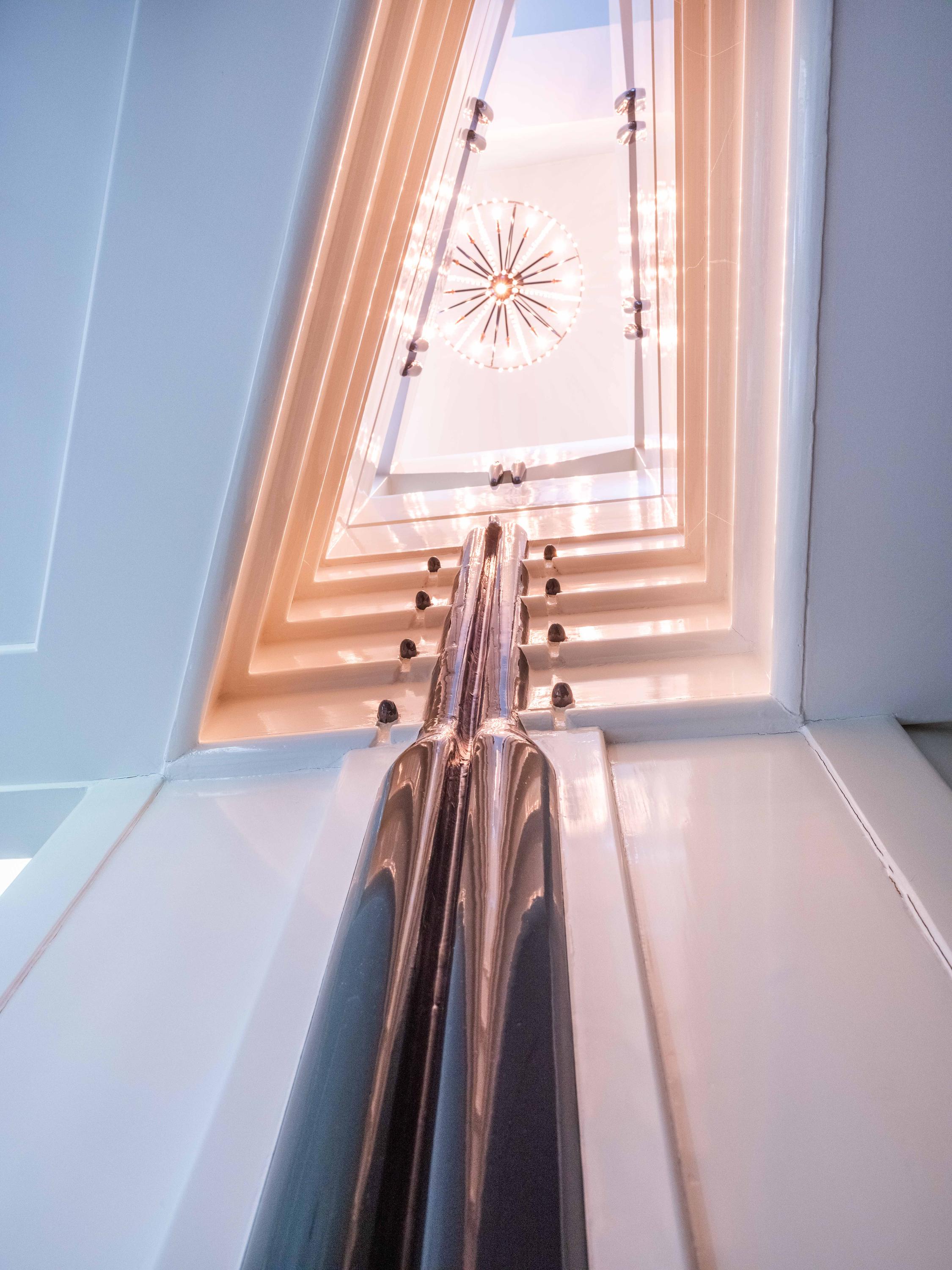 تضفي الأرضيات الخشبية المصقولة والطوب المنحني والزجاج الملون وحجر البلجيكي الأزرق تفاعلاً محسوساً بين المواد والضوء. أسفل بضع درجات، تقع المطبخ نصف سداسي اللعب المجهز بأجهزة مدمجة حديثة، ويمتد إلى منطقة طعام غائرة تتسع لاستضافة المناسبات الكبيرة.
