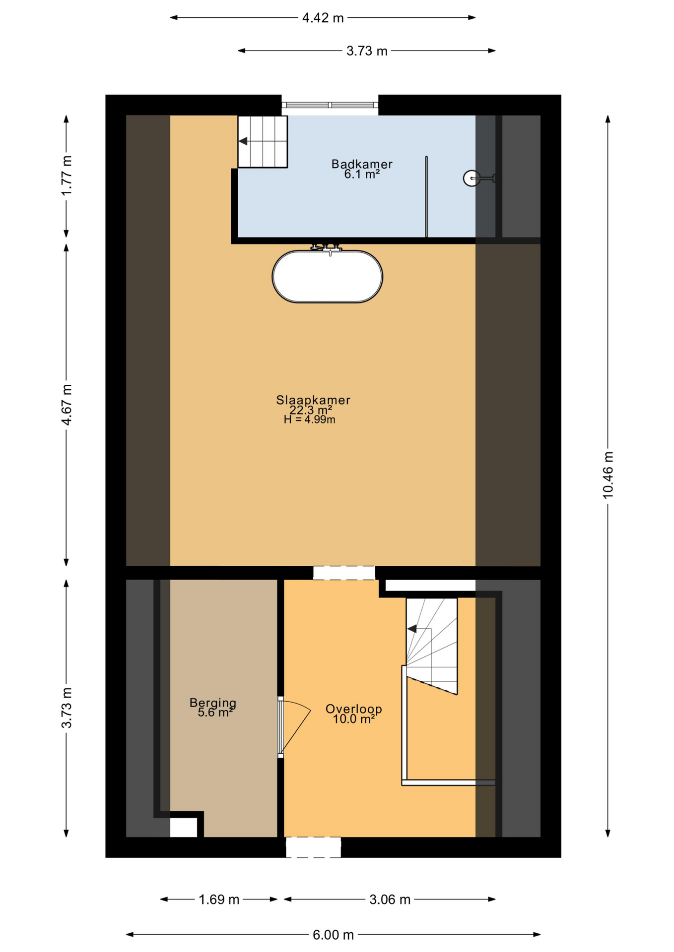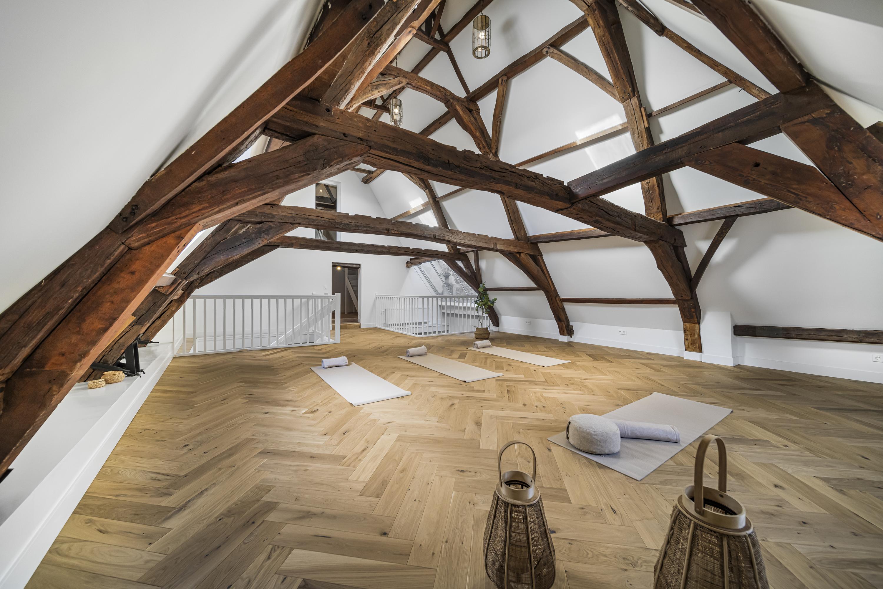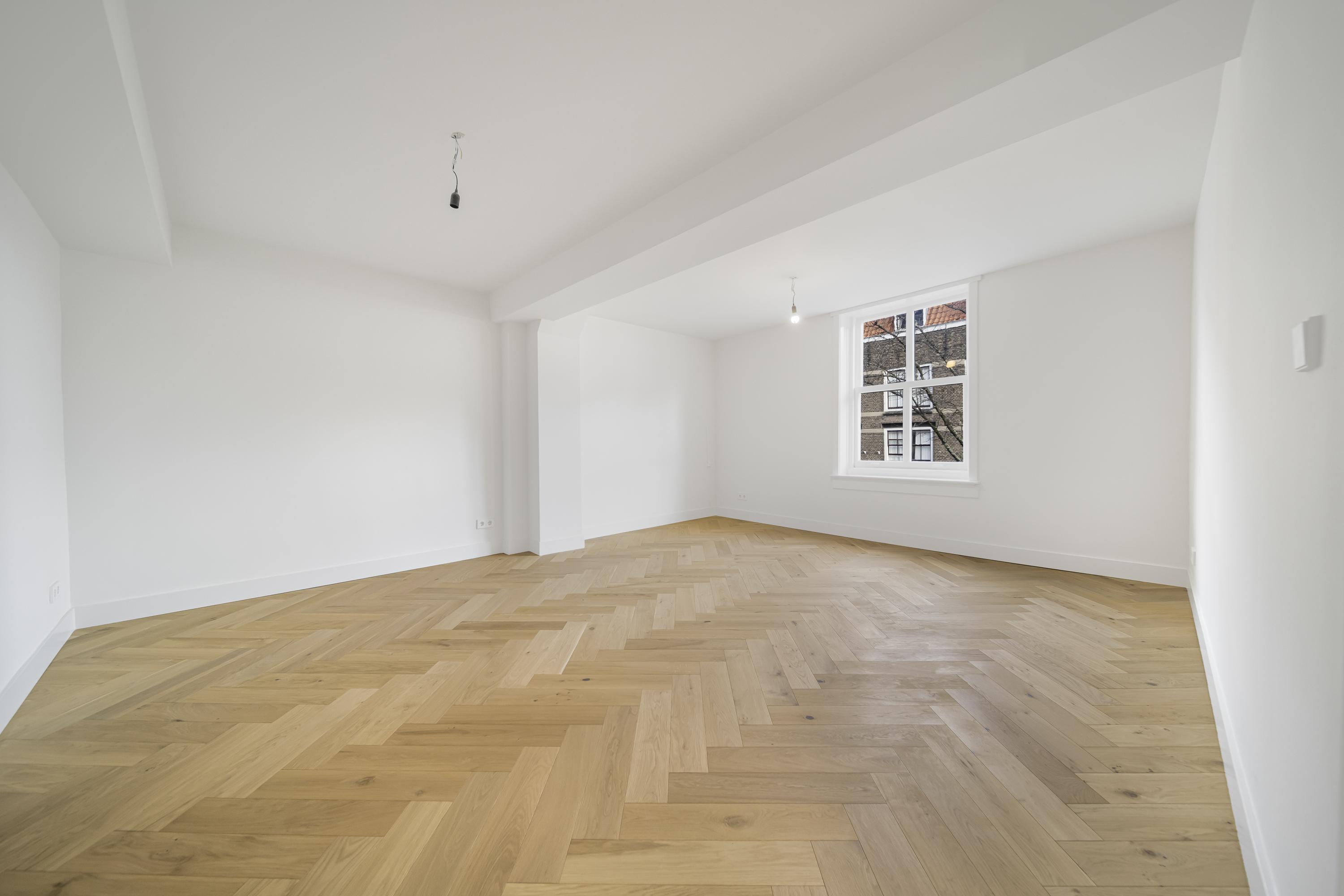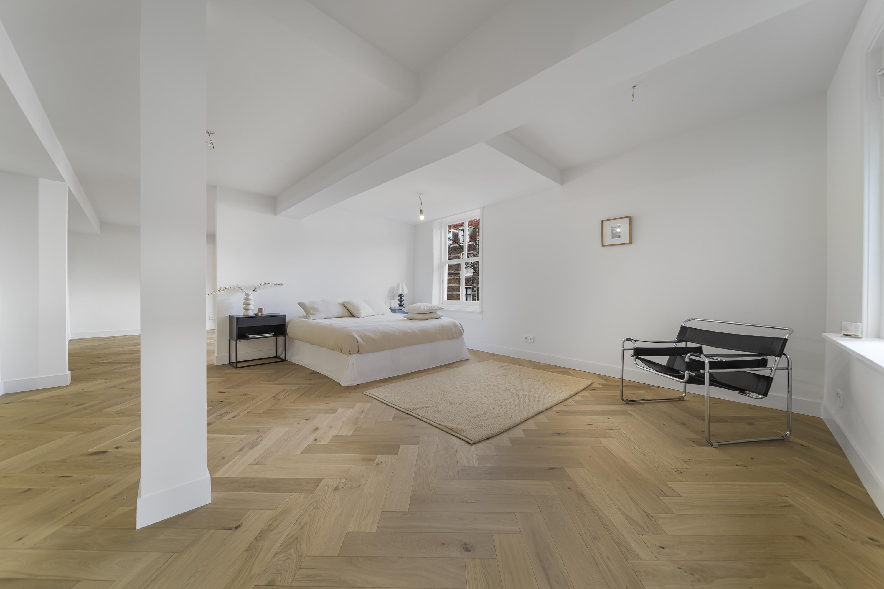 ينتقل توزيع المساحات بين أربعة طوابق. يقدم الطابق الأرضي قاعات استقبال راقية بأرضيات من الرخام الأبيض والأسود، ومساحات متعددة الاستخدامات للمعيشة والعمل، وغرفة حديقة مشمسة، وإمكانية الوصول إلى حديقة حضرية خاصة على شكل حرف L باتجاه الجنوب الغربي—وهي واحة نادرة في مركز دلفت التاريخي. توزع ست غرف نوم وأربعة حمامات على الطوابق العليا، مع وفرة الإضاءة الطبيعية، ومستوى نصفي وتصميم سقفي ملهم.