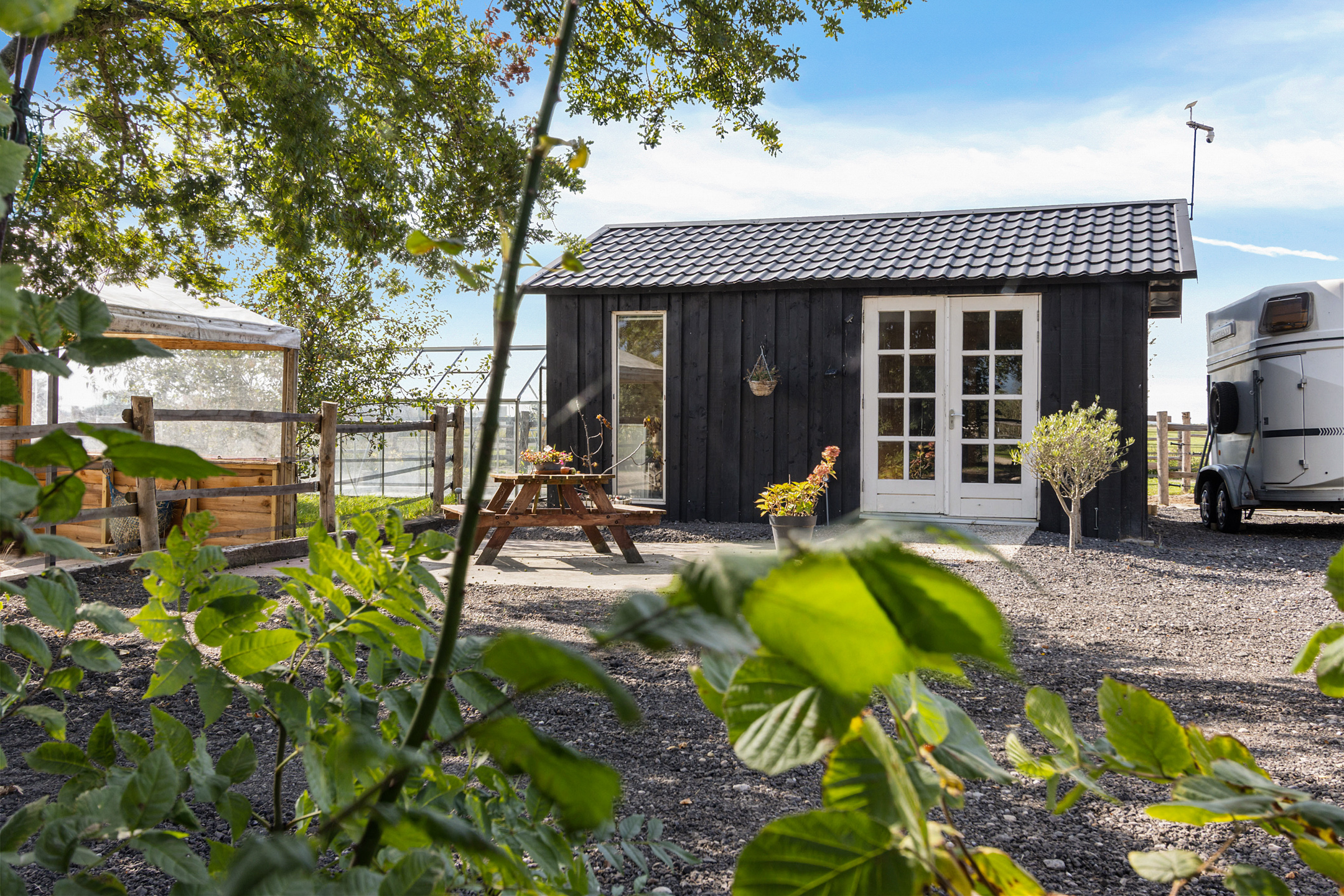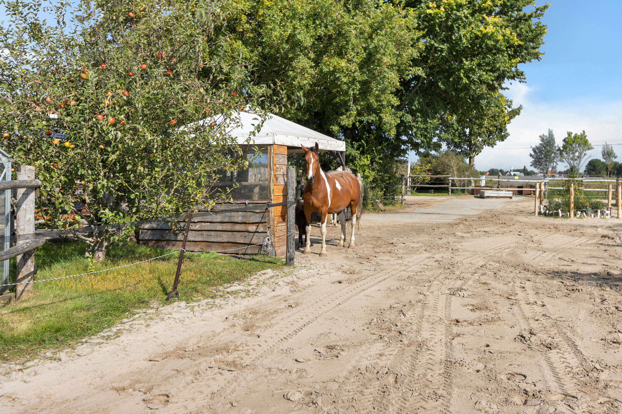 الحظيرة الكبيرة في الخلف تُعد مثالية للتخزين أو ورشة العمل، وتتصل بمخزن تبن مغطى ومرآب مع موقف سيارات مغطى وغرفة تخزين. يوجد منزل صغير ساحر بمطبخ صغير وموقد حطب ومياه جارية، منعزلاً بإطلالة على المرعى، مما يجعله مثالياً كاستوديو أو مكتب منزلي. يوفر مرعى الخيول المصمم باحتراف نباتات صالحة للأكل، وساحة ركوب صغيرة، وعدة ملاجئ، وإسطبلاً واسع الدخول، وغرفة عدة، وغرفة أعلاف، ليشكل ملاذاً لمحبي الفروسية.