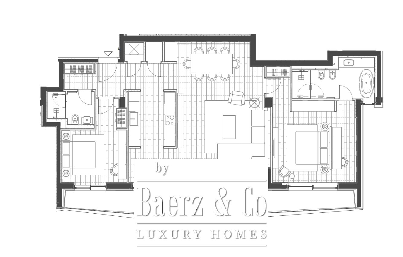 يتضمن مخطط الشقة ردهة، وغرفة معيشة تندمج بسلاسة مع المطبخ ومنطقة الطعام، وغرفتي نوم، وحمامين، ودورة مياه للضيوف، وتراساً واسعاً. من هنا، تبرز الإطلالات البانورامية على البحر والمارينا والجبال المحيطة، ما يعكس ضوء الجبل الأسود المتغير في كل مساحة. أرضيات منجَّزة، وحمامات مجهزة، وتكييف هواء يضفون شعوراً بالراحة والرقي، مع الاستفادة من الدخول إلى المسابح والشواطئ الخاصة والمرافق الرياضية داخل المجمع.