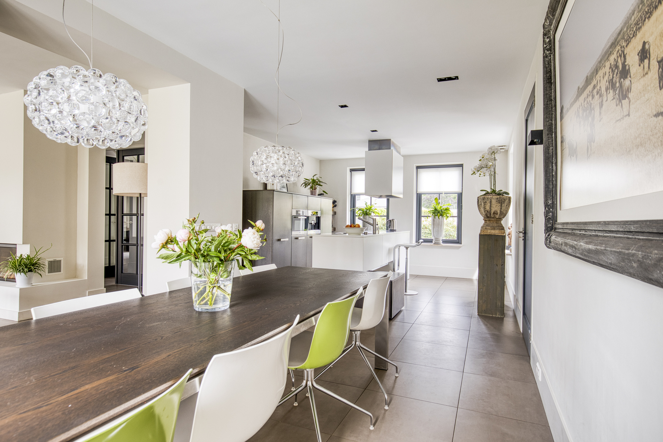 De Boffi keuken links van de living is een echte blikvanger. Voorzien van een kookeiland, een vaste kastenwand met inbouwapparatuur en ruimte voor een grote eettafel. Ideaal voor lange diners met vrienden en familie. Ook hier brengen openslaande deuren naar de tuin veel licht en een heerlijk vrij gevoel.