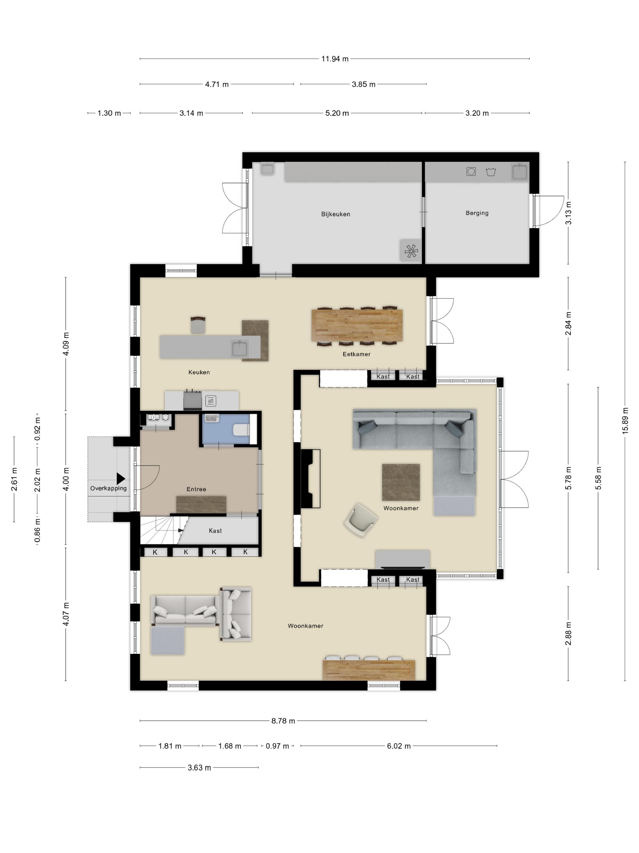 Aansluitend op de keuken treft u een grote bijkeuken en separate berging, perfect voor huishoudelijke apparatuur en als tweede entree vanaf de oprit. Garderobeproblemen zijn hier verleden tijd: een zee aan opbergruimte voor jassen, tassen en schoenen biedt dagelijks gemak.