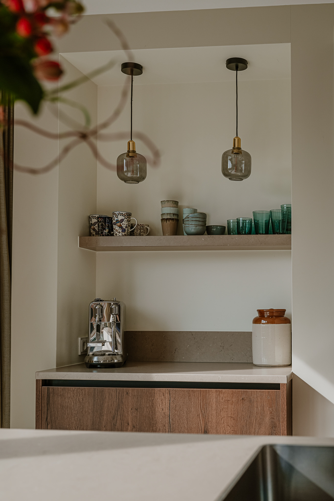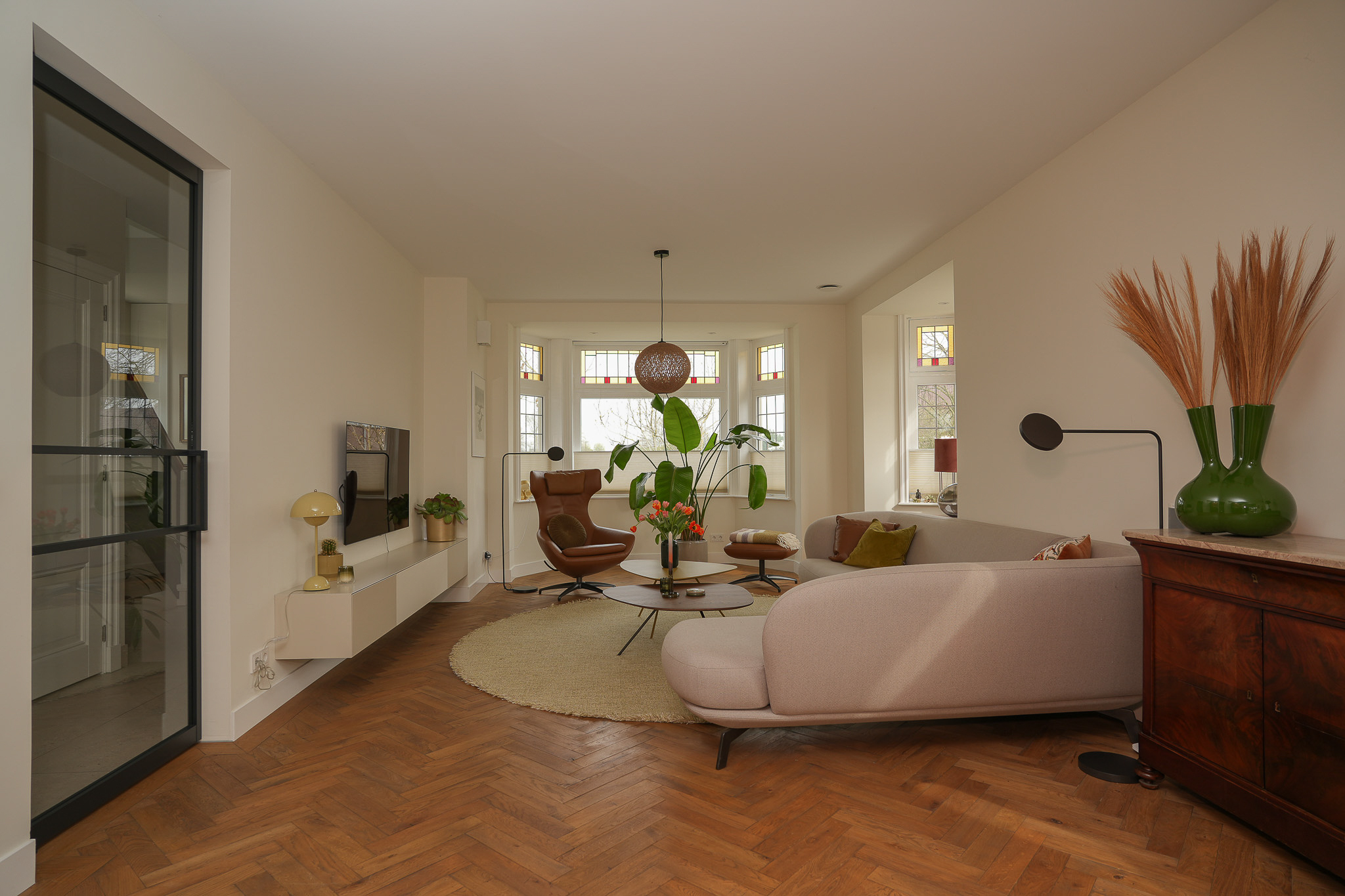 عند الدخول، تظهر روح التجديد في كل تفاصيل المنزل. يدمج الطابق الأرضي غرفة معيشة مشرقة مع نوافذ بانورامية وزجاج ملون وباركيه بنقشة عظم السمكة، متدفقًا بشكل طبيعي إلى مطبخ عصري واسع تفتح أبوابه المنزلقة على تجربة معيشة سلسة بين الداخل والخارج. وتضفي عناصر مدروسة مثل التدفئة الأرضية، وباب دوار من الصلب، وخزائن مصممة خصيصًا، وجزيرة مركزية، طابع الفخامة الهادئة والوظائف الراقية.