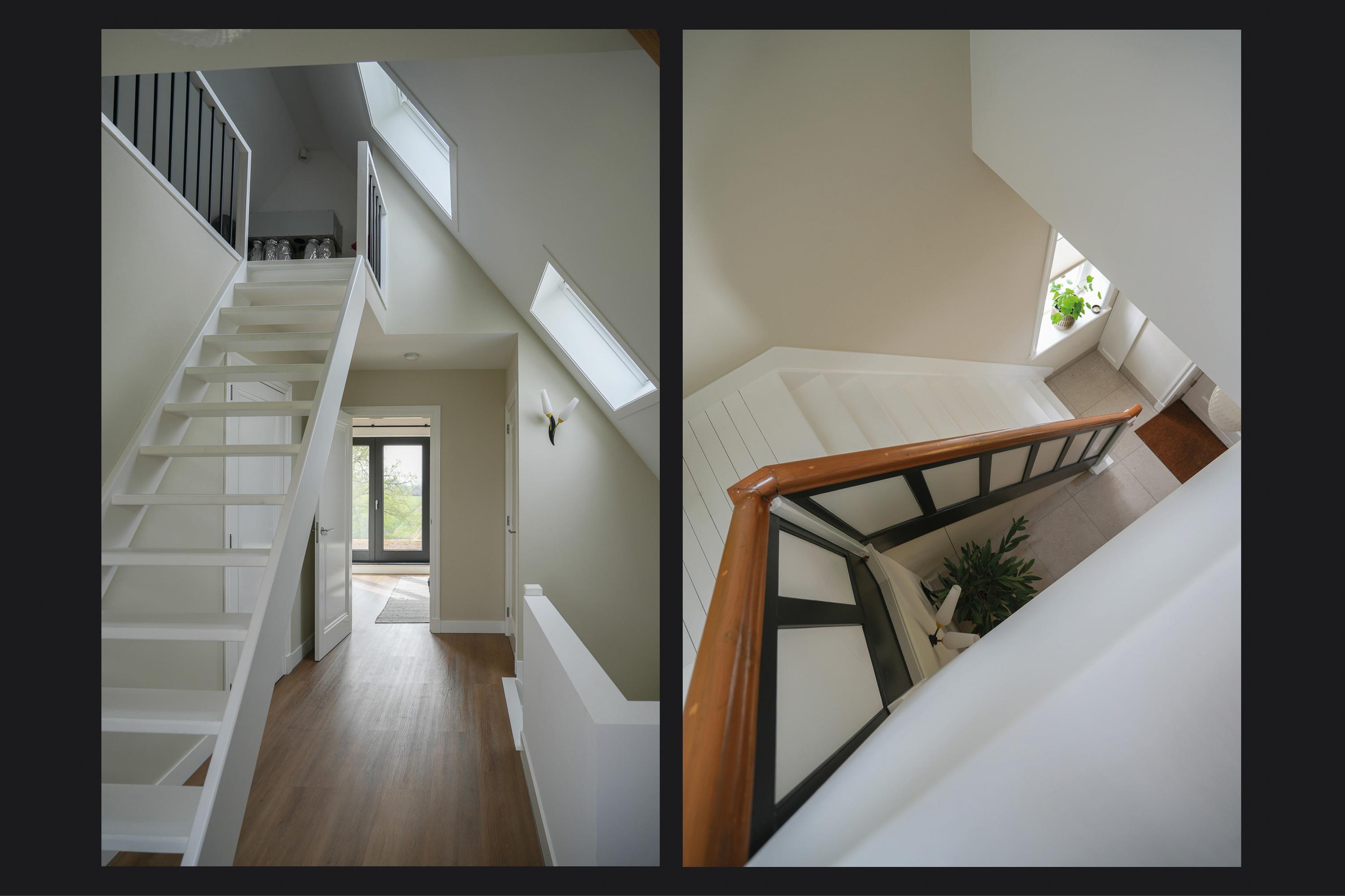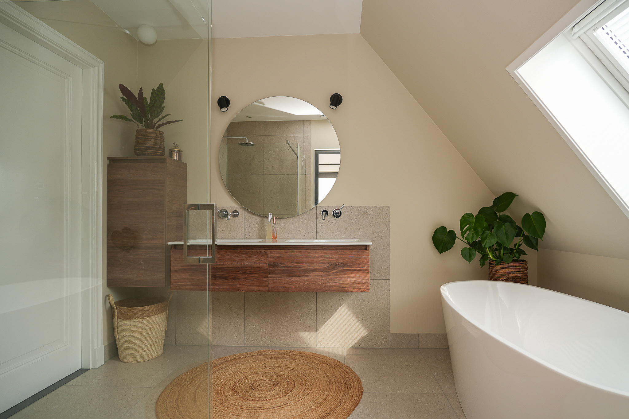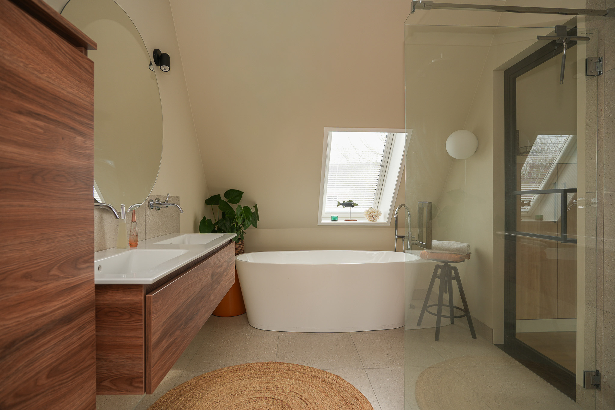 في الطابق العلوي، توفر غرفتا النوم إطلالات هادئة، إحداهما مع غرفة ملابس مصممة خصيصًا ووصول مباشر إلى شرفة خاصة فوق امتداد المطبخ. ويتميز الحمام المصمم بأسلوب كلاسيكي بحوض استحمام منفصل، ودش مطري، وحوض مزدوج. وتنعكس الاستدامة في جميع تفاصيل المنزل من خلال العزل عالي الجودة، ومضخة حرارية أرضية المصدر، وتهوية متوازنة مع نظام استرداد الحرارة، وتصنيف طاقة A+++.