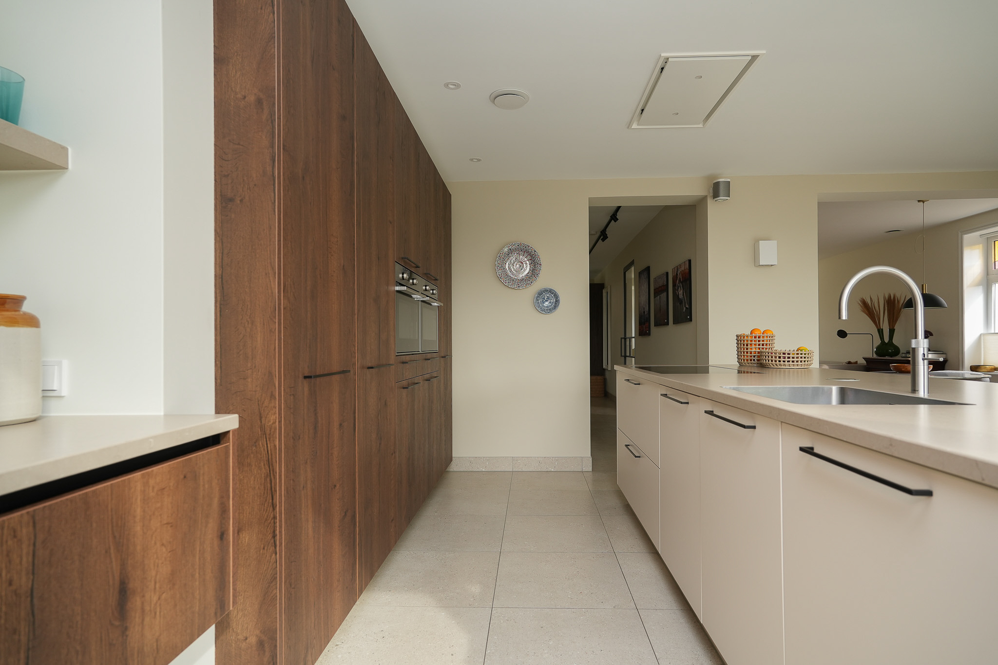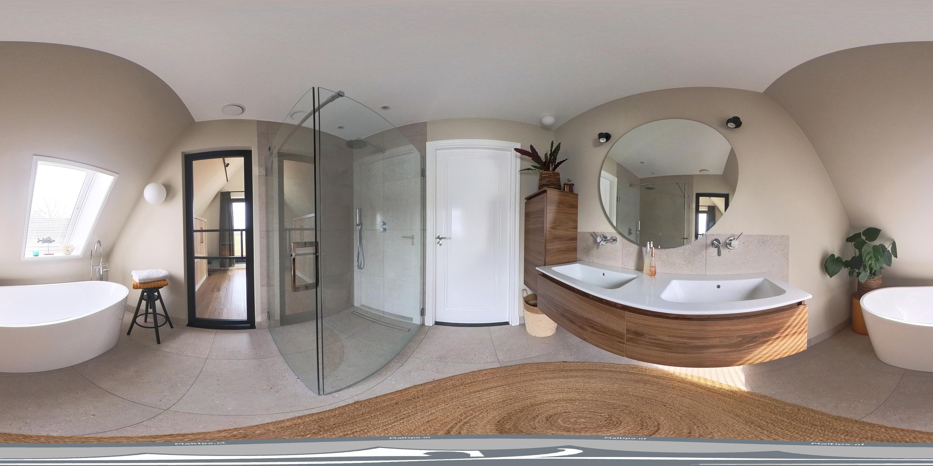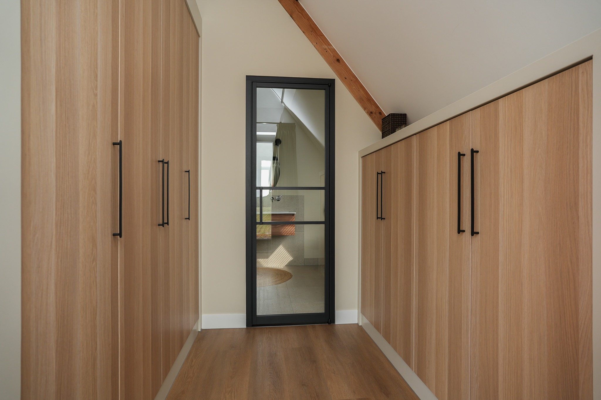 في الطابق العلوي، توفر غرفتا النوم إطلالات هادئة، إحداهما مع غرفة ملابس مصممة خصيصًا ووصول مباشر إلى شرفة خاصة فوق امتداد المطبخ. ويتميز الحمام المصمم بأسلوب كلاسيكي بحوض استحمام منفصل، ودش مطري، وحوض مزدوج. وتنعكس الاستدامة في جميع تفاصيل المنزل من خلال العزل عالي الجودة، ومضخة حرارية أرضية المصدر، وتهوية متوازنة مع نظام استرداد الحرارة، وتصنيف طاقة A+++.