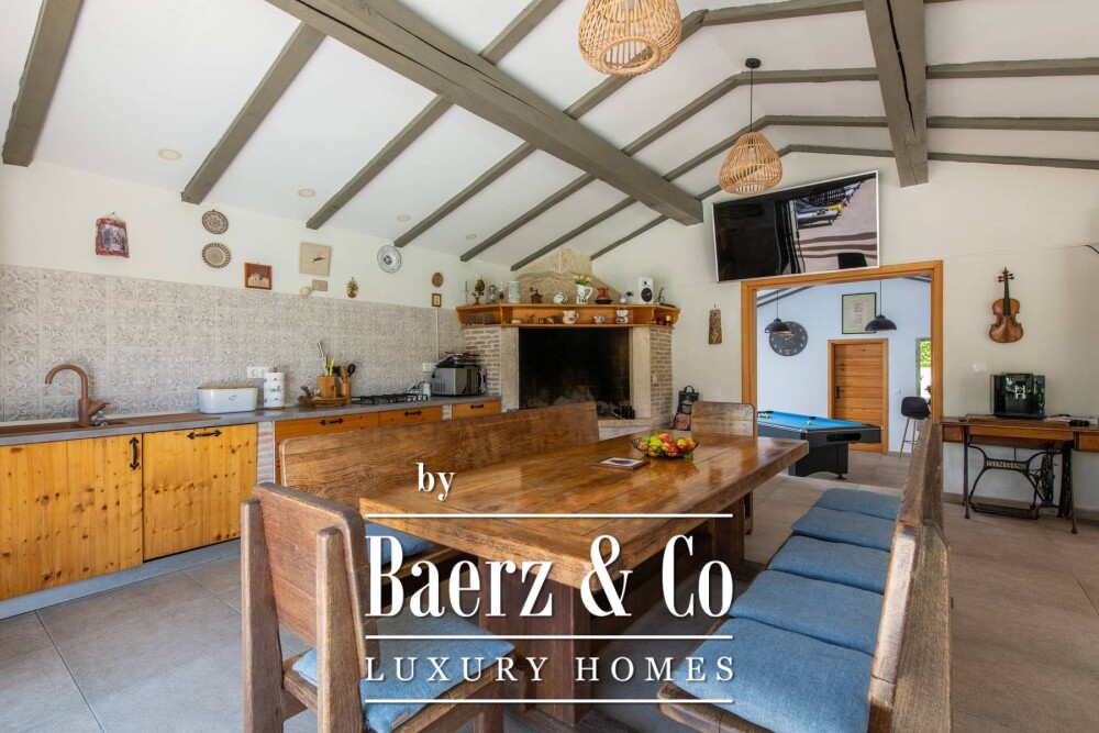 توزع ست غرف نوم وست حمامات في الطوابق العليا مع اهتمام مدروس بإدخال الضوء والهواء. تجمع الفيلا بين متانة البناء الحجري التي تحافظ على برودتها في الصيف ونظام تكييف متطور لضمان الراحة العصرية. في الحديقة، يوجد بيت ضيافة مستقل بمساحة 165 م² مع تراس من طابقين ومطبخ خارجي ومدفأة وجناح ترفيهي يشمل طاولة بلياردو وألعاب الأسهم وكرة القدم الطاولة، مما يمنح الضيوف والمالكين أجواءً مثالية للهدوء أو تجمع الأصدقاء. تضم مواقف سيارات مغطاة وخاصة تتسع لخمسة مركبات بشكل أنيق.