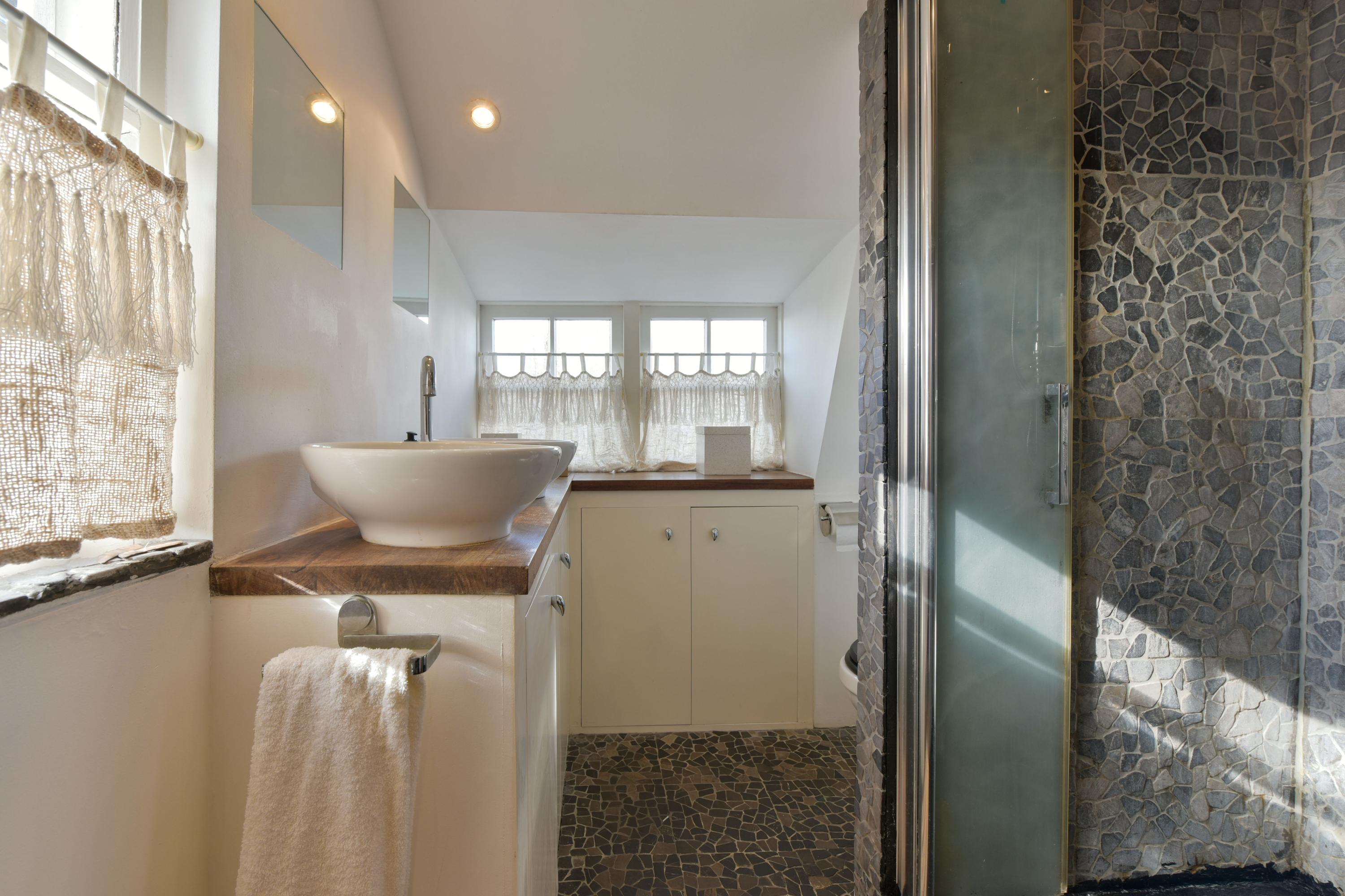 يبرز الجو من خلال تفاصيل ملموسة: عوارض خشبية بالسقف، مدفأة جذابة مزودة بموقد حطب، وانسيابية معمارية مدروسة. المطبخ المفتوح مجهز بجزيرة طهي كبيرة ومساحات تخزين مدمجة، بينما توفر غرفتا النوم مرونة في الاستخدام. الحمام مصمم بعناية للراحة، ويضم دشاً كبيراً للمشي بداخله، وحوض استحمام جاكوزي، وحوضي غسيل مزدوجين.