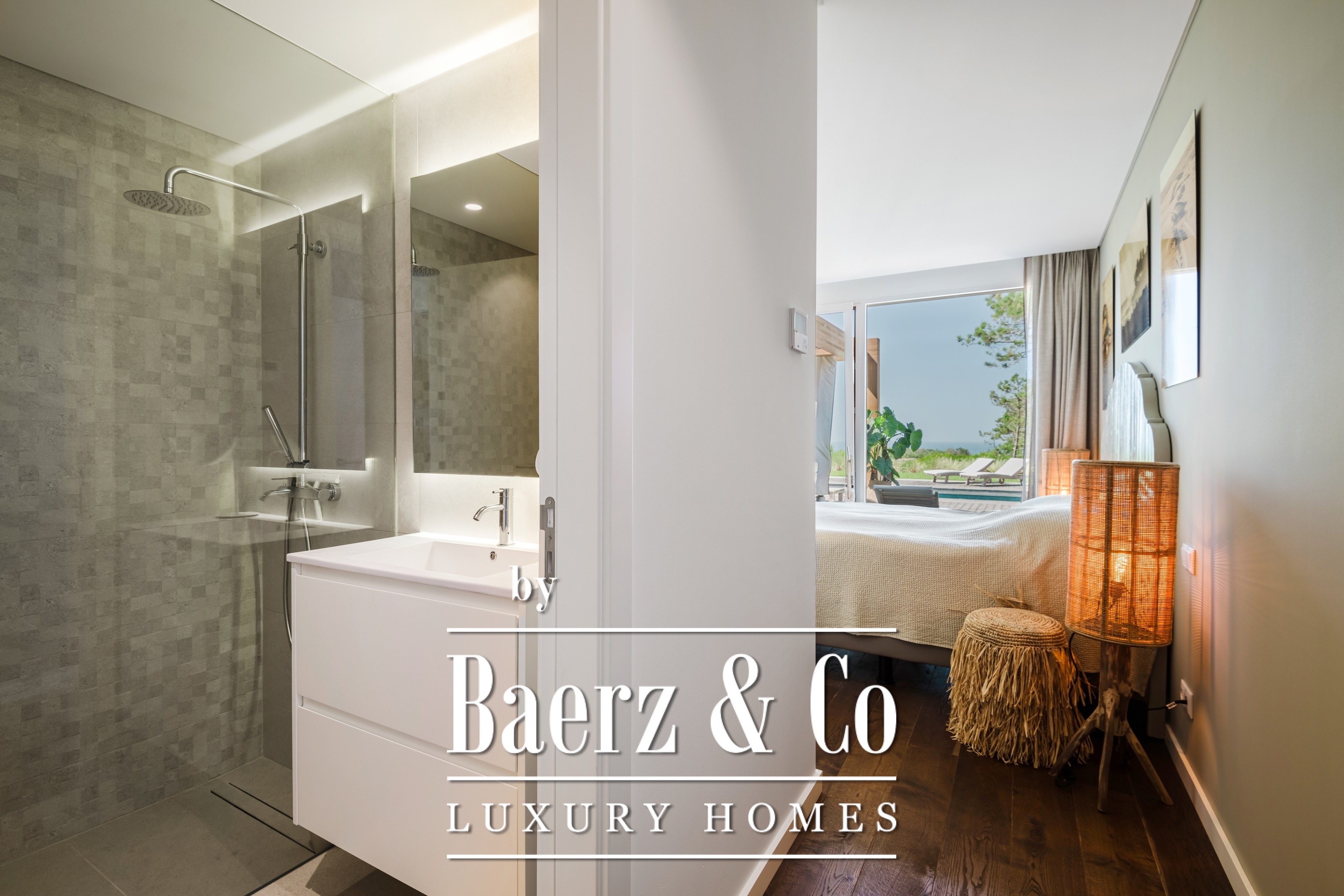 يتسم المخطط الداخلي بالسيولة والوظيفية، ويضم ثلاث غرف نوم لكل منها حمام خاص، وأربعة حمامات، وغرفة معيشة وسفرة ذات تصميم مفتوح مع مطبخ، بالإضافة إلى منطقة غسيل مخصصة. تعزز الألواح الزجاجية الواسعة العلاقة بين المعيشة الداخلية وحديقة العقار، حيث يوفر المسبح البالغ طوله 12 مترًا وعرضه 3 أمتار والمنصة الخشبية الكبيرة أجواء مثالية لتناول الطعام في الهواء الطلق والاسترخاء والتأمل الهادئ.