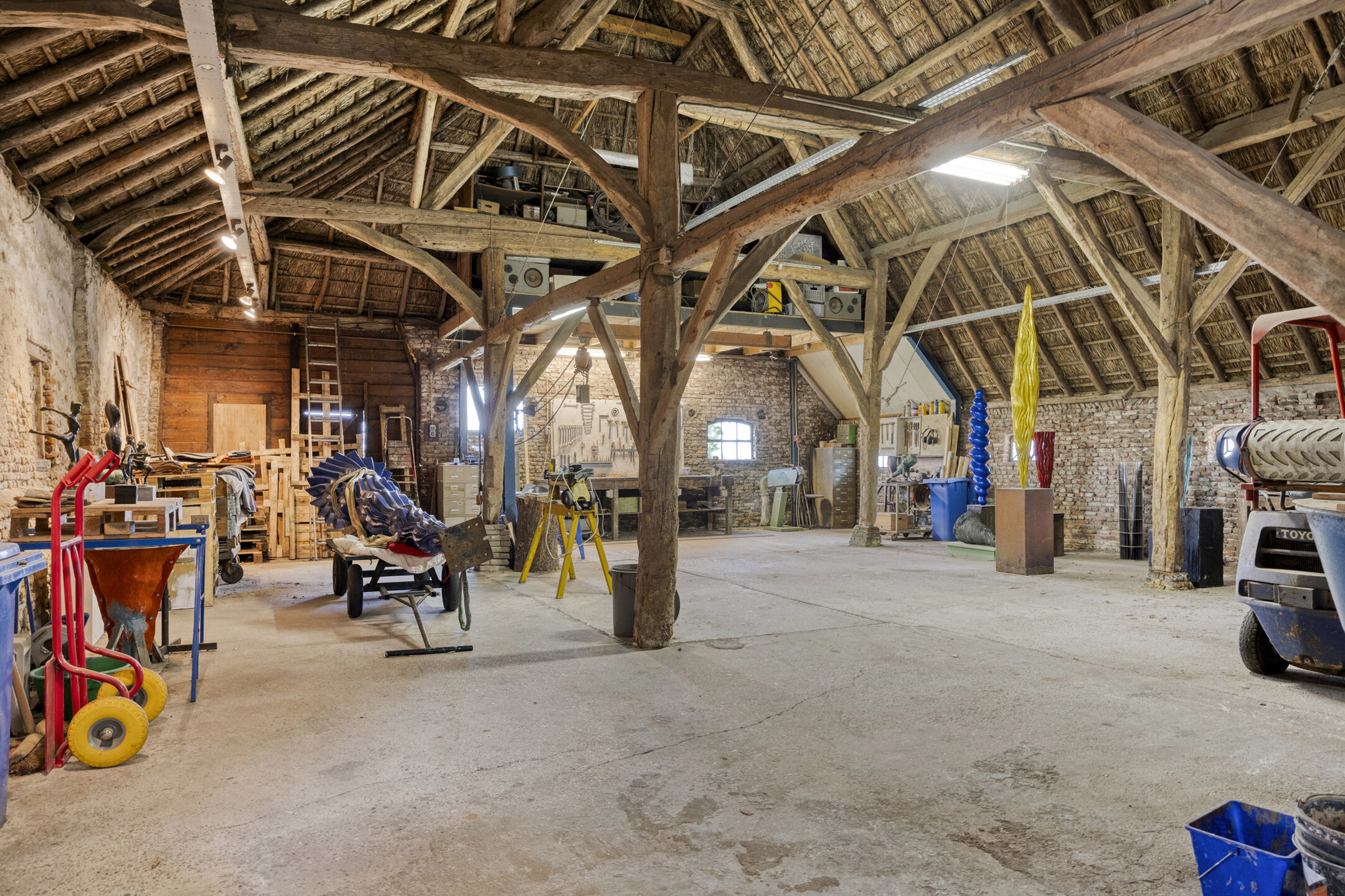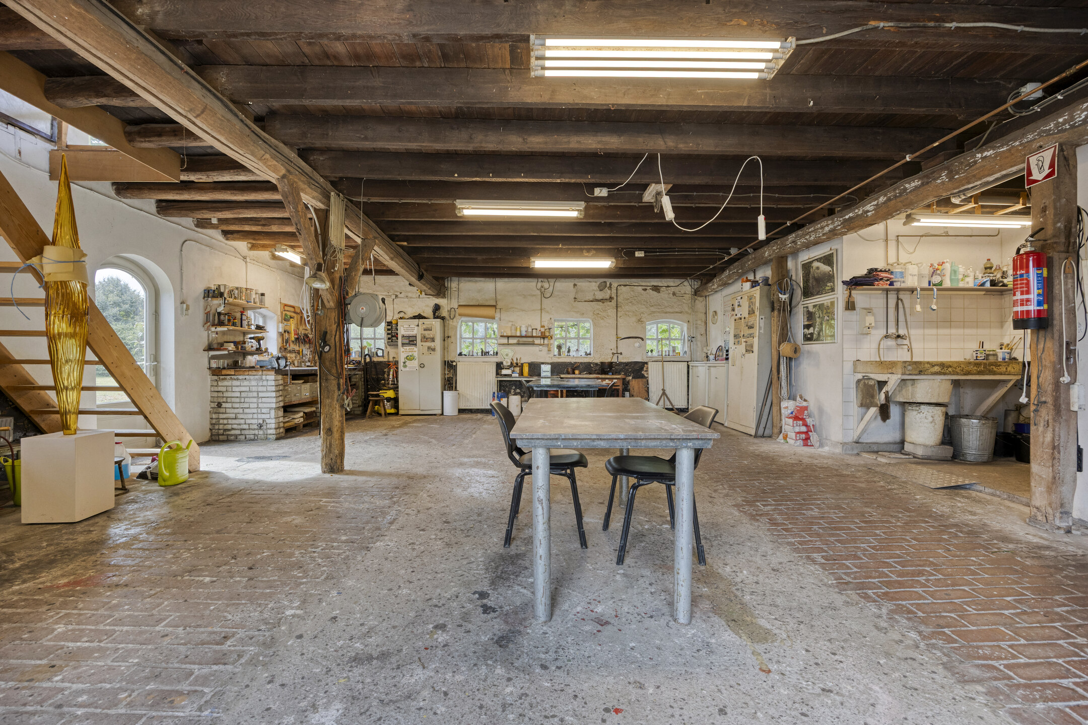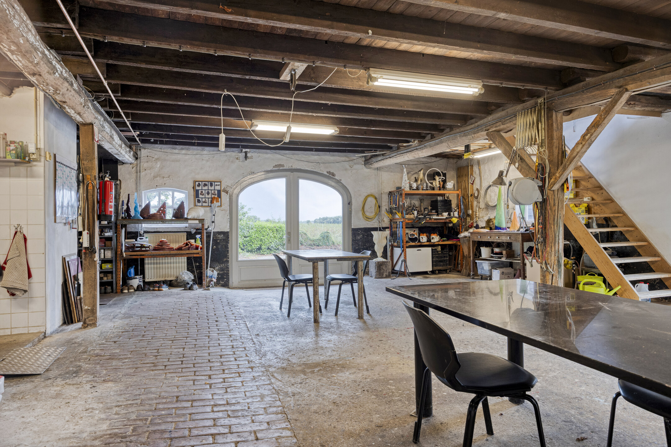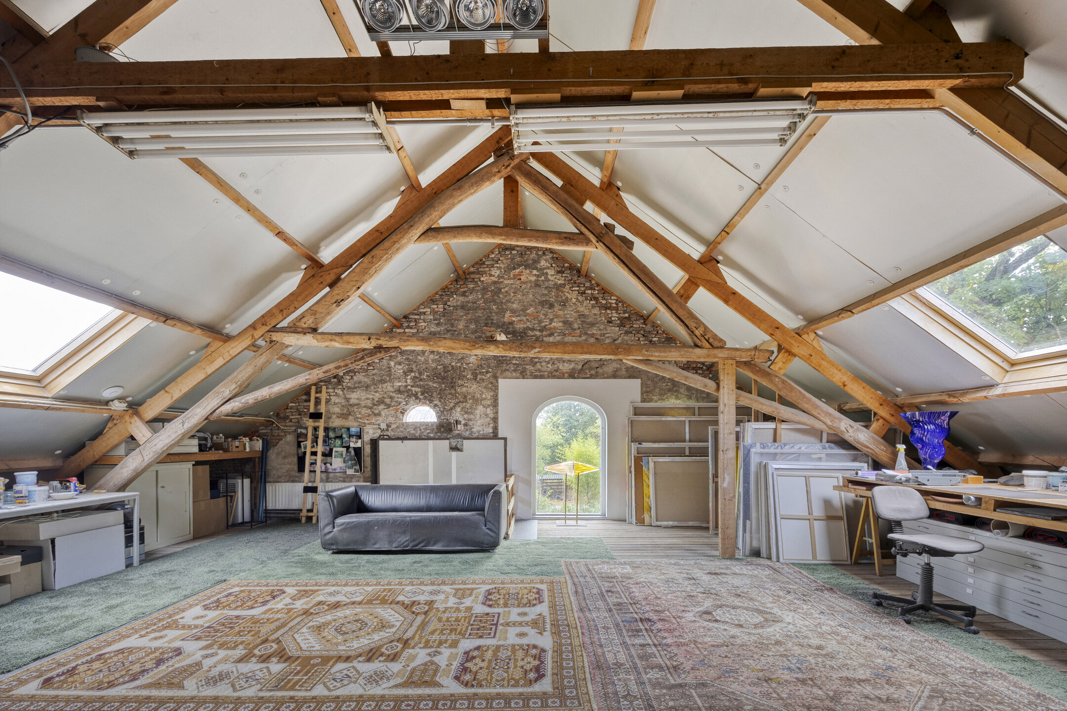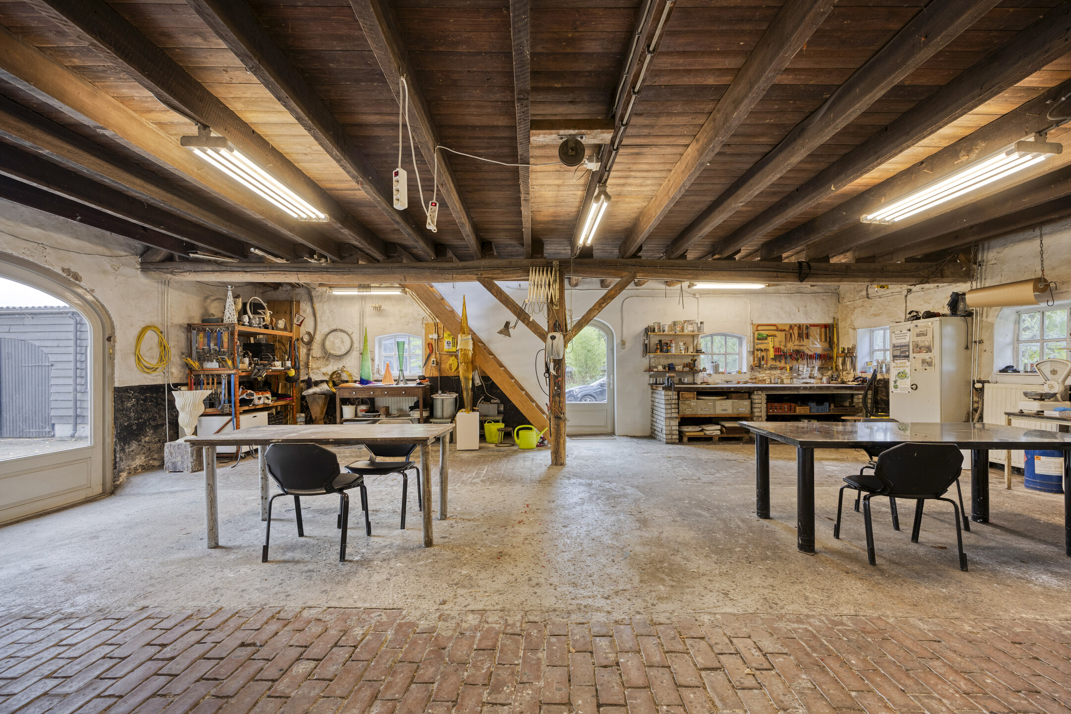 يعكس السكن الرئيسي أجواءً من الانفتاح المدروس. الغرف واسعة المساحة، وتضم ثلاث غرف نوم، وتجمع بين أرضيات باركيه من خشب البلوط، وتشطيبات خشبية متينة، وجسور خشبية مكشوفة، مما يضفي أصالة على تفاصيل الحياة اليومية. تبلغ مساحة الاستوديو الداخلي 87 متر مربع، ويحتفظ بمرونته سواء أردته أتيليهاً فنياً، مساحة معيشة إضافية أو مكتب منزلي. هناك إمكانية واضحة لإضافة غرف نوم أو ترتيب سكن مزدوج، مدعوماً بمساحات متعددة الوظائف وارتباط مباشر بالحدائق المصممة بعناية.