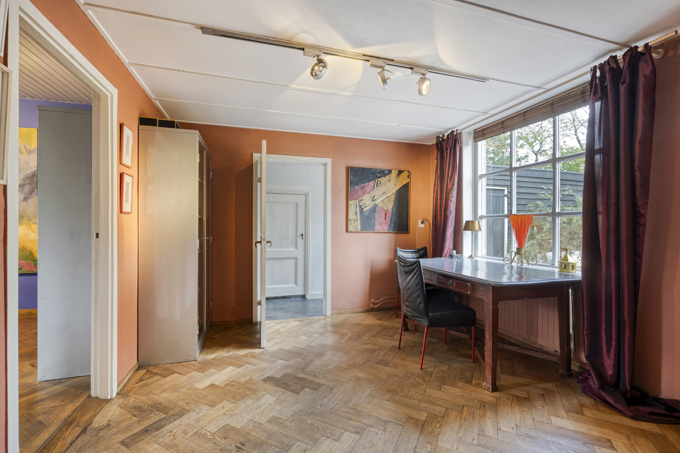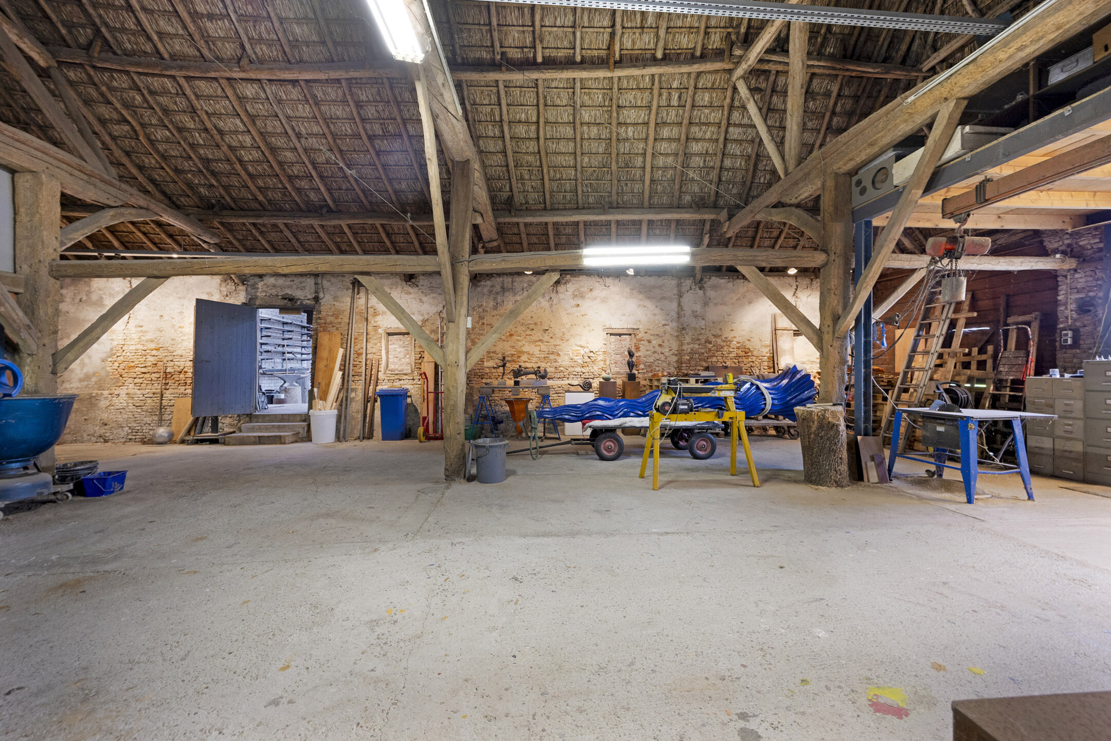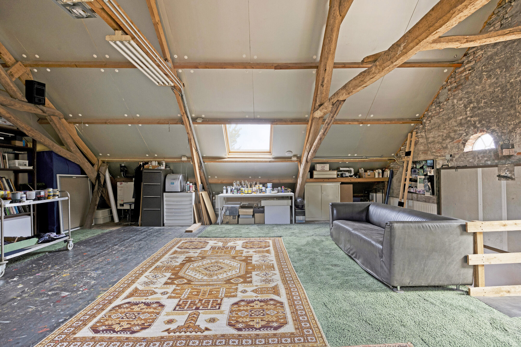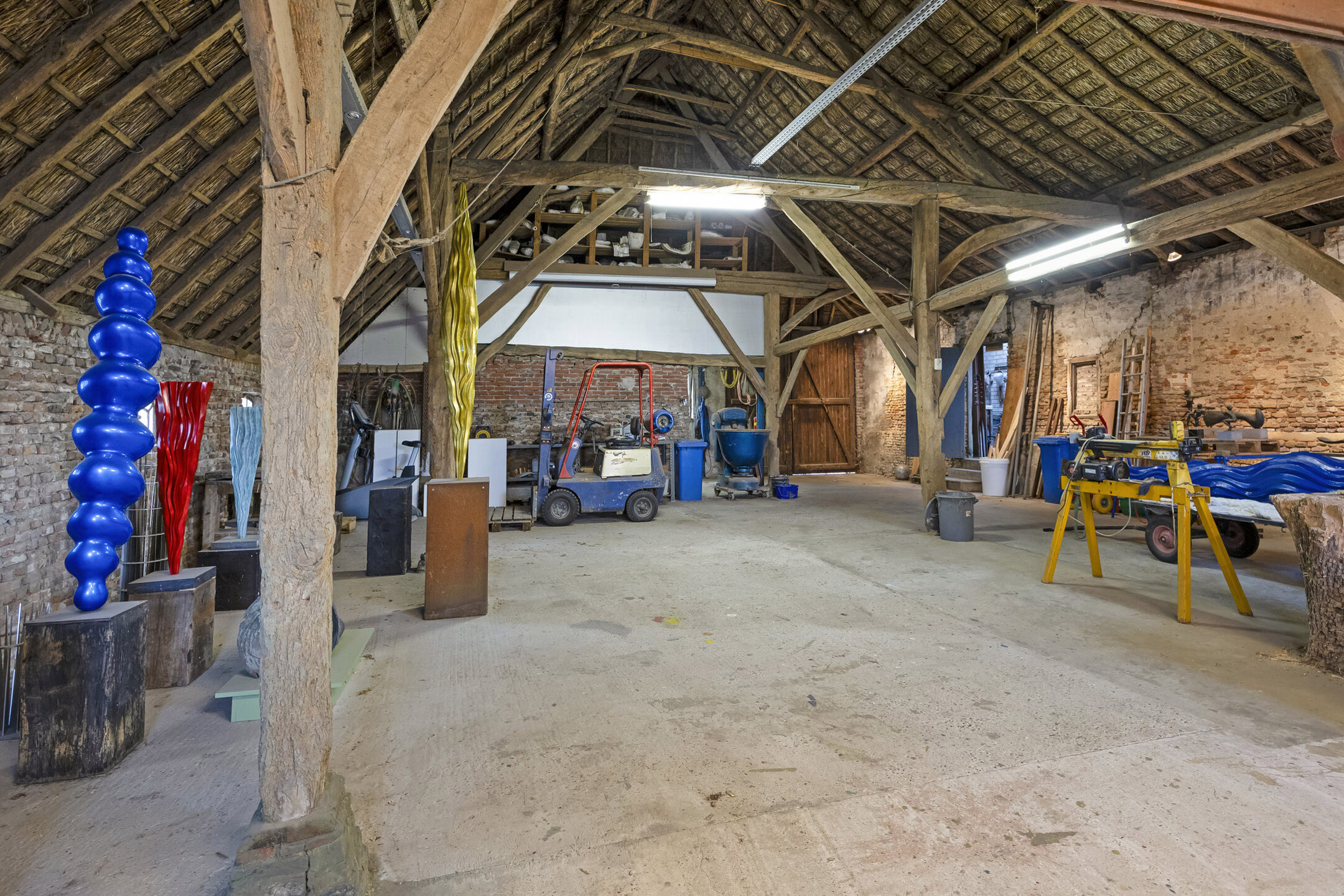 يعكس السكن الرئيسي أجواءً من الانفتاح المدروس. الغرف واسعة المساحة، وتضم ثلاث غرف نوم، وتجمع بين أرضيات باركيه من خشب البلوط، وتشطيبات خشبية متينة، وجسور خشبية مكشوفة، مما يضفي أصالة على تفاصيل الحياة اليومية. تبلغ مساحة الاستوديو الداخلي 87 متر مربع، ويحتفظ بمرونته سواء أردته أتيليهاً فنياً، مساحة معيشة إضافية أو مكتب منزلي. هناك إمكانية واضحة لإضافة غرف نوم أو ترتيب سكن مزدوج، مدعوماً بمساحات متعددة الوظائف وارتباط مباشر بالحدائق المصممة بعناية.