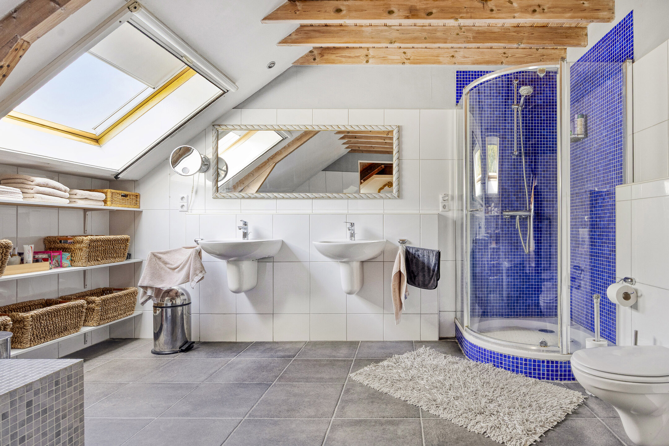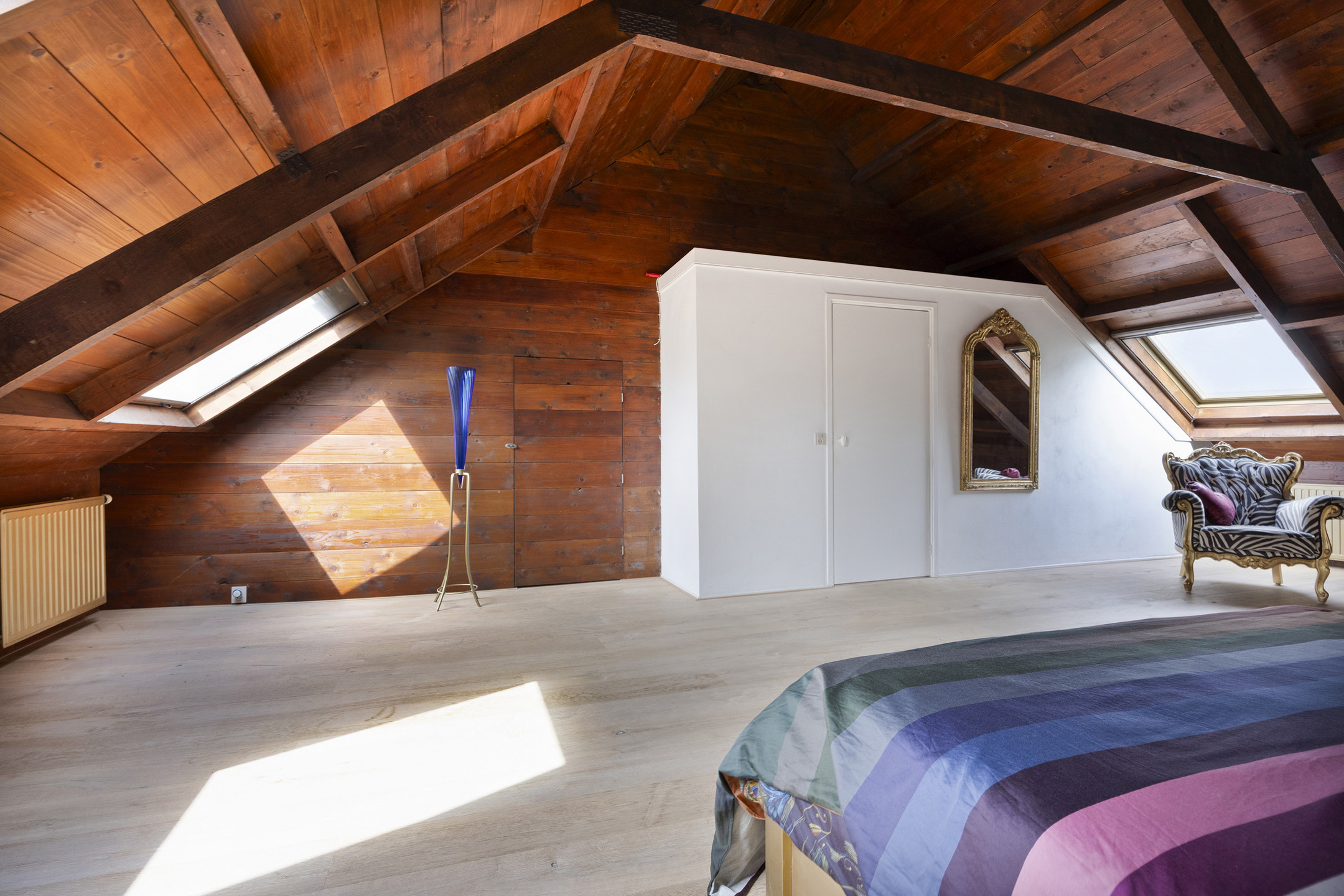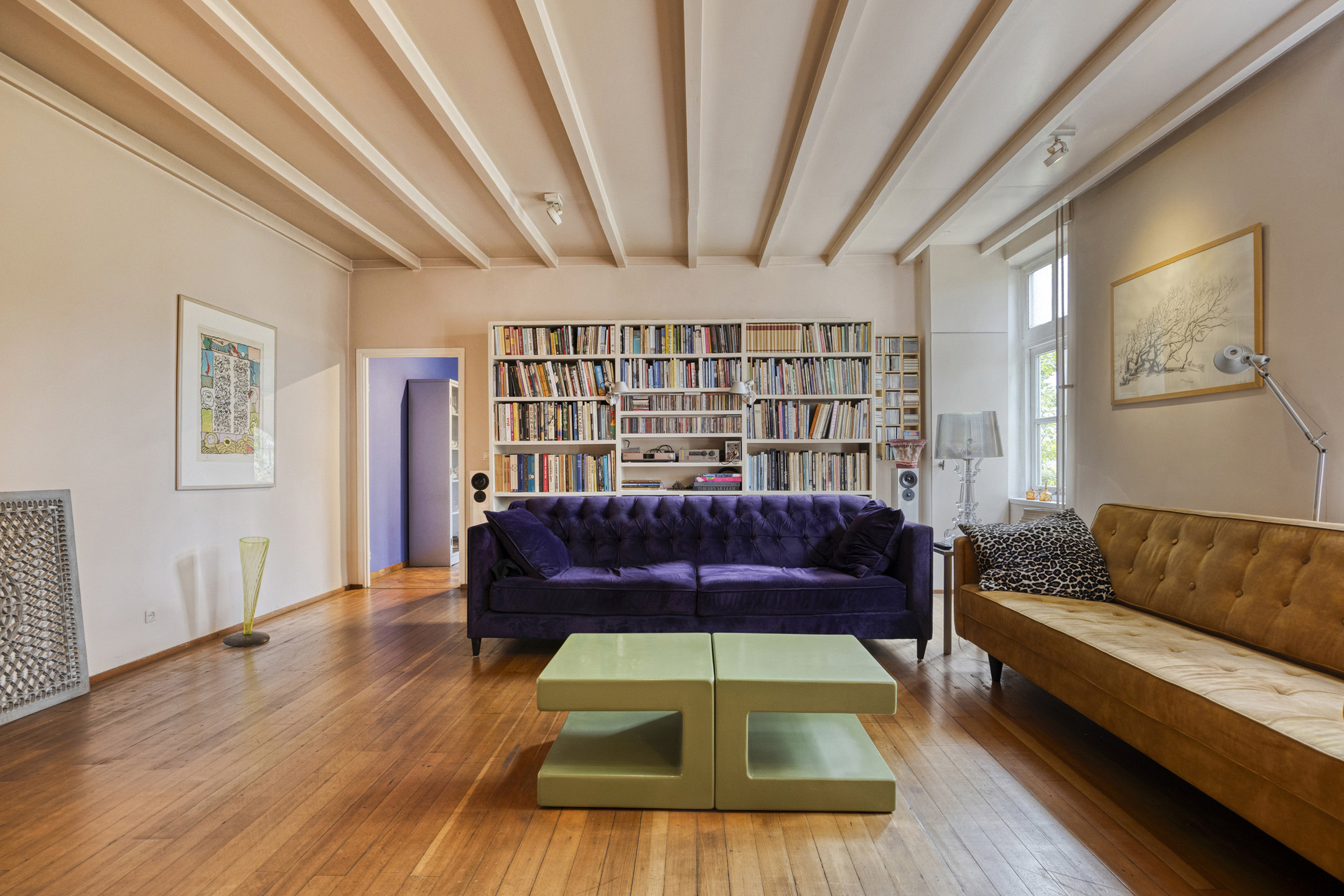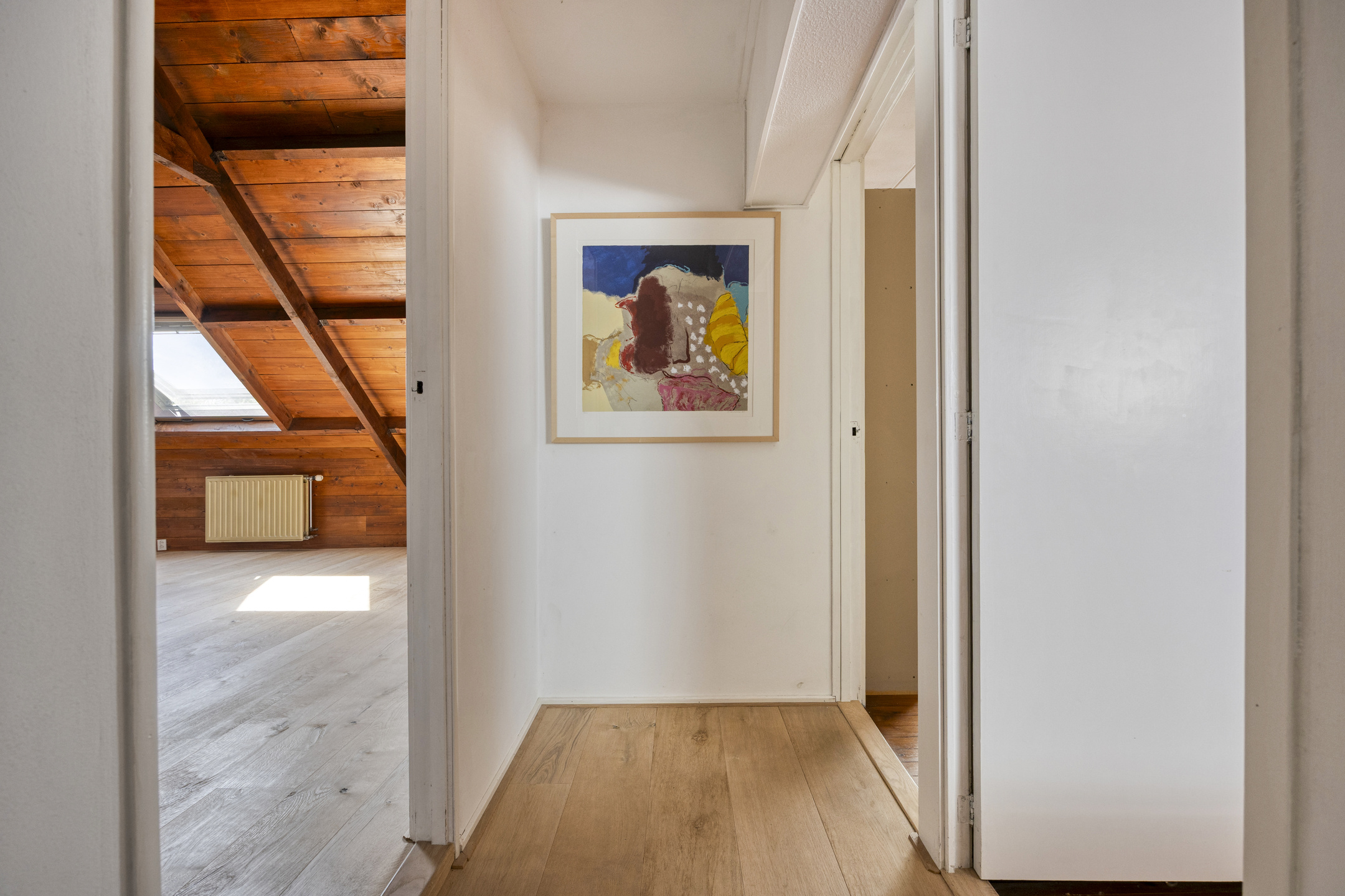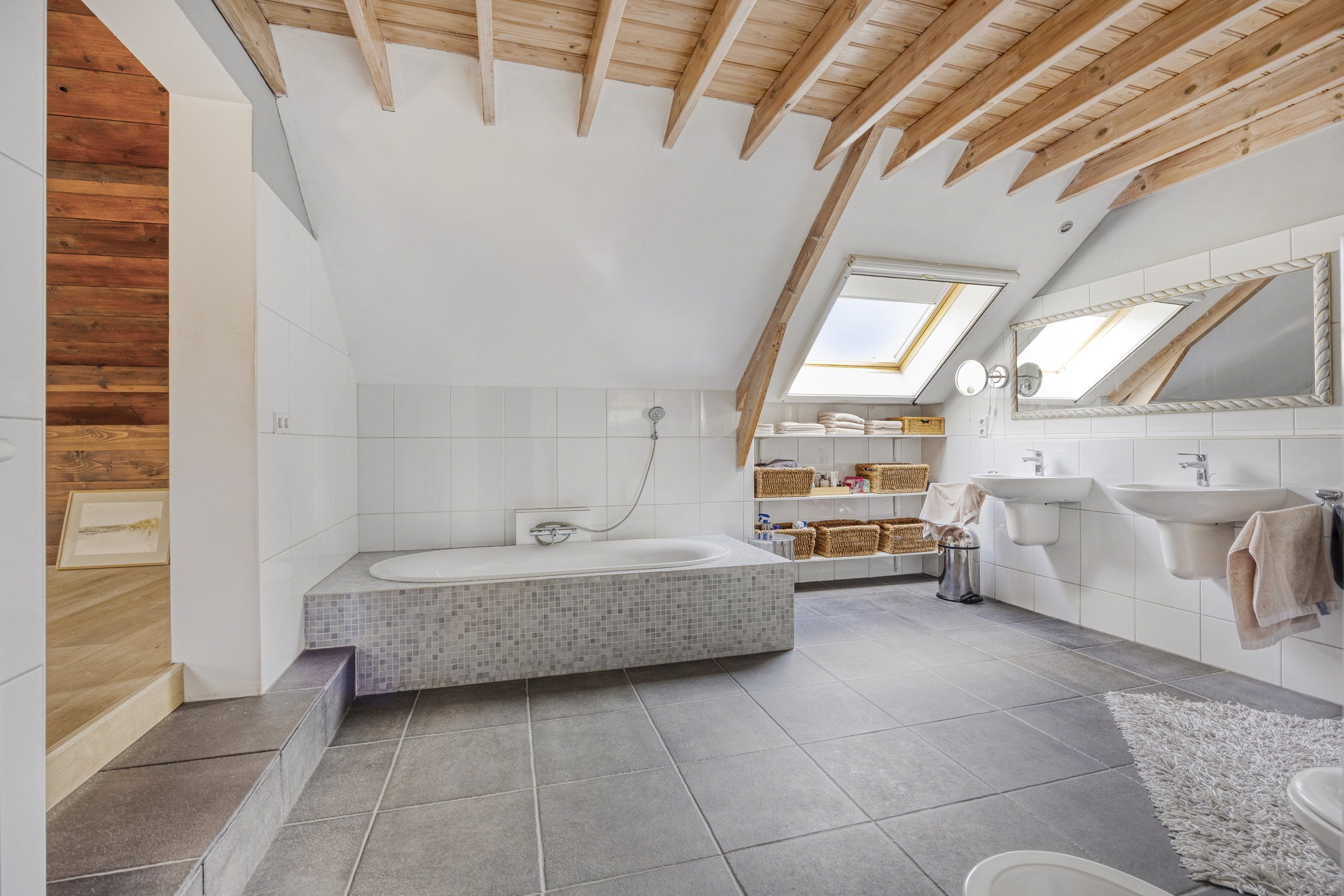 يعكس السكن الرئيسي أجواءً من الانفتاح المدروس. الغرف واسعة المساحة، وتضم ثلاث غرف نوم، وتجمع بين أرضيات باركيه من خشب البلوط، وتشطيبات خشبية متينة، وجسور خشبية مكشوفة، مما يضفي أصالة على تفاصيل الحياة اليومية. تبلغ مساحة الاستوديو الداخلي 87 متر مربع، ويحتفظ بمرونته سواء أردته أتيليهاً فنياً، مساحة معيشة إضافية أو مكتب منزلي. هناك إمكانية واضحة لإضافة غرف نوم أو ترتيب سكن مزدوج، مدعوماً بمساحات متعددة الوظائف وارتباط مباشر بالحدائق المصممة بعناية.