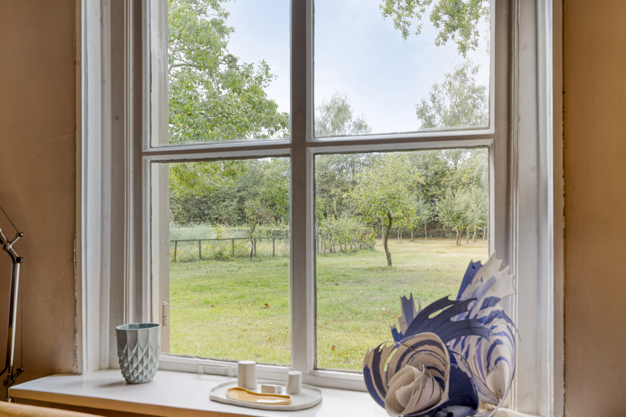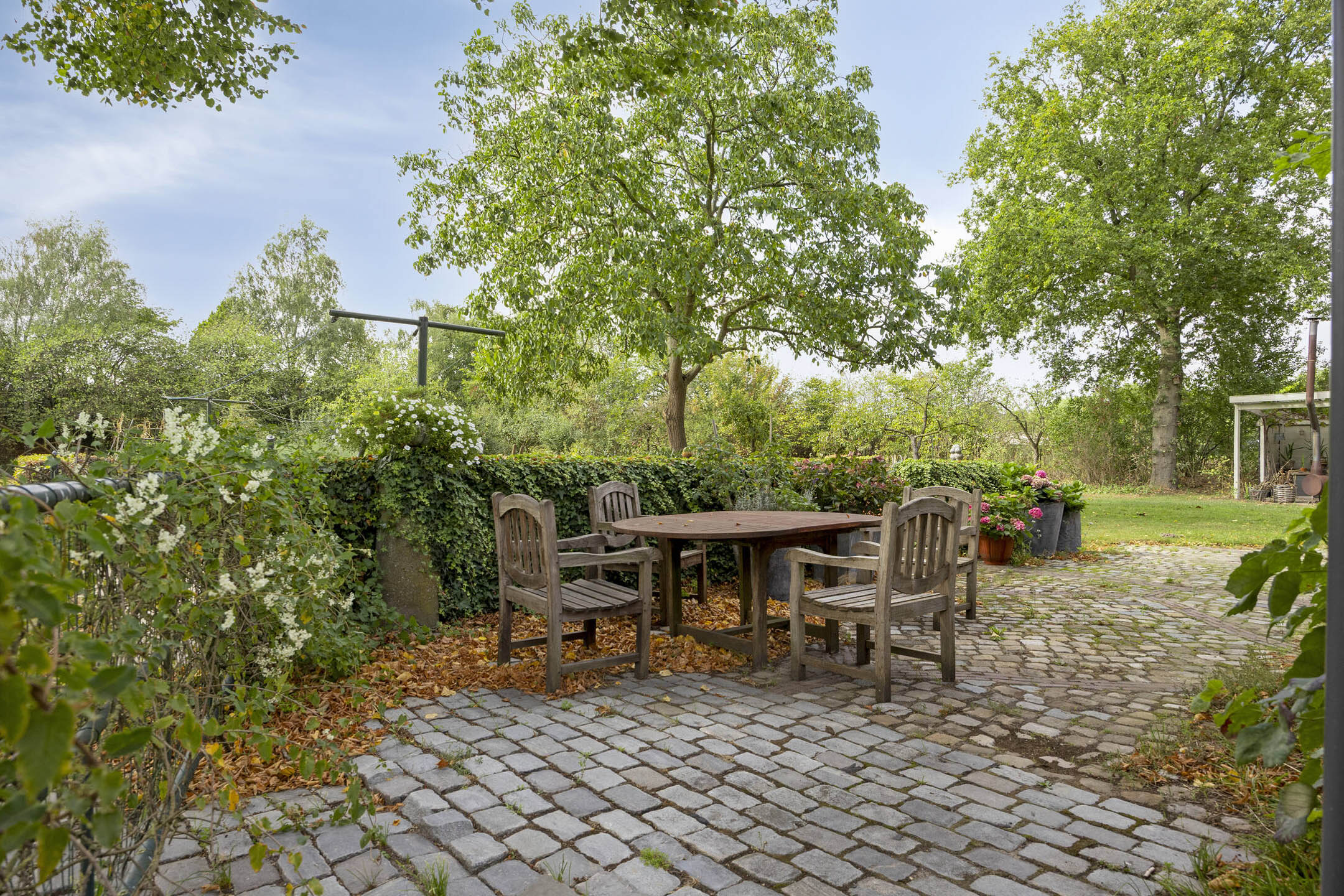 يتميز الفضاء الخارجي ببستان واسع، ومراعي، وحديقة خضروات، وتراس، بينما تحتفظ الحظائر بتفاصيلها الخشبية الأصلية ومرافقها العملية المناسبة لمجالات متنوعة من الأنشطة، من ركوب الخيل إلى ورش العمل. ستة عشر لوحاً شمسياً ومعزول السقف والنوافذ والتدفئة الأرضية تعكس توازناً بين الراحة والاستدامة. يجمع هذا المنزل بين الانفتاح والخصوصية، وهو مثالي للباحثين عن الفخامة والأصالة في وووز بلانتاج.