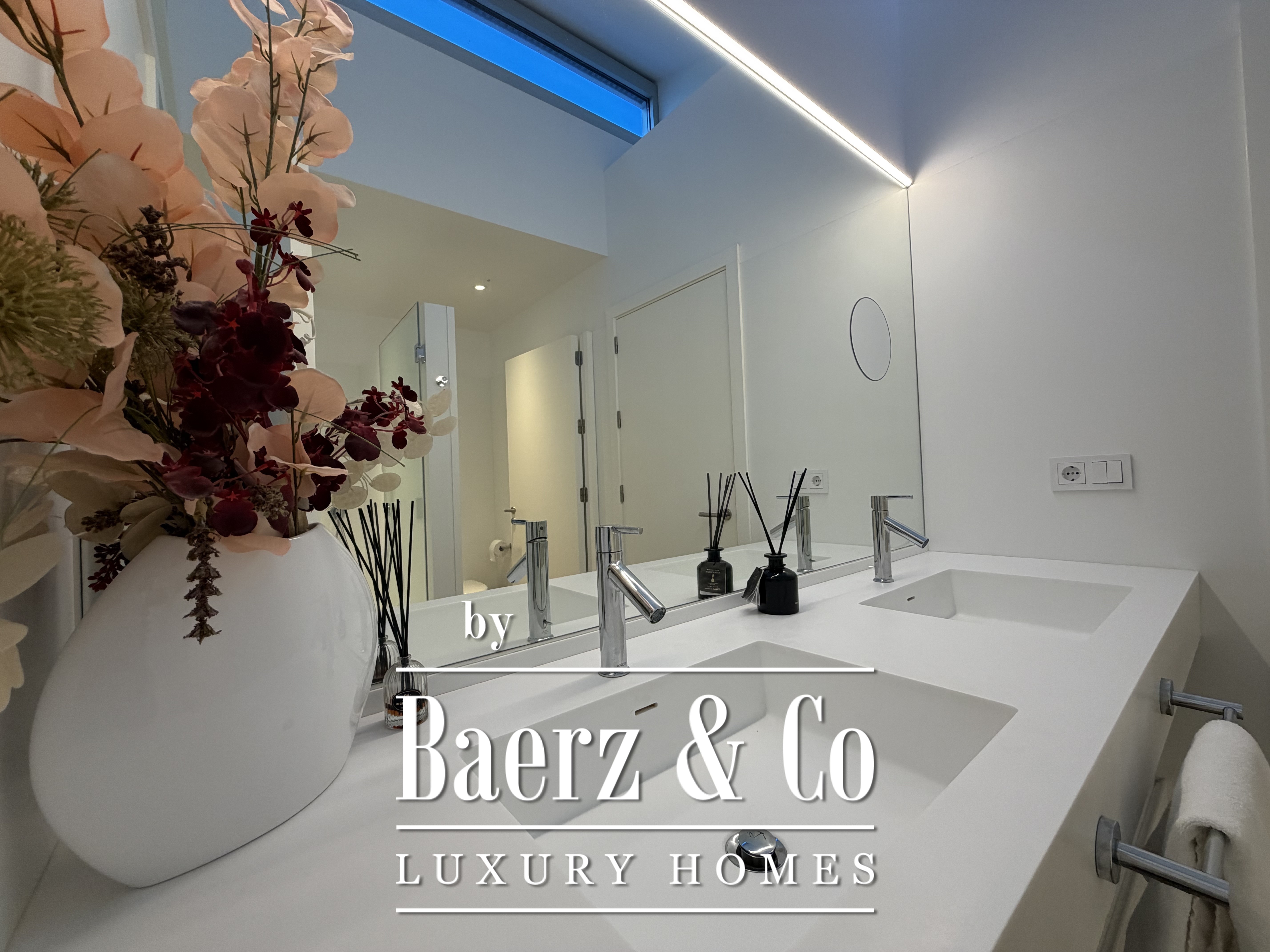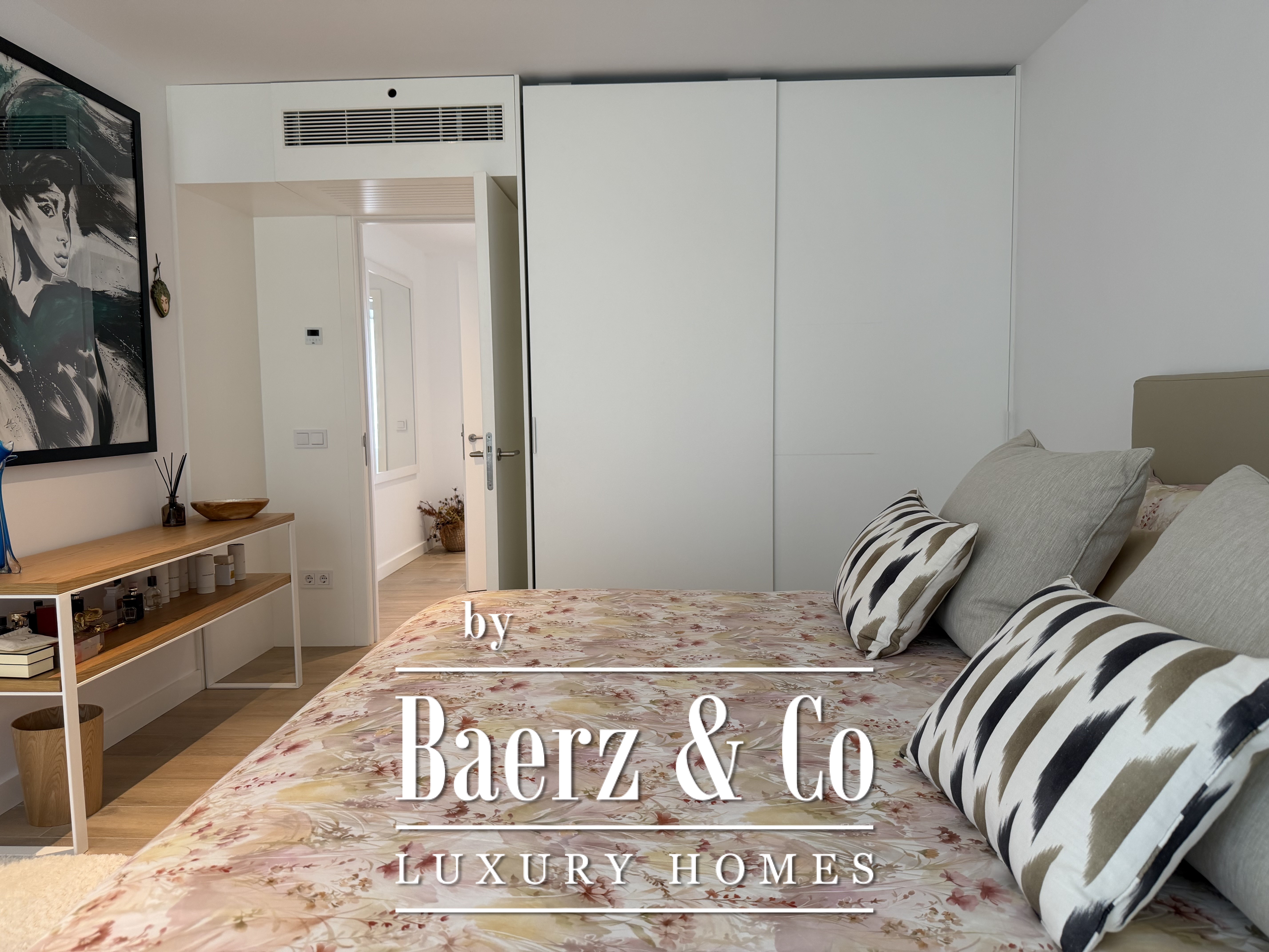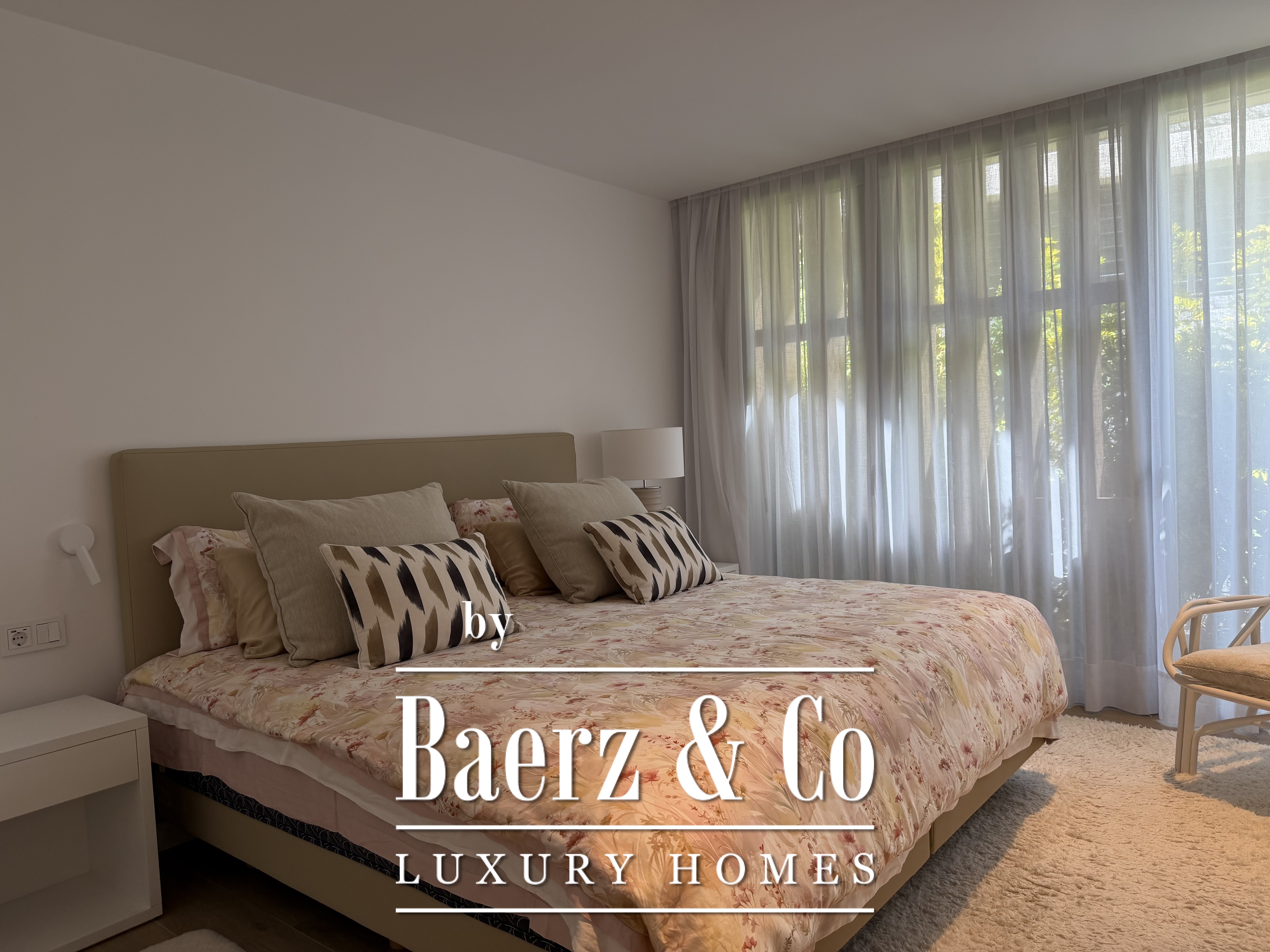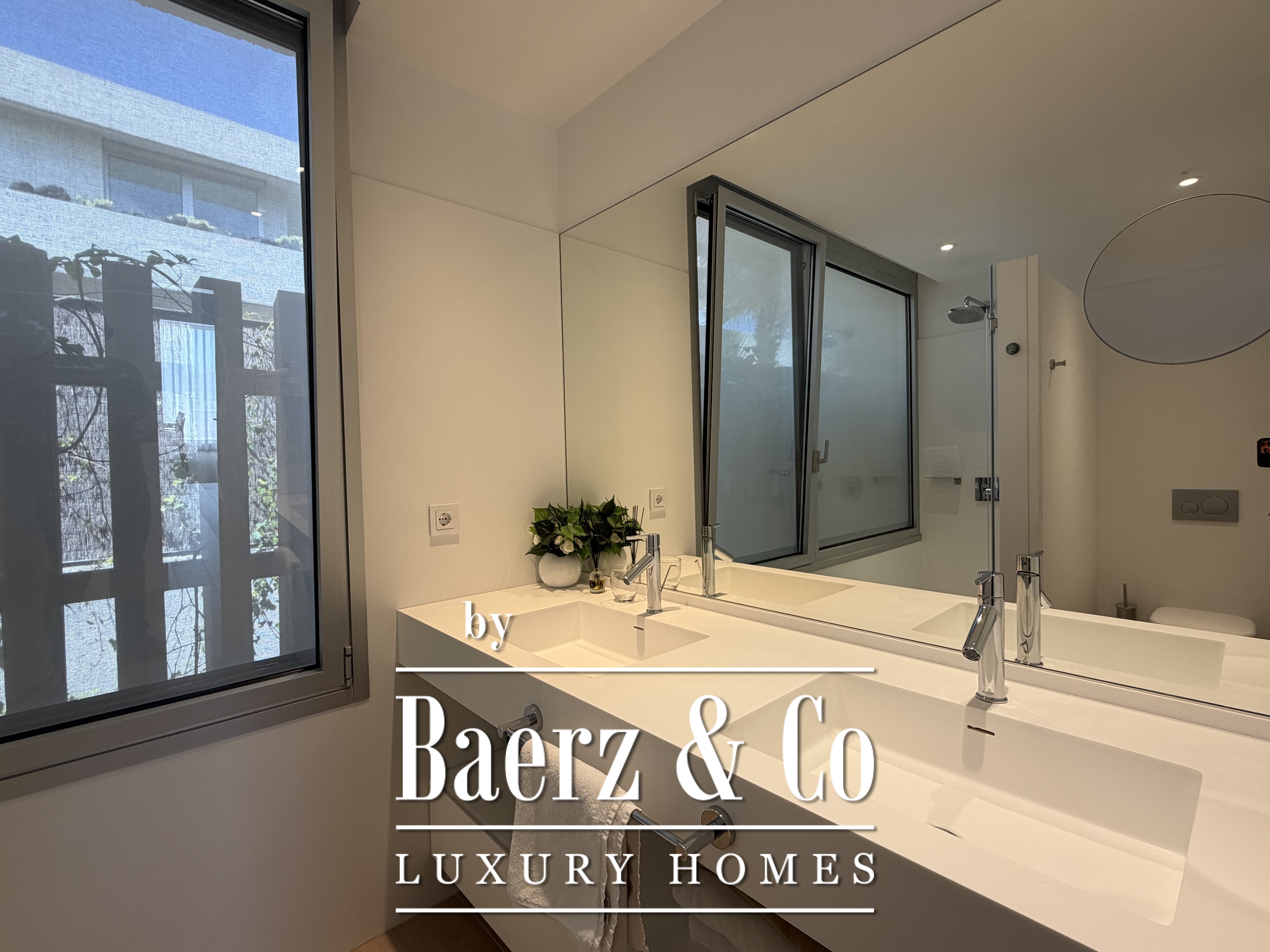Großzügige Fenster durchfluten das Innere mit natürlichem Licht, rahmen den Horizont und schaffen einen nahtlosen Übergang zur Terrasse und dem gepflegten Garten. Drei Schlafzimmer verfügen über Ankleidezimmer, während zwei moderne Bäder mit hochwertigen Duschen die Fokussierung auf elegante Funktionalität betonen. Der helle Wohnbereich lädt ein zum Entspannen, ob in stiller Zweisamkeit oder beim Empfangen von Gästen.