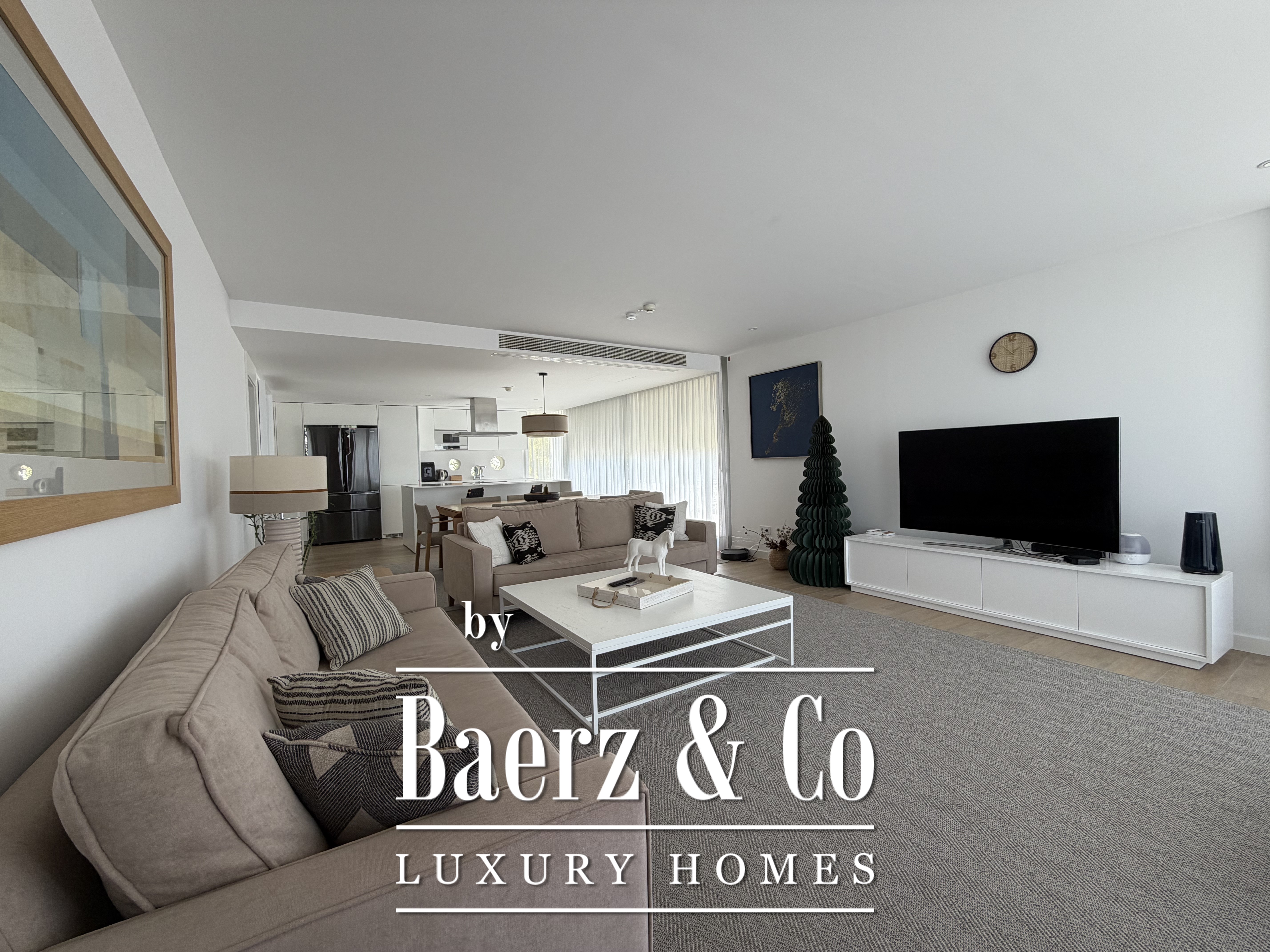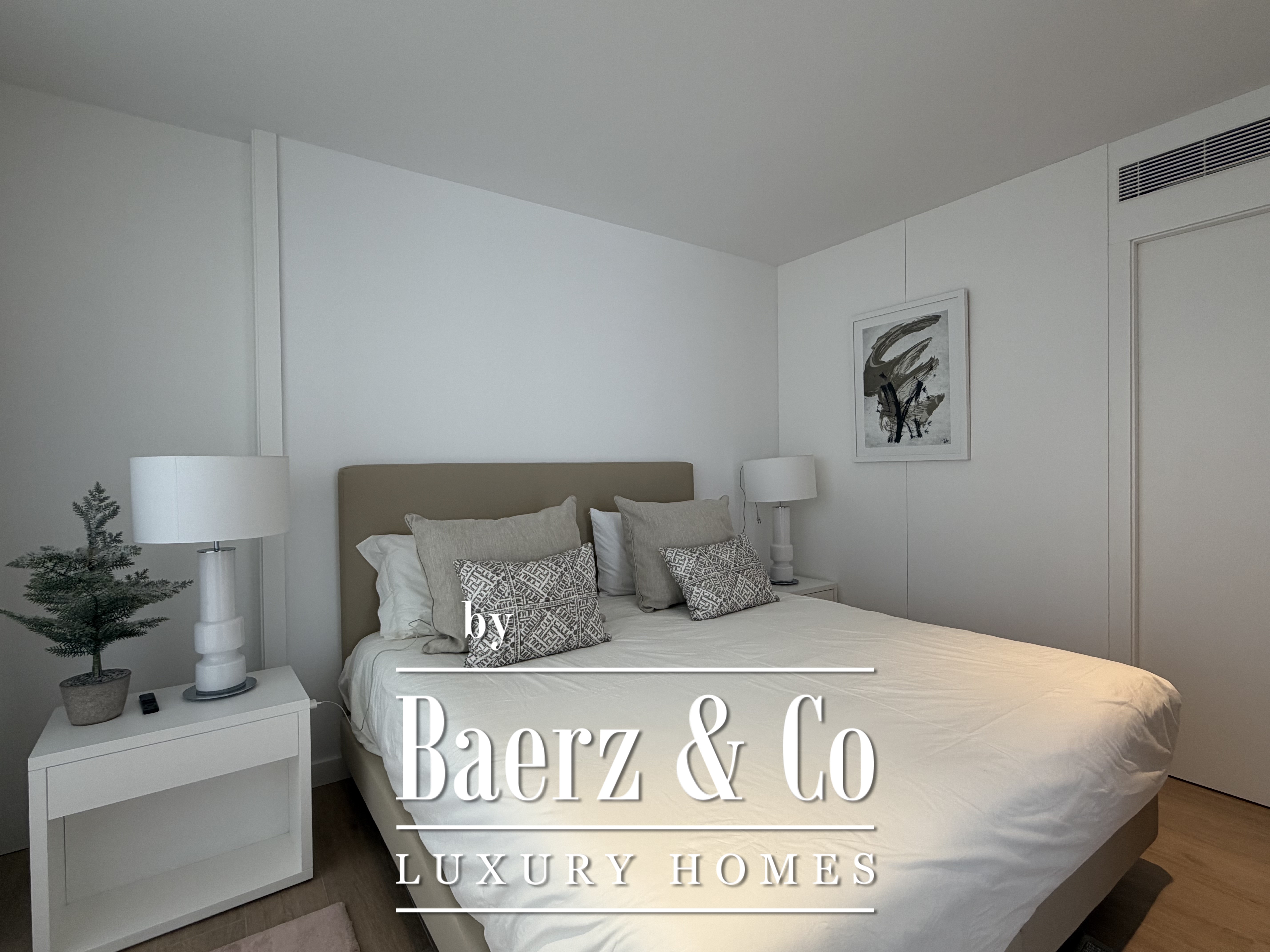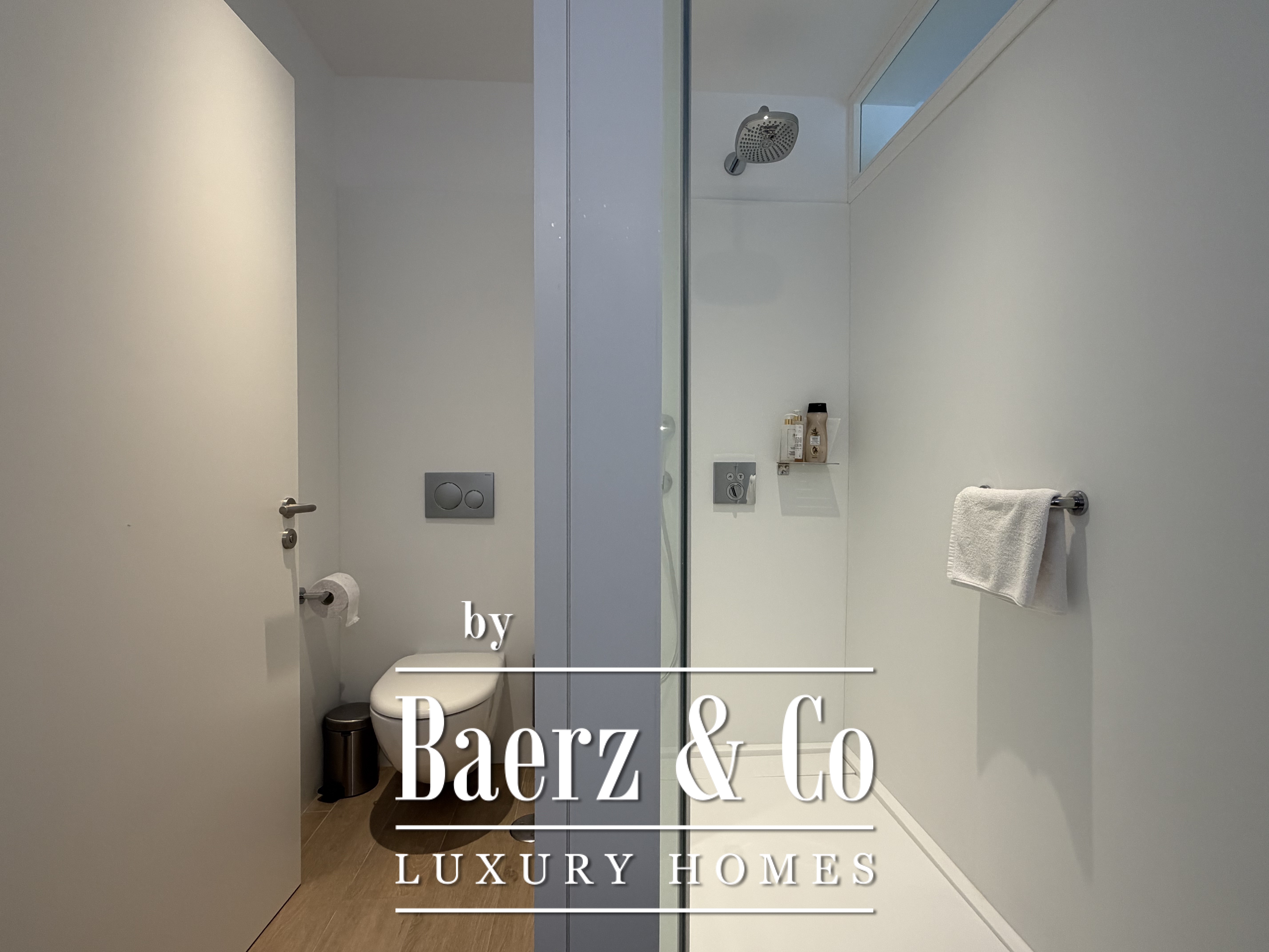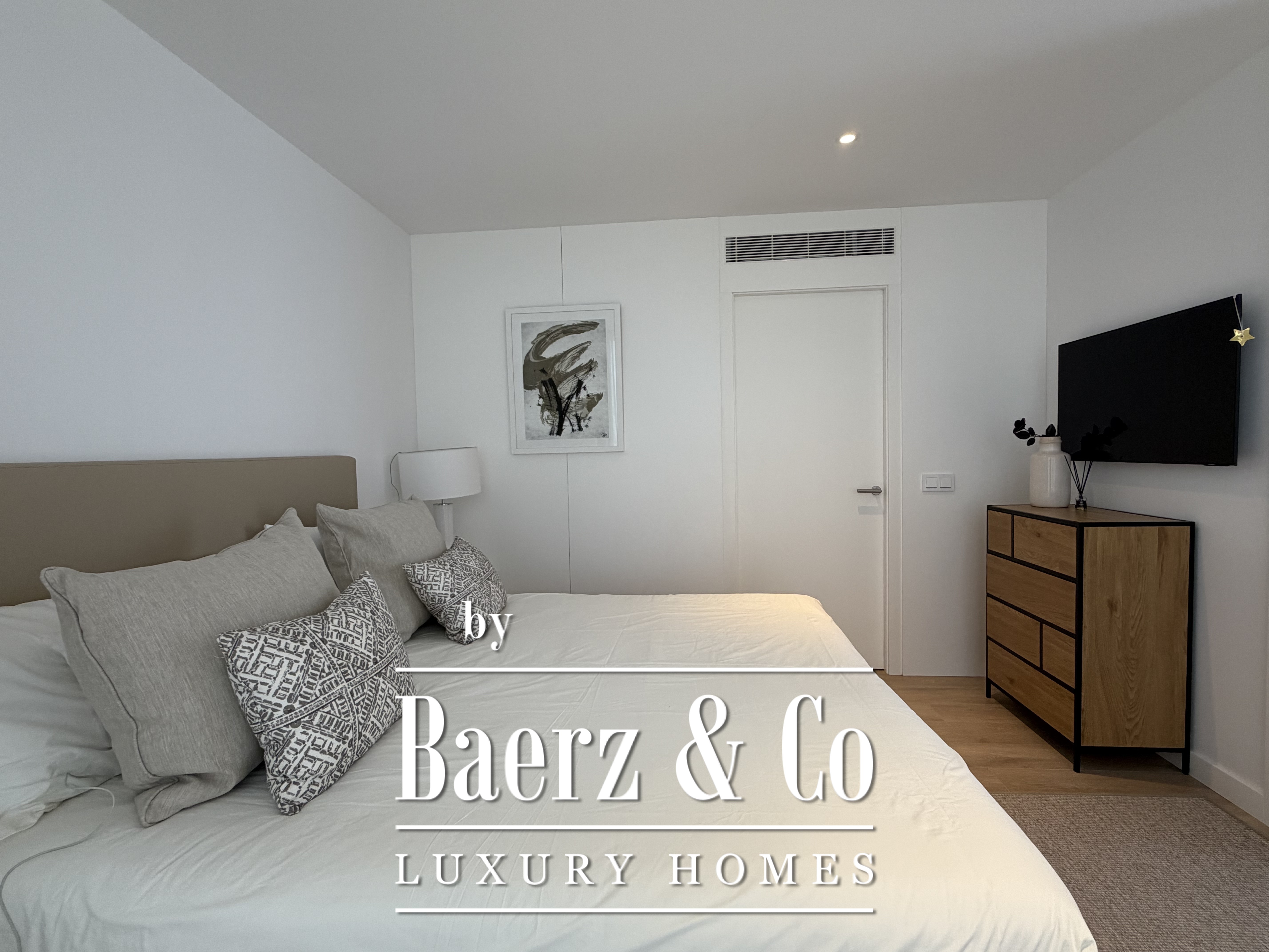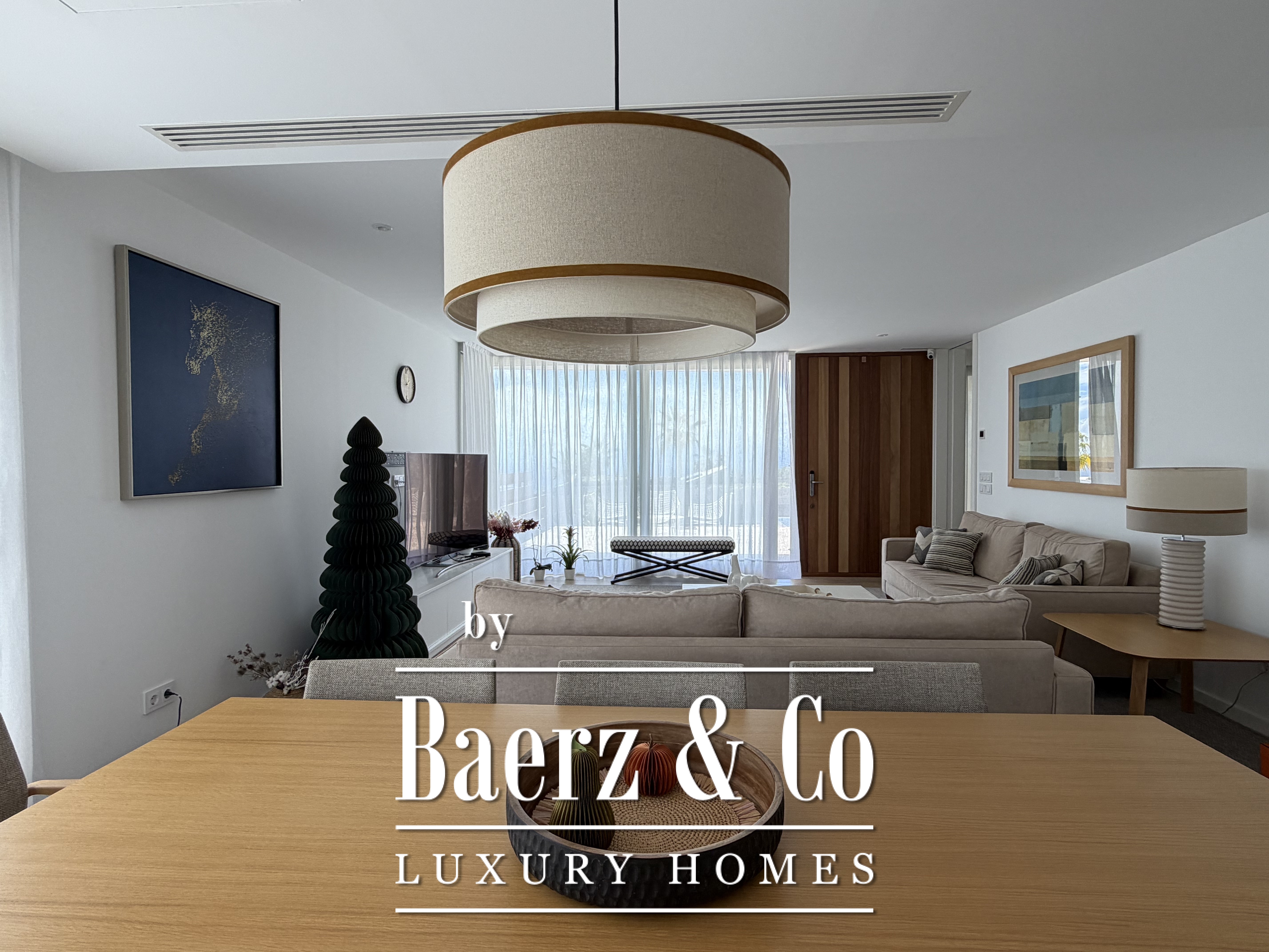 Großzügige Fenster durchfluten das Innere mit natürlichem Licht, rahmen den Horizont und schaffen einen nahtlosen Übergang zur Terrasse und dem gepflegten Garten. Drei Schlafzimmer verfügen über Ankleidezimmer, während zwei moderne Bäder mit hochwertigen Duschen die Fokussierung auf elegante Funktionalität betonen. Der helle Wohnbereich lädt ein zum Entspannen, ob in stiller Zweisamkeit oder beim Empfangen von Gästen.