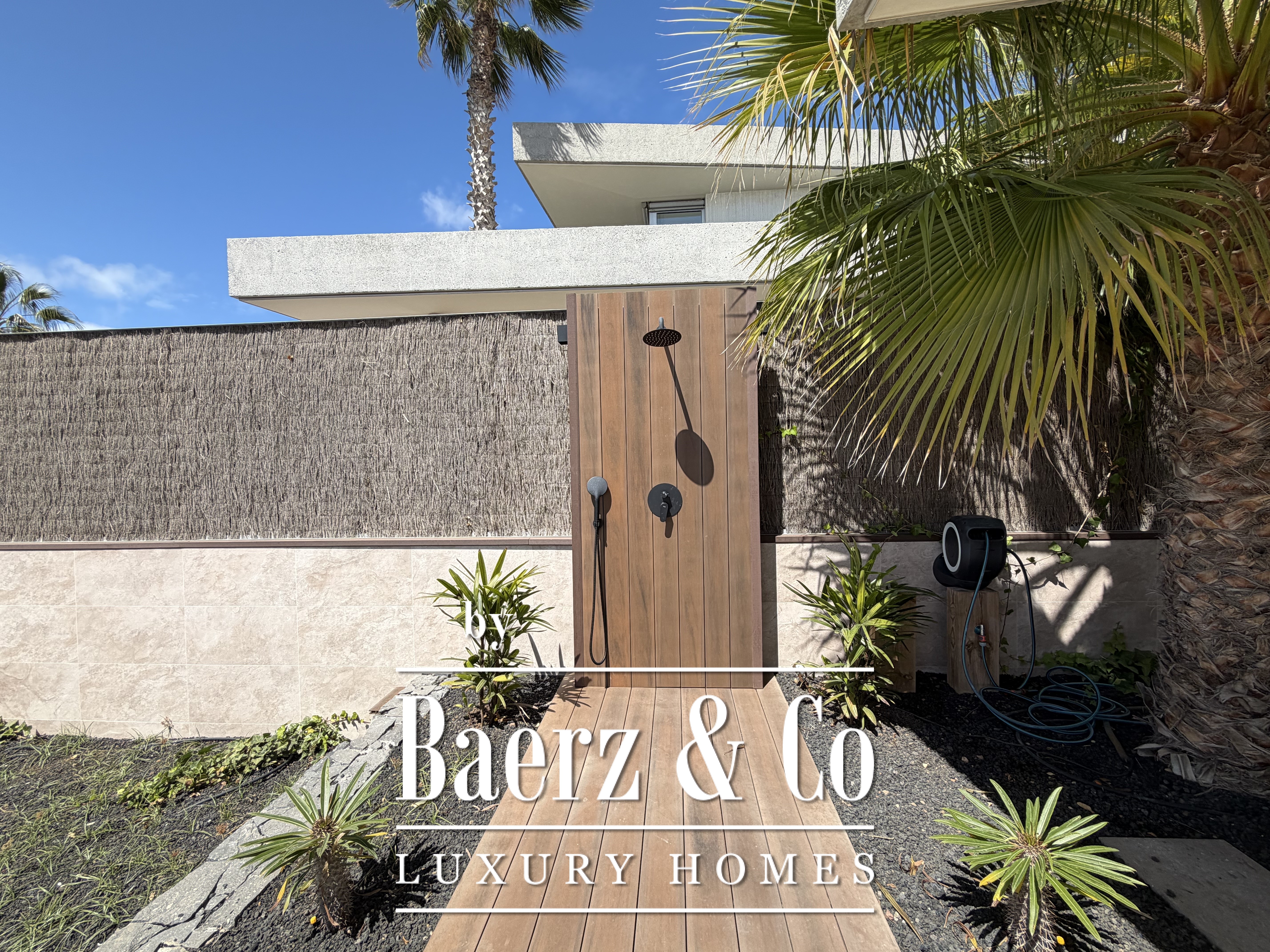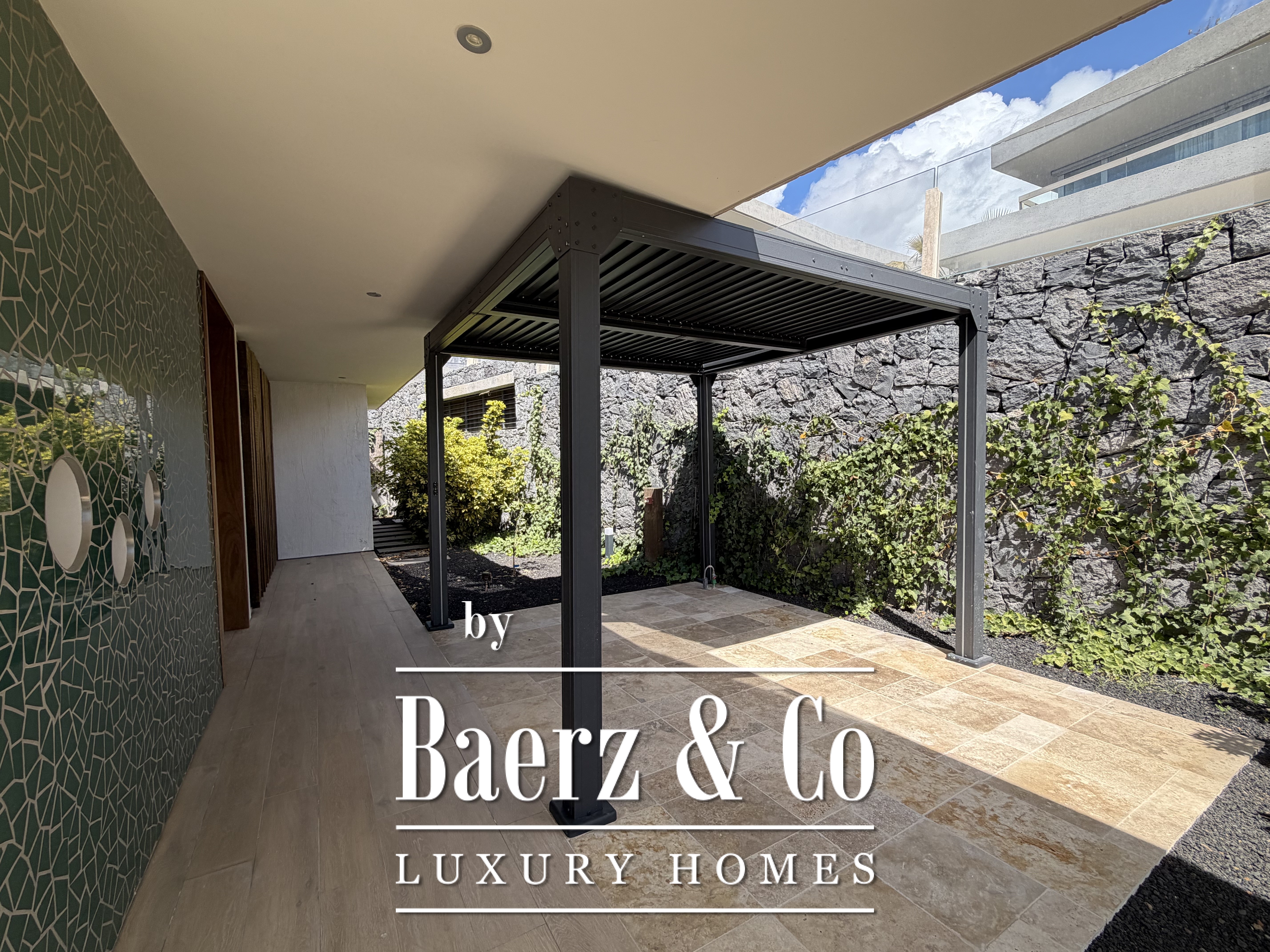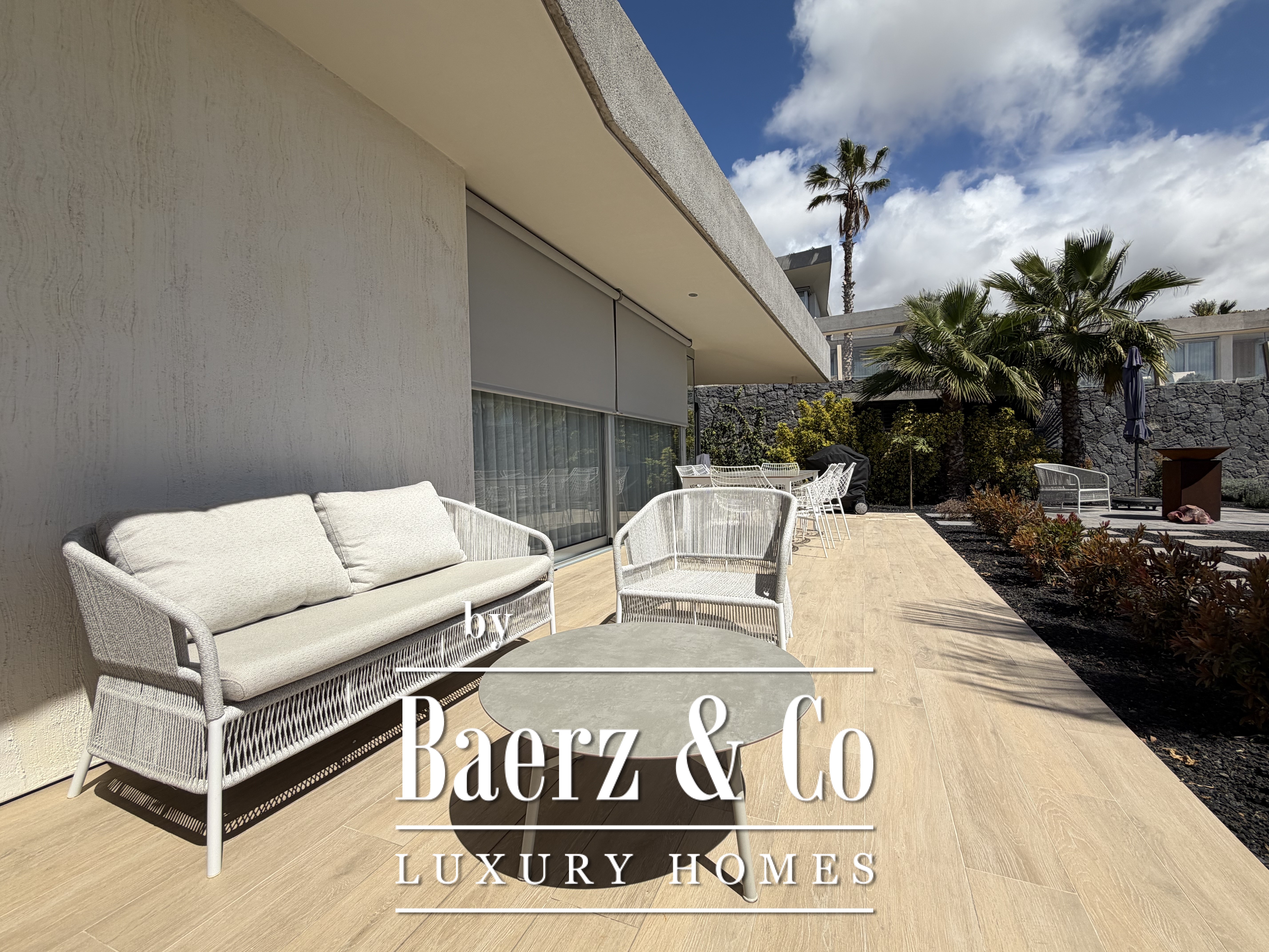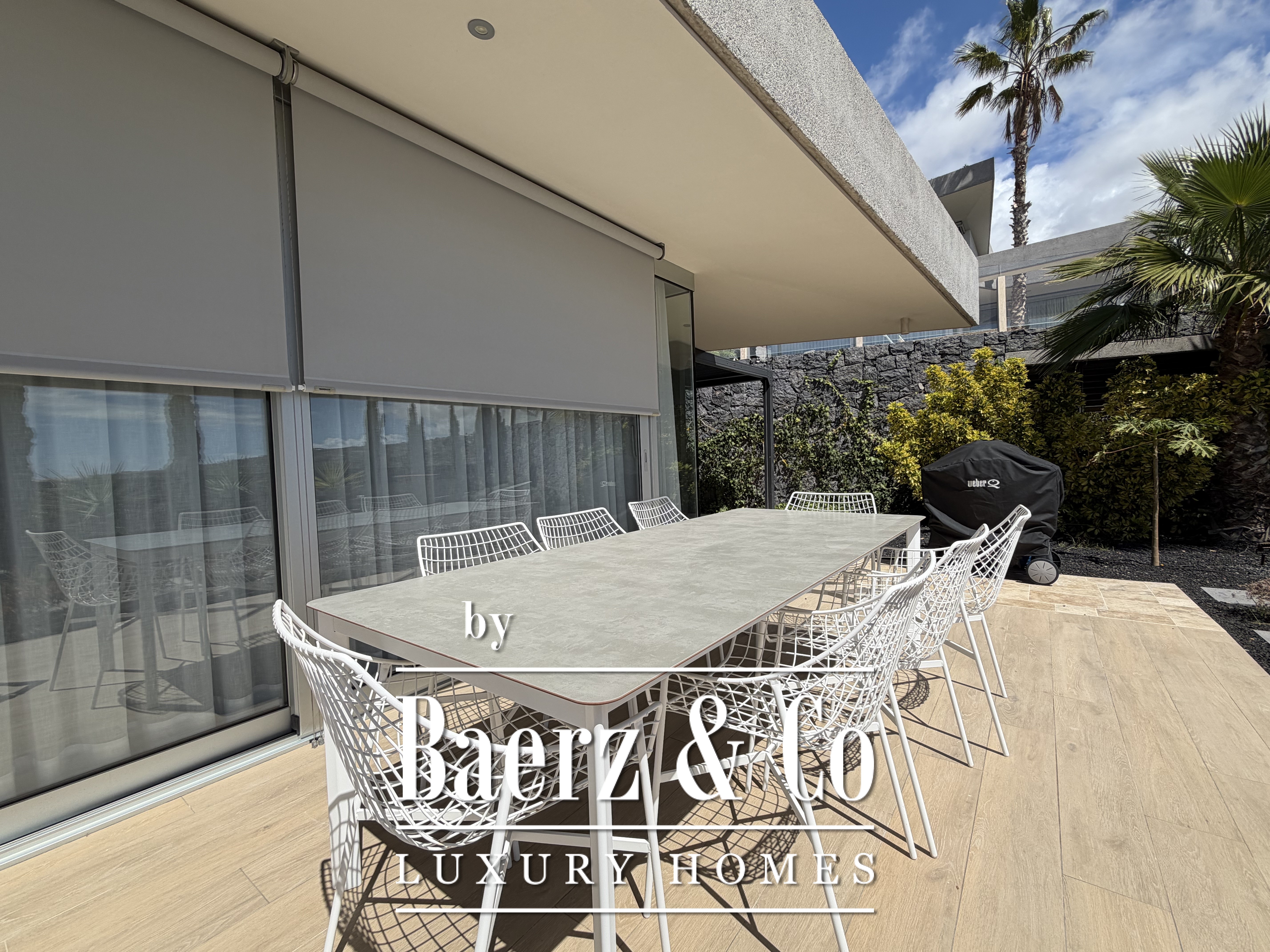 Im Außenbereich bildet ein privater, beheizter Infinity-Pool den Mittelpunkt. Ergänzt wird dieser durch Plätze zum Speisen im Freien und ruhige Rückzugsorte. Zur Villa gehört eine Garage für Auto und Golfcart. Sie wird vollständig möbliert mit luxuriösen Ausstattungsdetails, einschließlich stilvoller Außenmöbel, angeboten. Automatische Jalousien ermöglichen eine subtile Lichtregulierung und bewahren dabei die Verbindung zur Natur.