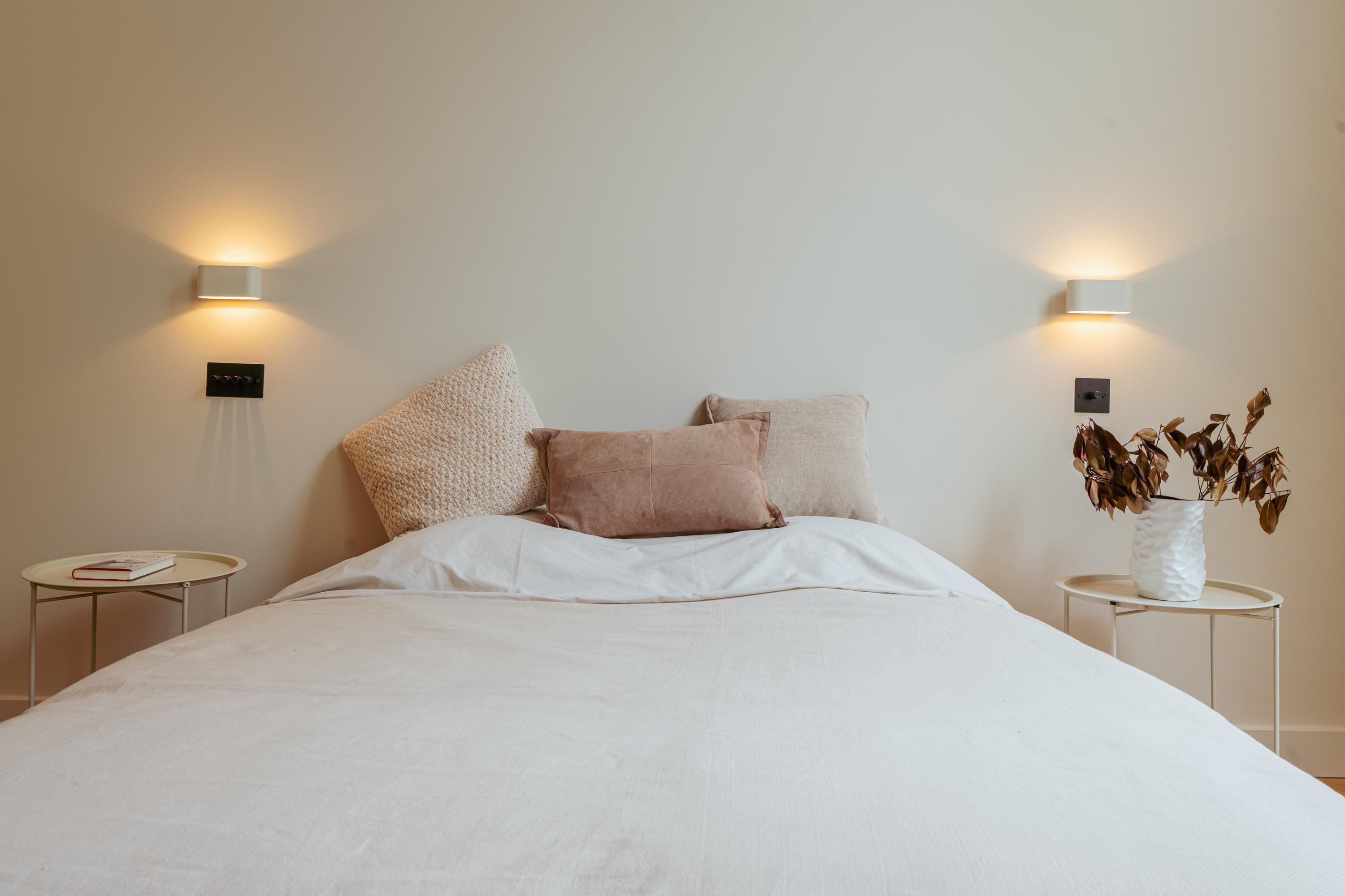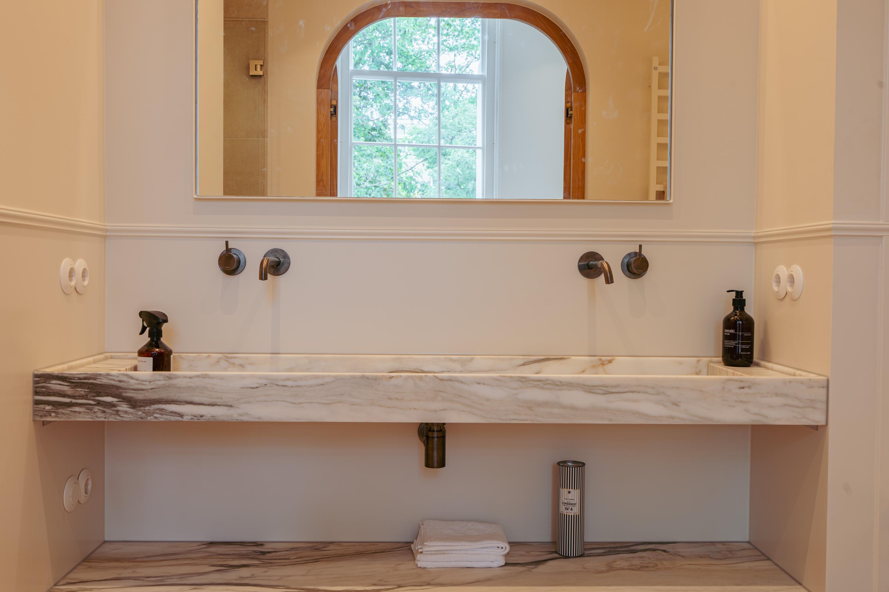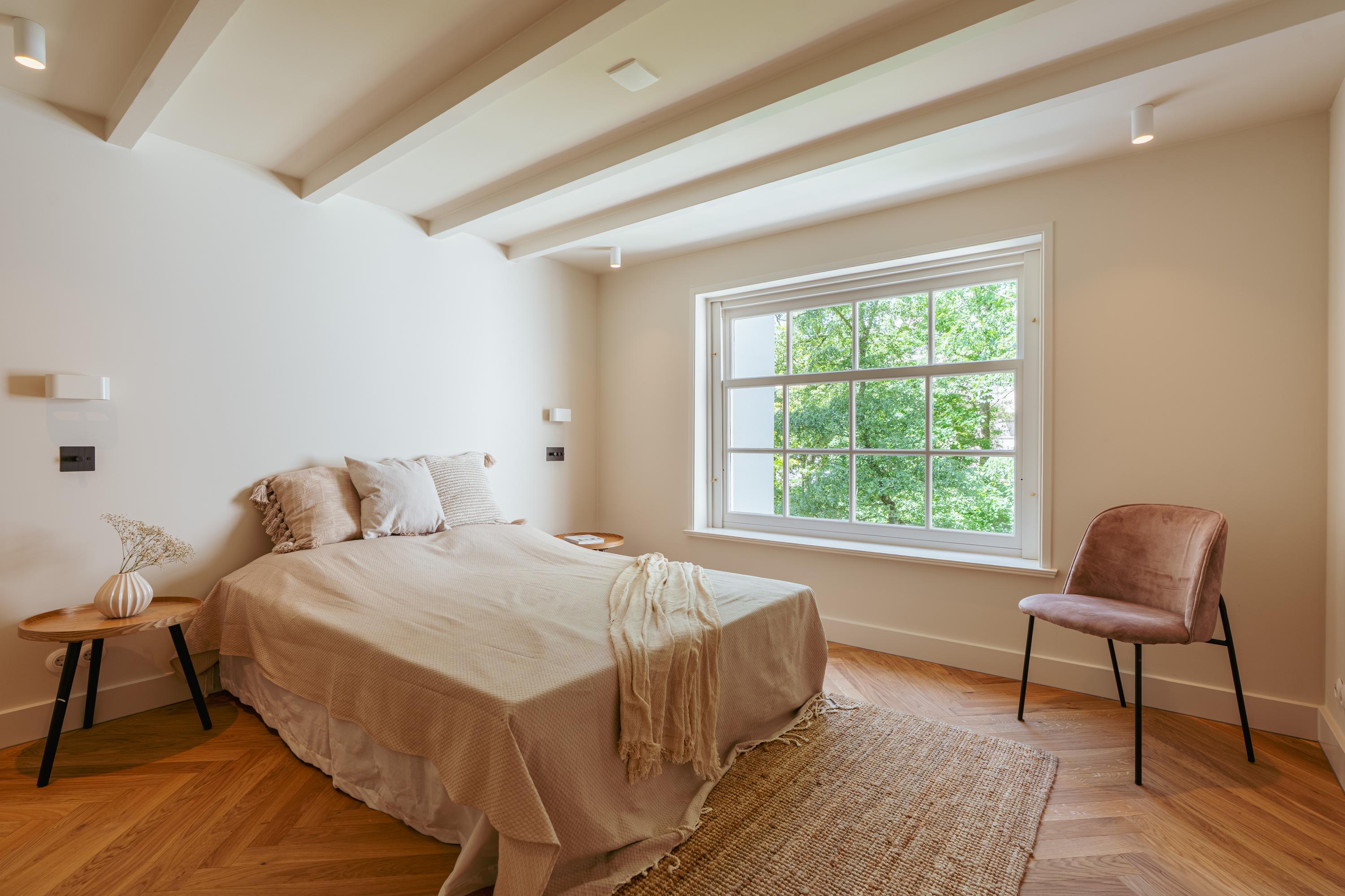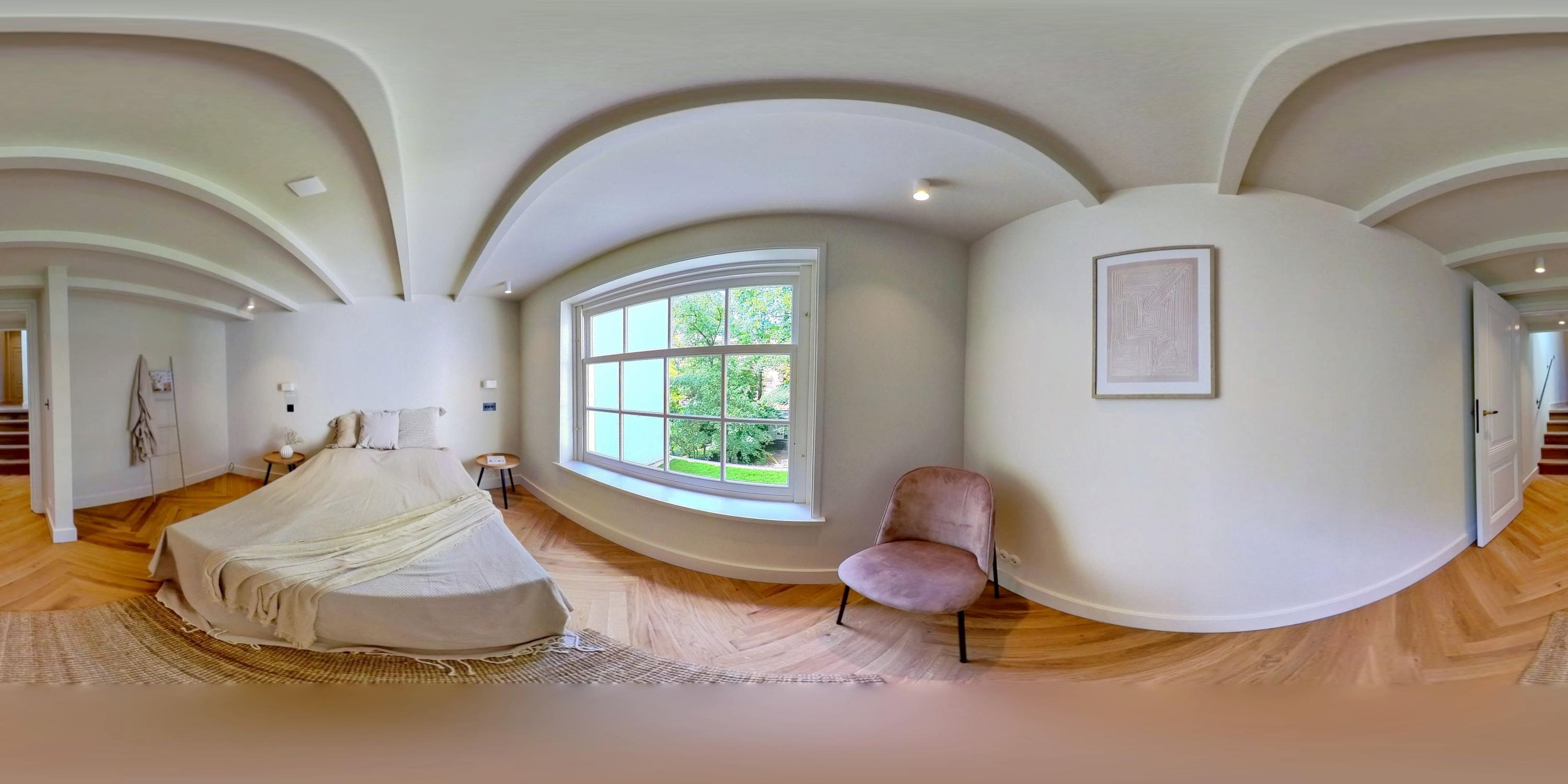 Das Hauptschlafzimmer verfügt über maßgefertigte Einbauten und ein en-suite Bad mit Marmorakzenten, das durch charakteristische Holzgewölbe und französische Türen mit Zugang zur Regendusche hervorgehoben wird. Ein zweites, großzügiges Schlafzimmer blickt auf ruhige Gärten und wird von einem eigenen Badezimmer ergänzt. Mechanische Belüftung, doppelt verglaste Fenster in bestimmten Bereichen und die Energieeffizienzklasse B gewährleisten ein diskretes und effizientes Wohnklima.