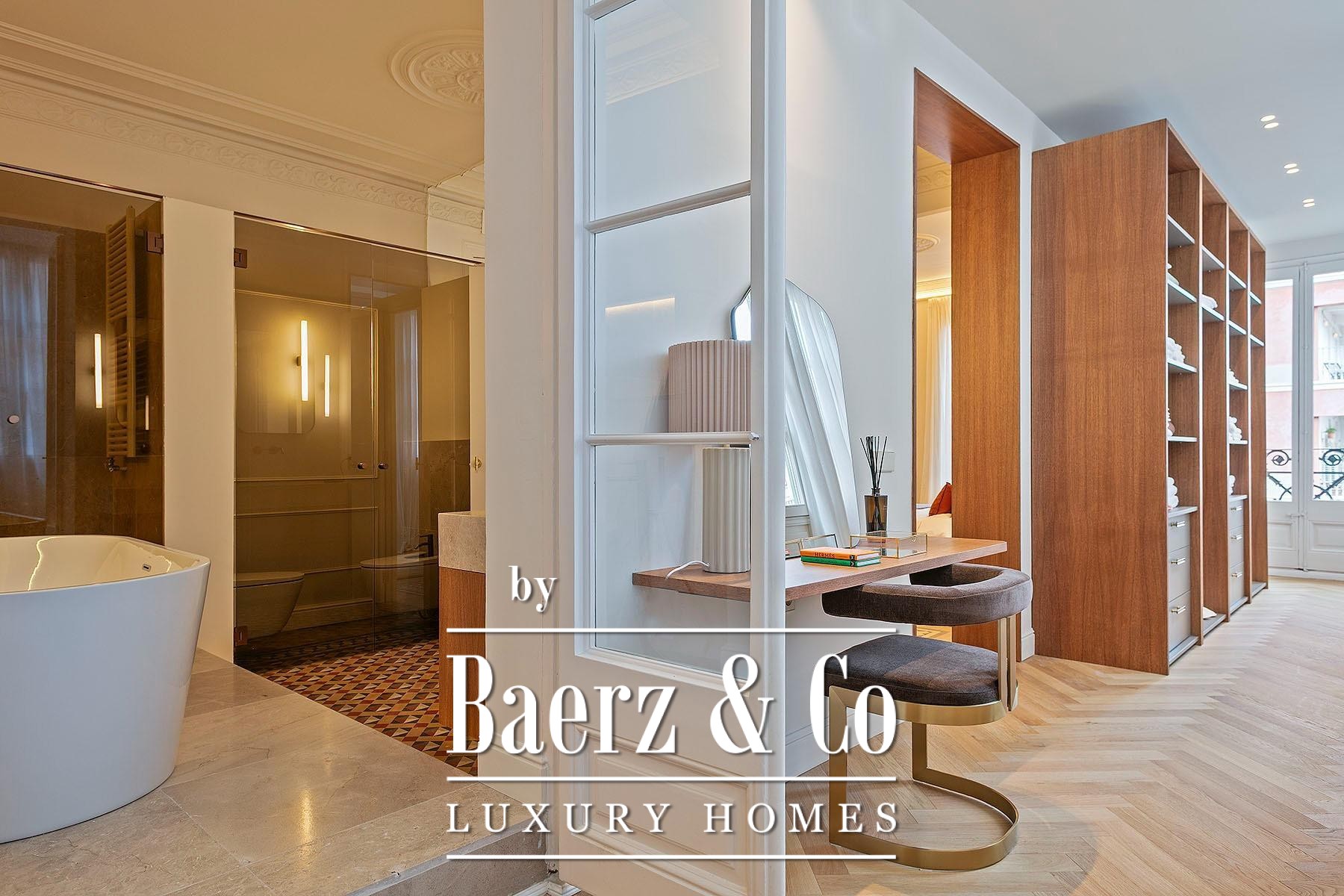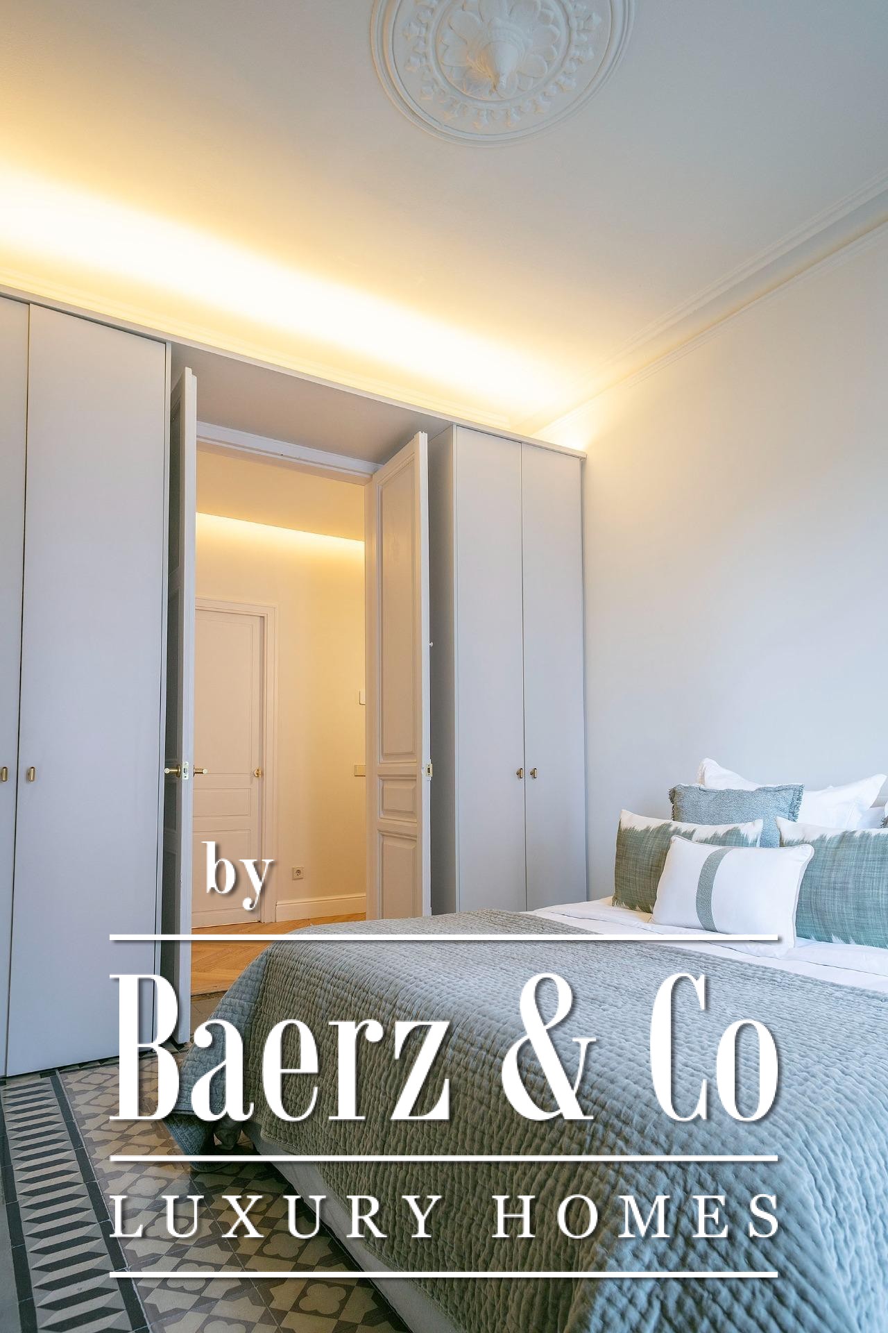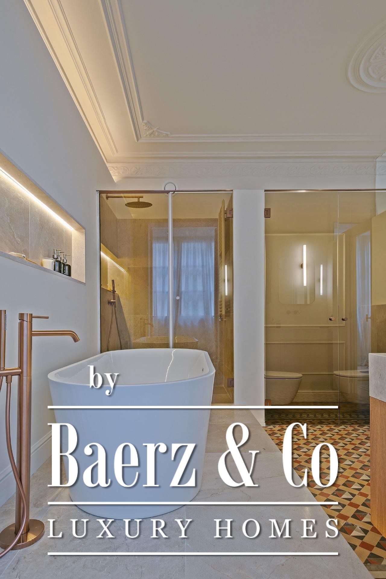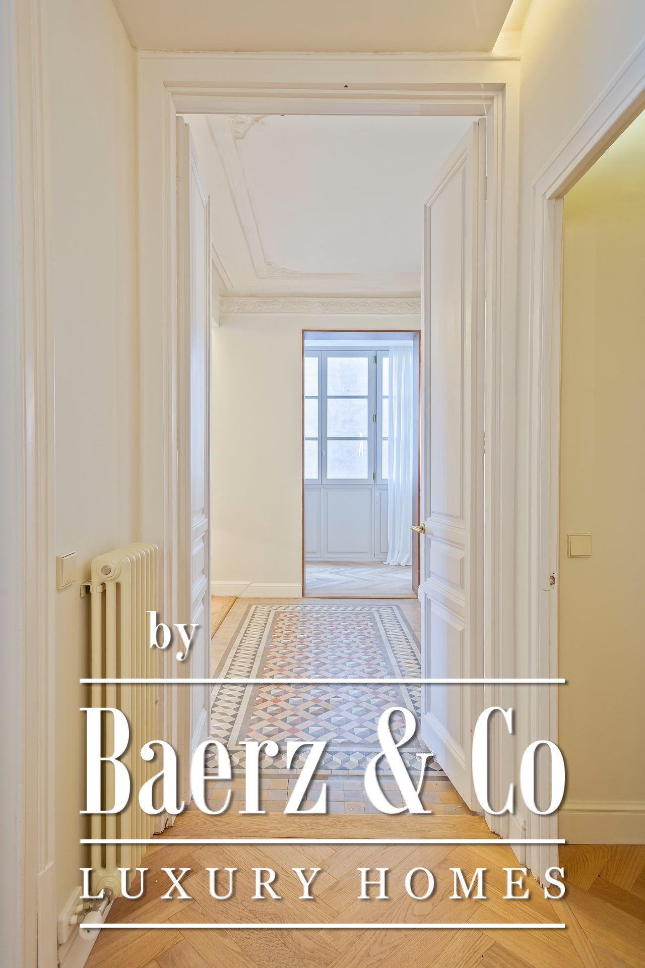 Ein vielseitig nutzbares, separates Arbeitszimmer bietet Raum für Beruf oder Rückzug, ergänzt durch zwei weitere voll ausgestattete Bäder sowie ein Gäste-WC. Aufgearbeitete originale Hydraulikfliesenböden und Decken treffen auf Fischgrätparkett aus Eiche und maßgefertigte Holzvertäfelungen, verbinden somit authentischen Charme mit moderner Eleganz. Balkon, Aufzug, Einbauschränke, integrierte Waschküche und hochwertige Heizung runden dieses dauerhaft attraktive Anwesen ab.