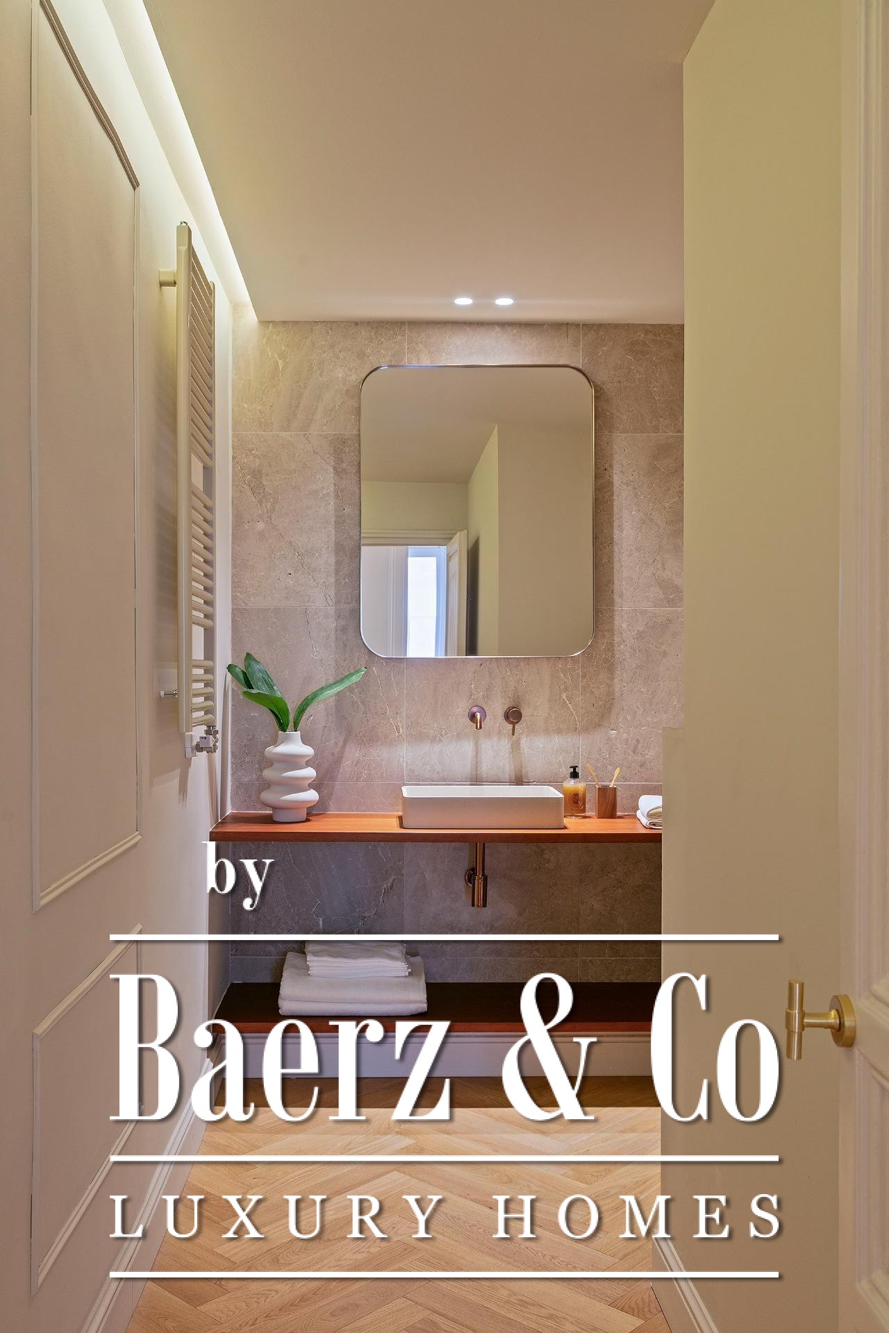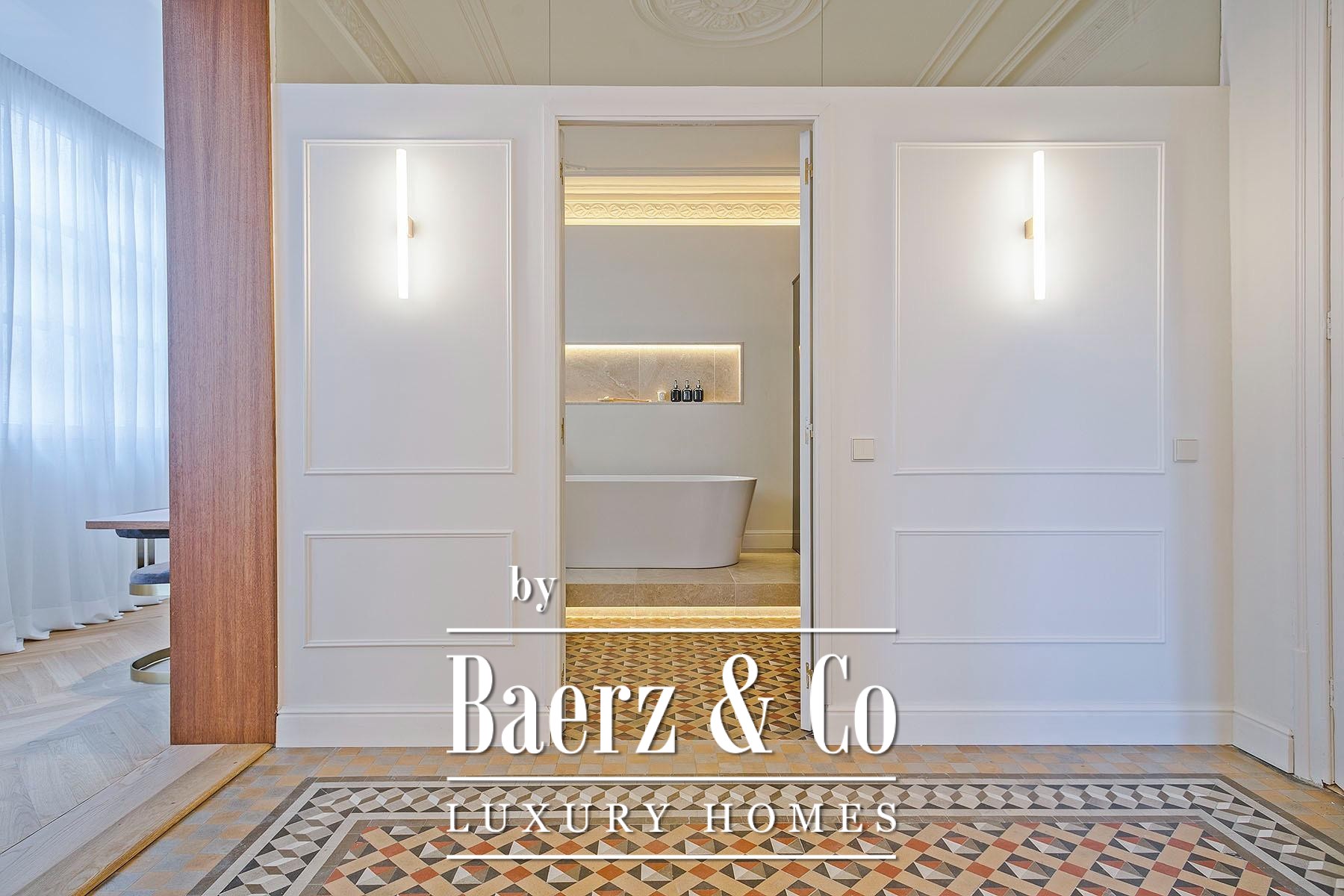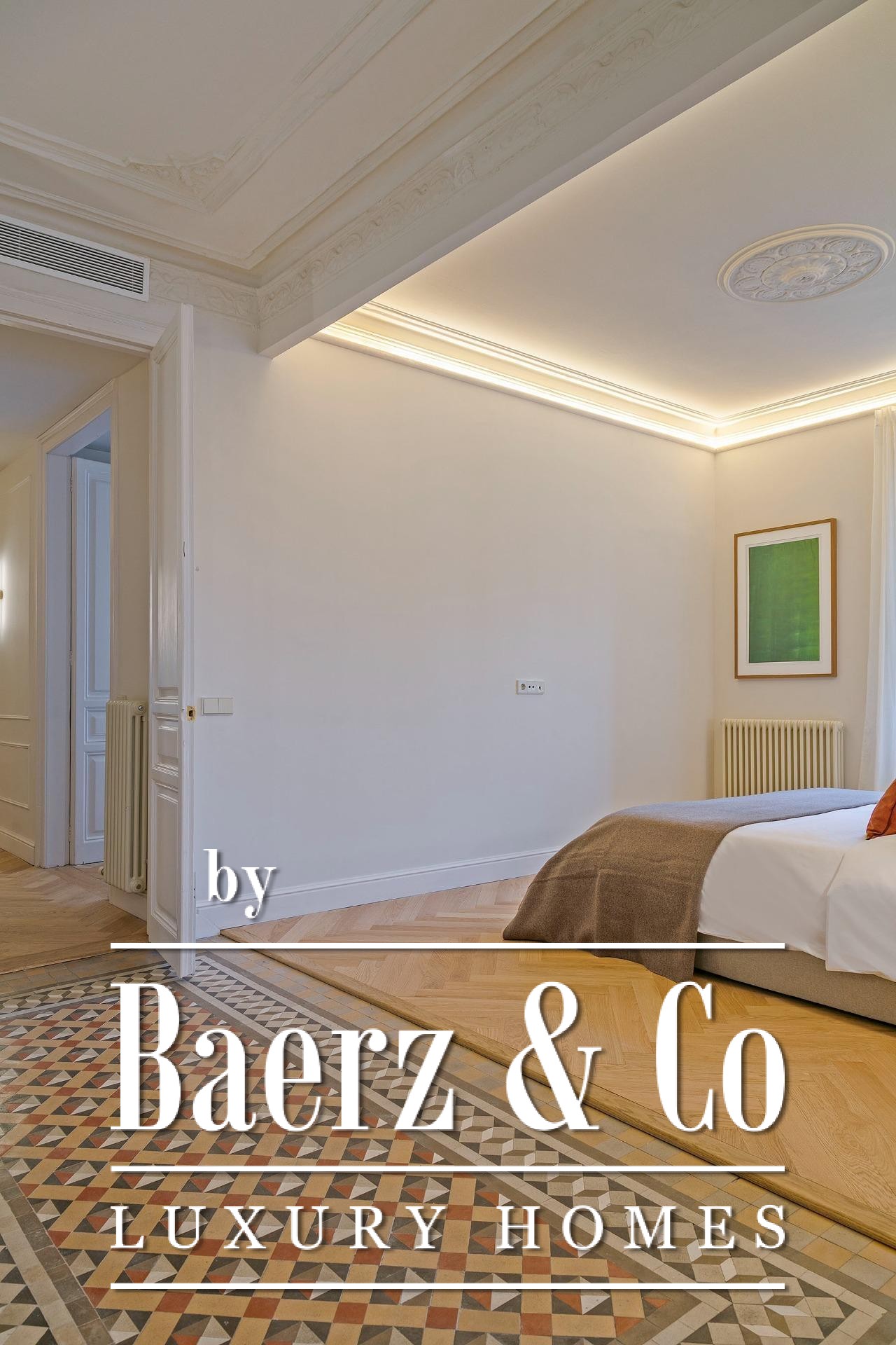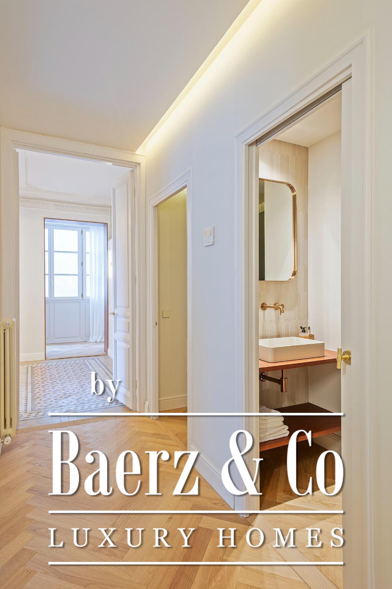 Ein vielseitig nutzbares, separates Arbeitszimmer bietet Raum für Beruf oder Rückzug, ergänzt durch zwei weitere voll ausgestattete Bäder sowie ein Gäste-WC. Aufgearbeitete originale Hydraulikfliesenböden und Decken treffen auf Fischgrätparkett aus Eiche und maßgefertigte Holzvertäfelungen, verbinden somit authentischen Charme mit moderner Eleganz. Balkon, Aufzug, Einbauschränke, integrierte Waschküche und hochwertige Heizung runden dieses dauerhaft attraktive Anwesen ab.