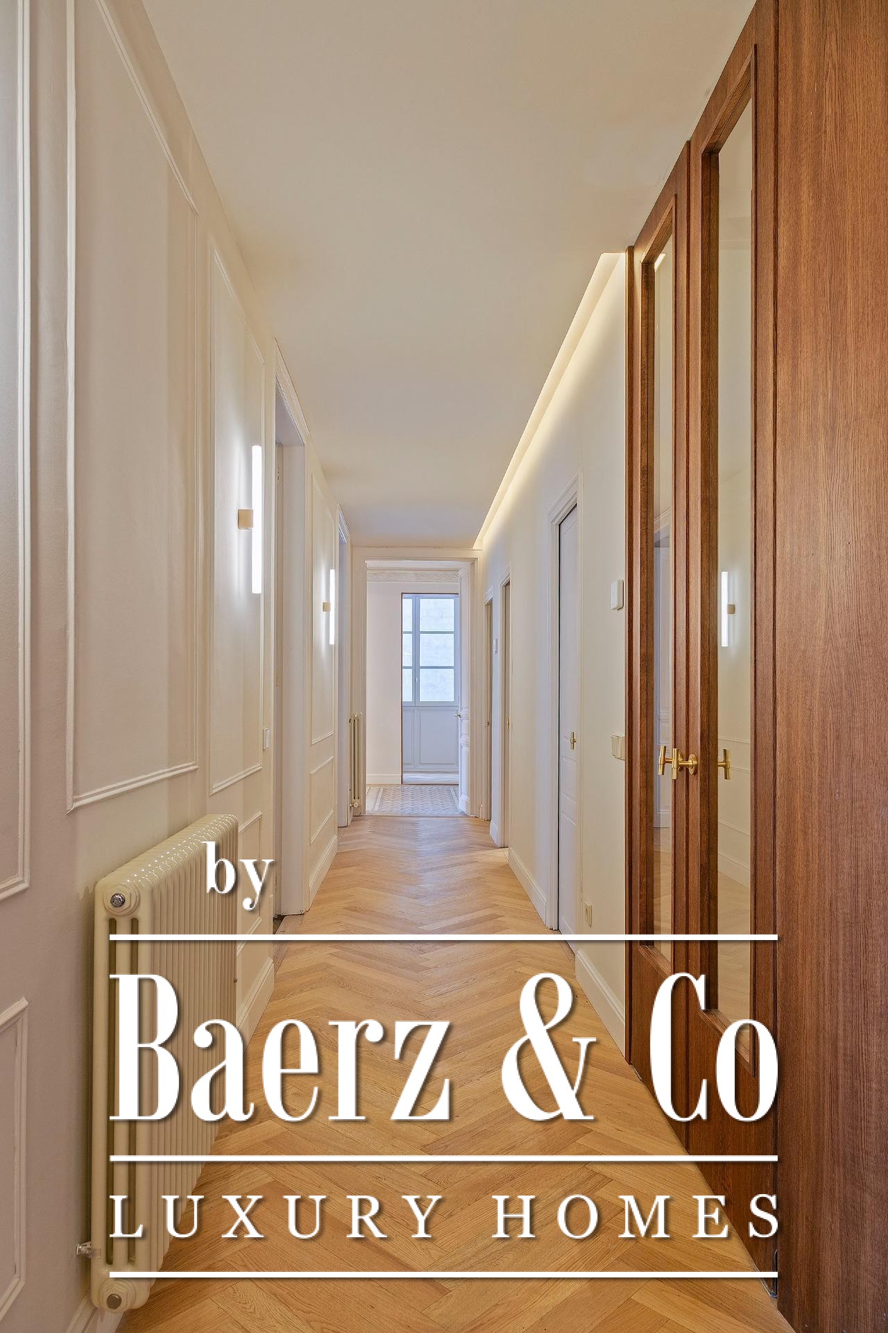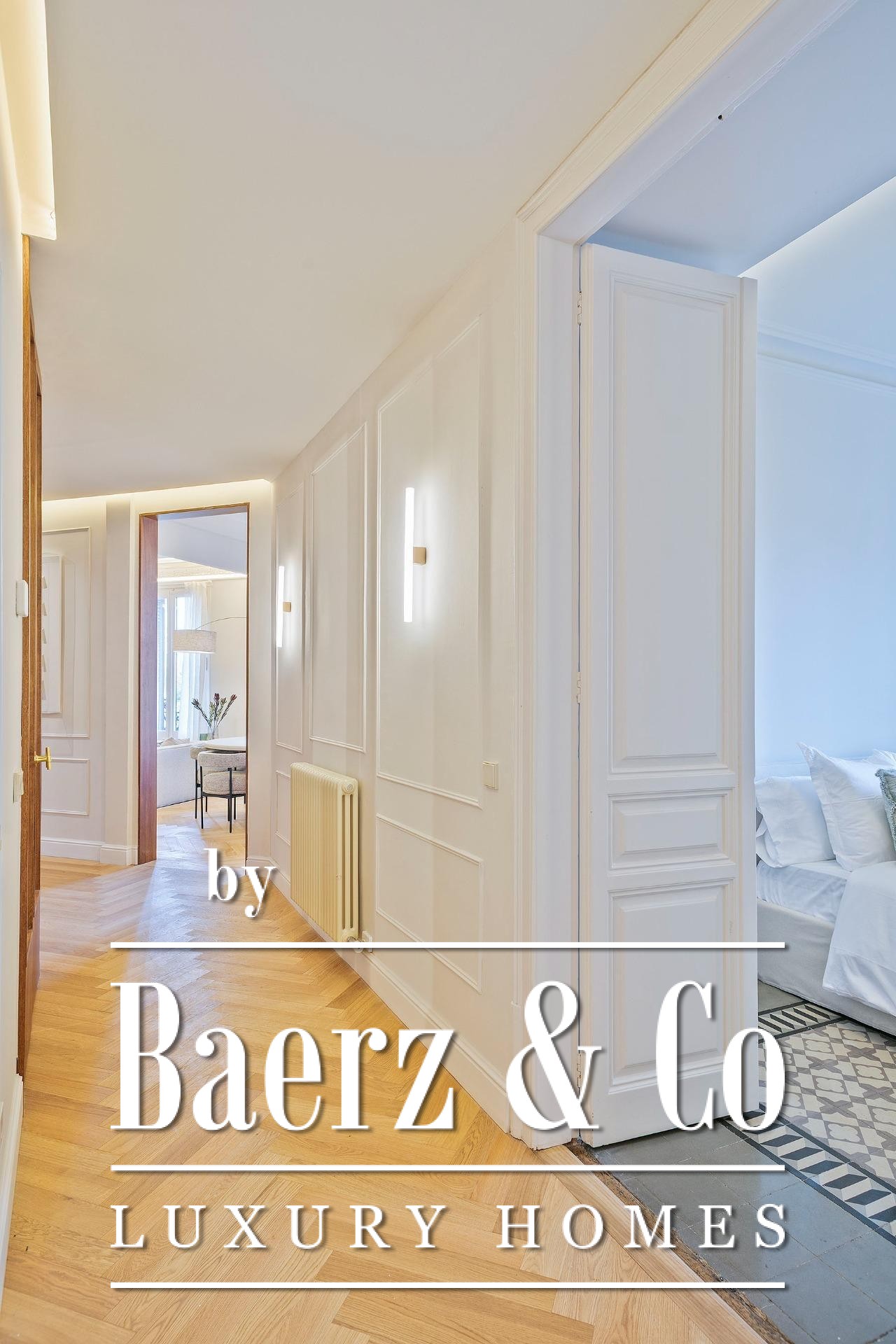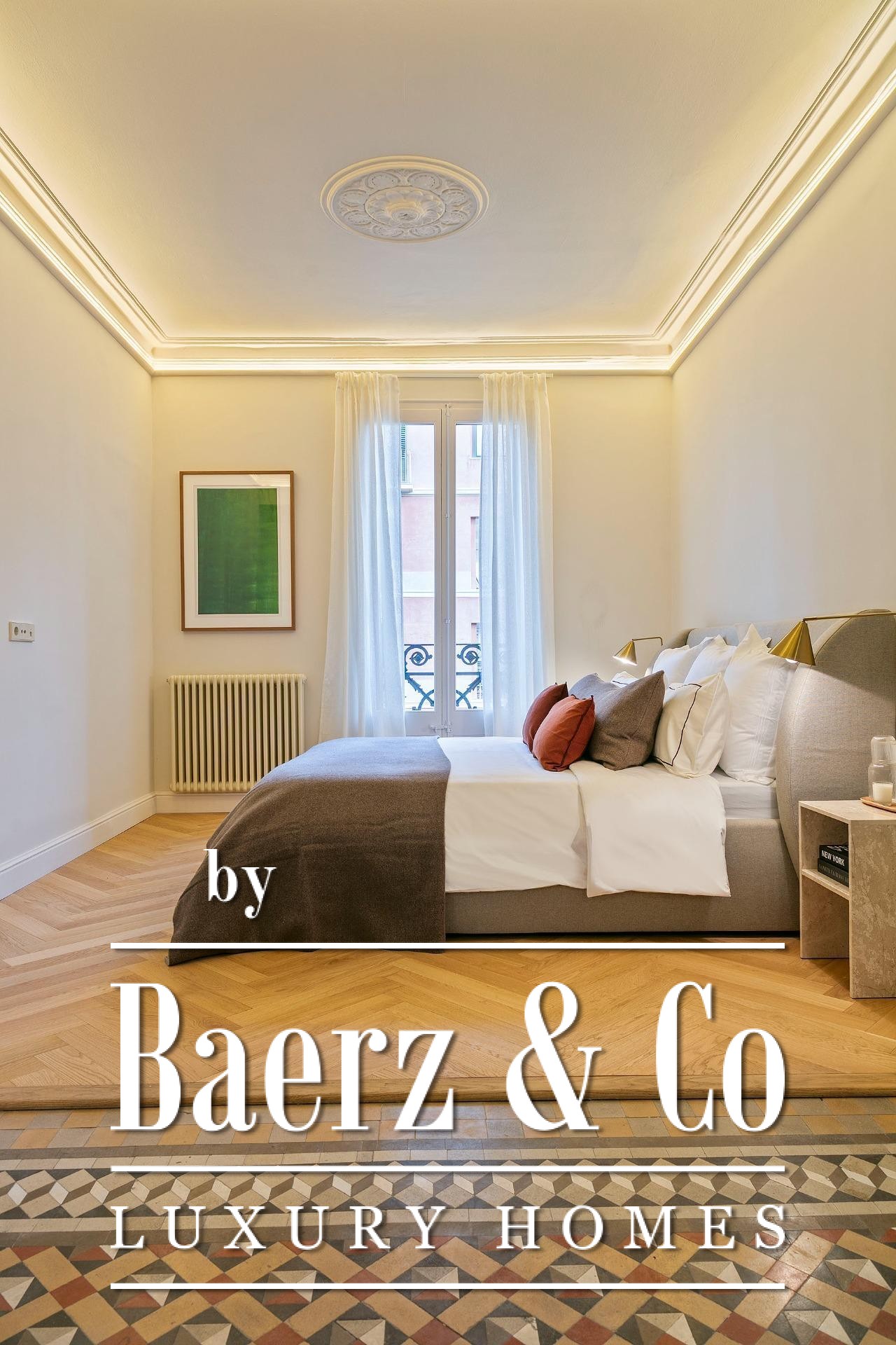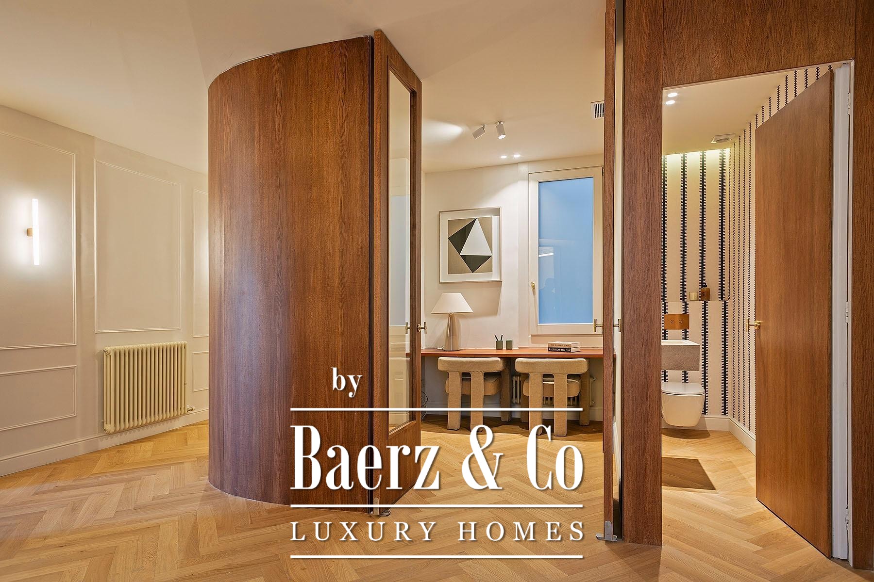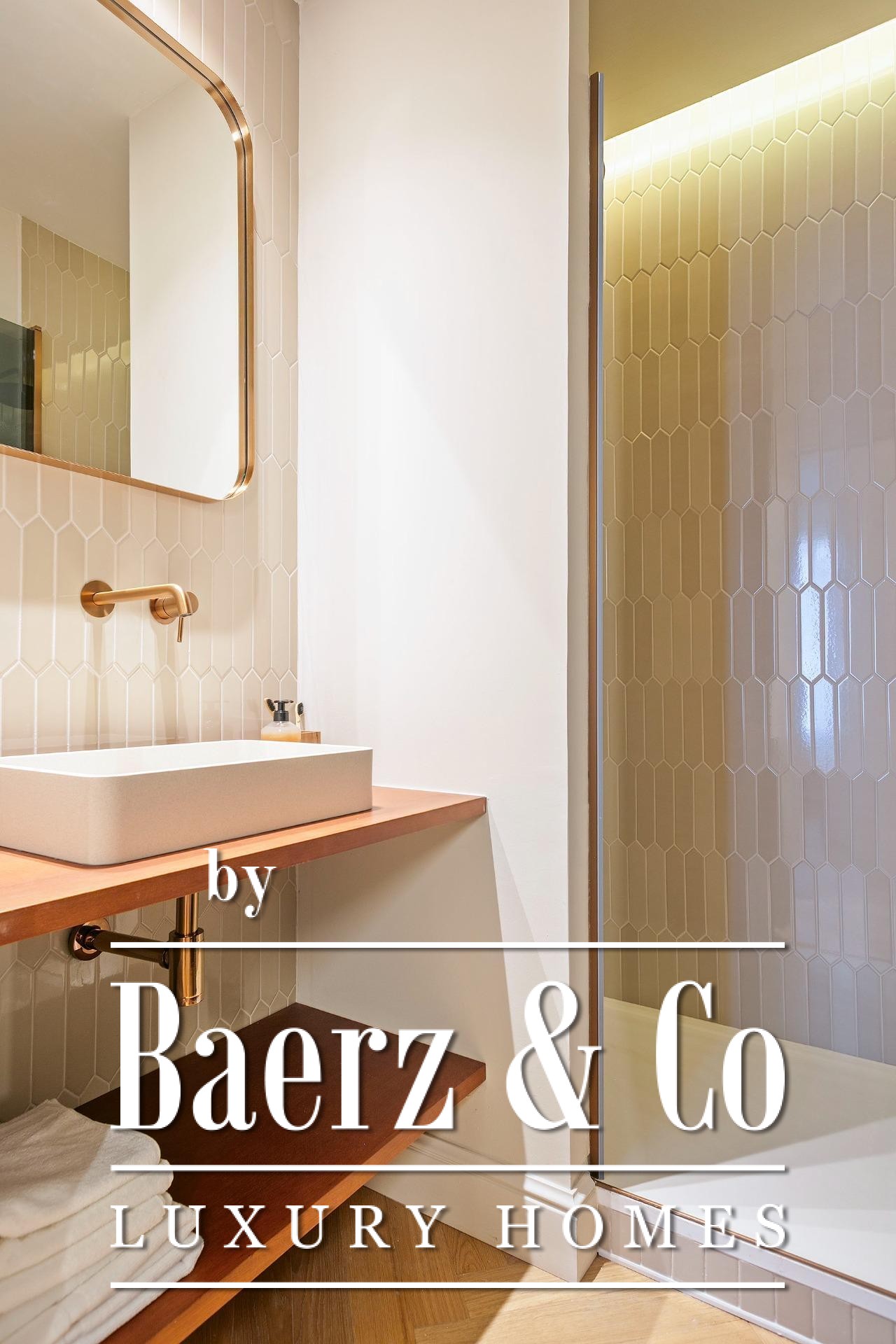 Ein vielseitig nutzbares, separates Arbeitszimmer bietet Raum für Beruf oder Rückzug, ergänzt durch zwei weitere voll ausgestattete Bäder sowie ein Gäste-WC. Aufgearbeitete originale Hydraulikfliesenböden und Decken treffen auf Fischgrätparkett aus Eiche und maßgefertigte Holzvertäfelungen, verbinden somit authentischen Charme mit moderner Eleganz. Balkon, Aufzug, Einbauschränke, integrierte Waschküche und hochwertige Heizung runden dieses dauerhaft attraktive Anwesen ab.