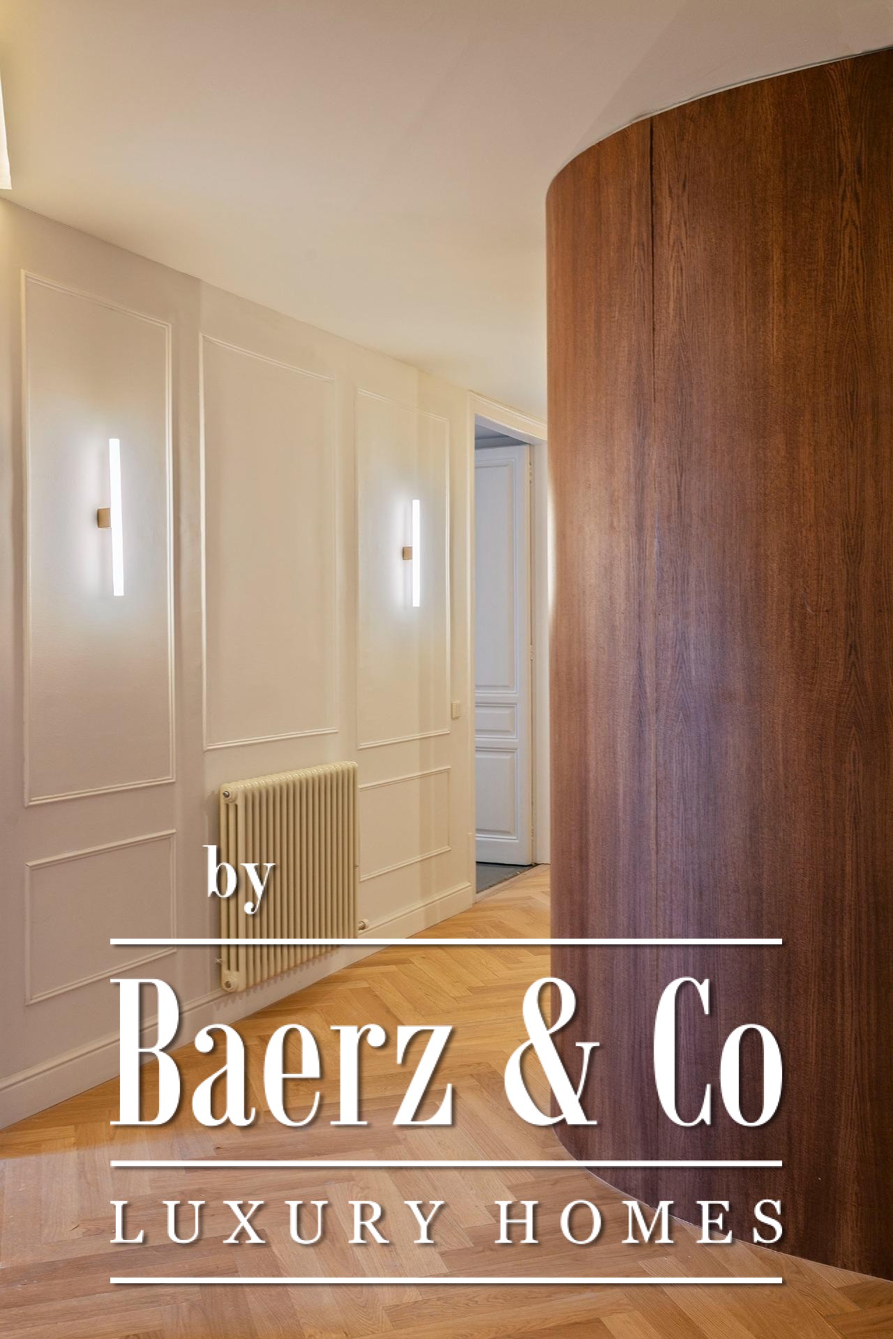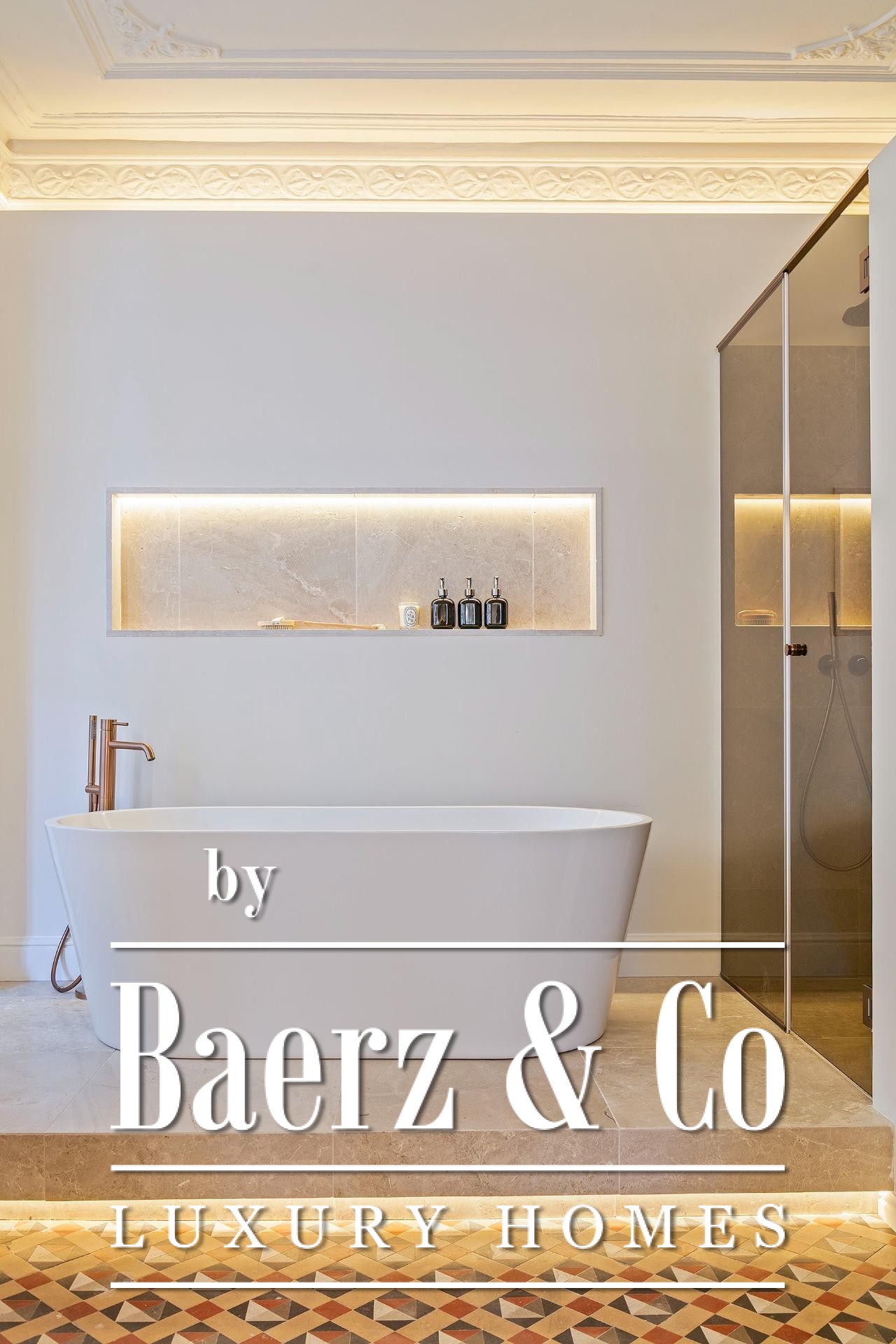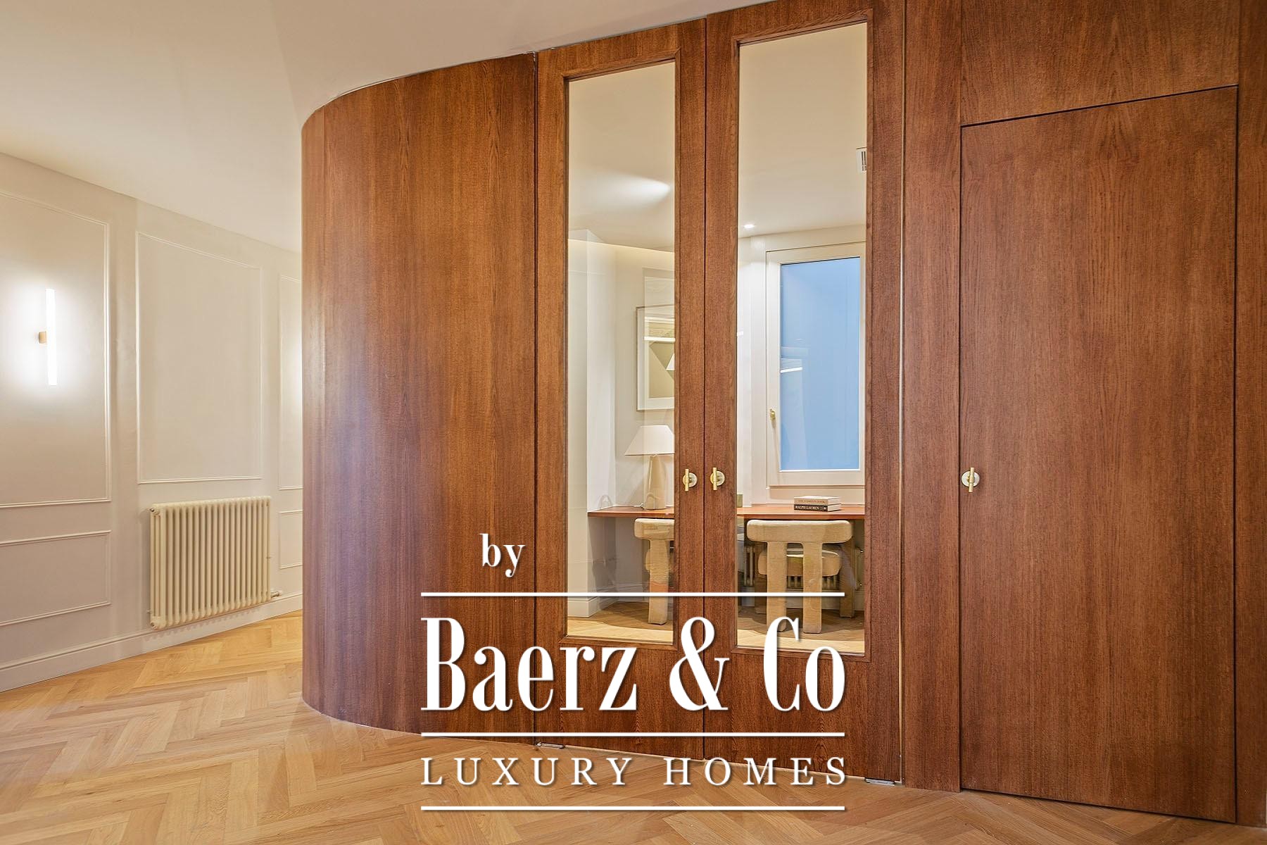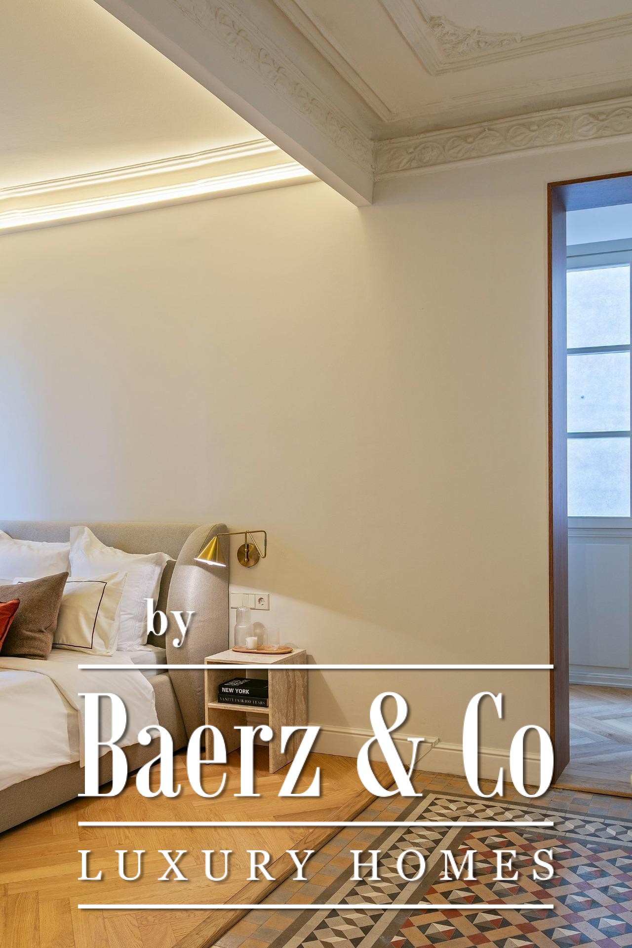 Ein vielseitig nutzbares, separates Arbeitszimmer bietet Raum für Beruf oder Rückzug, ergänzt durch zwei weitere voll ausgestattete Bäder sowie ein Gäste-WC. Aufgearbeitete originale Hydraulikfliesenböden und Decken treffen auf Fischgrätparkett aus Eiche und maßgefertigte Holzvertäfelungen, verbinden somit authentischen Charme mit moderner Eleganz. Balkon, Aufzug, Einbauschränke, integrierte Waschküche und hochwertige Heizung runden dieses dauerhaft attraktive Anwesen ab.