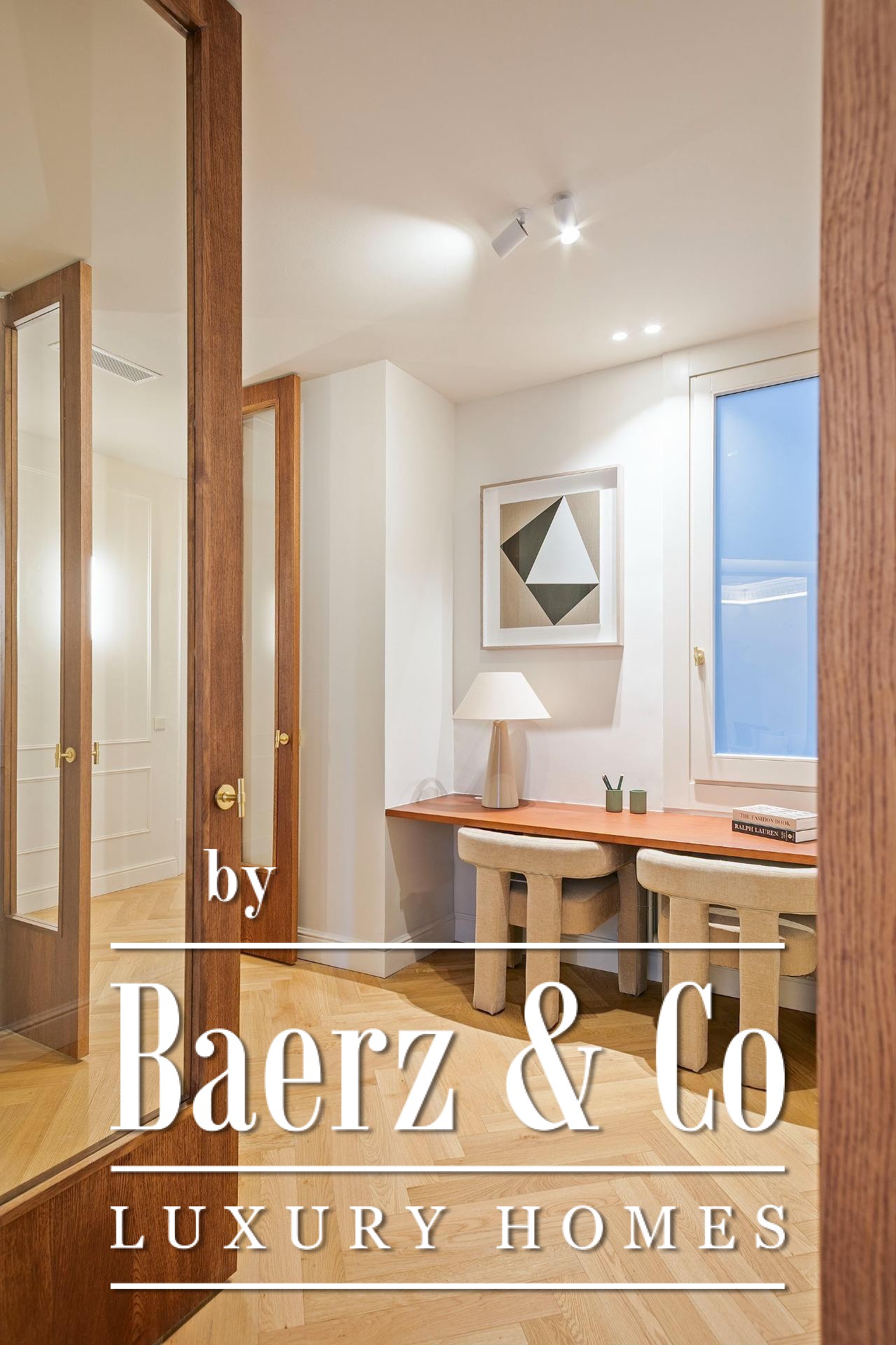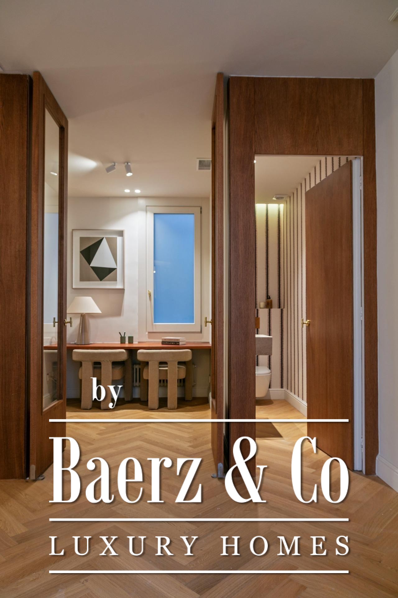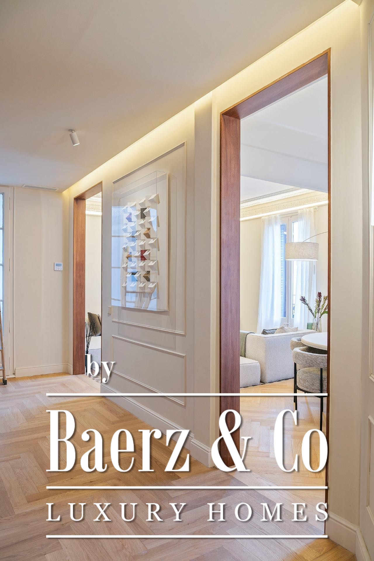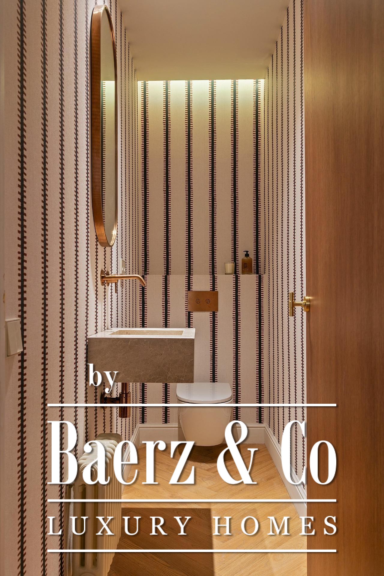 Ein vielseitig nutzbares, separates Arbeitszimmer bietet Raum für Beruf oder Rückzug, ergänzt durch zwei weitere voll ausgestattete Bäder sowie ein Gäste-WC. Aufgearbeitete originale Hydraulikfliesenböden und Decken treffen auf Fischgrätparkett aus Eiche und maßgefertigte Holzvertäfelungen, verbinden somit authentischen Charme mit moderner Eleganz. Balkon, Aufzug, Einbauschränke, integrierte Waschküche und hochwertige Heizung runden dieses dauerhaft attraktive Anwesen ab.