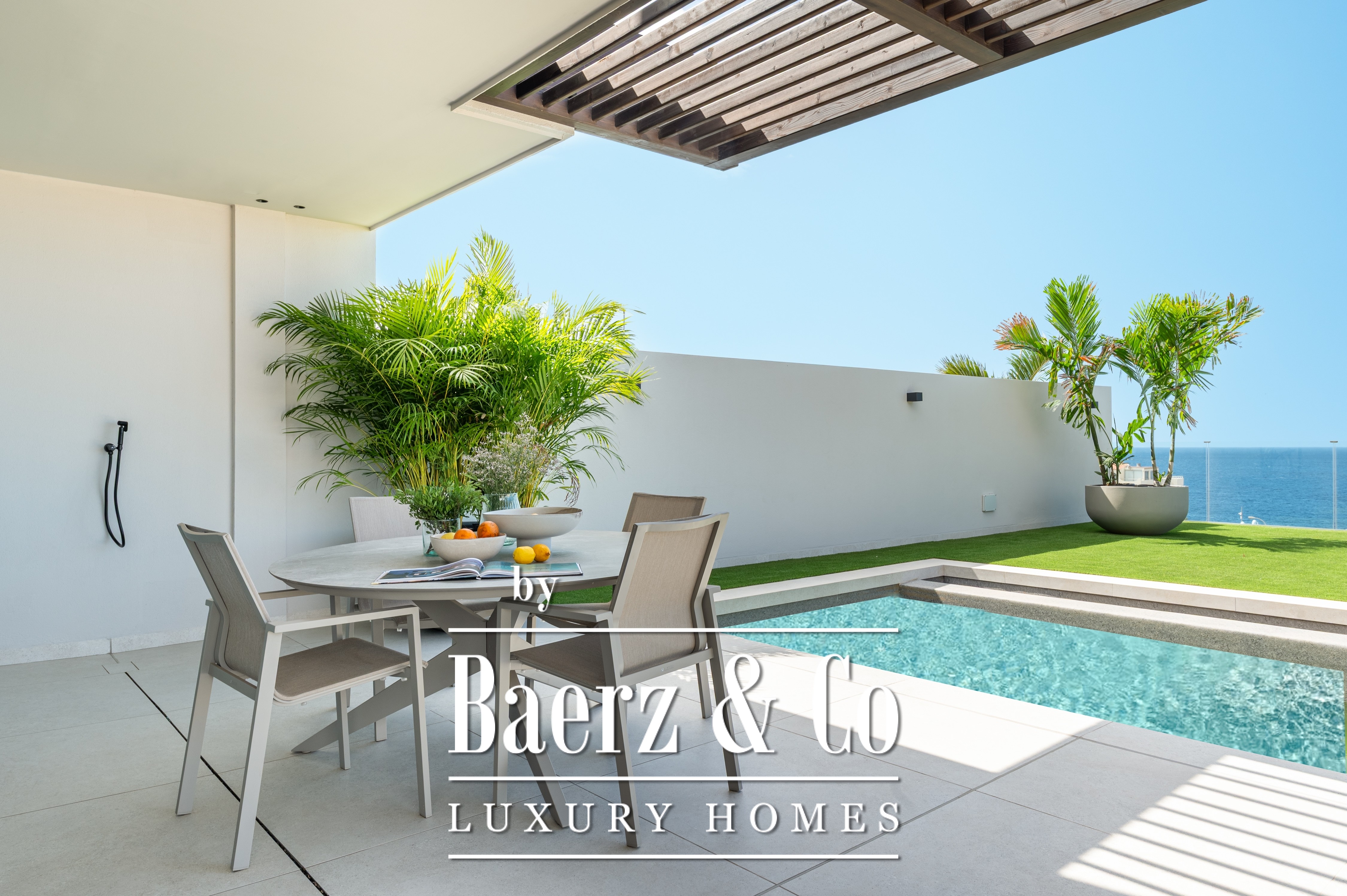 Die Wohnfläche von 241 m² sowie ein Grundstück von 340 m² bieten großzügige Proportionen und weite Ausblicke auf das Meer von den ausgedehnten Terrassen. Jeder der drei Schlafzimmer ist mit einem Einbauschrank ausgestattet, während vier Badezimmer Privatsphäre und Komfort sicherstellen. Der private, beheizte Pool mit Panoramablick auf das Meer lädt zum Entspannen ein. Die Terrasse erweitert das Wohngefühl nach draußen und schafft Raum für geselliges Miteinander oder stille Momente.