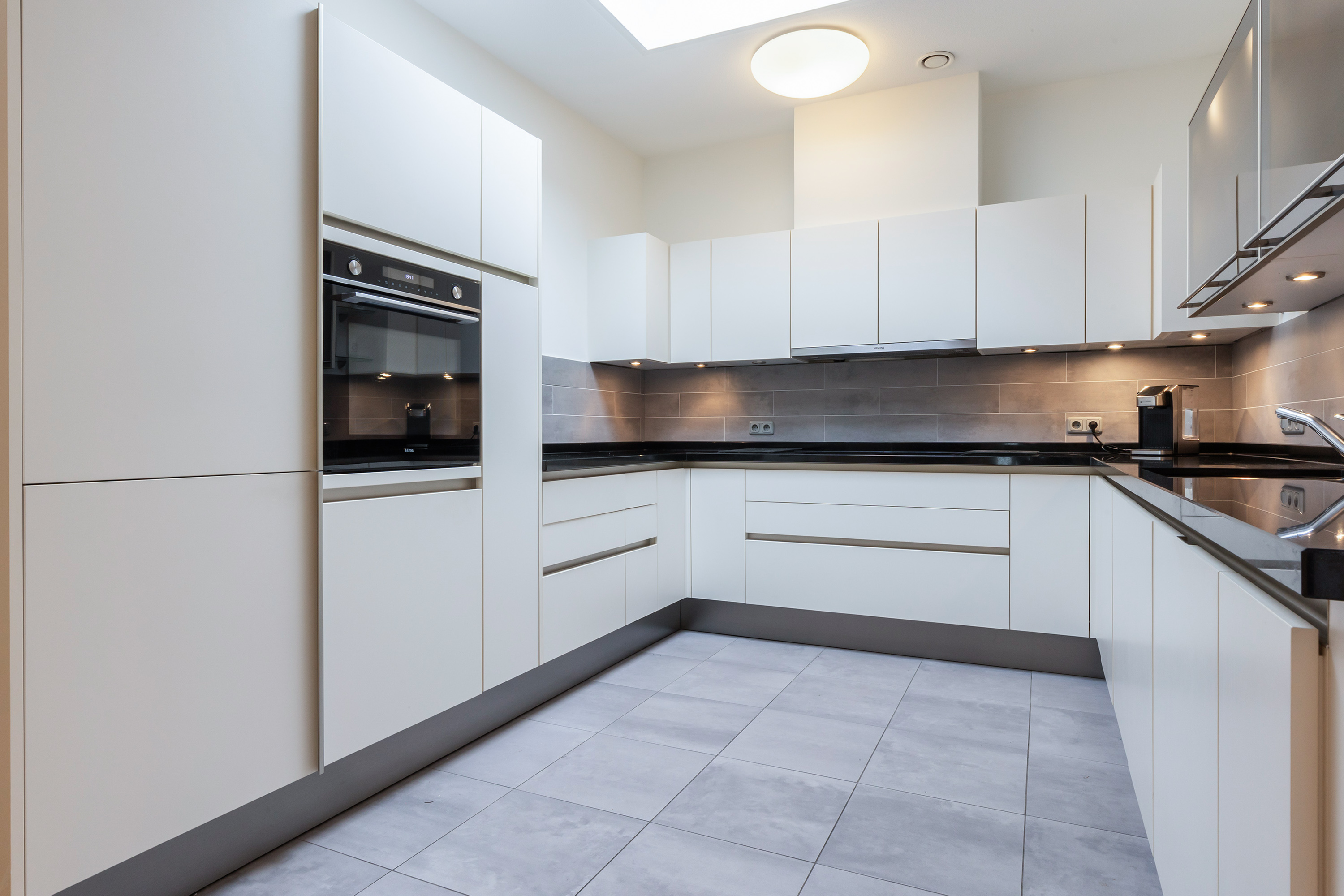 Der gesicherte Zugang erfolgt per Videogegensprechanlage und Transponder. Ein privater Aufzug führt in die dritte Etage, die nur mit einer weiteren Wohnung geteilt wird. Im Inneren betonen hohe Decken das lichtdurchflutete, 86 m² große Wohnzimmer mit großzügigen Fenstern, geweißten Parkettböden und frischer Innenlackierung aus dem Jahr 2024. Französische Türen führen auf die 28 m² große, südlich ausgerichtete Terrasse – perfekt für Mahlzeiten im Freien oder Momente des Rückzugs unter der automatisierten Markise. Die stilvolle U-Küche ist mit Hochglanzfronten, schwarzer Granitarbeitsplatte und Einbaugeräten ausgestattet. Ein Oberlicht spendet Tageslicht. Ein Hauswirtschaftsraum ergänzt den praktischen Stauraum.