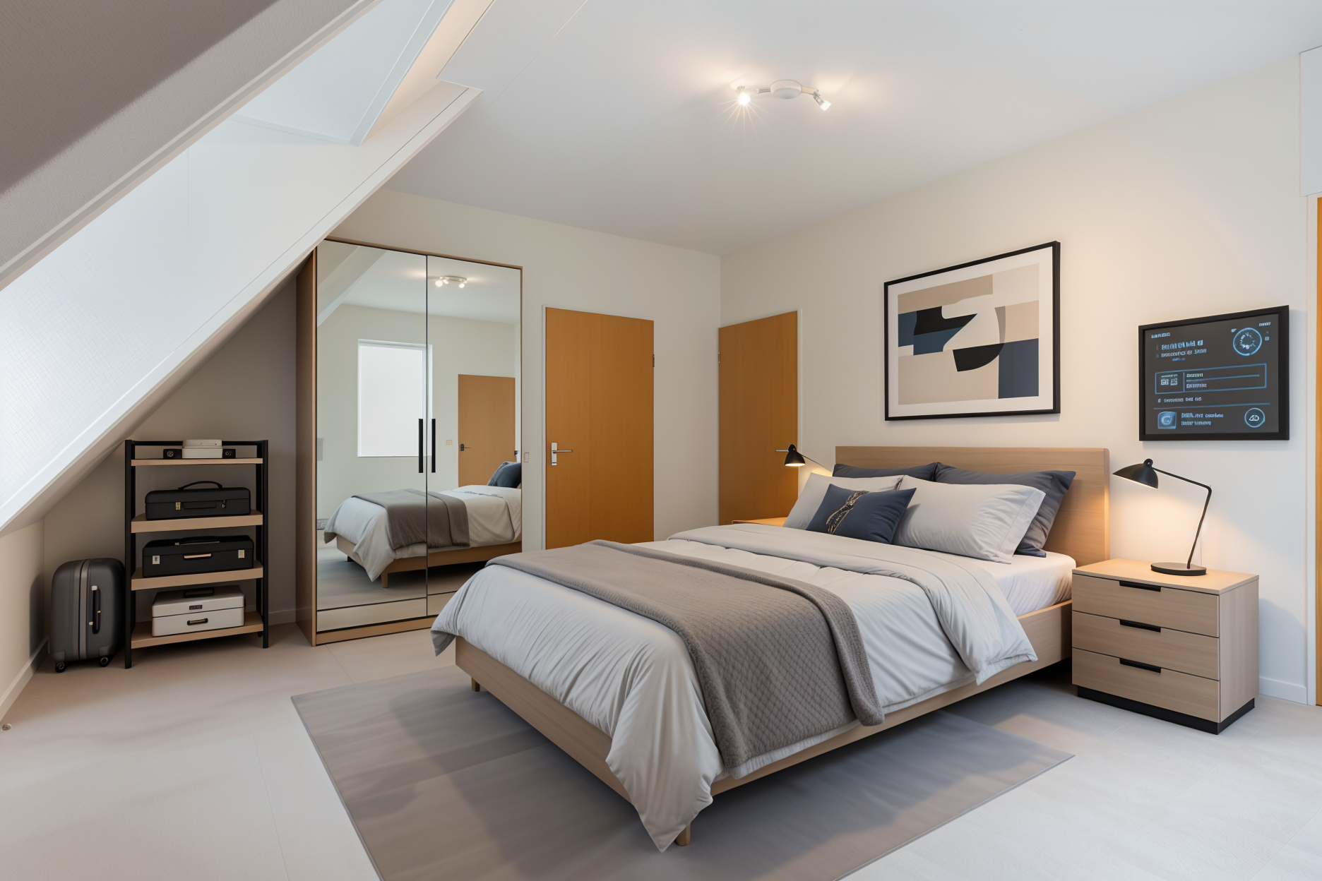 Drei Schlafzimmer sind mit neuen, widerstandsfähigen und warmen PVC-Böden ausgestattet. Die Mastersuite wartet mit maßgefertigten Einbauten, Balkonzugang und eigenem Bad mit barrierefreier Dusche für jedes Alter auf. Das zweite Schlafzimmer verfügt über eigenen Balkon und begehbaren Kleiderschrank, das dritte dient aktuell als Arbeitszimmer. Ein zweites Bad und vielfältige Ausstattungsmerkmale bieten Flexibilität für Gäste und Bewohner gleichermaßen.