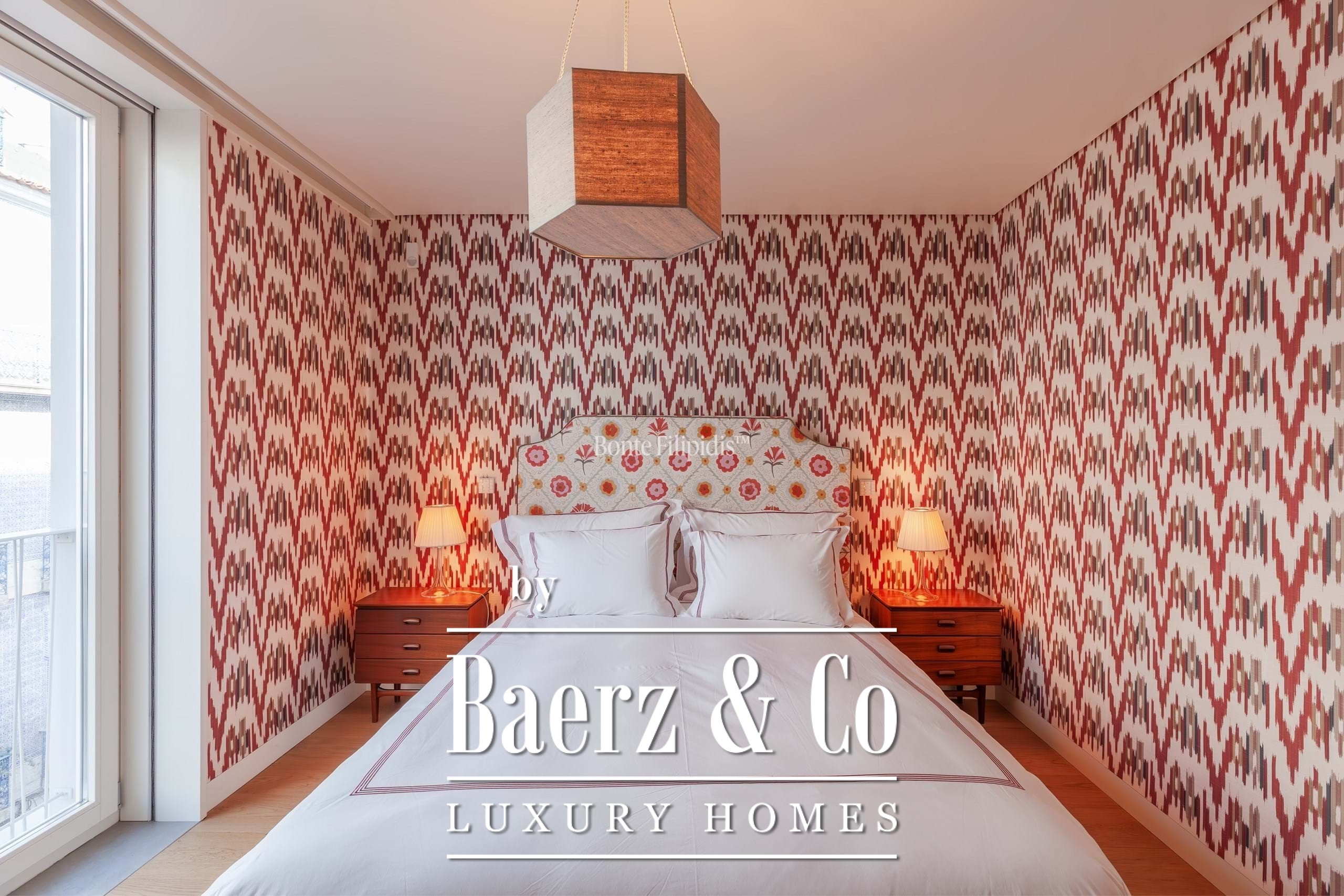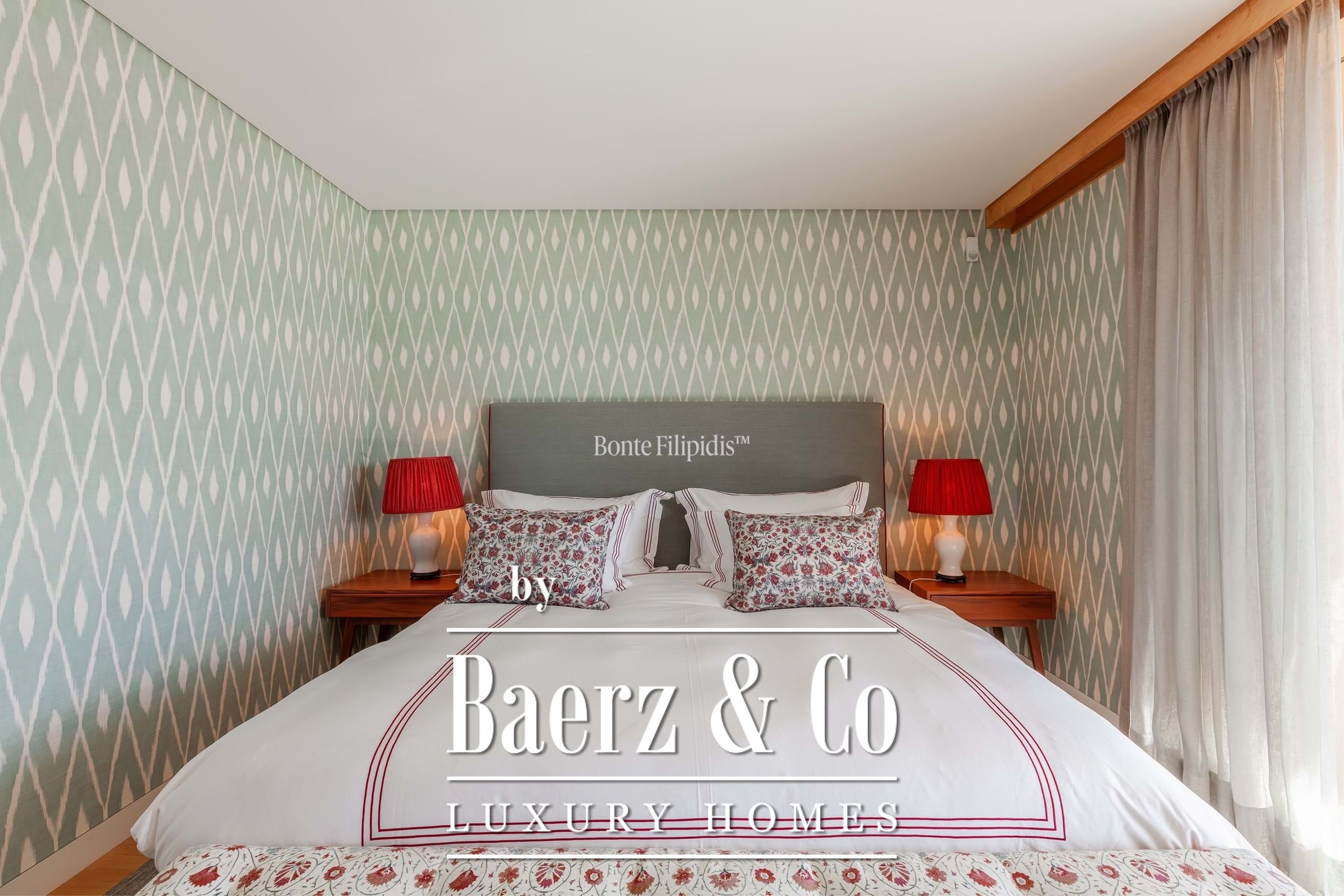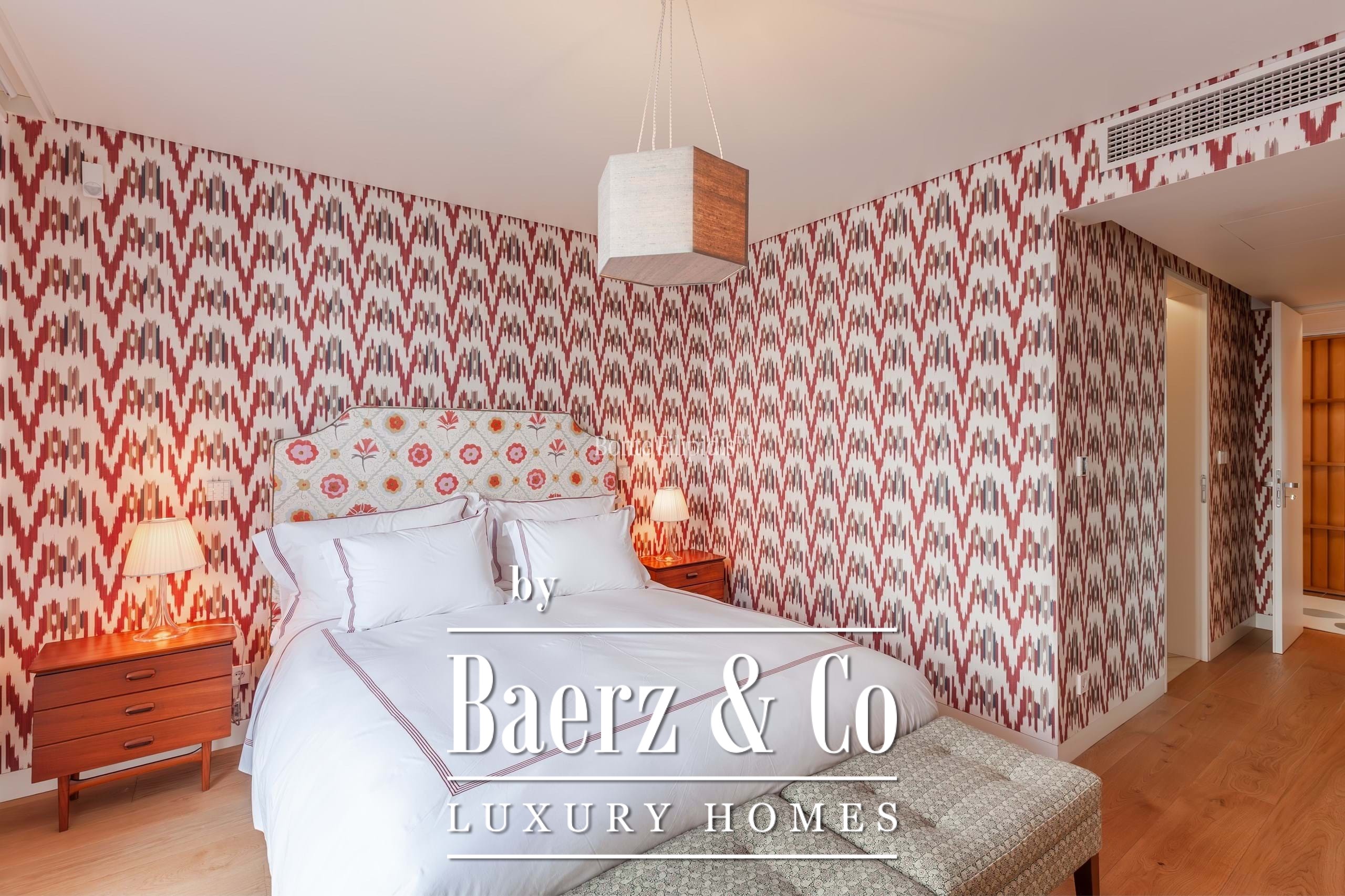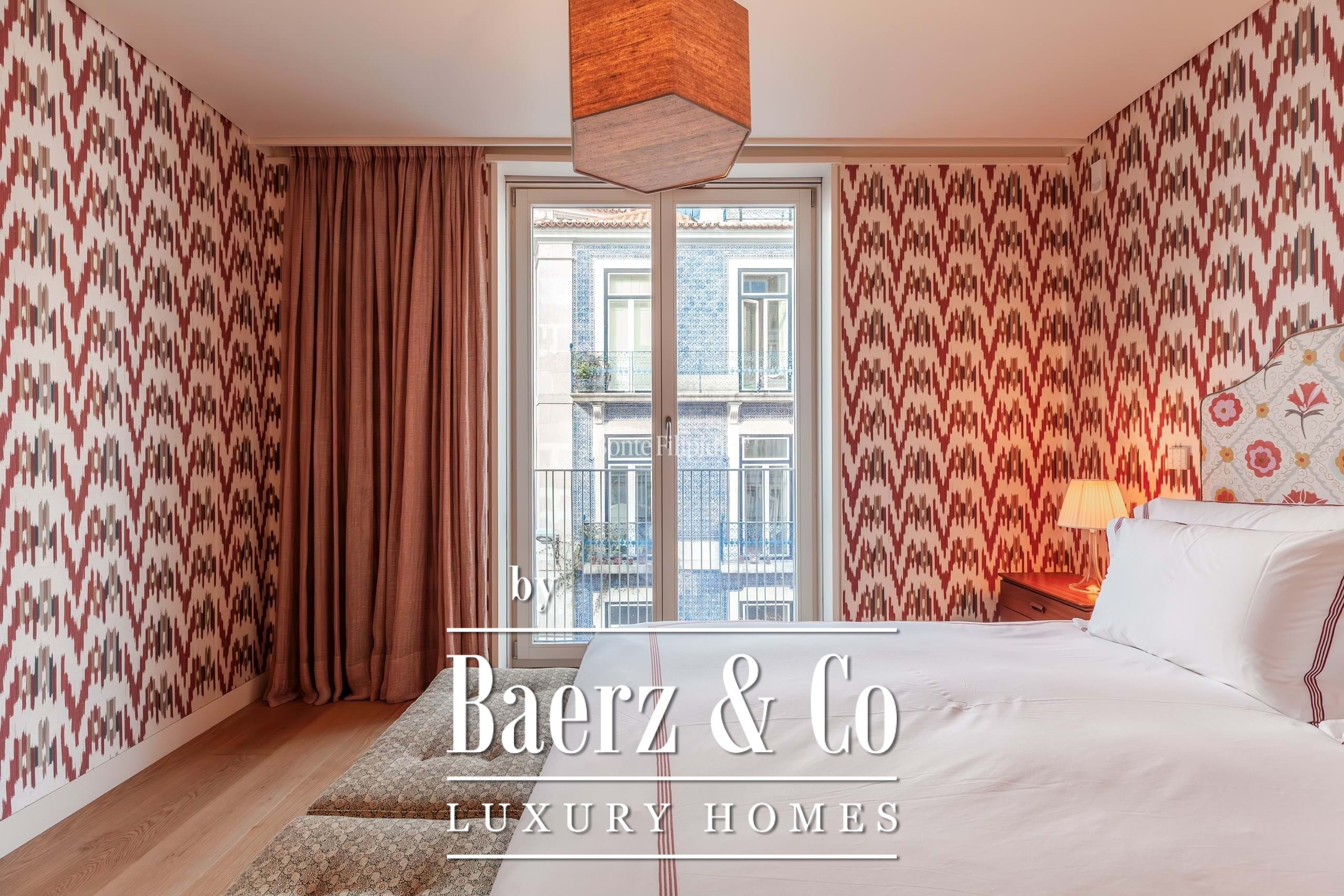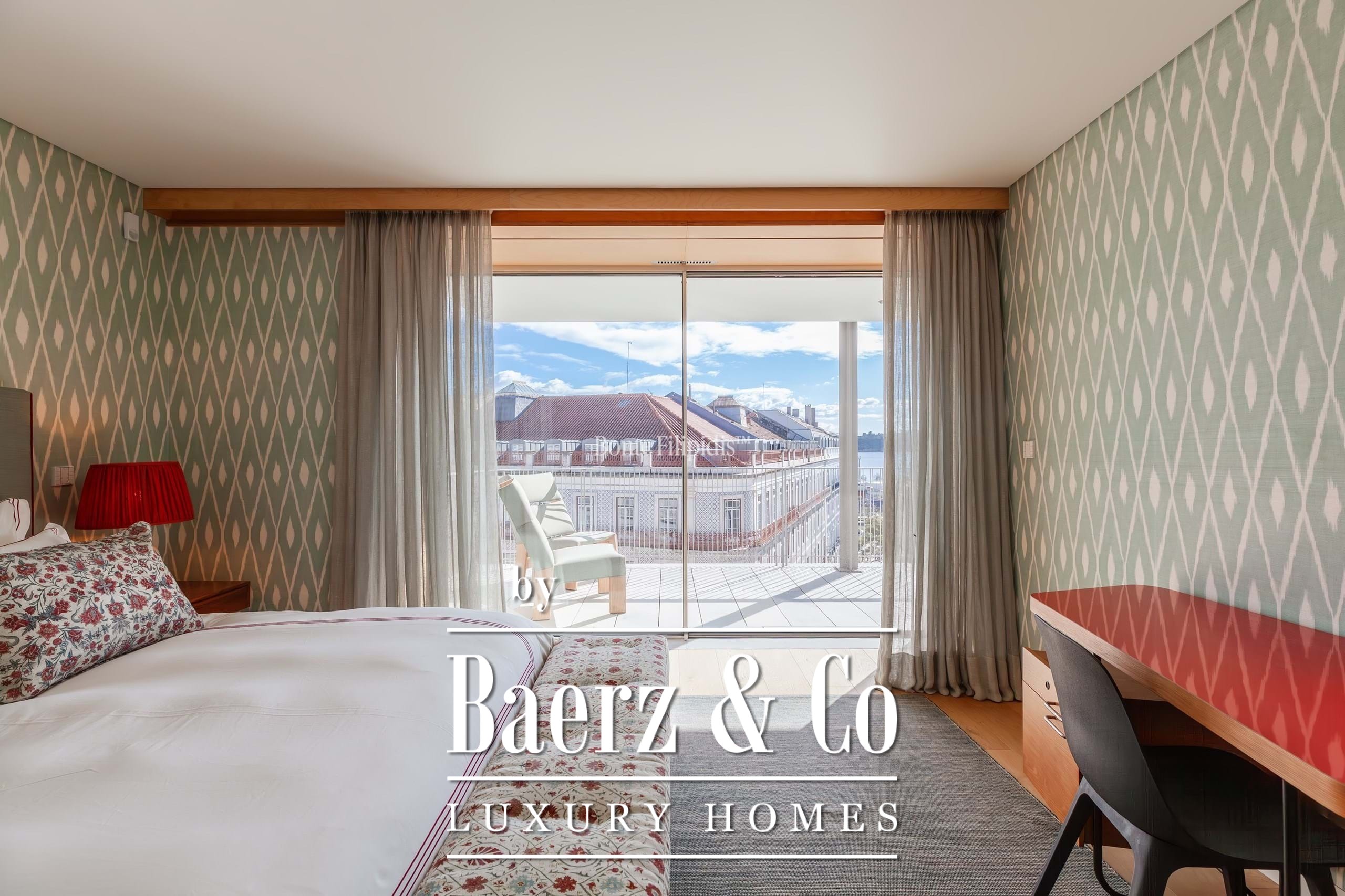 The private area is well organised. One suite offers ample built-in storage and overlooks a quiet street with traditional Lisbon architecture. Two additional bedrooms share a full bathroom. The master suite stands out for its abundant natural light, spacious walk-in closet, en-suite bathroom, and direct access to the terrace.