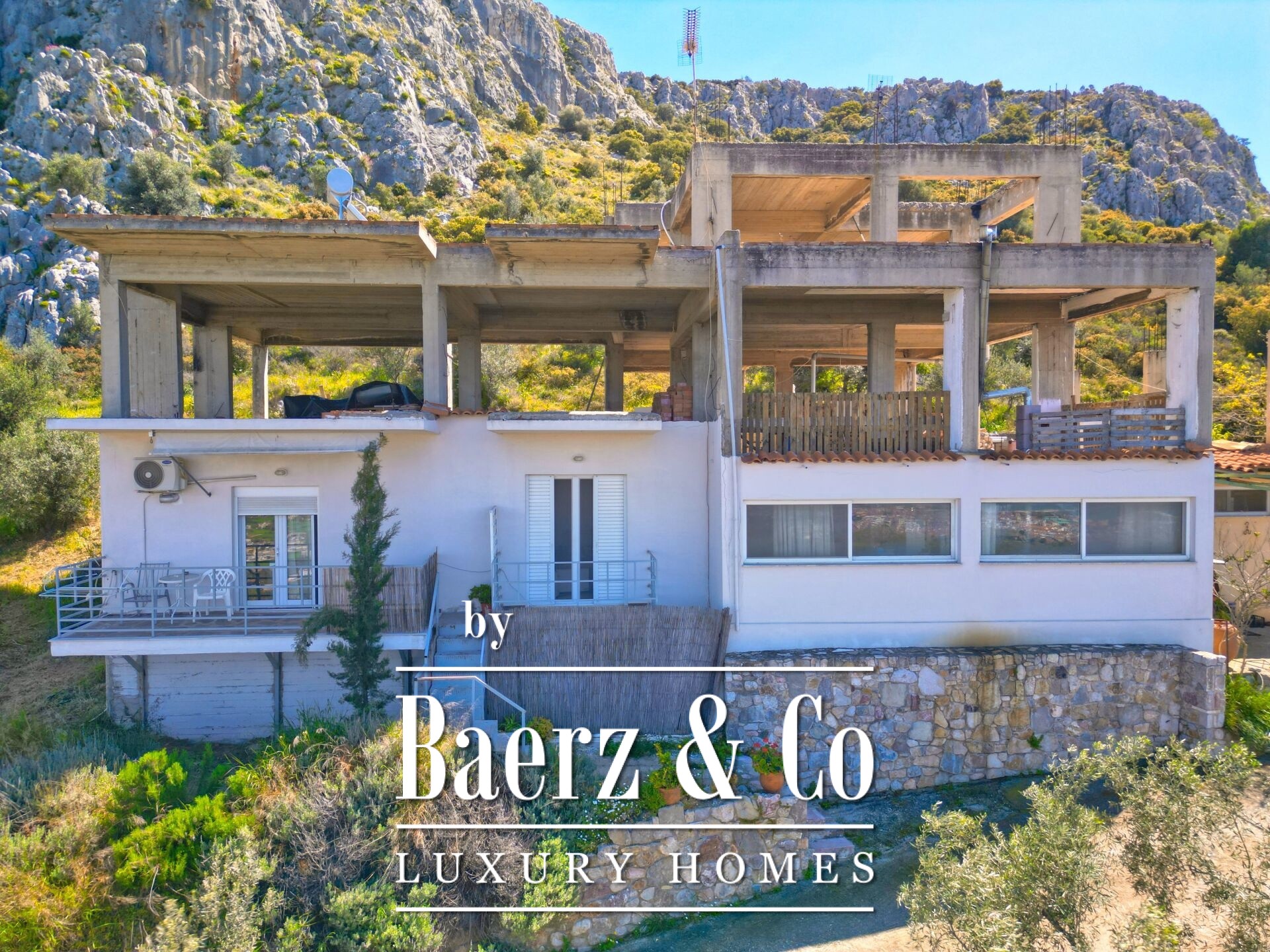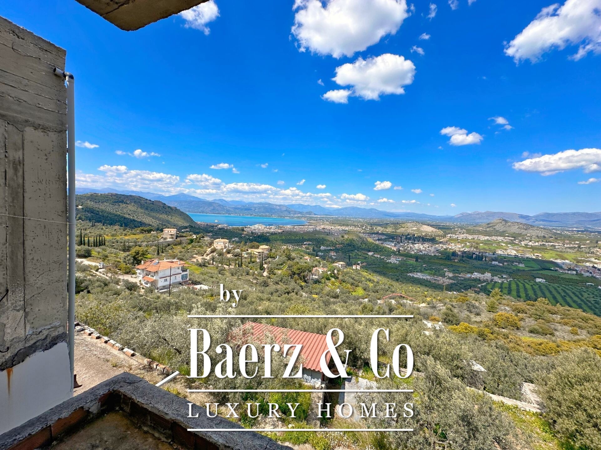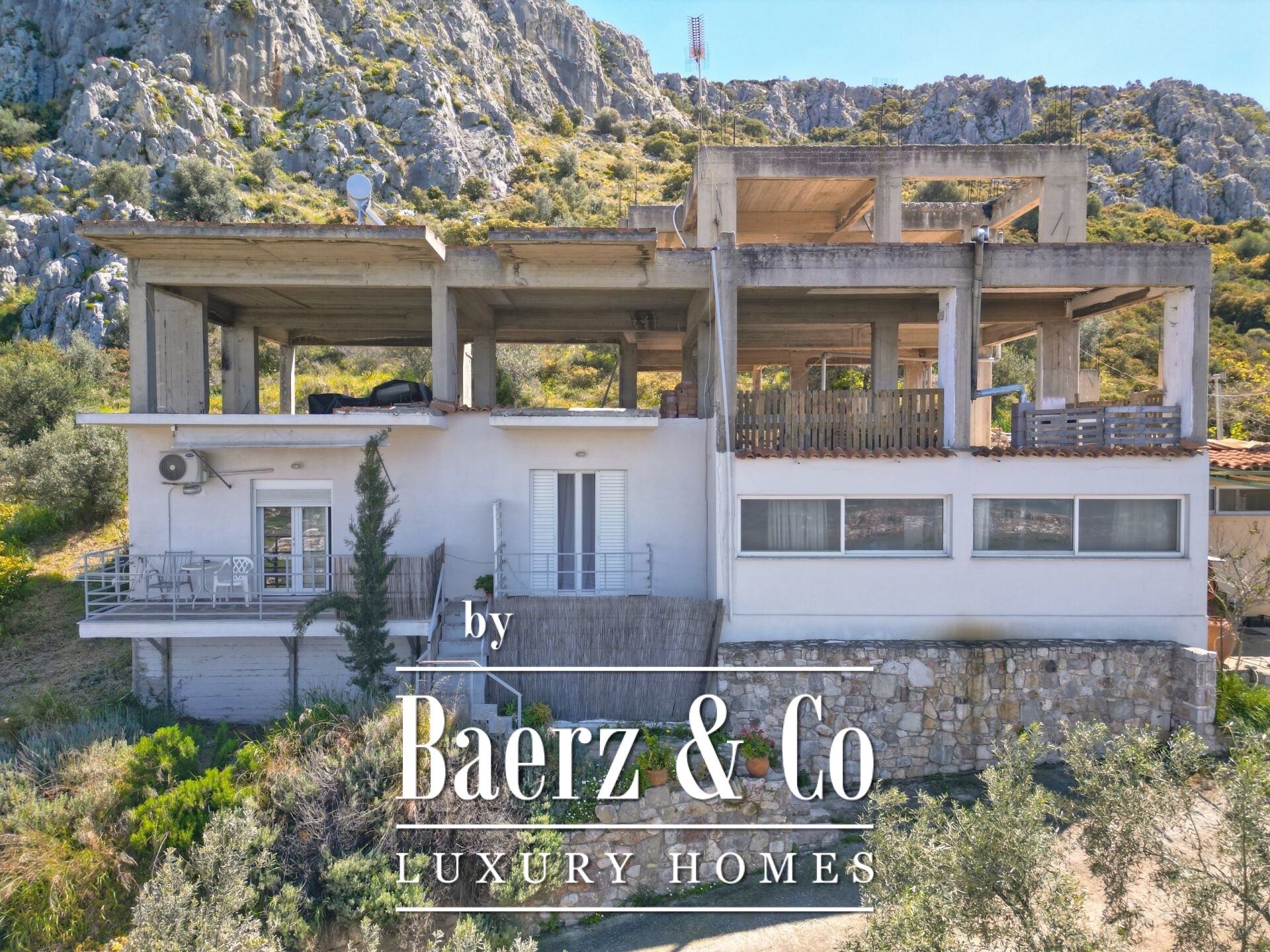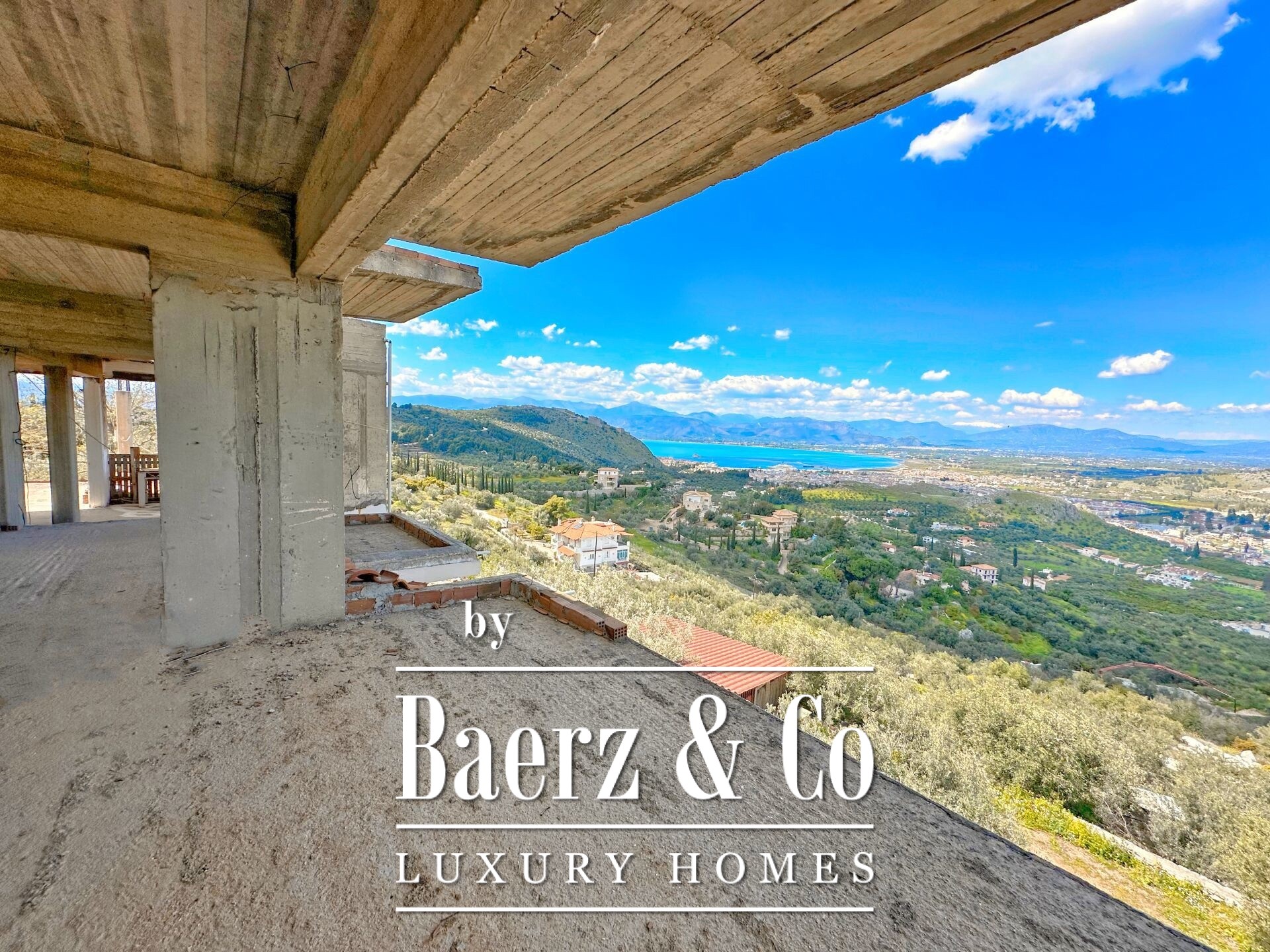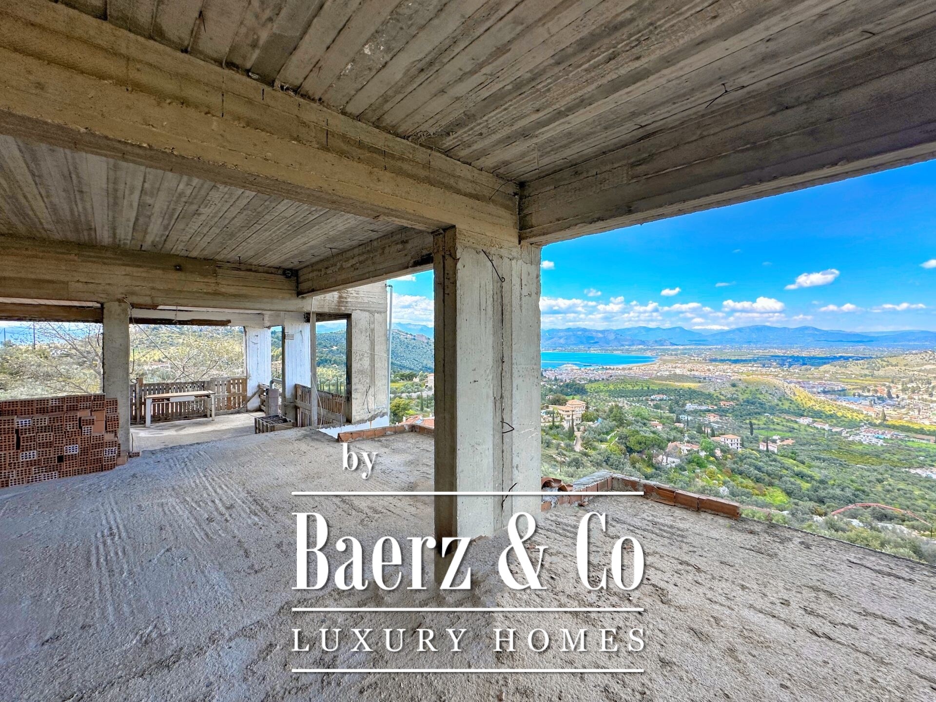 Das freistehende Haus Karathona beeindruckt mit seinem Panorama-Meer- und Bergblick und nimmt eine privilegierte Lage auf dem Gipfel eines Hügels zwischen Nafplio und dem Strand von Karathona ein. Diese teilweise fertiggestellte Residenz erstreckt sich über 390 m² auf drei Ebenen und befindet sich auf einem großzügigen Grundstück von 8.835 m², das ein seltenes Gefühl von Privatsphäre und Offenheit vermittelt. Das Anfang der 1990er Jahre errichtete Gebäude befindet sich größtenteils im Rohbauzustand und bietet dem künftigen Eigentümer eine vielseitige Grundlage zur individuellen Fertigstellung. Von jedem Balkon und aus jedem Raum eröffnet sich ein weiter Blick über die Ebene von Argolis, die Altstadt von Nafplio, den Argolischen Golf sowie die fernen Gebirge Artemisio und Ziria, außerdem sind bedeutende Wahrzeichen wie die Palamidi-Burg und das Kloster Agia Moni zu sehen.