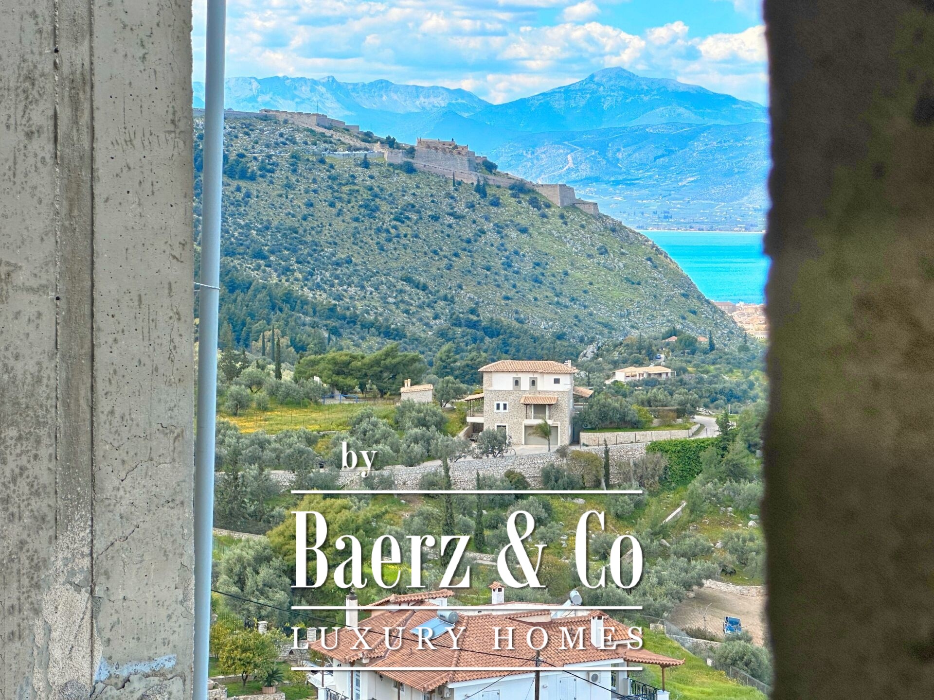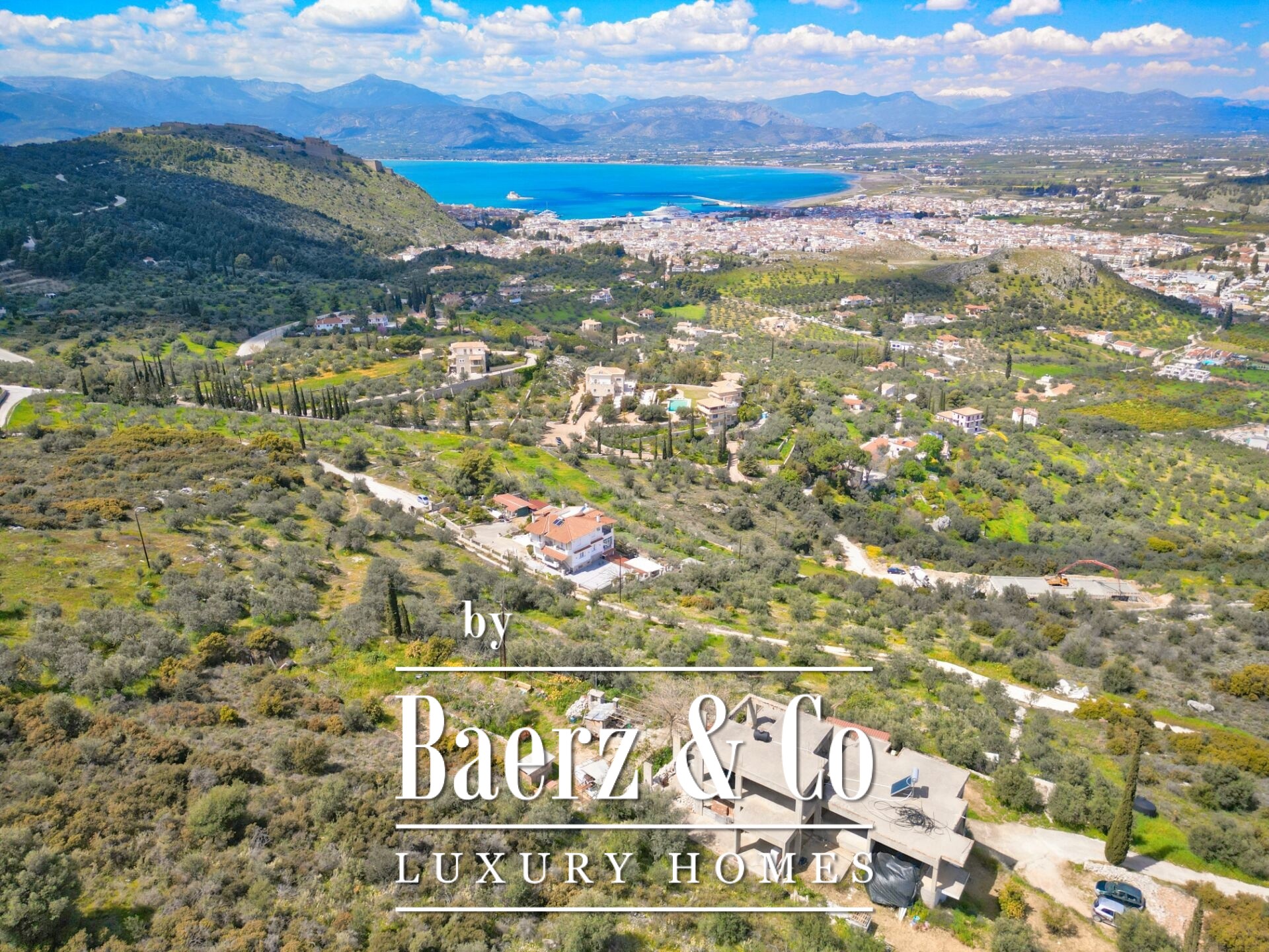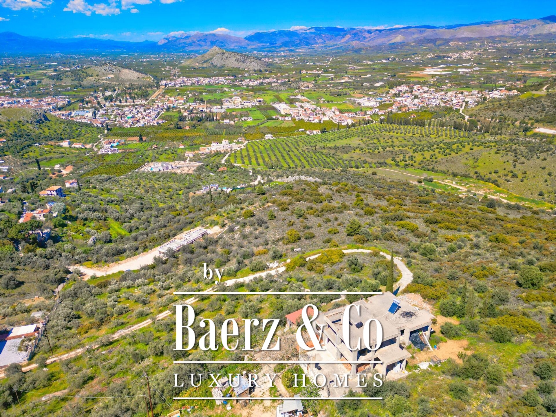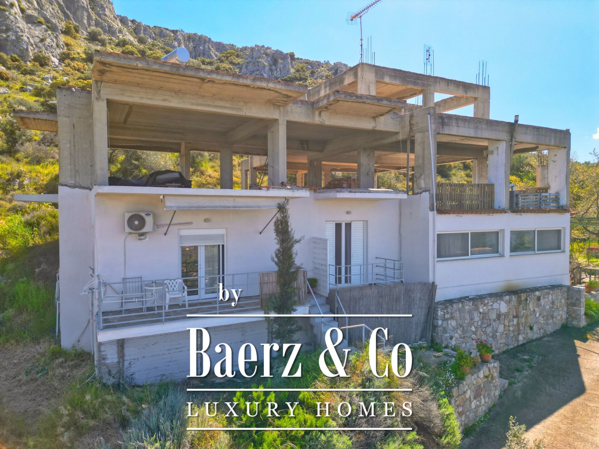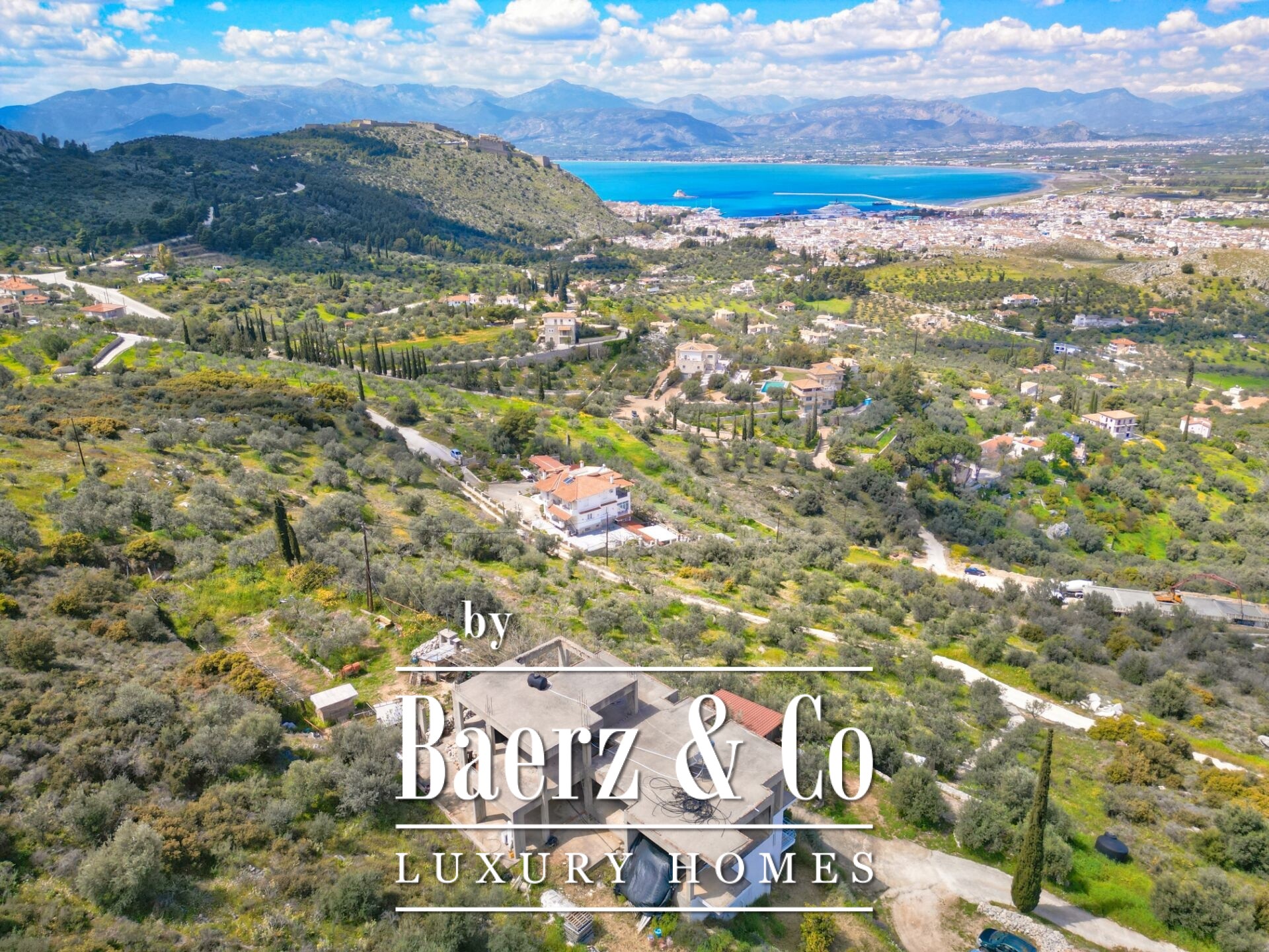 Das freistehende Haus Karathona beeindruckt mit seinem Panorama-Meer- und Bergblick und nimmt eine privilegierte Lage auf dem Gipfel eines Hügels zwischen Nafplio und dem Strand von Karathona ein. Diese teilweise fertiggestellte Residenz erstreckt sich über 390 m² auf drei Ebenen und befindet sich auf einem großzügigen Grundstück von 8.835 m², das ein seltenes Gefühl von Privatsphäre und Offenheit vermittelt. Das Anfang der 1990er Jahre errichtete Gebäude befindet sich größtenteils im Rohbauzustand und bietet dem künftigen Eigentümer eine vielseitige Grundlage zur individuellen Fertigstellung. Von jedem Balkon und aus jedem Raum eröffnet sich ein weiter Blick über die Ebene von Argolis, die Altstadt von Nafplio, den Argolischen Golf sowie die fernen Gebirge Artemisio und Ziria, außerdem sind bedeutende Wahrzeichen wie die Palamidi-Burg und das Kloster Agia Moni zu sehen.