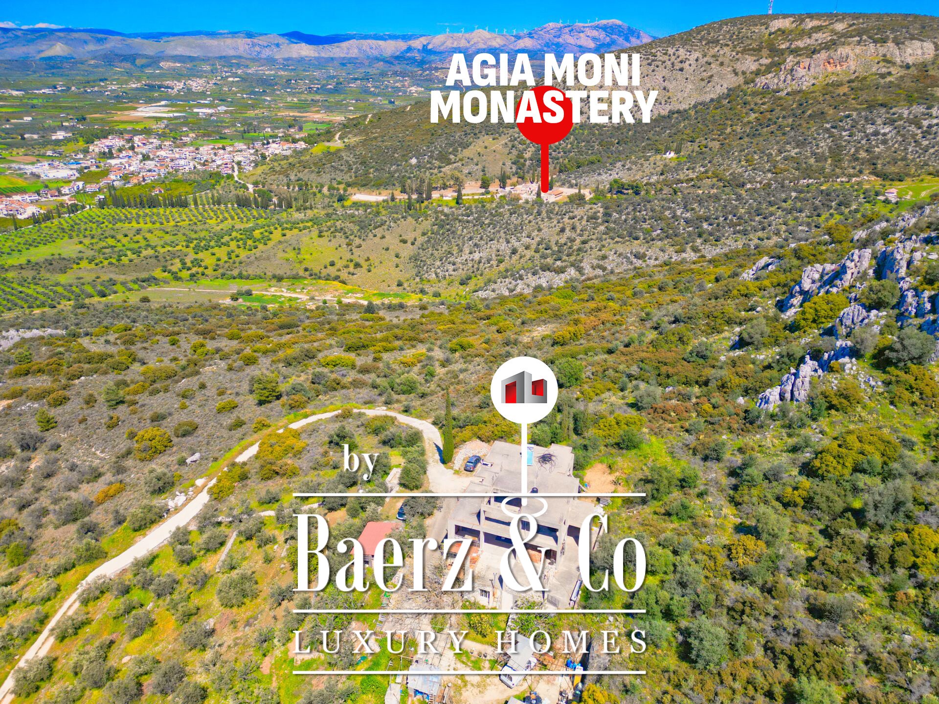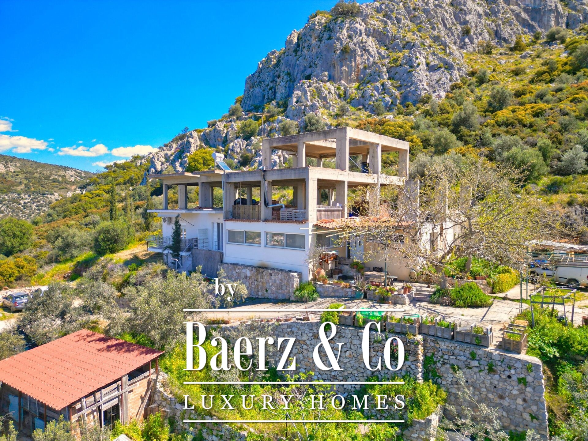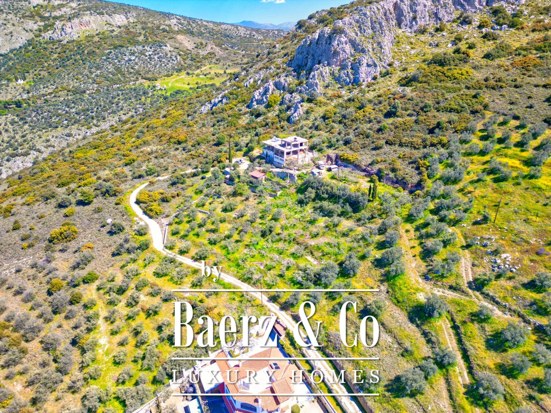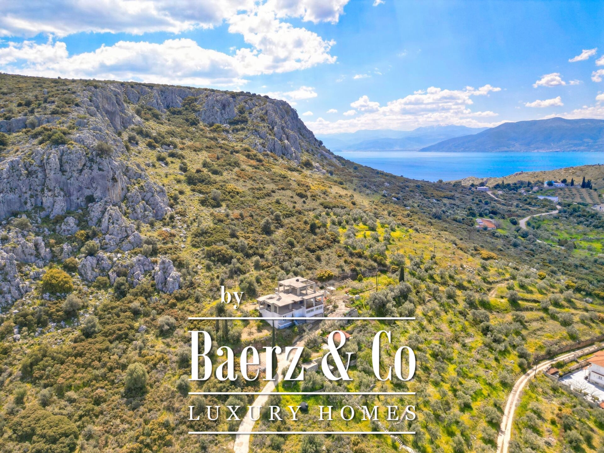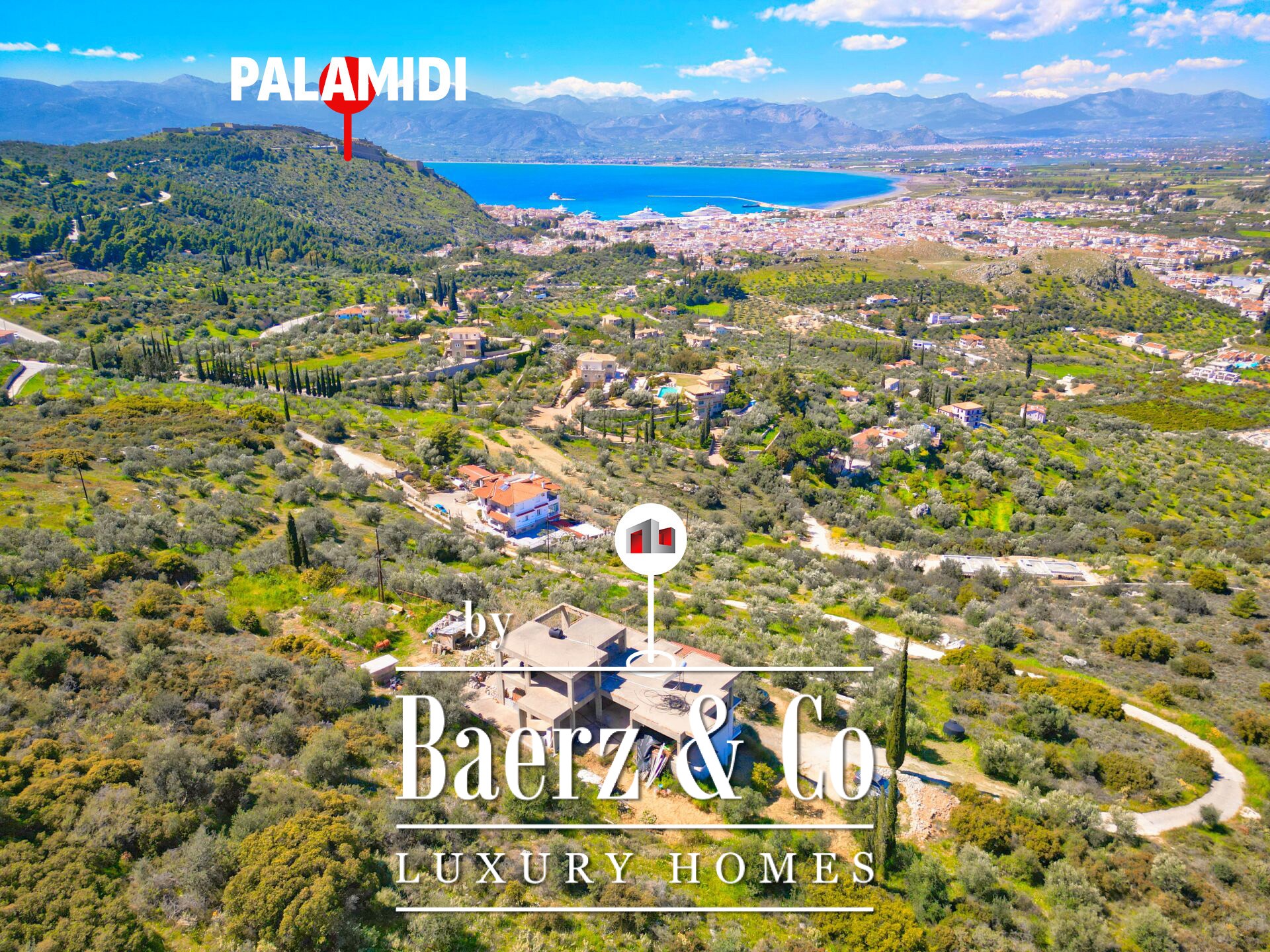Das freistehende Haus Karathona beeindruckt mit seinem Panorama-Meer- und Bergblick und nimmt eine privilegierte Lage auf dem Gipfel eines Hügels zwischen Nafplio und dem Strand von Karathona ein. Diese teilweise fertiggestellte Residenz erstreckt sich über 390 m² auf drei Ebenen und befindet sich auf einem großzügigen Grundstück von 8.835 m², das ein seltenes Gefühl von Privatsphäre und Offenheit vermittelt. Das Anfang der 1990er Jahre errichtete Gebäude befindet sich größtenteils im Rohbauzustand und bietet dem künftigen Eigentümer eine vielseitige Grundlage zur individuellen Fertigstellung. Von jedem Balkon und aus jedem Raum eröffnet sich ein weiter Blick über die Ebene von Argolis, die Altstadt von Nafplio, den Argolischen Golf sowie die fernen Gebirge Artemisio und Ziria, außerdem sind bedeutende Wahrzeichen wie die Palamidi-Burg und das Kloster Agia Moni zu sehen.