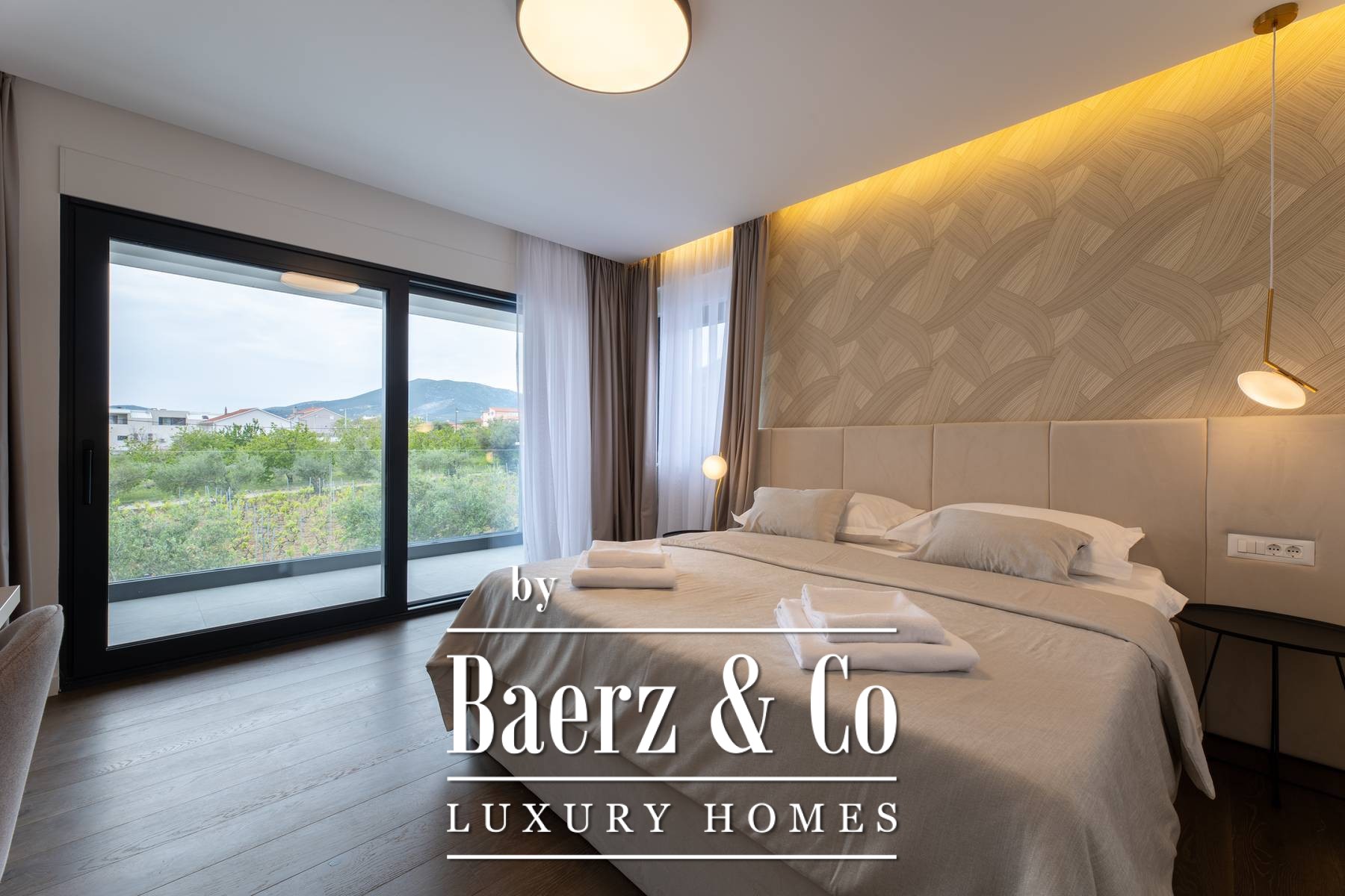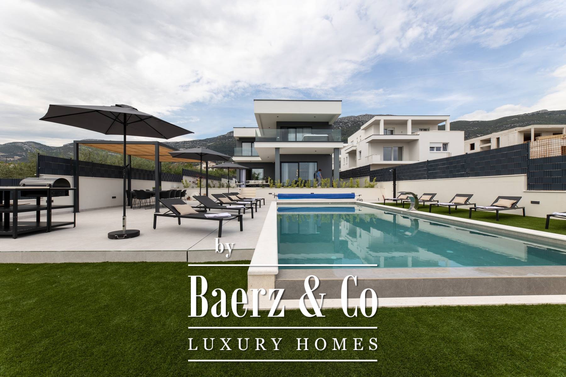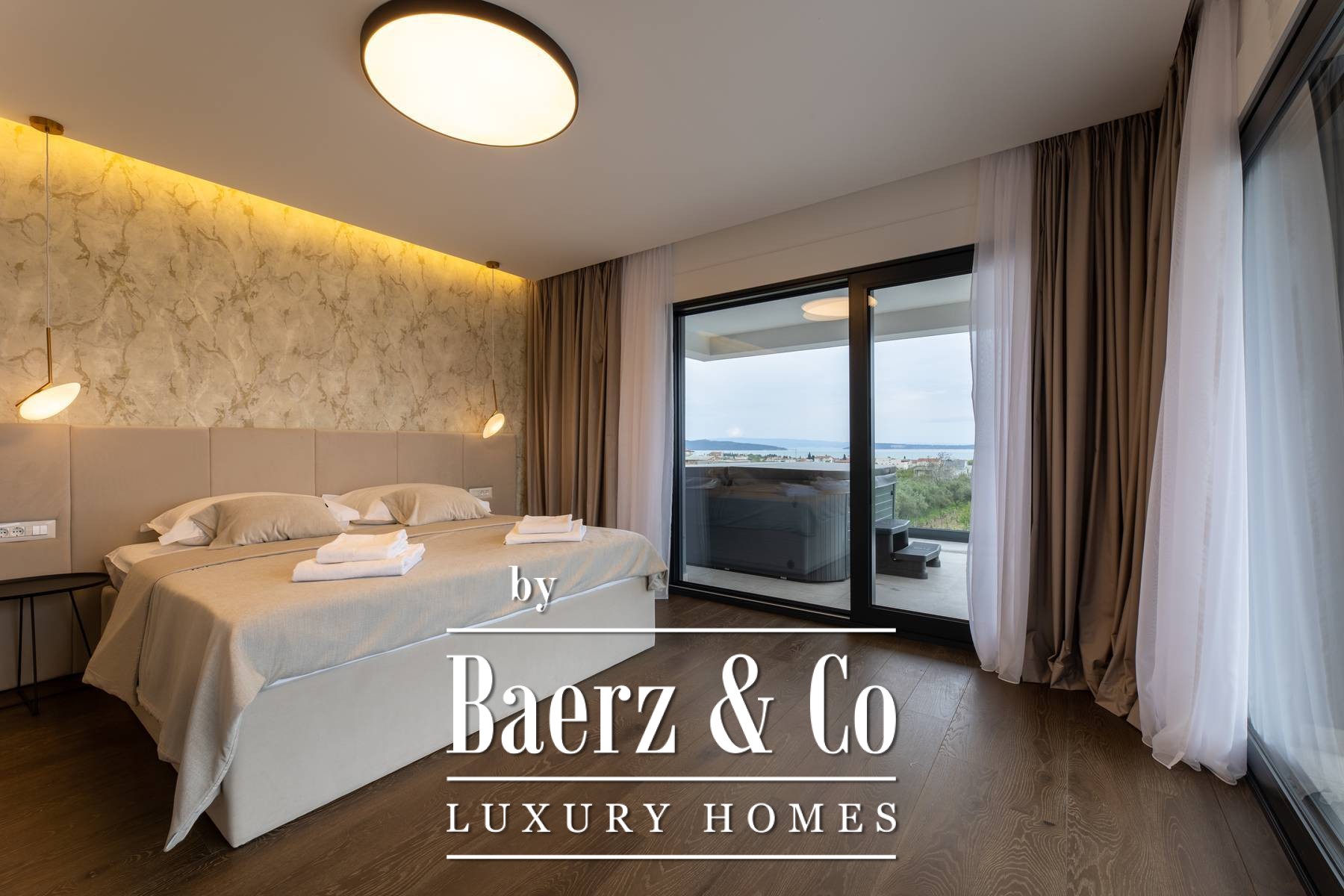Die Villa Kaštela mit Meer- und Inselblick verkörpert moderne Eleganz und Komfort. Diese Villa in Kaštela bietet auf zwei Ebenen 330 m² Wohnfläche und befindet sich auf einem abgeschiedenen Grundstück von 1.030 m². Das Erdgeschoss ist durchdacht gestaltet mit Technikraum, Abstellraum, Fitnessraum, Sauna, Bad, großzügigem Wohnbereich sowie einer Küche, die harmonisch in den Essbereich übergeht. Im Obergeschoss befinden sich fünf ruhige Schlafzimmer, jedes mit eigenem Bad und direktem Zugang zu einem Balkon oder einer Terrasse, wodurch mediterranes Tageslicht alle Räume durchströmt.