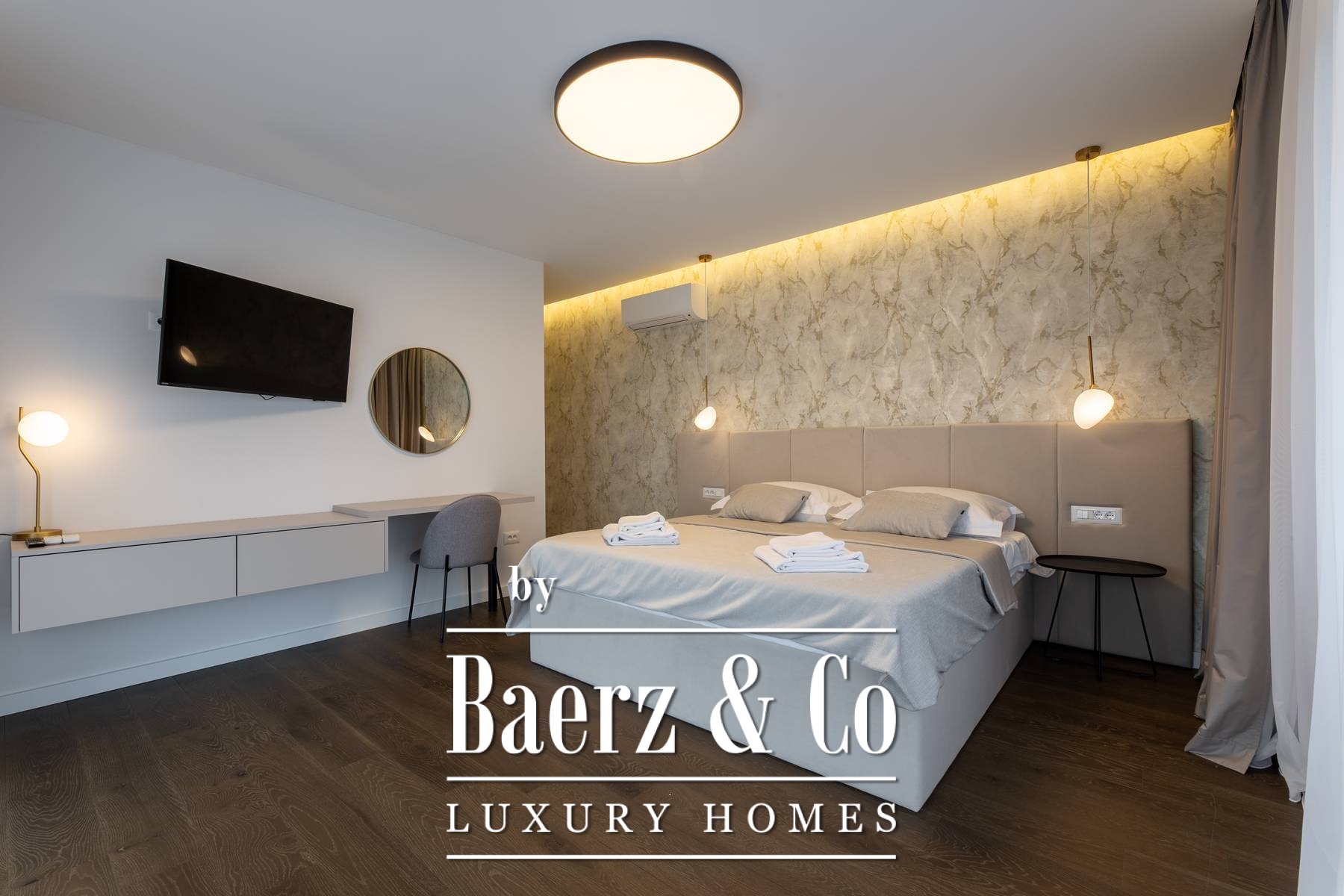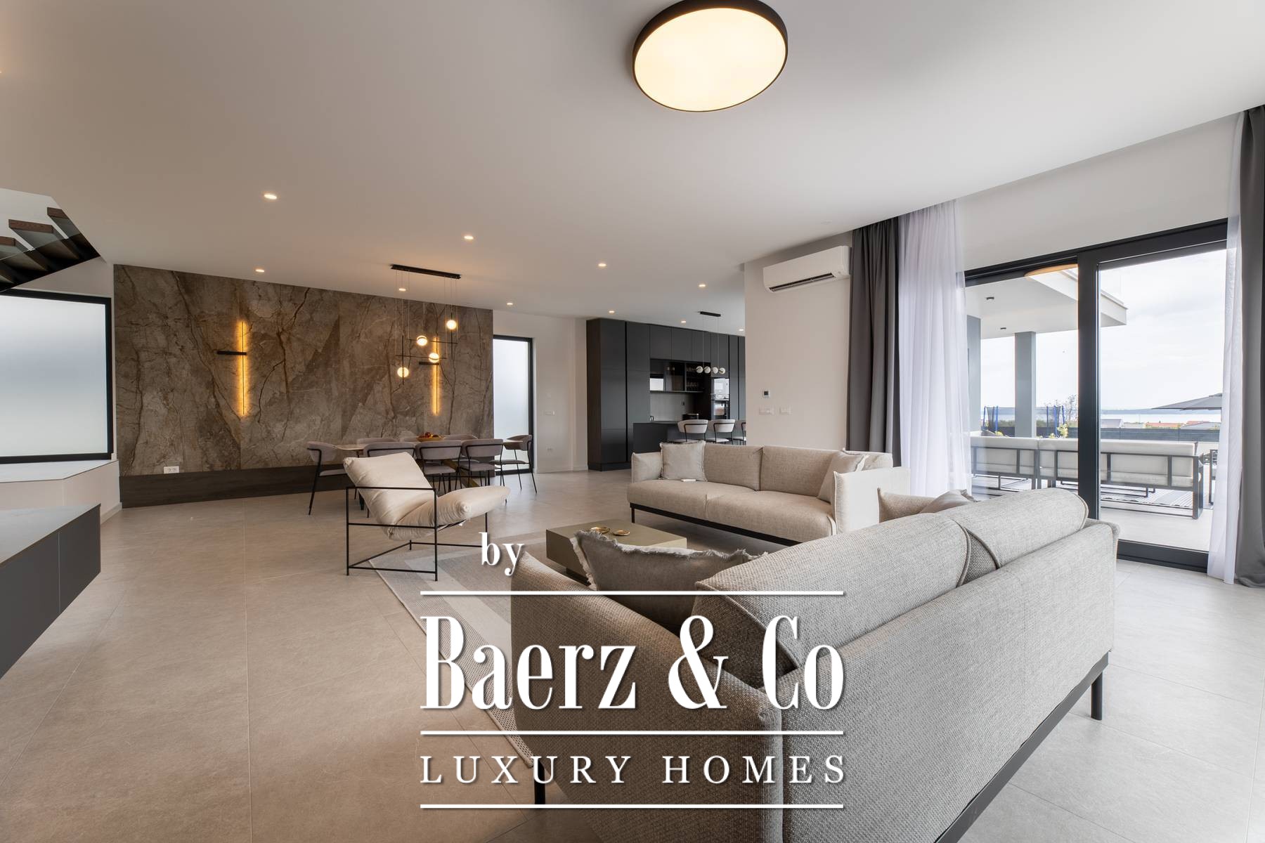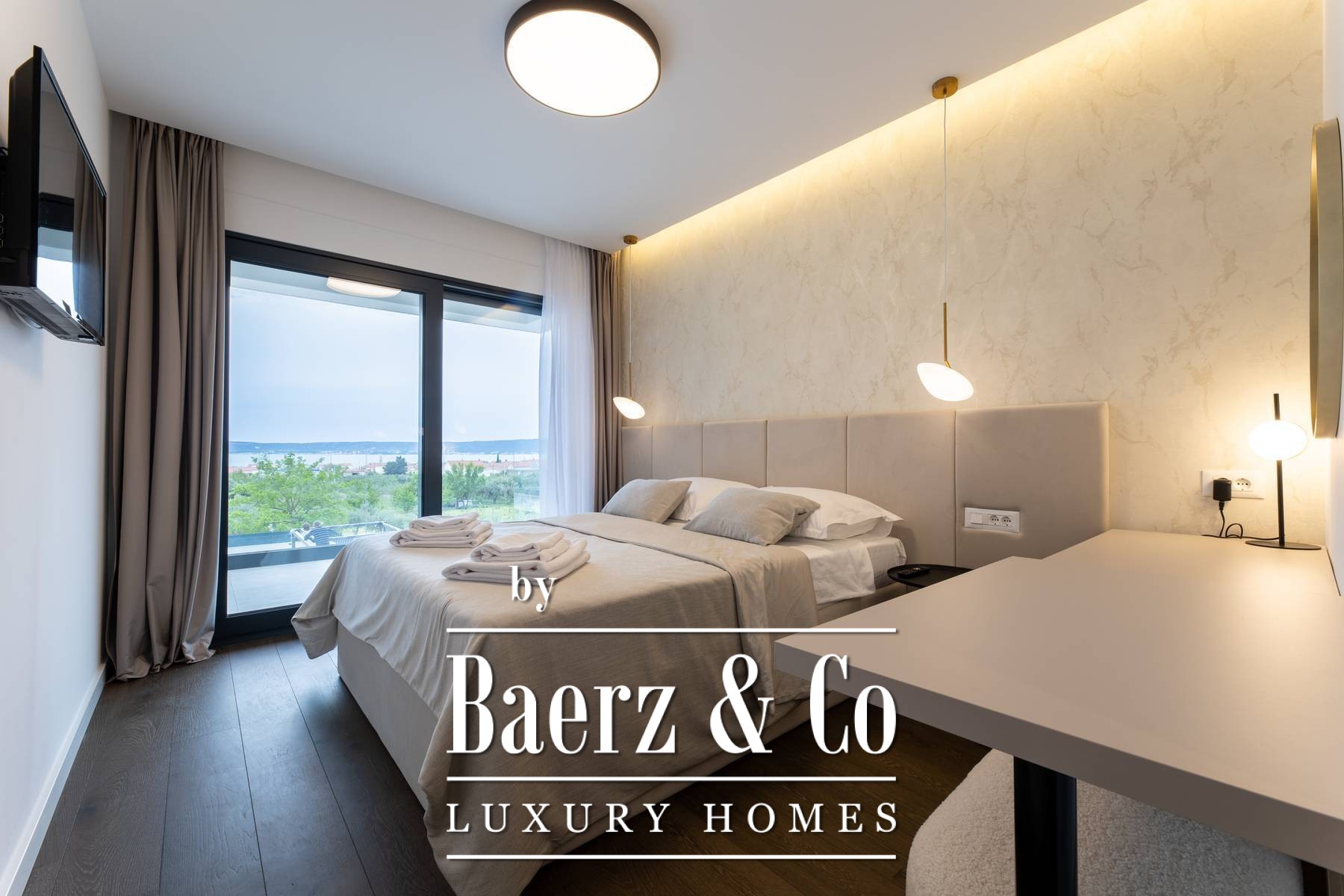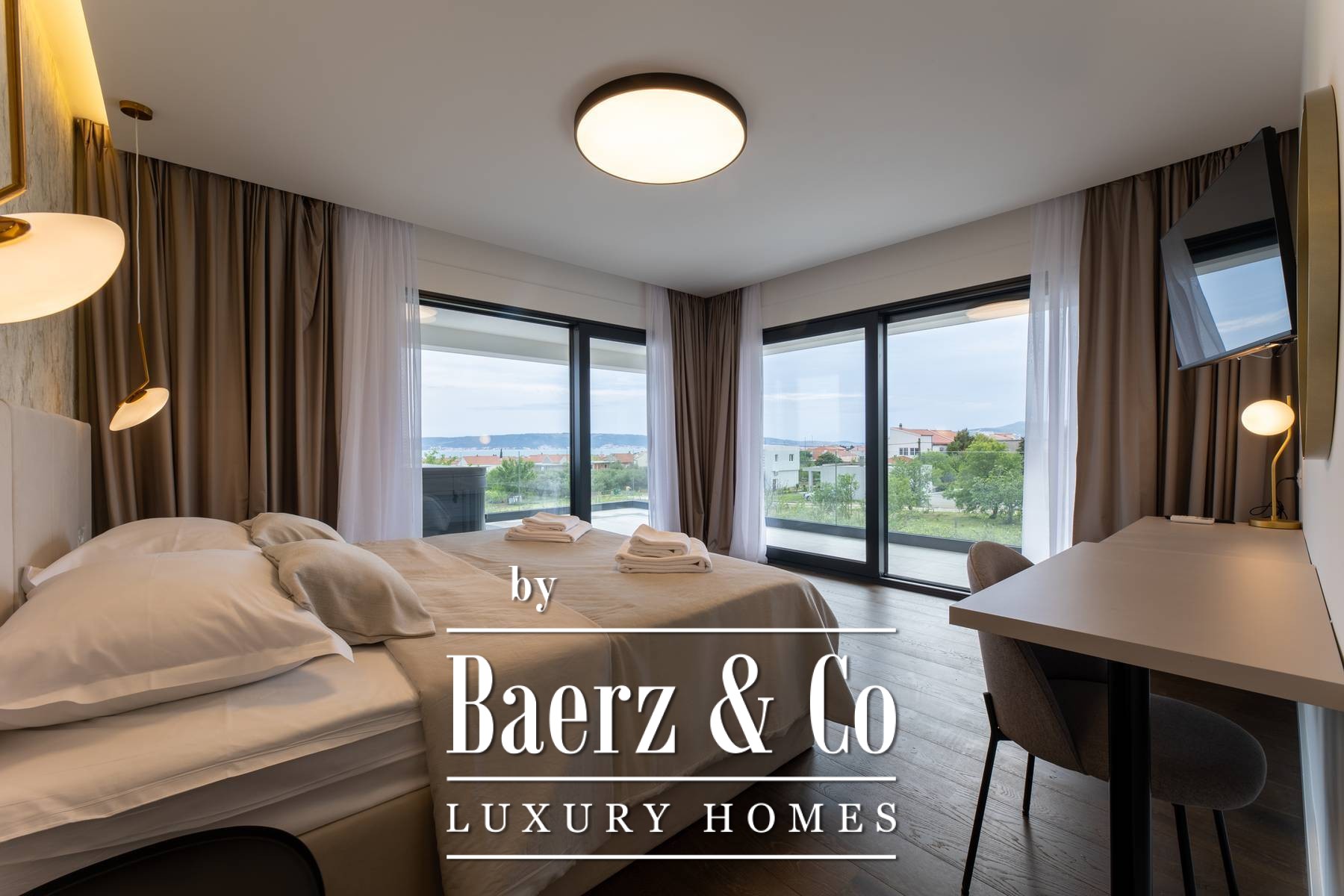 Die Villa Kaštela mit Meer- und Inselblick verkörpert moderne Eleganz und Komfort. Diese Villa in Kaštela bietet auf zwei Ebenen 330 m² Wohnfläche und befindet sich auf einem abgeschiedenen Grundstück von 1.030 m². Das Erdgeschoss ist durchdacht gestaltet mit Technikraum, Abstellraum, Fitnessraum, Sauna, Bad, großzügigem Wohnbereich sowie einer Küche, die harmonisch in den Essbereich übergeht. Im Obergeschoss befinden sich fünf ruhige Schlafzimmer, jedes mit eigenem Bad und direktem Zugang zu einem Balkon oder einer Terrasse, wodurch mediterranes Tageslicht alle Räume durchströmt.