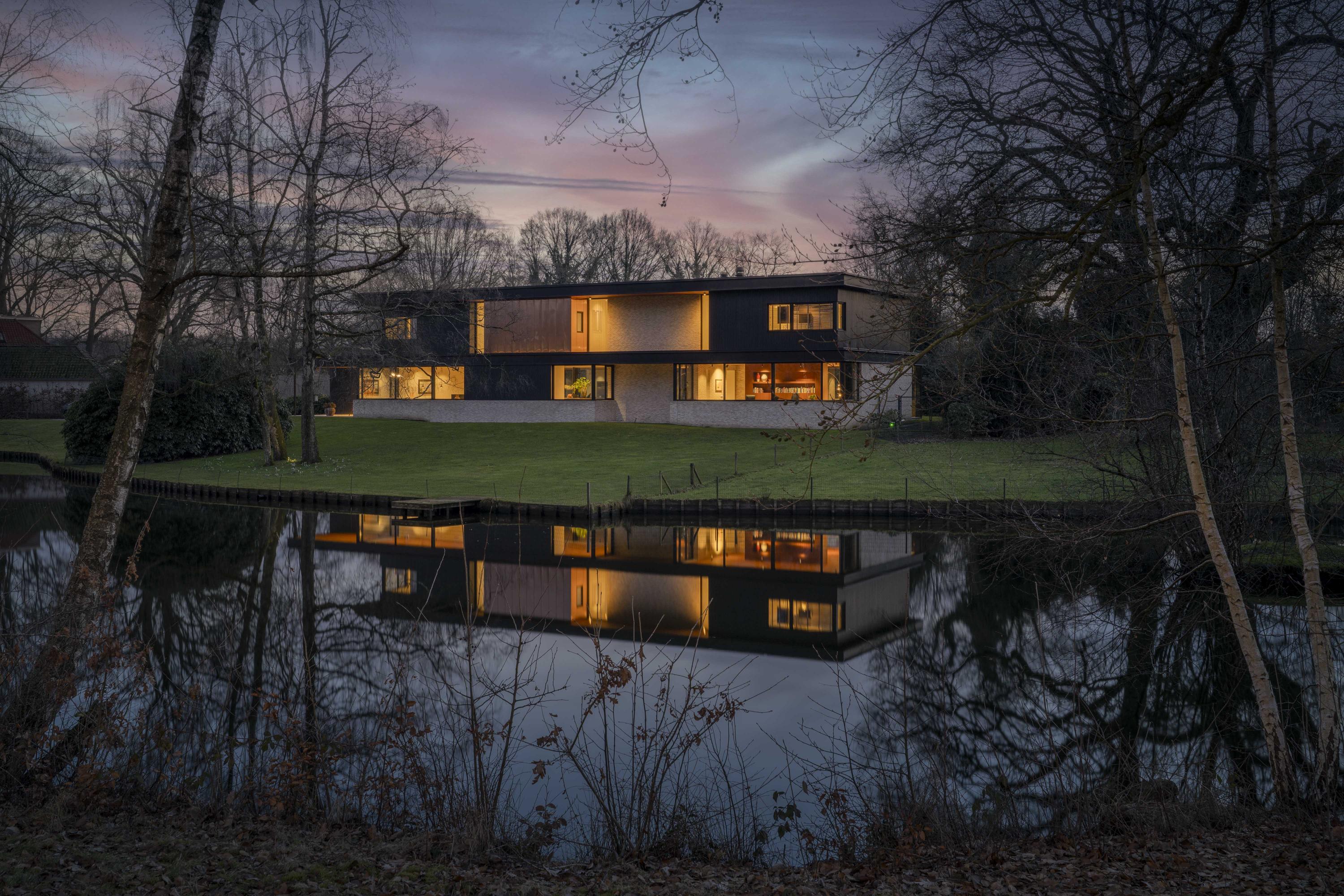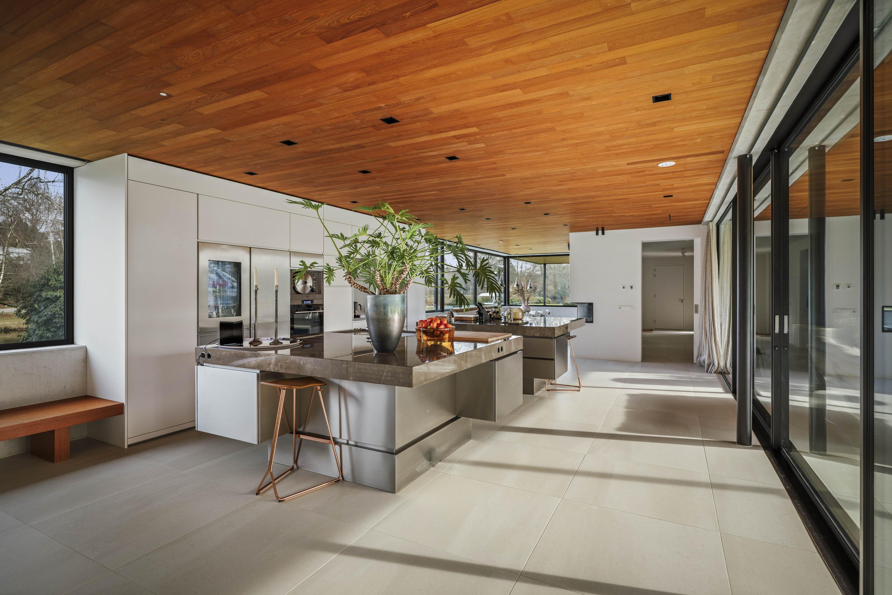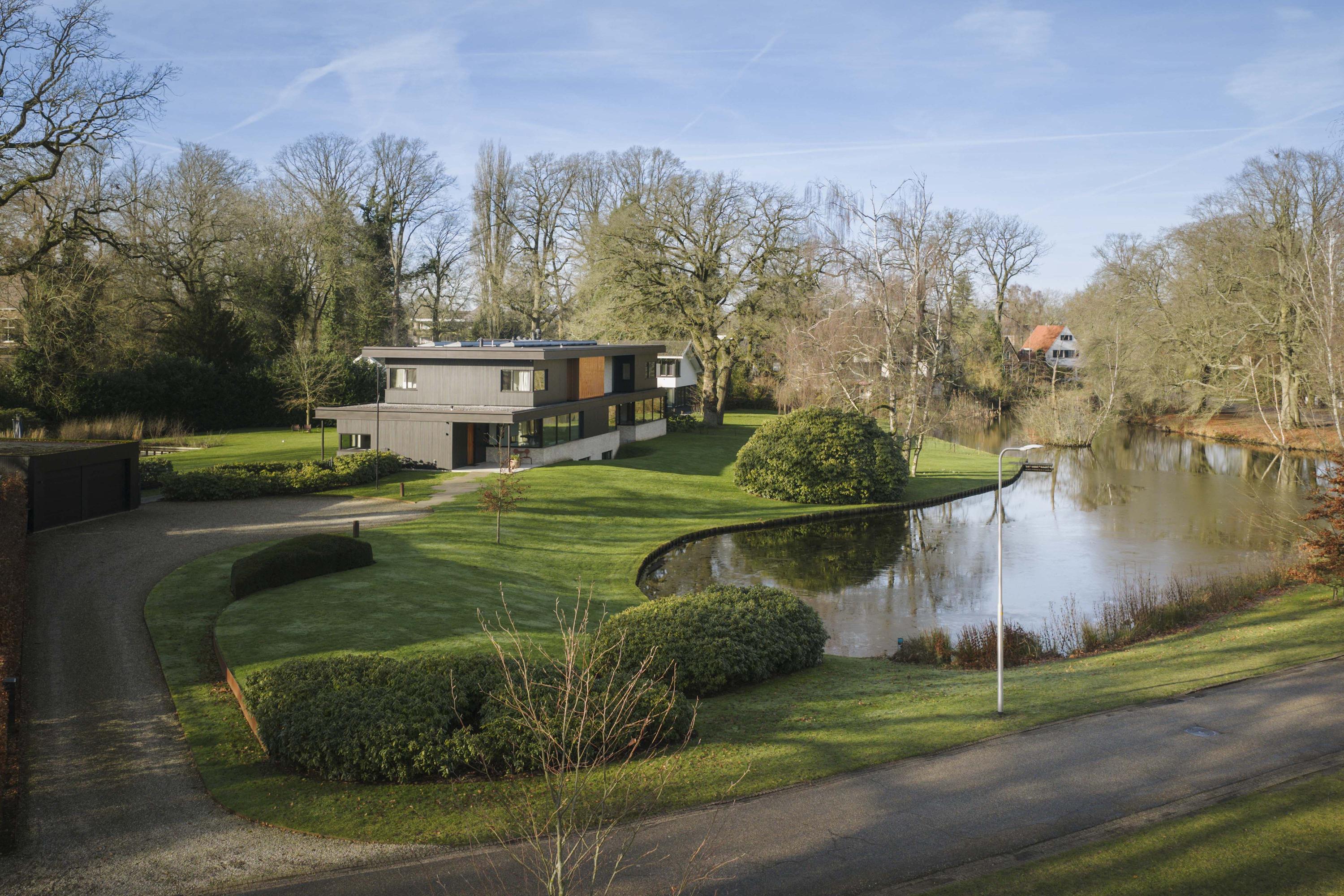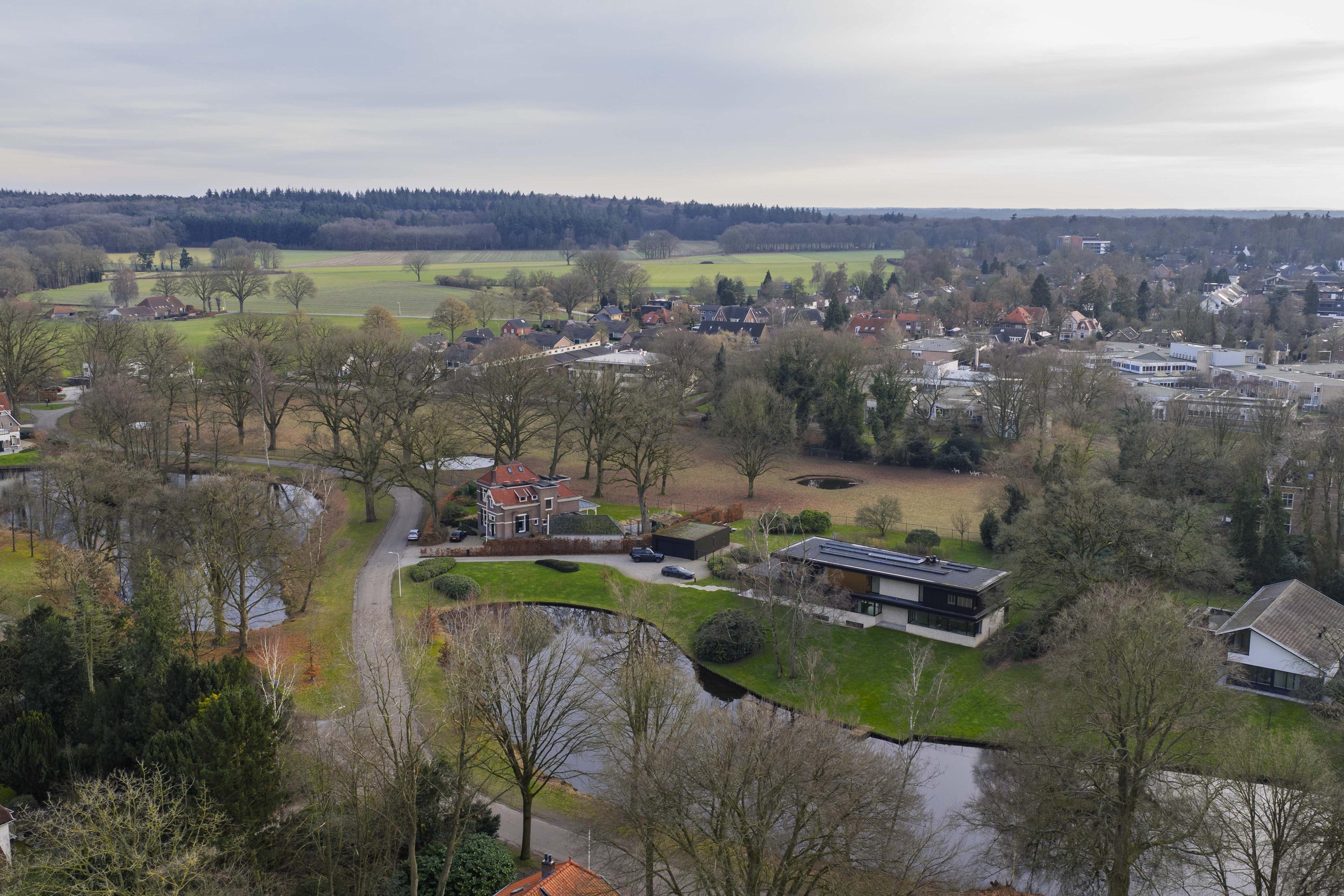 Villa zum Verkauf in Lochem Berkeloord, gelegen auf einem gestalteten Grundstück von 6.635 m², bietet eine seltene Balance aus zeitgenössischem Design und parkähnlicher Ruhe. 2019 nach den Plänen von Architekt Bart Vos erbaut, vereint dieses Familienhaus Transparenz mit Sicherheit, mit Blick auf die Teiche von Berkeloord an der Vorderseite und das Damwildgehege von Lochem im rückwärtigen Bereich. Auf drei Ebenen und 500 m² Wohnfläche bildet die lichtdurchflutete Küche mit 88 m² das Herzstück – nahtlos verbunden mit einer überdachten Terrasse, ausgestattet mit einem Outdoor-Kamin von Metalfire. Travertinfarbene Mosa-Böden und geölte Teakholzdecken spenden dezente, haptische Wärme, bodentiefe Fenster sorgen für einen steten Dialog mit Garten und natürlichem Licht.