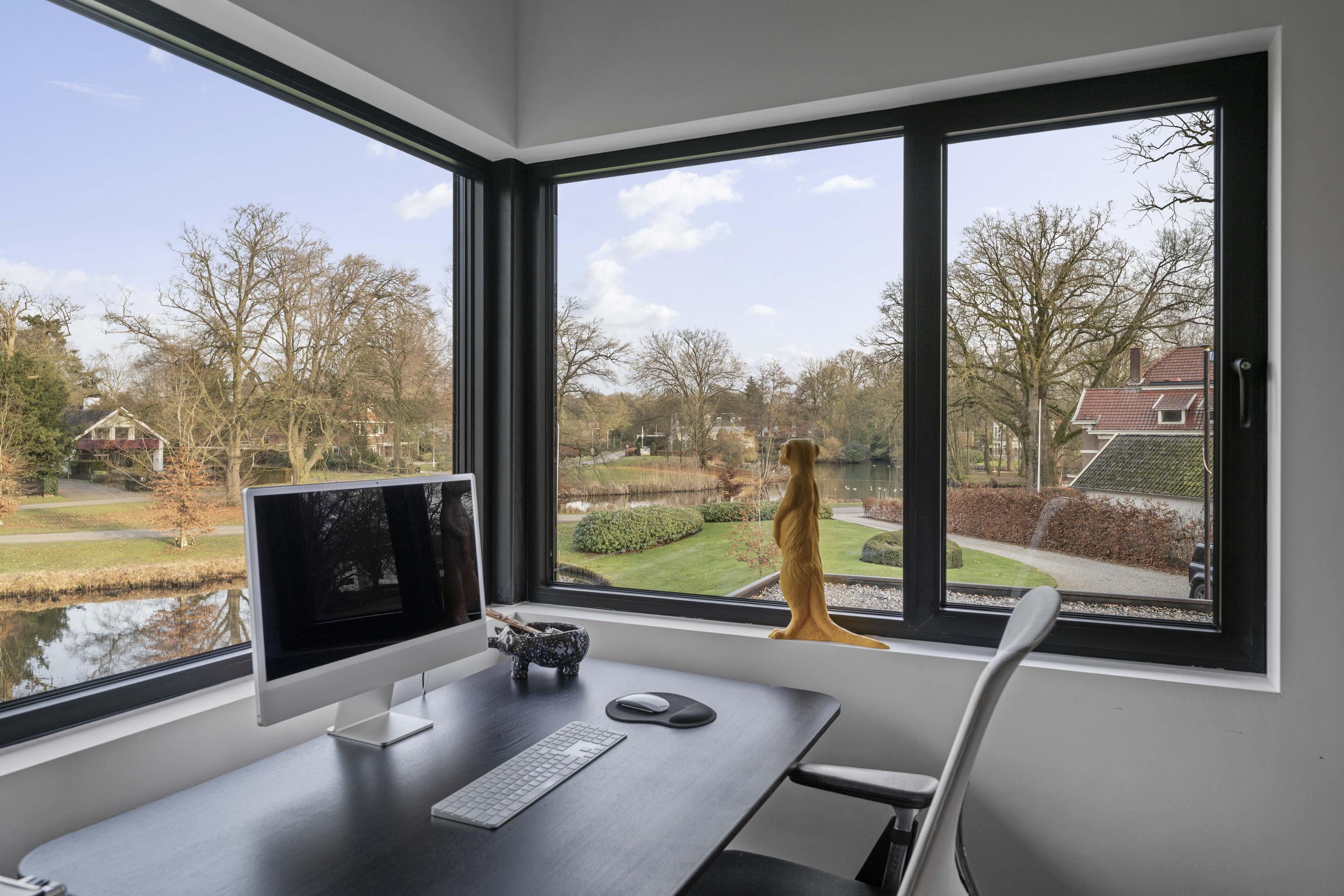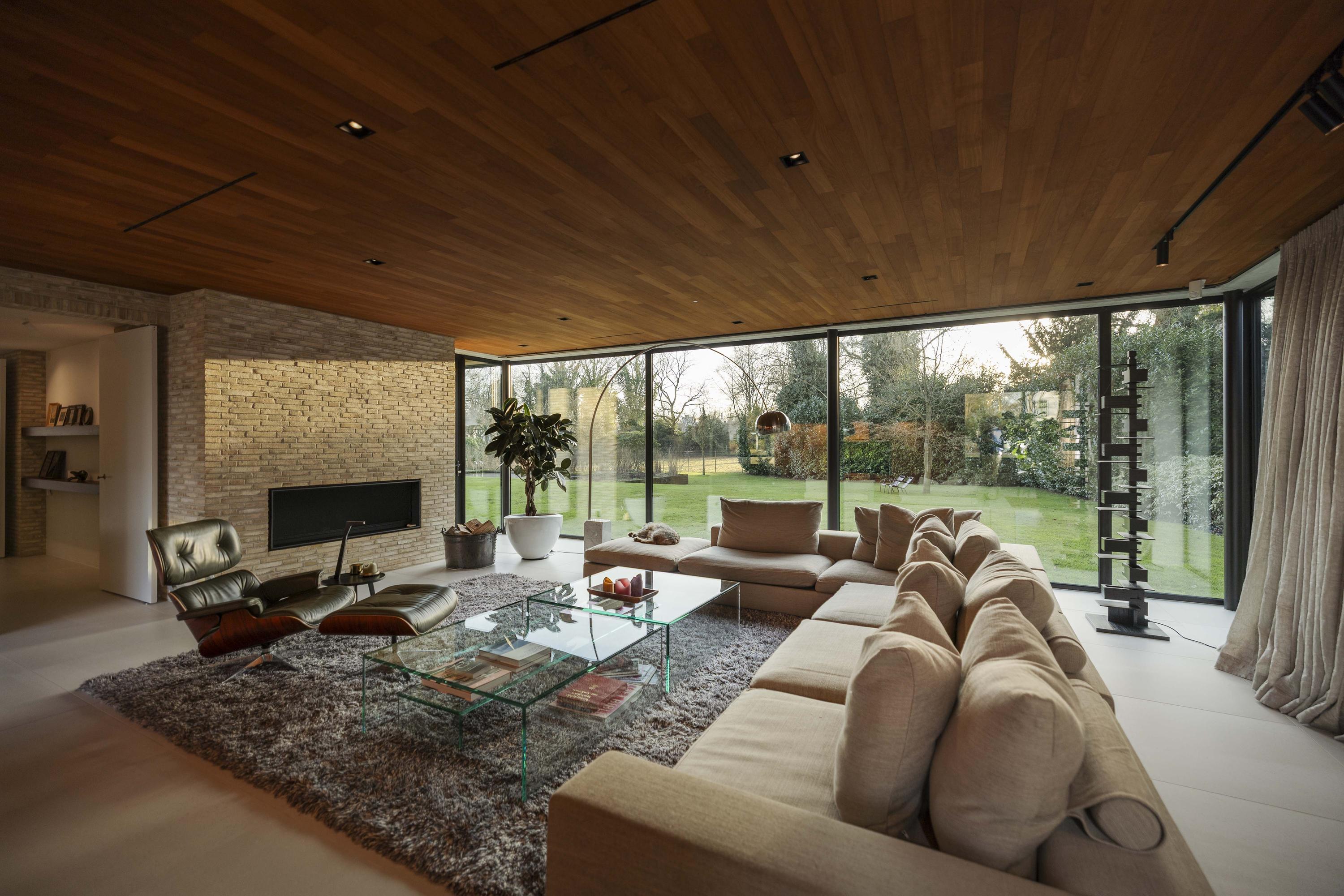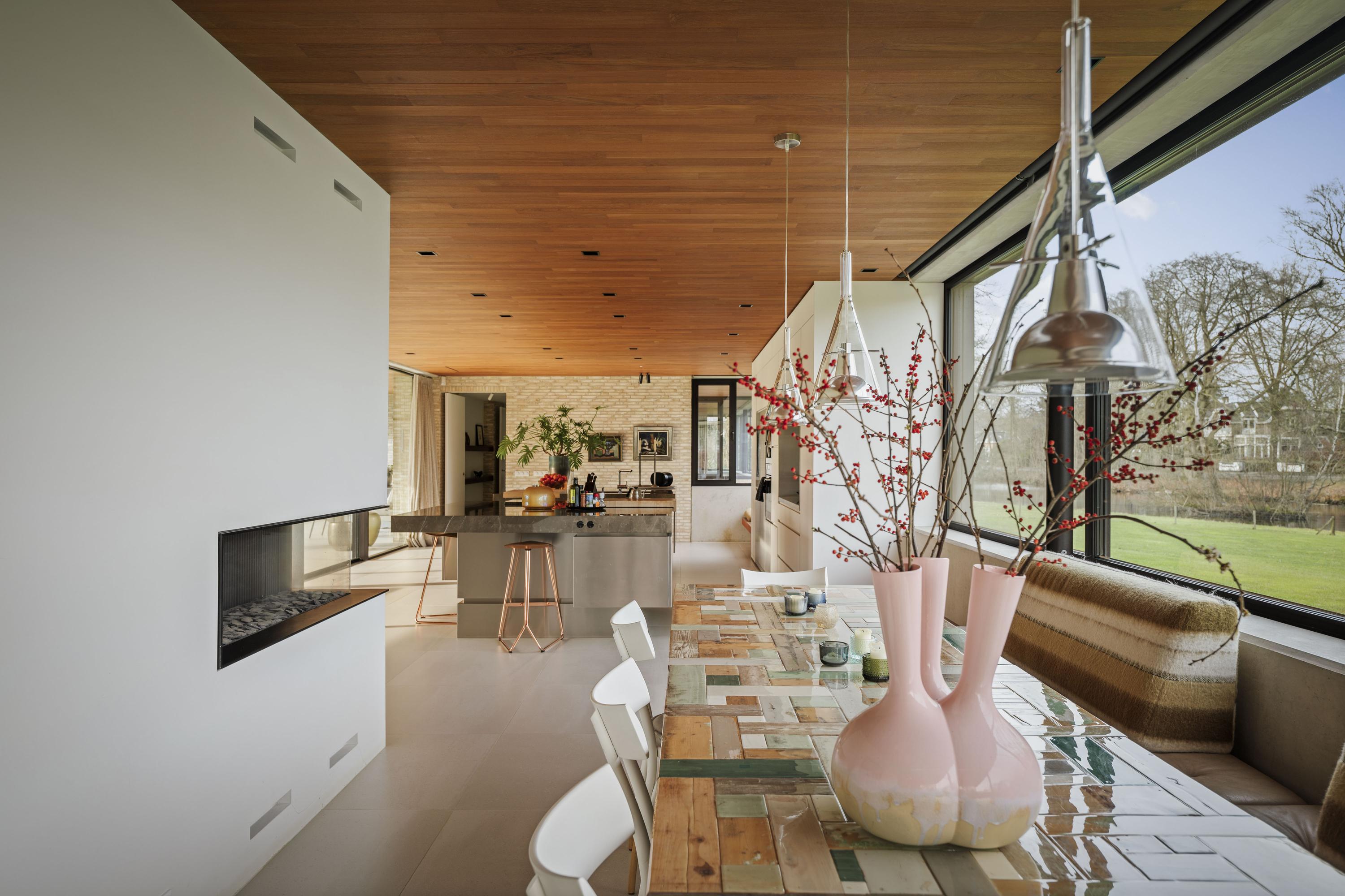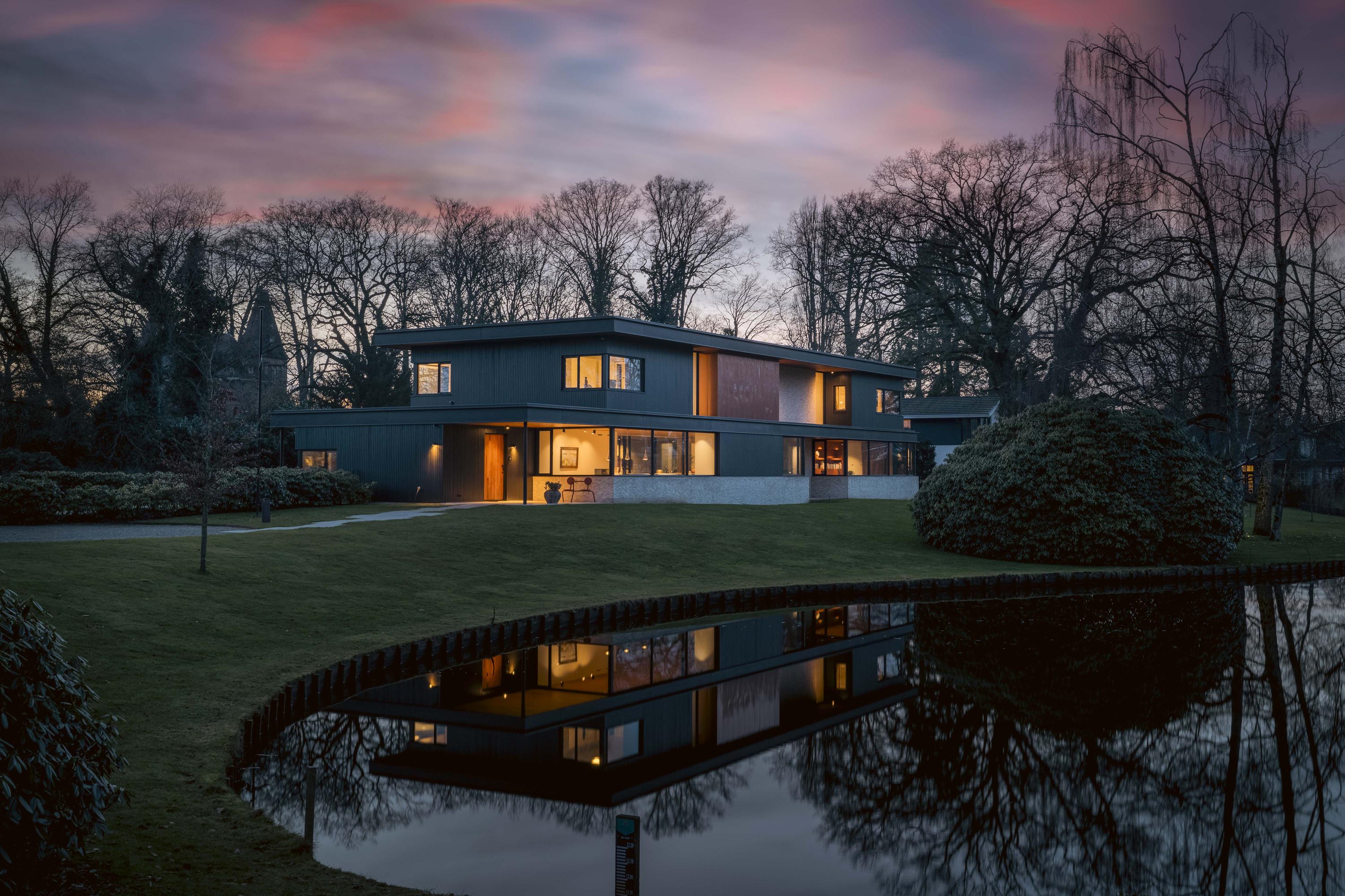 Villa zum Verkauf in Lochem Berkeloord, gelegen auf einem gestalteten Grundstück von 6.635 m², bietet eine seltene Balance aus zeitgenössischem Design und parkähnlicher Ruhe. 2019 nach den Plänen von Architekt Bart Vos erbaut, vereint dieses Familienhaus Transparenz mit Sicherheit, mit Blick auf die Teiche von Berkeloord an der Vorderseite und das Damwildgehege von Lochem im rückwärtigen Bereich. Auf drei Ebenen und 500 m² Wohnfläche bildet die lichtdurchflutete Küche mit 88 m² das Herzstück – nahtlos verbunden mit einer überdachten Terrasse, ausgestattet mit einem Outdoor-Kamin von Metalfire. Travertinfarbene Mosa-Böden und geölte Teakholzdecken spenden dezente, haptische Wärme, bodentiefe Fenster sorgen für einen steten Dialog mit Garten und natürlichem Licht.