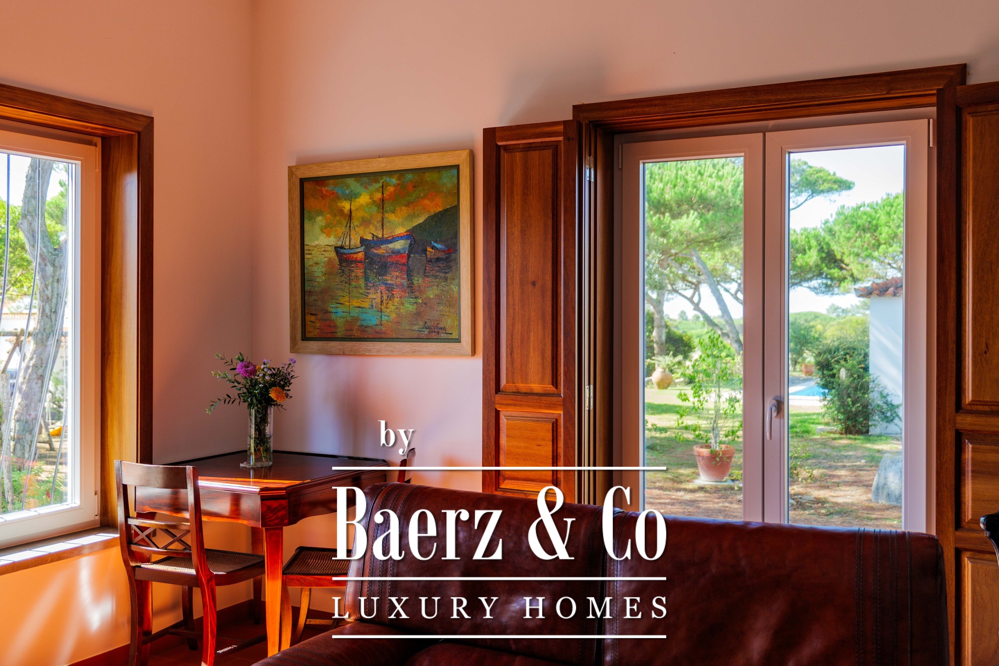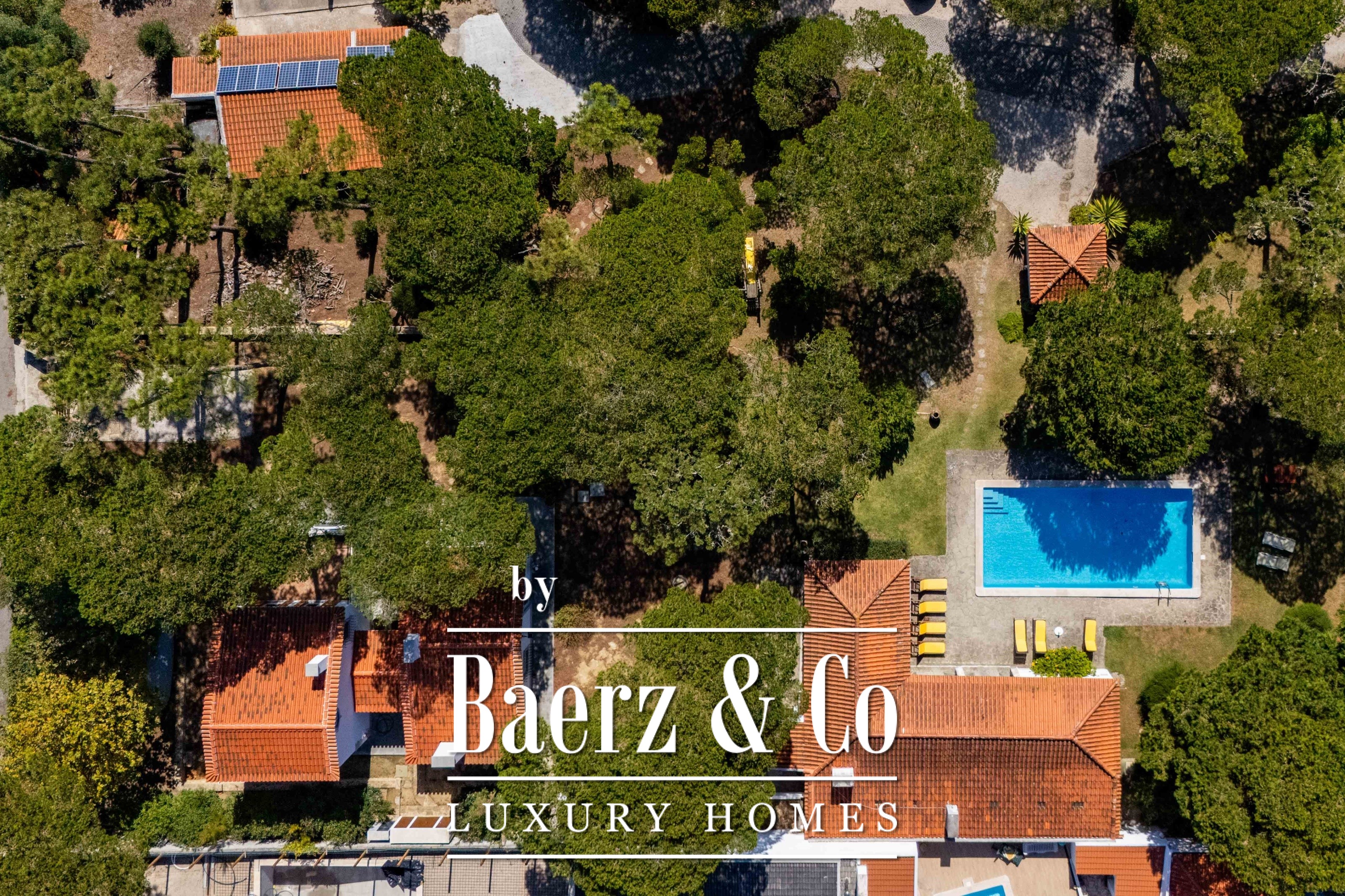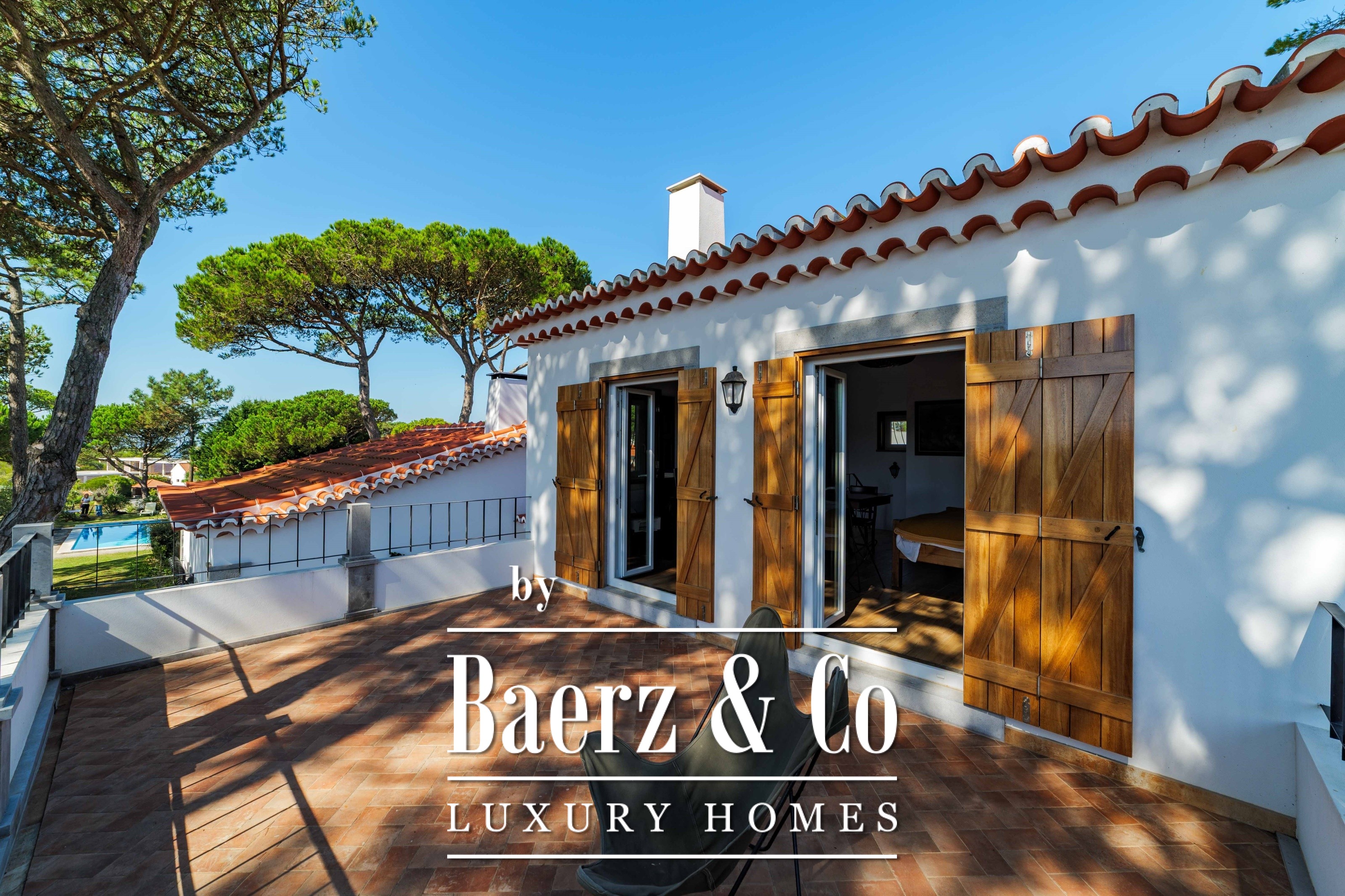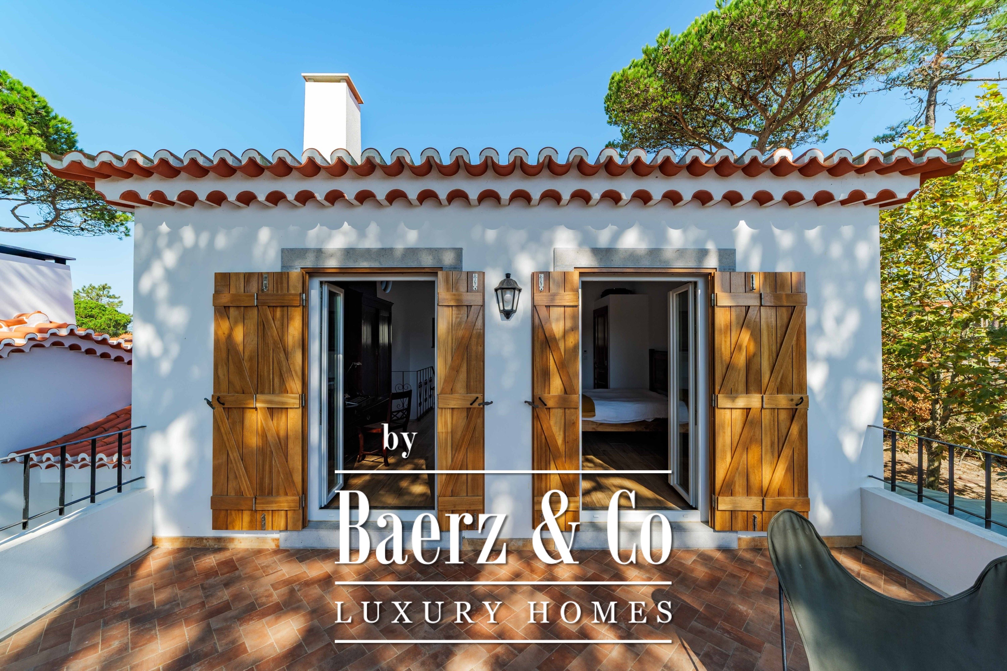 Die Hauptresidenz erstreckt sich über zwei Etagen und 302 m² und wurde 2023 mit besonderem Augenmerk auf authentische Materialien fertiggestellt: exotische Hölzer, edler Stein, traditionelle Tonziegel-Dächer und handgefertigte Schmiedeeisen-Details. Sonnenlicht von Ost bis West füllt die wohlproportionierten Räume—großzügige Wohnbereiche mit Kamin, eine voll ausgestattete Küche mit Zugang zum Garten, private Suiten und Terrassen mit ruhigem Blick auf die Hügel von Sintra und den Atlantik.