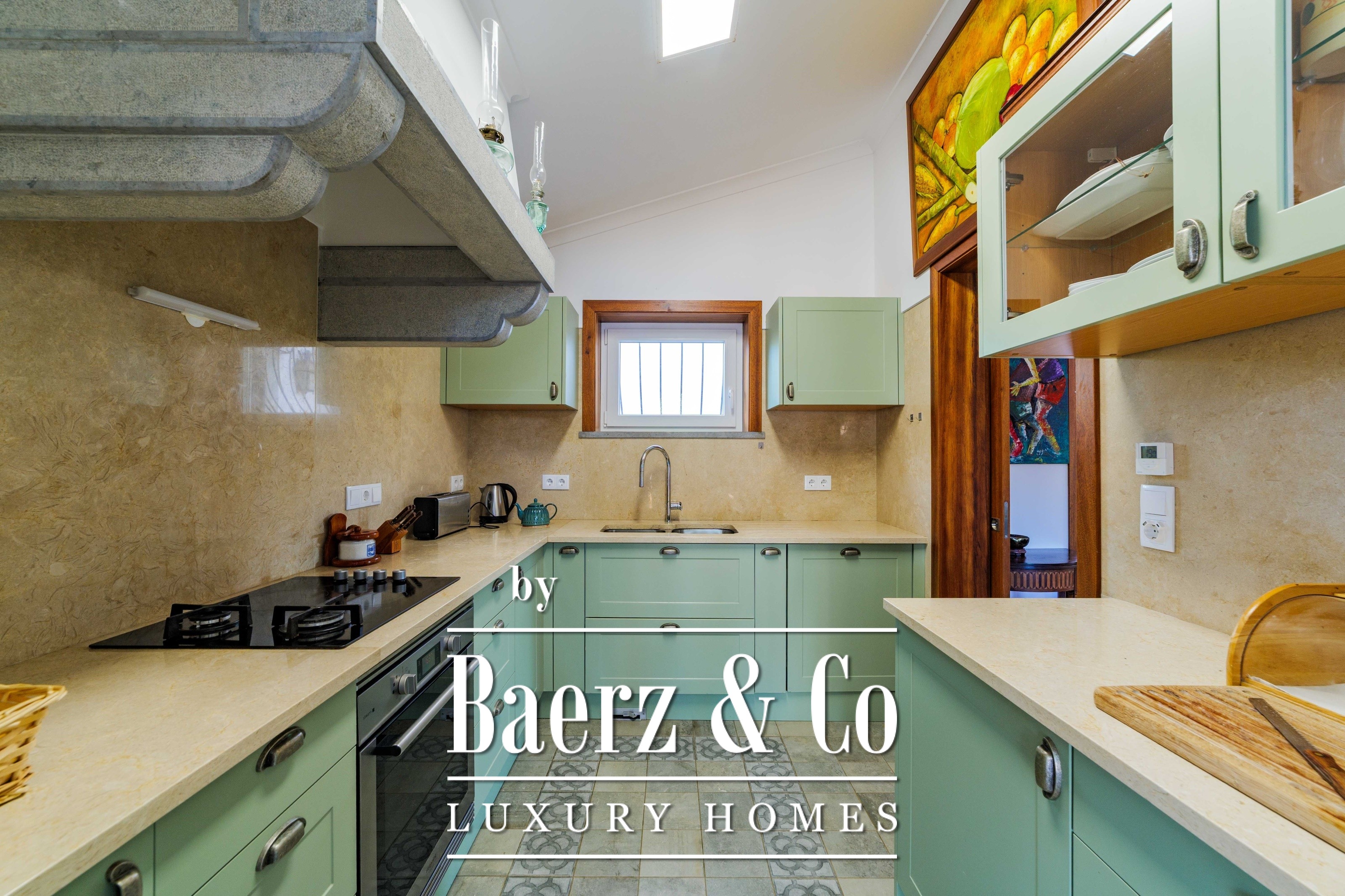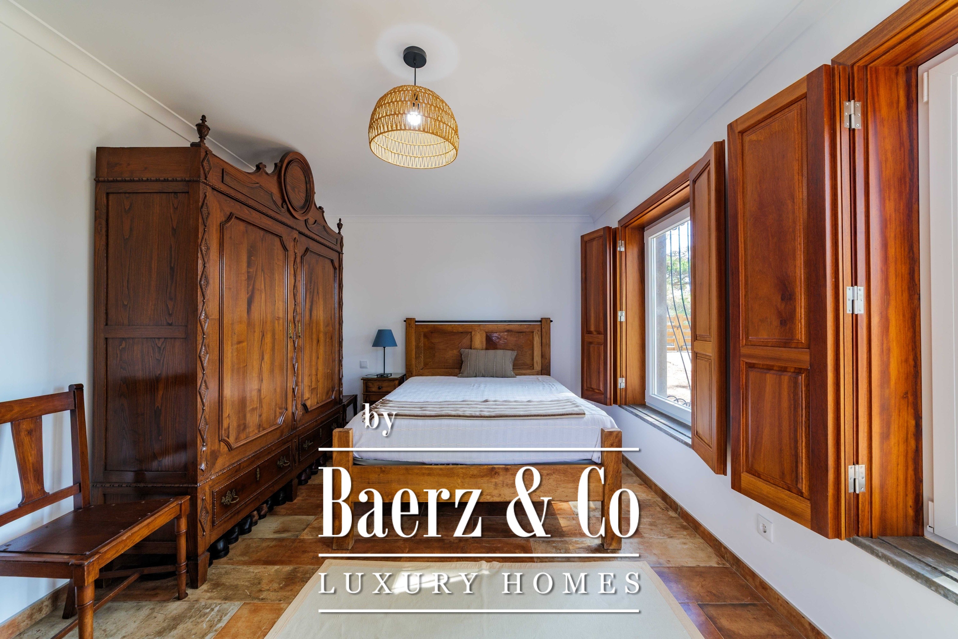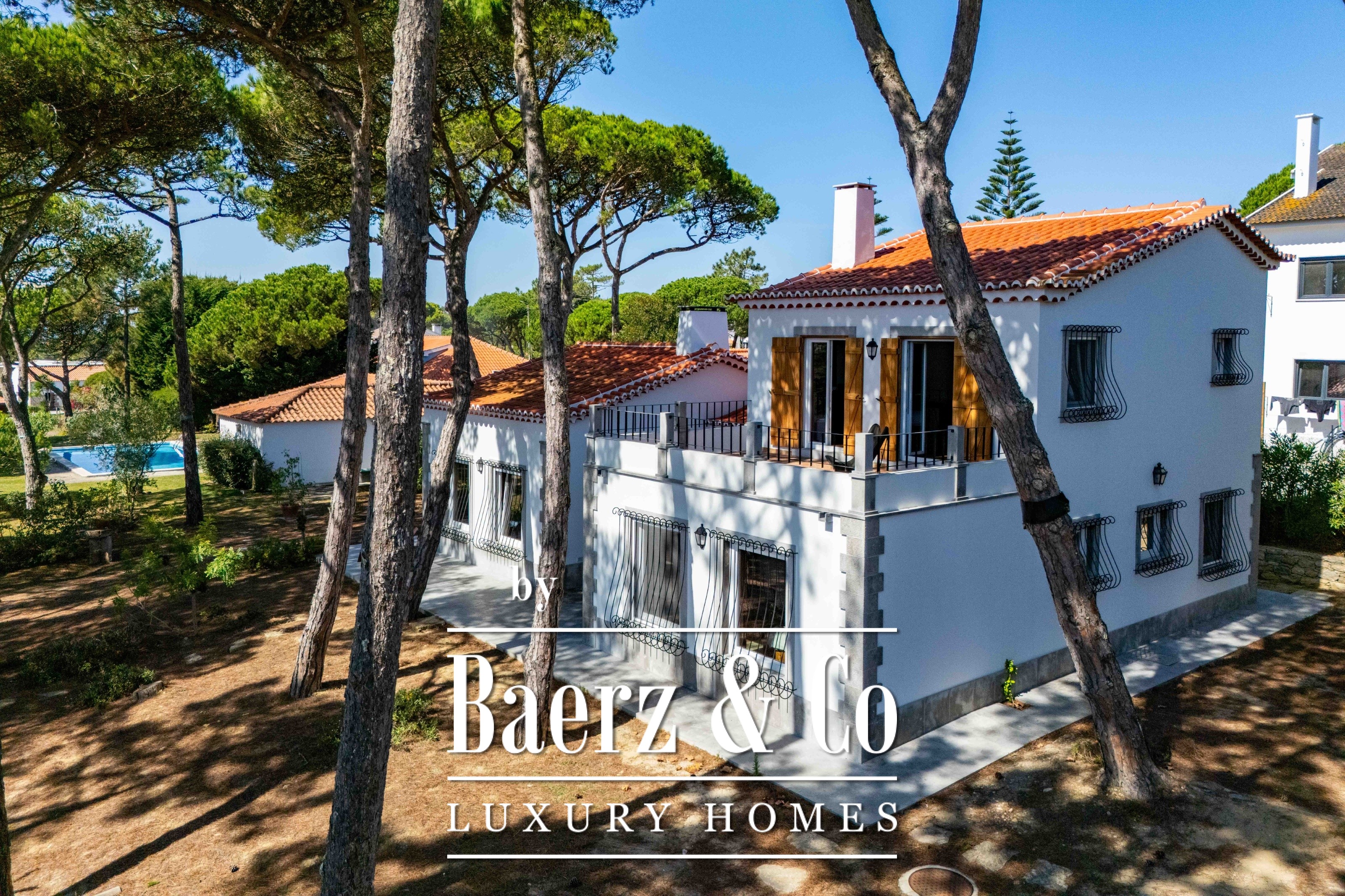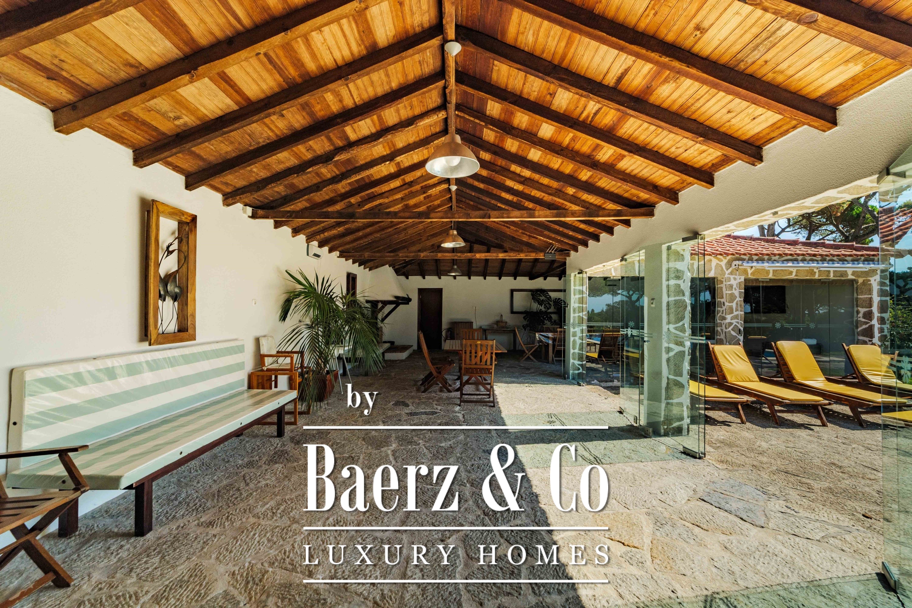 Die Hauptresidenz erstreckt sich über zwei Etagen und 302 m² und wurde 2023 mit besonderem Augenmerk auf authentische Materialien fertiggestellt: exotische Hölzer, edler Stein, traditionelle Tonziegel-Dächer und handgefertigte Schmiedeeisen-Details. Sonnenlicht von Ost bis West füllt die wohlproportionierten Räume—großzügige Wohnbereiche mit Kamin, eine voll ausgestattete Küche mit Zugang zum Garten, private Suiten und Terrassen mit ruhigem Blick auf die Hügel von Sintra und den Atlantik.