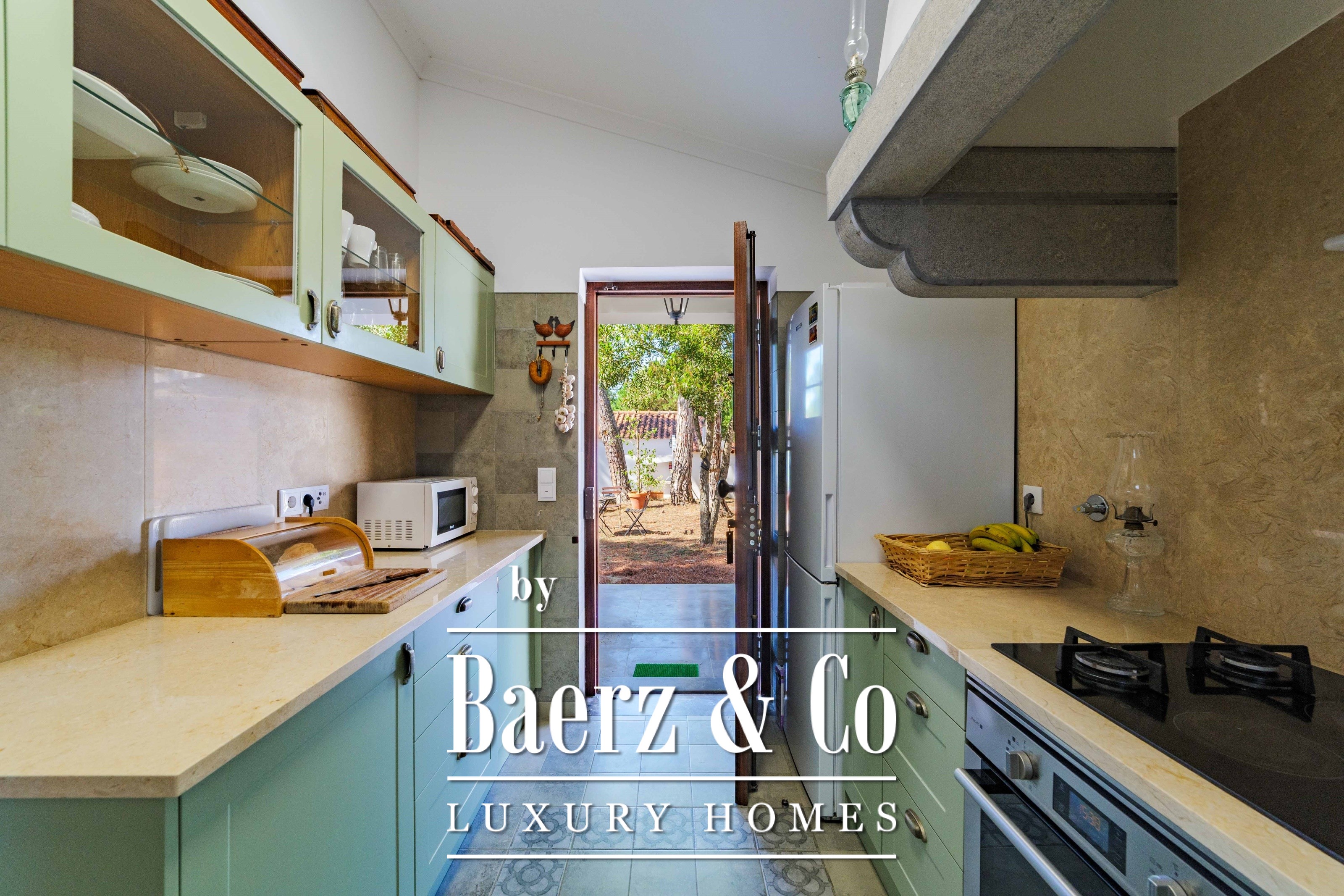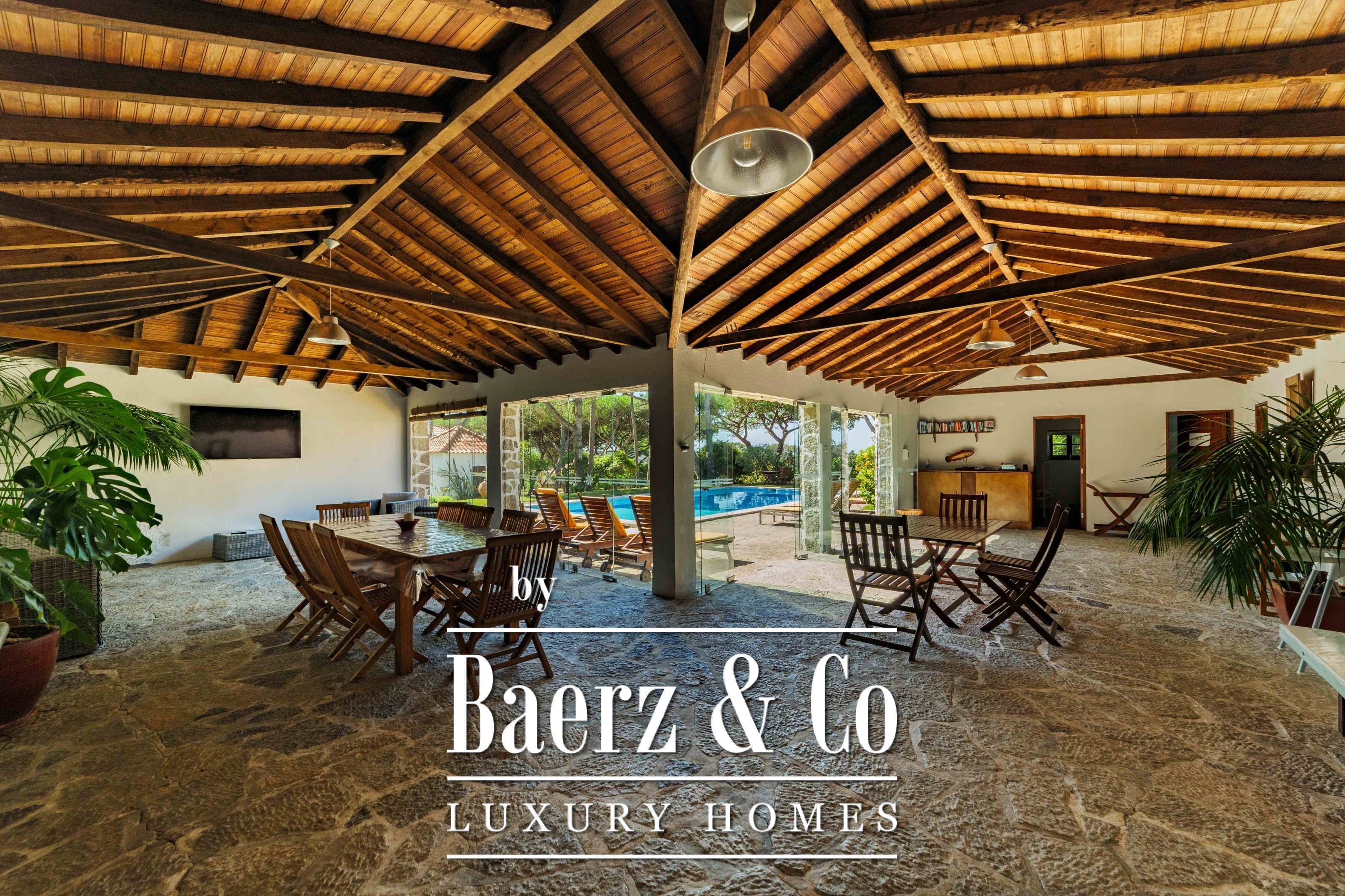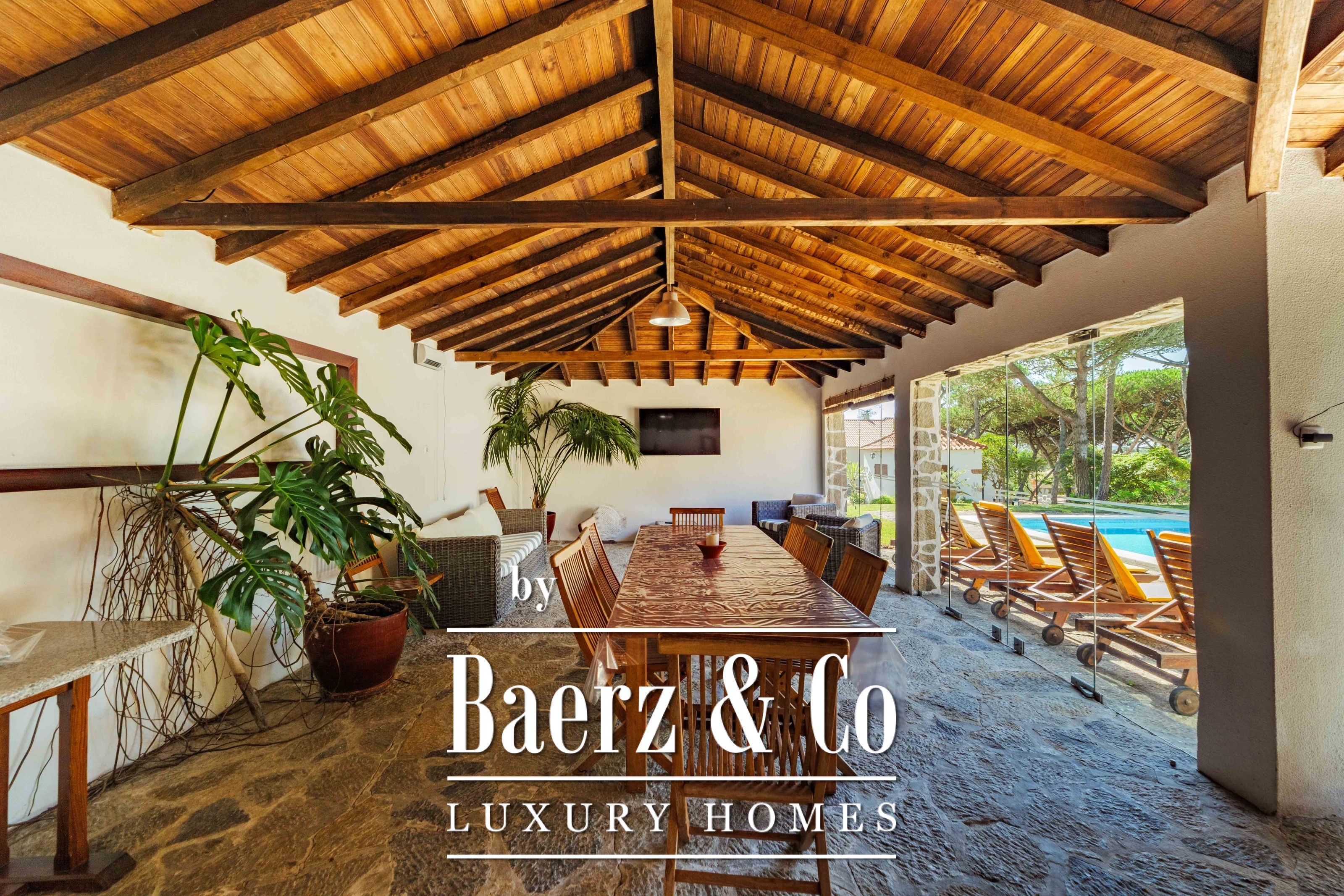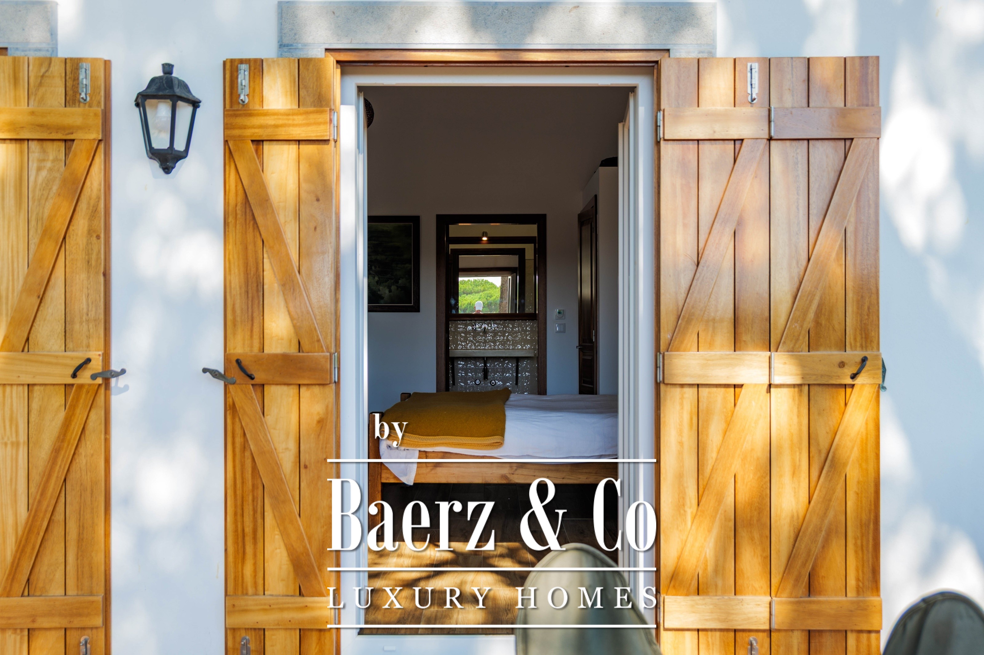 Die Hauptresidenz erstreckt sich über zwei Etagen und 302 m² und wurde 2023 mit besonderem Augenmerk auf authentische Materialien fertiggestellt: exotische Hölzer, edler Stein, traditionelle Tonziegel-Dächer und handgefertigte Schmiedeeisen-Details. Sonnenlicht von Ost bis West füllt die wohlproportionierten Räume—großzügige Wohnbereiche mit Kamin, eine voll ausgestattete Küche mit Zugang zum Garten, private Suiten und Terrassen mit ruhigem Blick auf die Hügel von Sintra und den Atlantik.