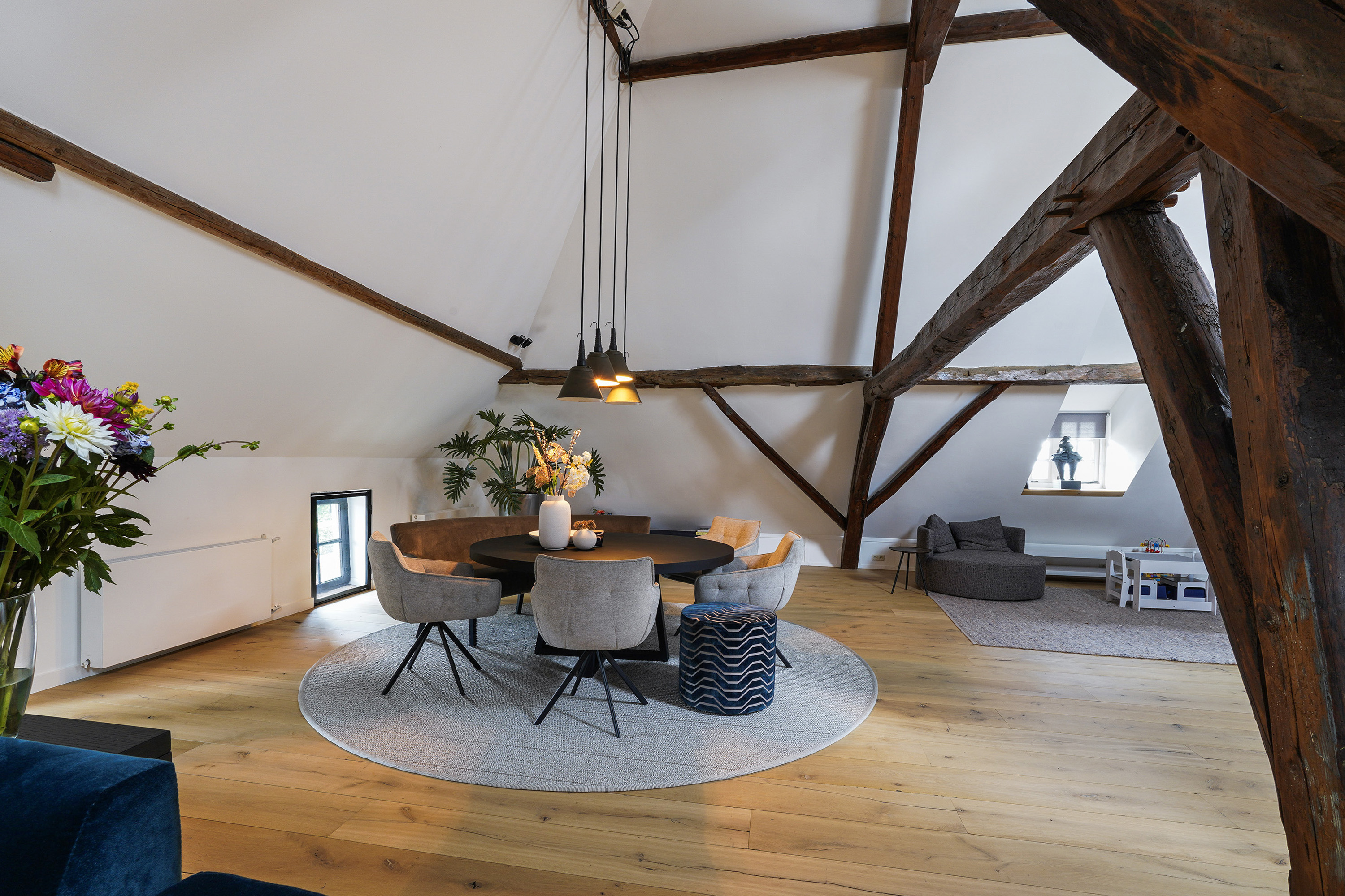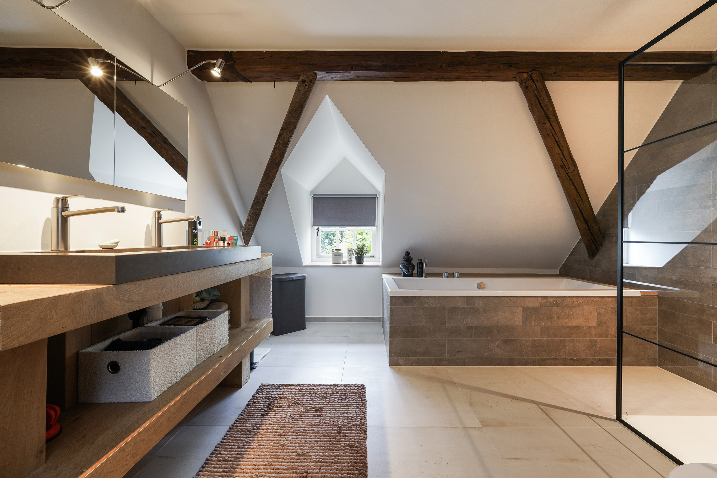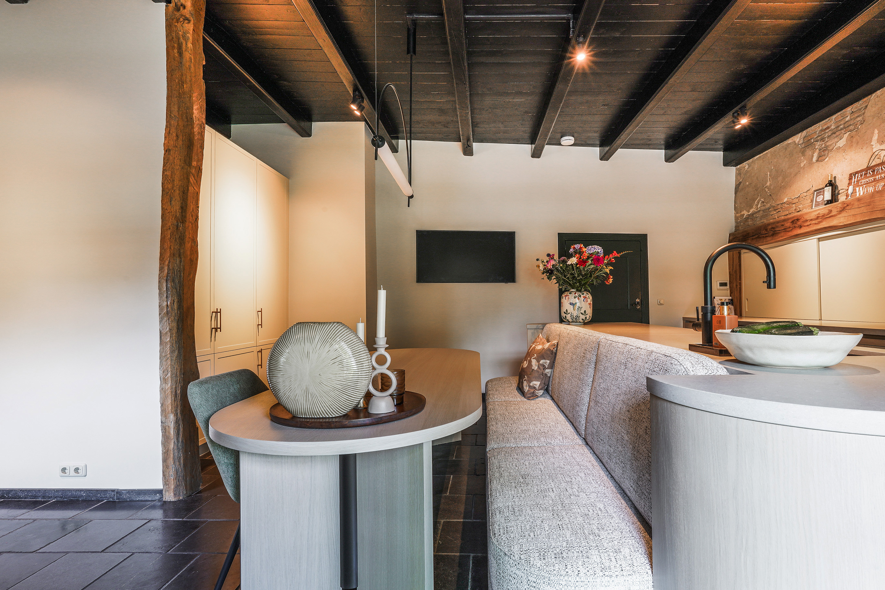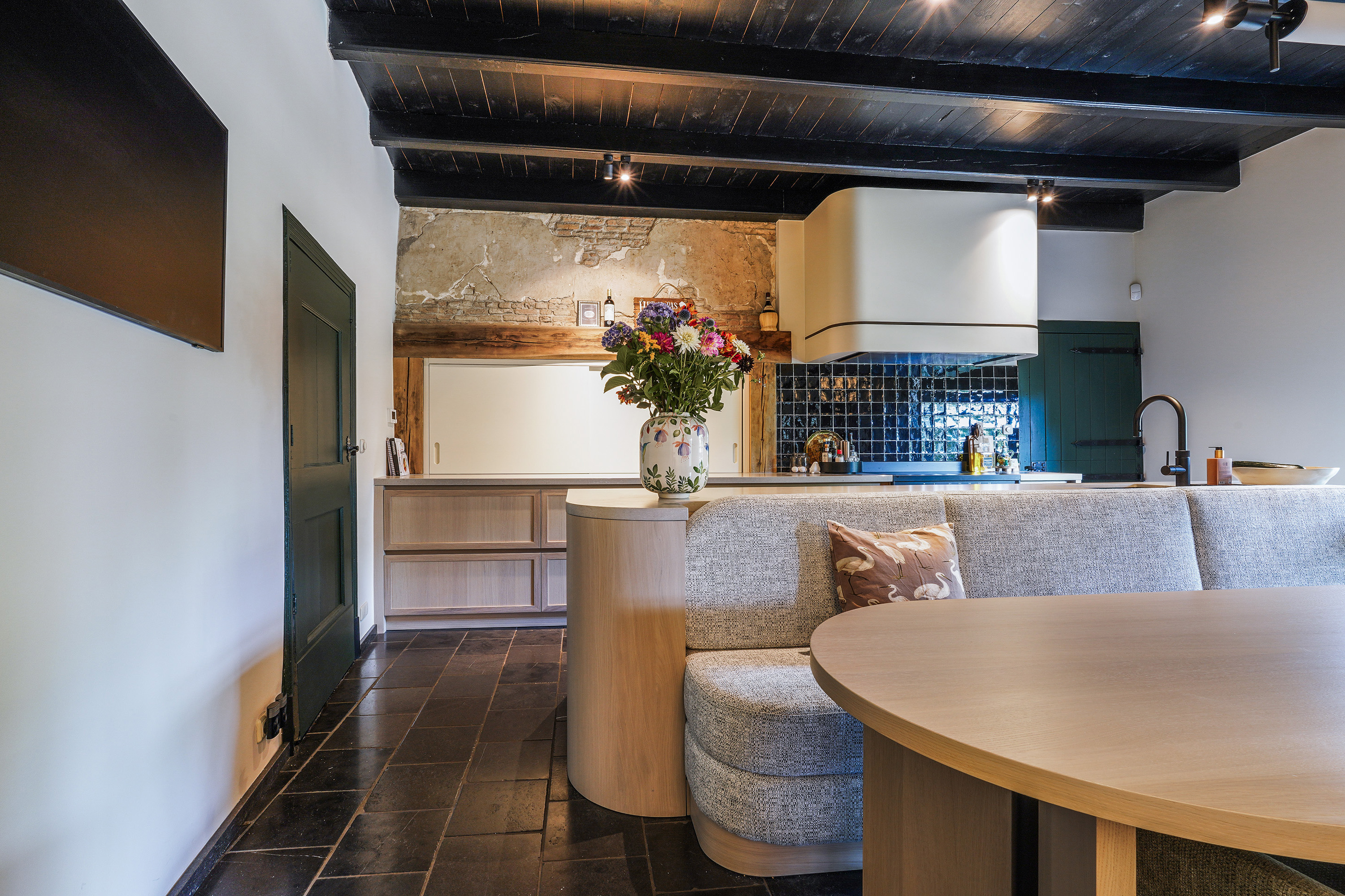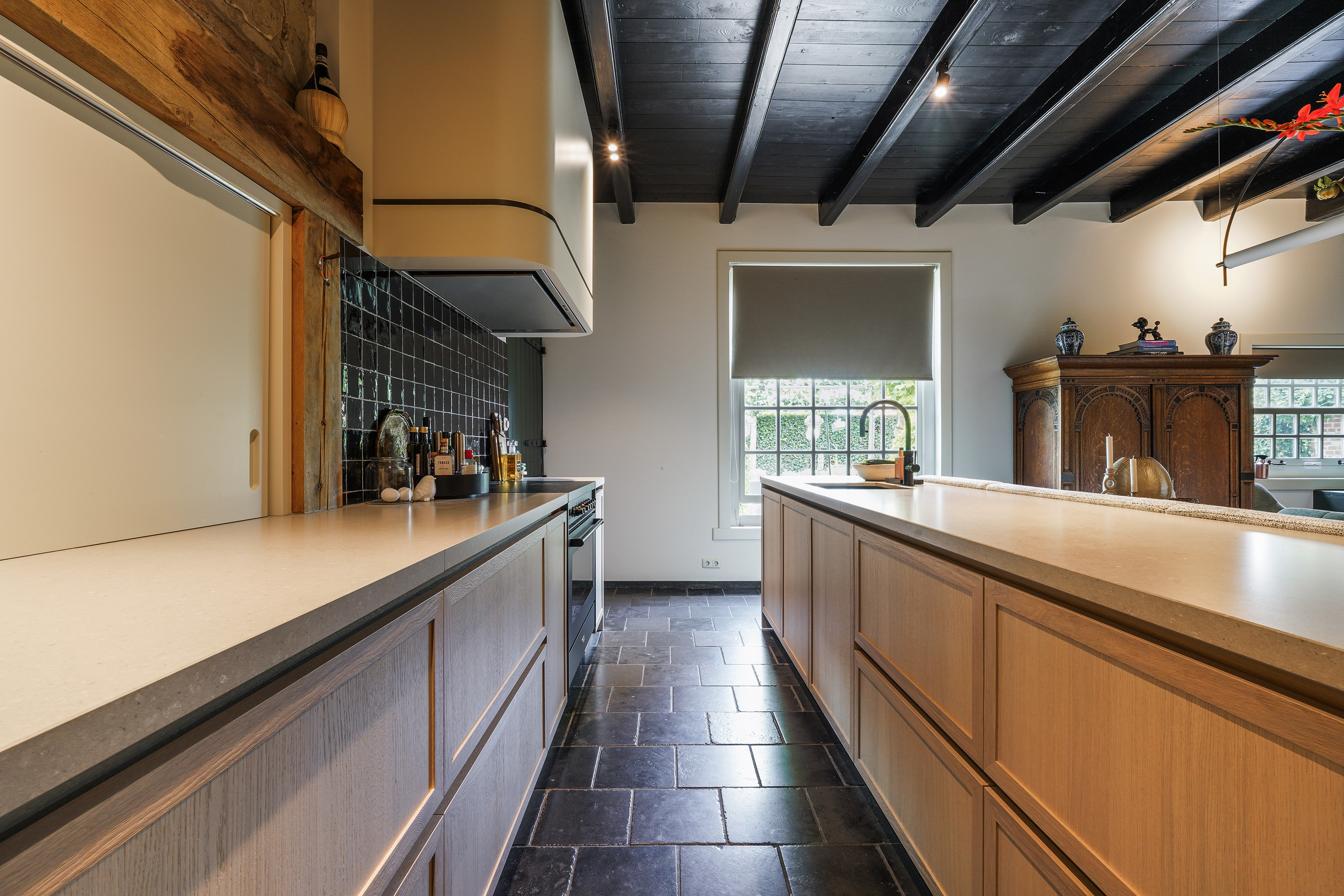 Das Heritage House in Sprang-Capelle verbindet Geschichte mit durchdachter Sanierung und bietet eine seltene Wohnfläche von 420 m² auf einem 658 m² großen Grundstück. Diese nationale Denkmalimmobilie zeichnet sich durch ihre außergewöhnliche Herkunft aus, mit Ursprüngen aus dem 17. Jahrhundert, die sich in freigelegten Holzbalken, gewölbten Decken und einem imposanten Empfang widerspiegeln. Das Hauptwohnzimmer mit fast 90 m² verfügt über einen Pelletofen und hohe Fenster, die für Licht sorgen, während weiße Putzwände und Holzböden die Raumwirkung harmonisch abrunden. Das Herzstück bildet eine maßgefertigte Küche aus dem Jahr 2024, ausgestattet mit individuell angefertigten Einbauschränken von Ecker Interieurbouw sowie großzügigem Platz für geselliges Beisammensein, Essen und entspannte Blicke in den Garten.