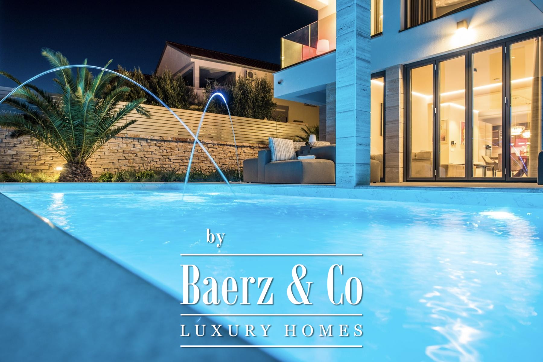 Insgesamt umfasst das Anwesen 370,65 m² Wohnfläche auf einem 806 m² großen, gepflegten Grundstück mit vier Schlafzimmern und vier Bädern. Zu den Annehmlichkeiten zählen eine Sauna, eine Dachterrasse mit Jacuzzi, zwei moderne Küchen, Heimkino, integrierte Audio- und Überwachungssysteme, automatische Bewässerung, ein Gemeinschaftspool sowie Außenduschen. Der mediterran bepflanzte Garten und vier Stellplätze unterstreichen das hochwertige Angebot. Diese Luxusvilla in Vrsi ist gleichermaßen ein exquisiter privater Rückzugsort wie auch eine hochkarätige Investition für anspruchsvolle internationale Käufer.