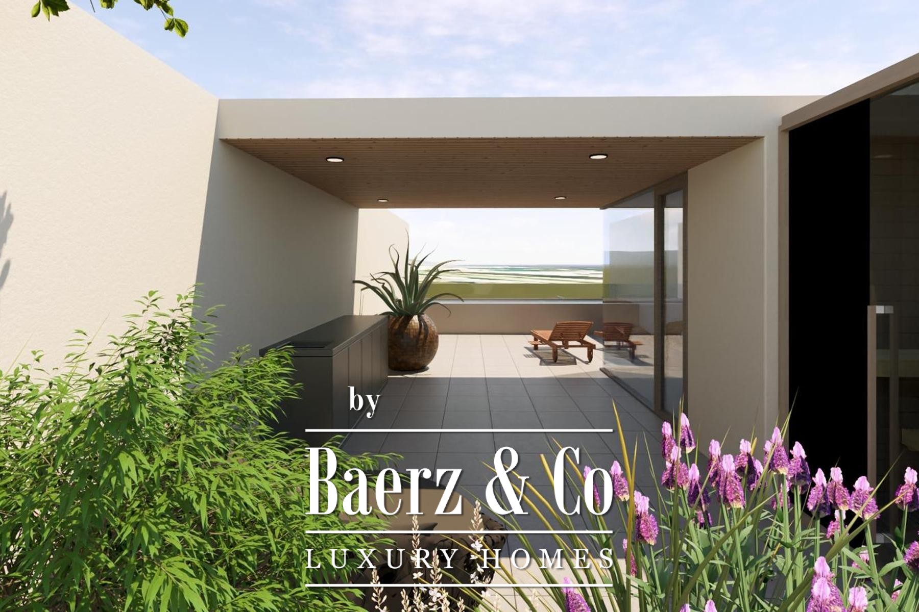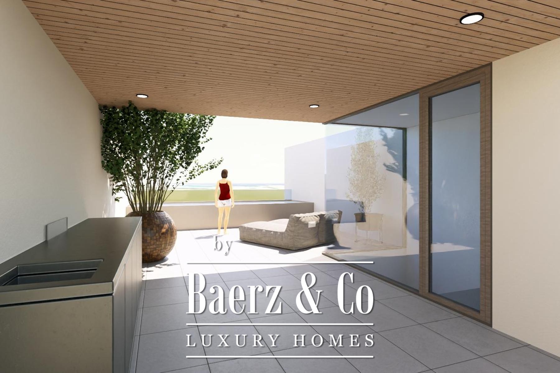 Die private Innentreppe führt in das Obergeschoss, das ein Hauptschlafzimmer, zwei Kinderzimmer und zwei Bäder umfasst – flexibel gestaltbar für das Familienleben. Im zweiten Stock setzt sich der Eingangsbereich fort und leitet über in einen Technikraum, eine überdachte und eine offene Terrasse sowie einen Swimmingpool, wodurch sich das Wohnen ins Freie erweitert.