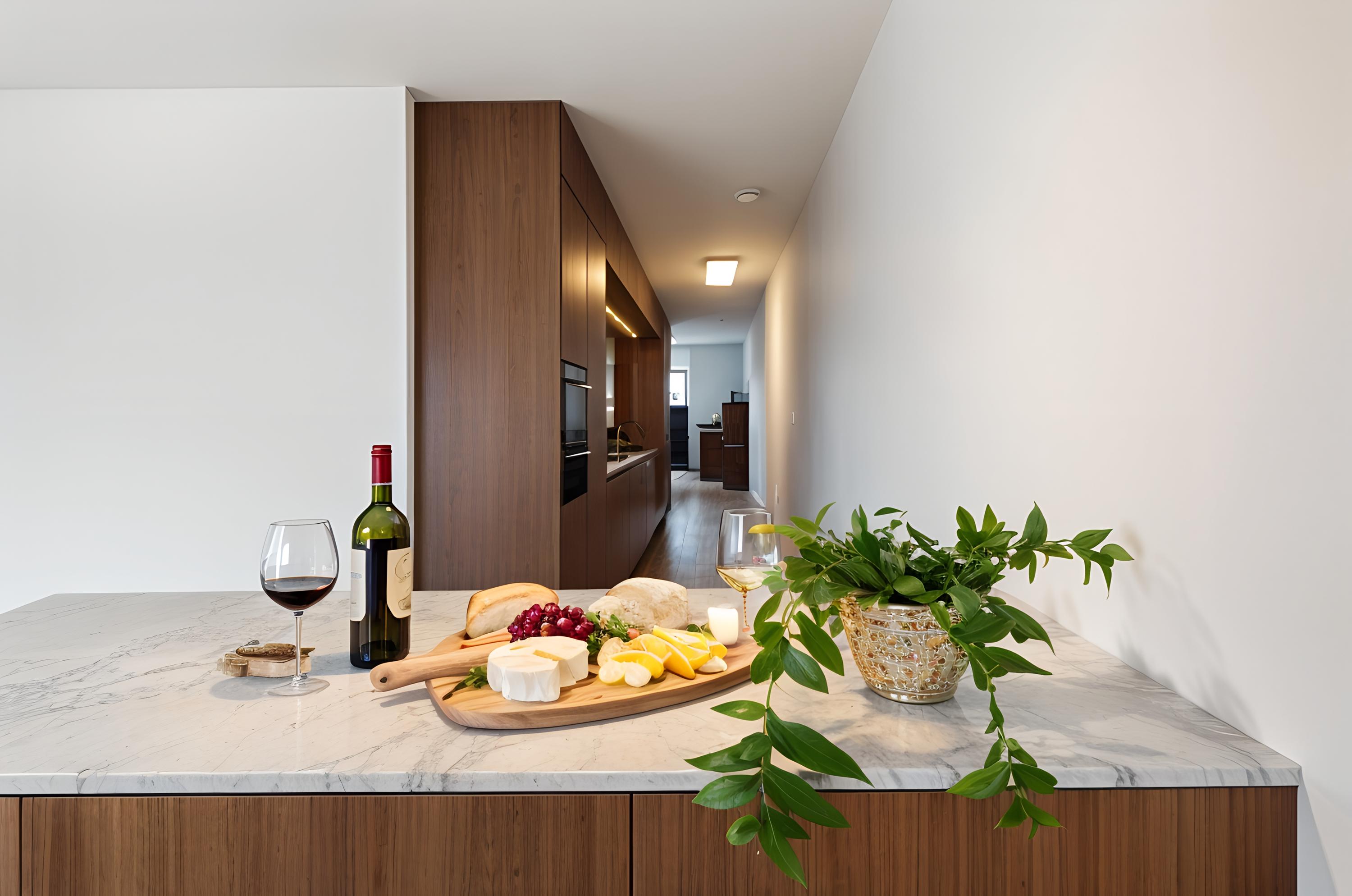 Το καθιστικό με το παράθυρο-ερκέρ και τα γαλλικά μπαλκόνια πλαισιώνουν τις διαρκώς εναλλασσόμενες εικόνες του λιμανιού και της θάλασσας, ενώ οι γυάλινες πόρτες με μεταλλικό πλαίσιο δημιουργούν αίσθηση ενιαίου χώρου μεταξύ σαλονιού, τραπεζαρίας και χολ. Η κουζίνα NEXT-125 μήκους 7,20 μέτρων, με προσαρμοσμένα ντουλάπια καρυδιάς, ελεγχόμενο κλιματικά ντουλάπι κρασιών και πάγκους με μαρμάρινη όψη, αποτελεί το κεντρικό σημείο του χώρου. Η παρακείμενη τραπεζαρία και το νησίδα κουζίνας διευκολύνουν τη φιλοξενία, προσφέροντας θέα στον ιδιωτικό κήπο και την ηλιόλουστη βεράντα.
